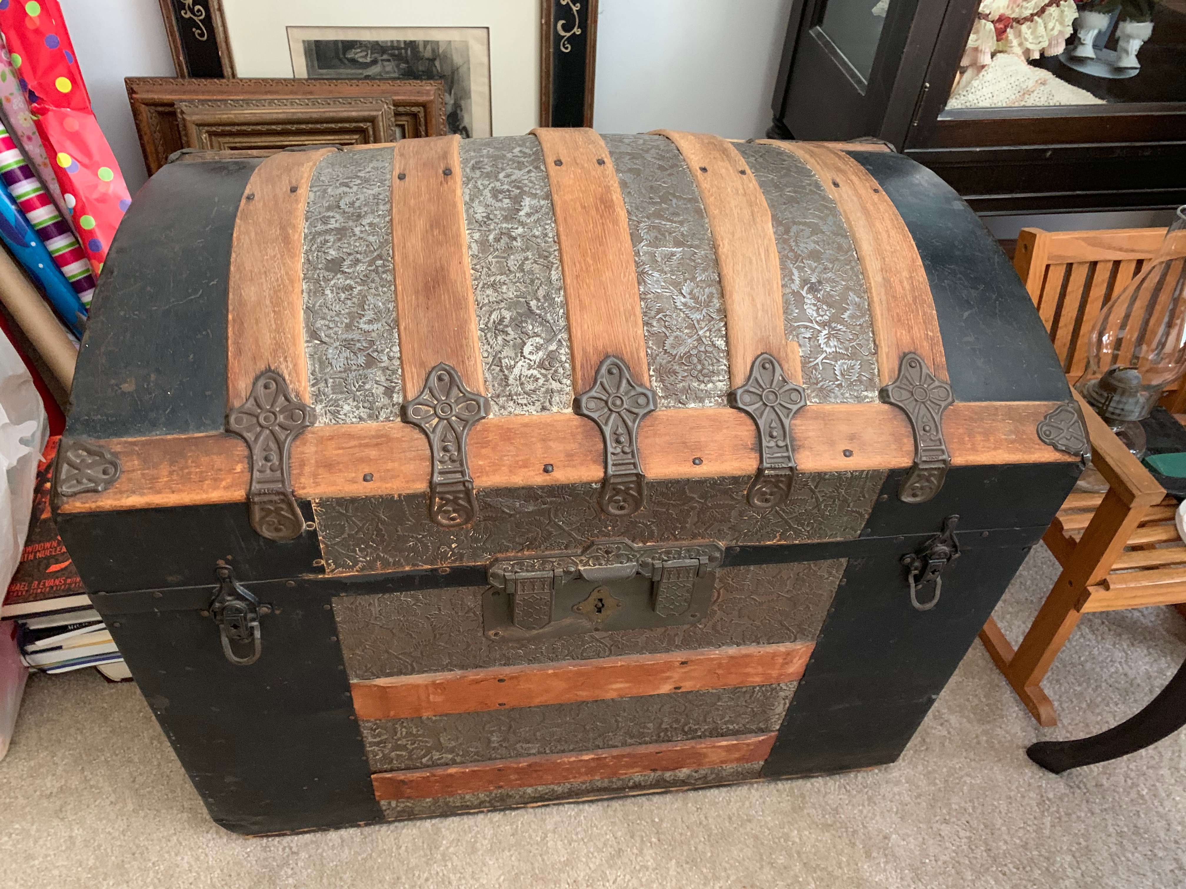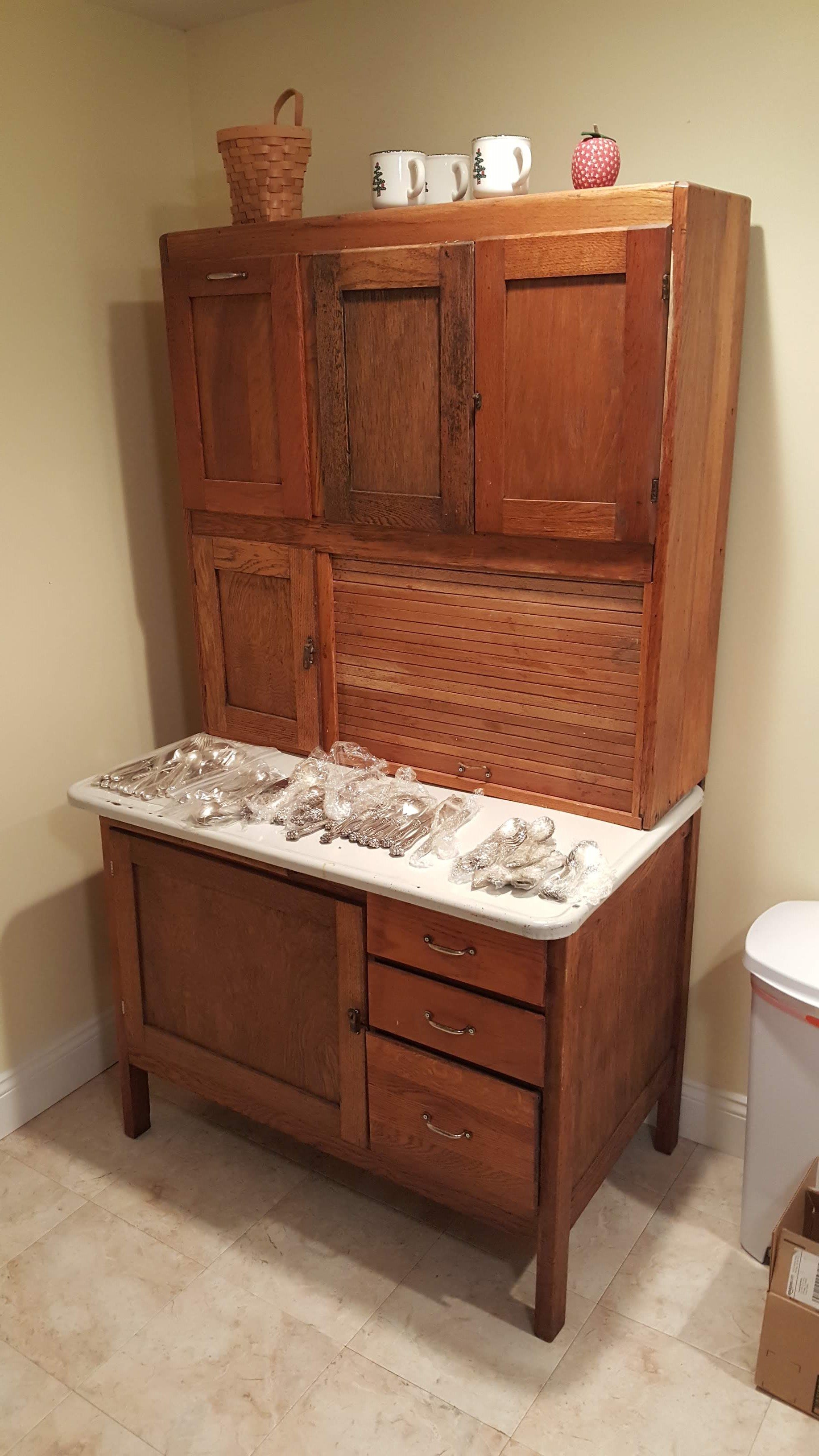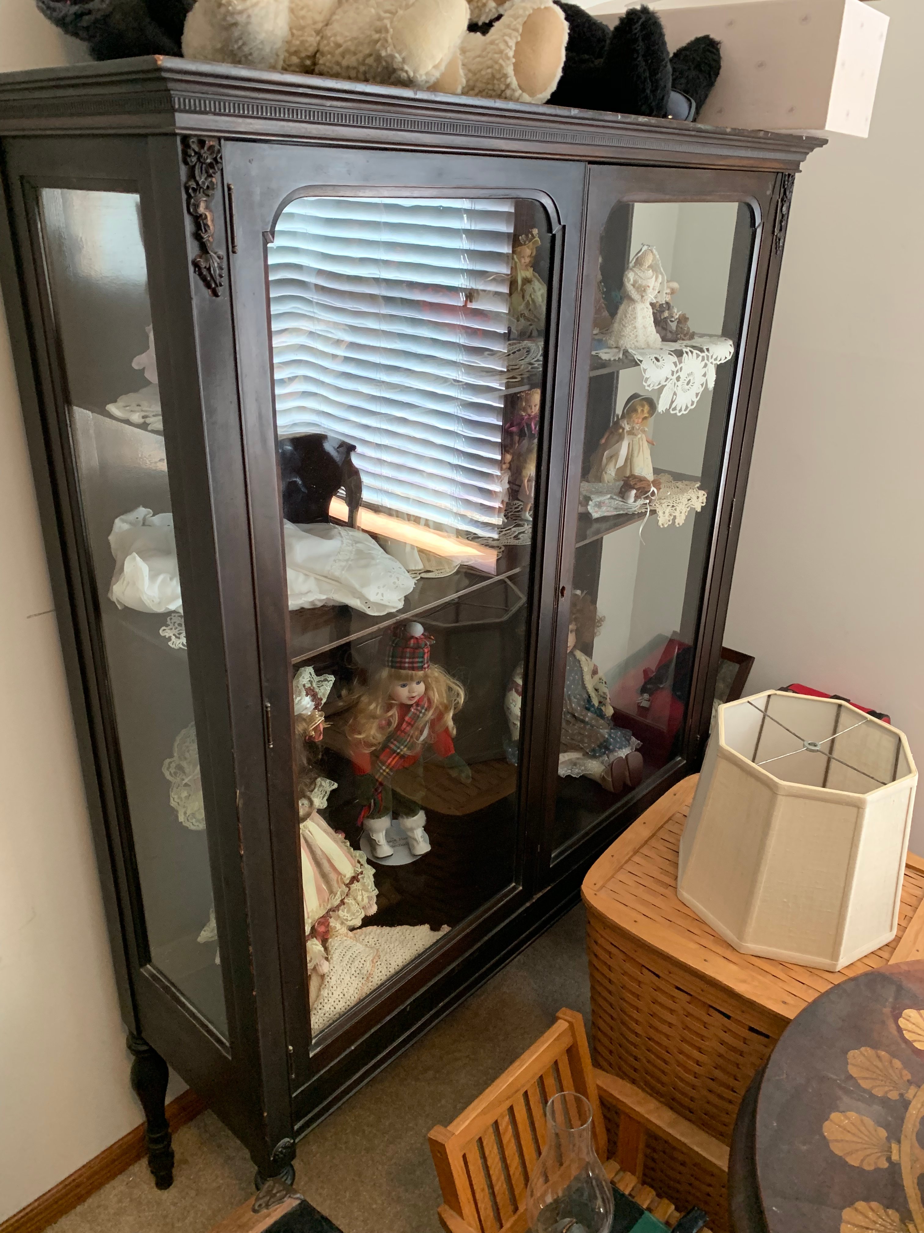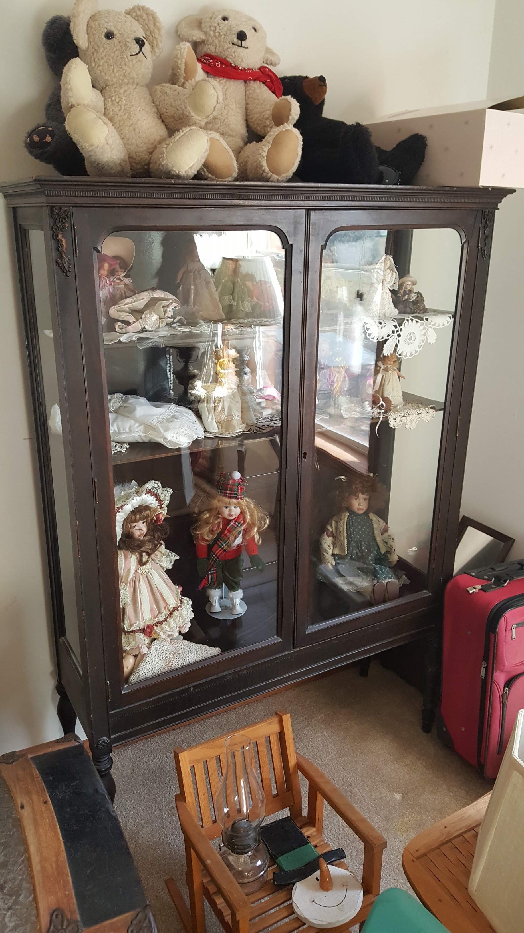 Glass Front China Cabinet; Gate Leg Drop Leaf Table; Drop Front Secretary; Hoosier Style Cabinet; Dry Sink; Settee; 3-Drawer Chest of Drawers; Lamp Tables; Blanket Chest; Drop Leaf End Table; Straight Chairs; Camel Back Trunk; Steamer Trunk; Oak Teachers Desk; Childs Rocker; Army Chest; Finger Lamp; Retro Desk Lamp; Mantle Clock; Figural Clock; Decanters; Cut Glass; Silver Plate Pcs.; Fenton Rose Bowl; Set of Rosalind China; Ped. Cake Plate; Soup Tureen; Vases; Candlesticks; Dazey #40 Glass Butter Churn; Crock Jug w/ Blue; 3 Gal. Crock; Copper Pcs.; Primitive Wood Bowl; School Bell; Spittoon; Copper Coal Bucket; Wicker Laundry Basket; Cultivator; Dog Sled; Hargrove Painting; Chrome Baby Buggy; Doll Buggy; Doll Collection; Wood Barn;