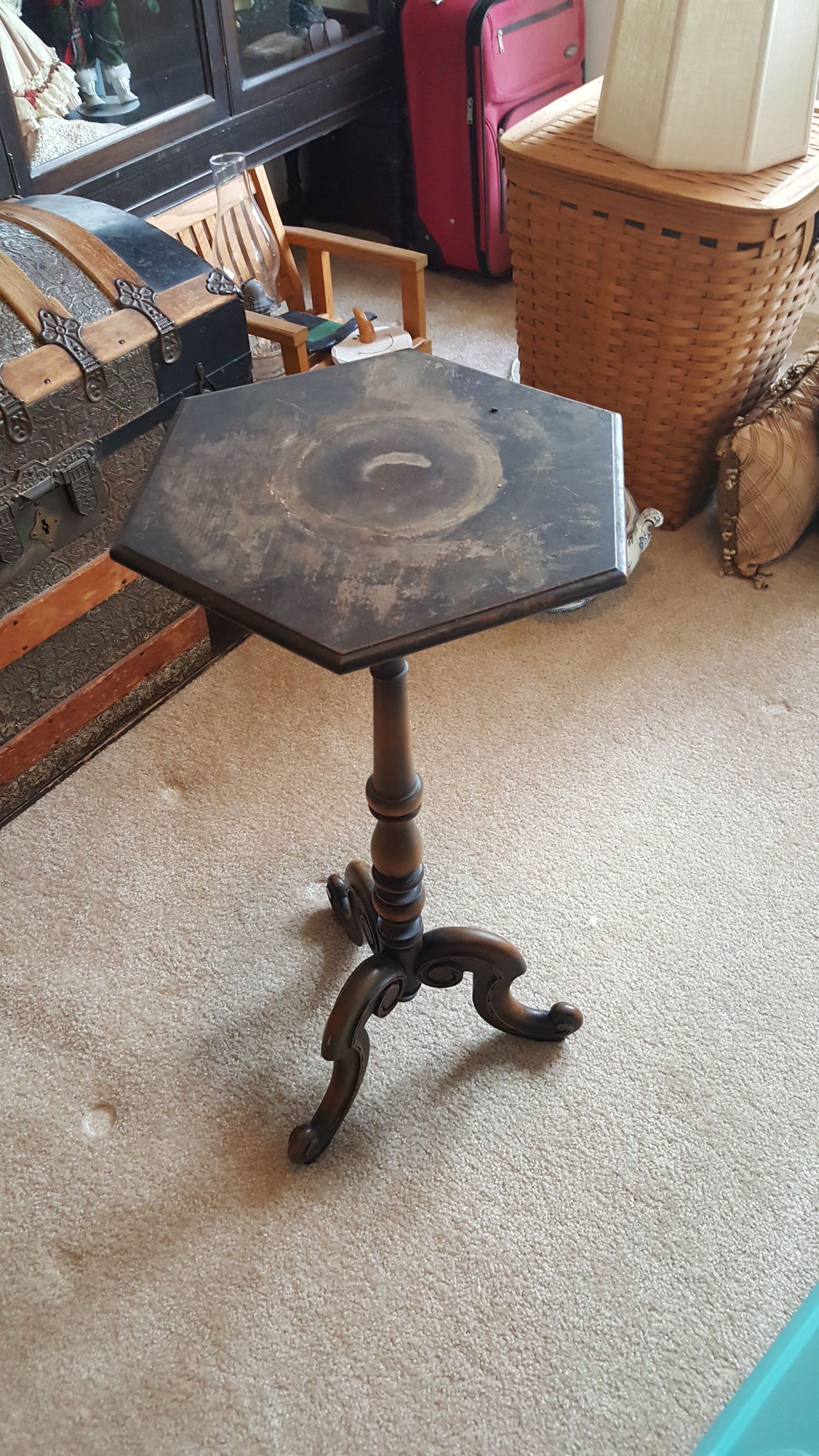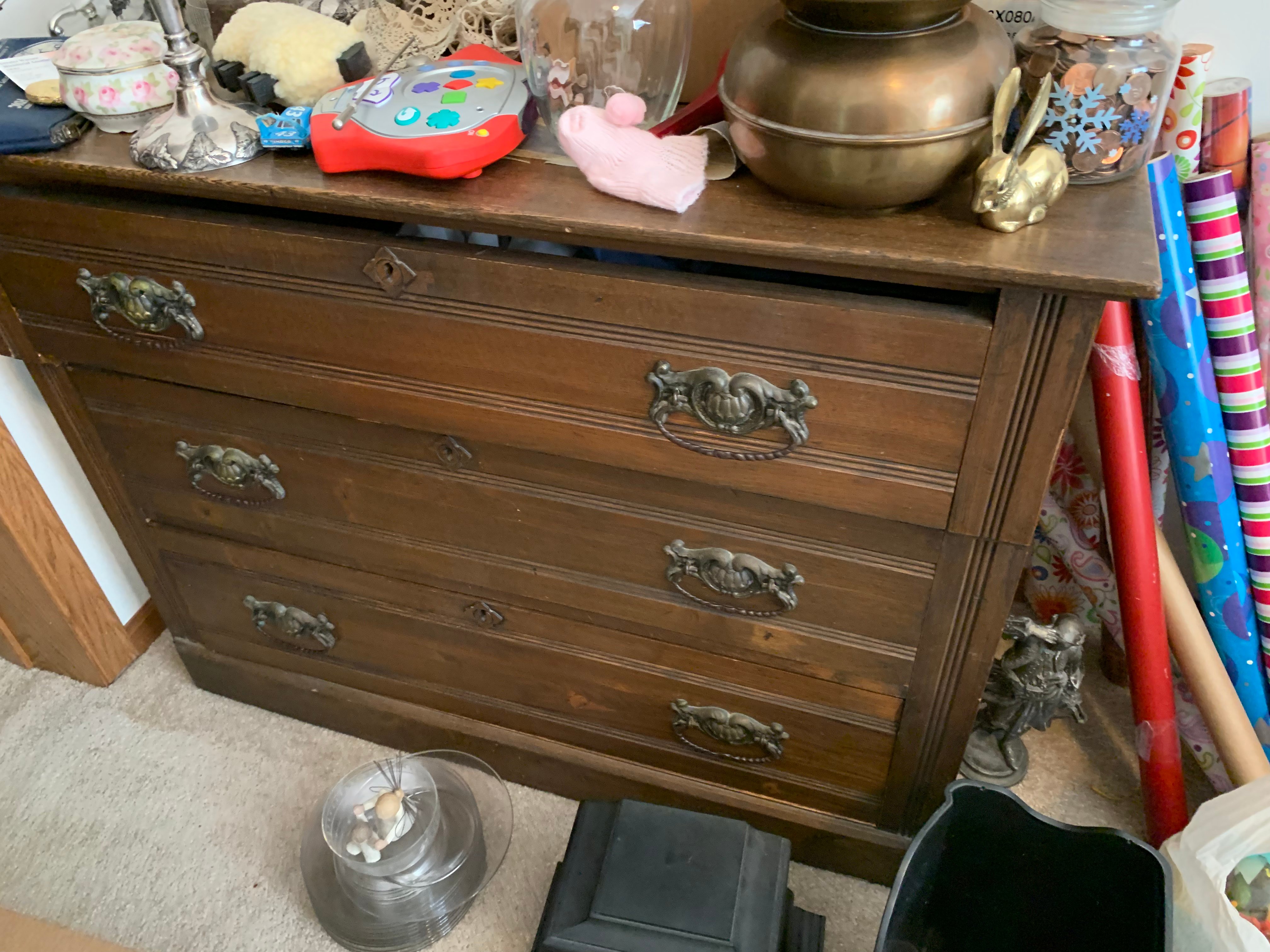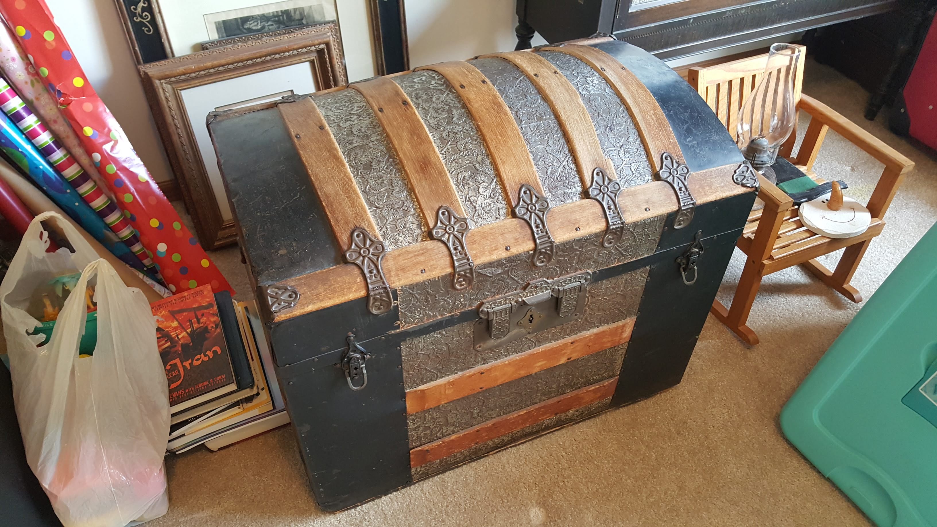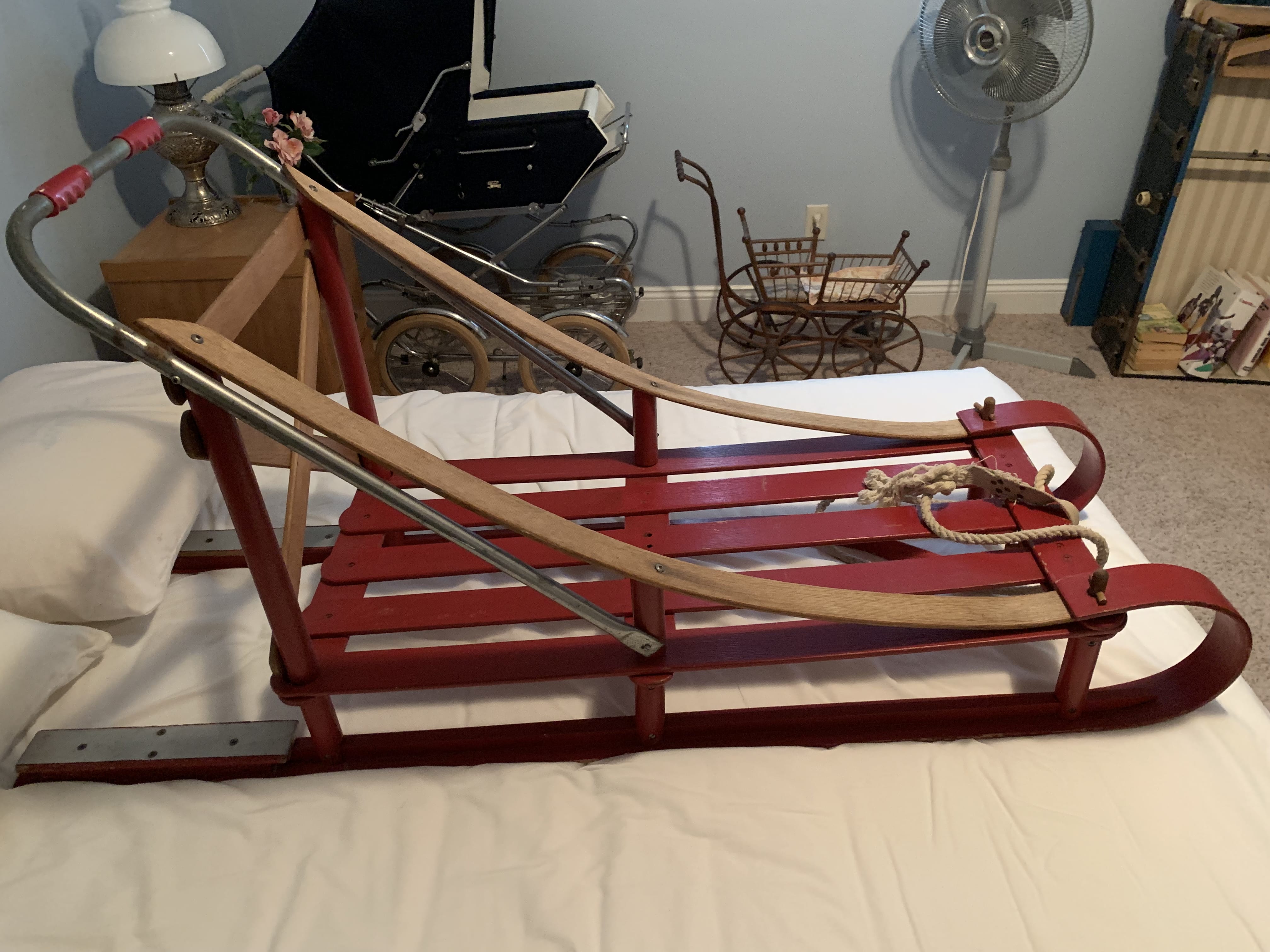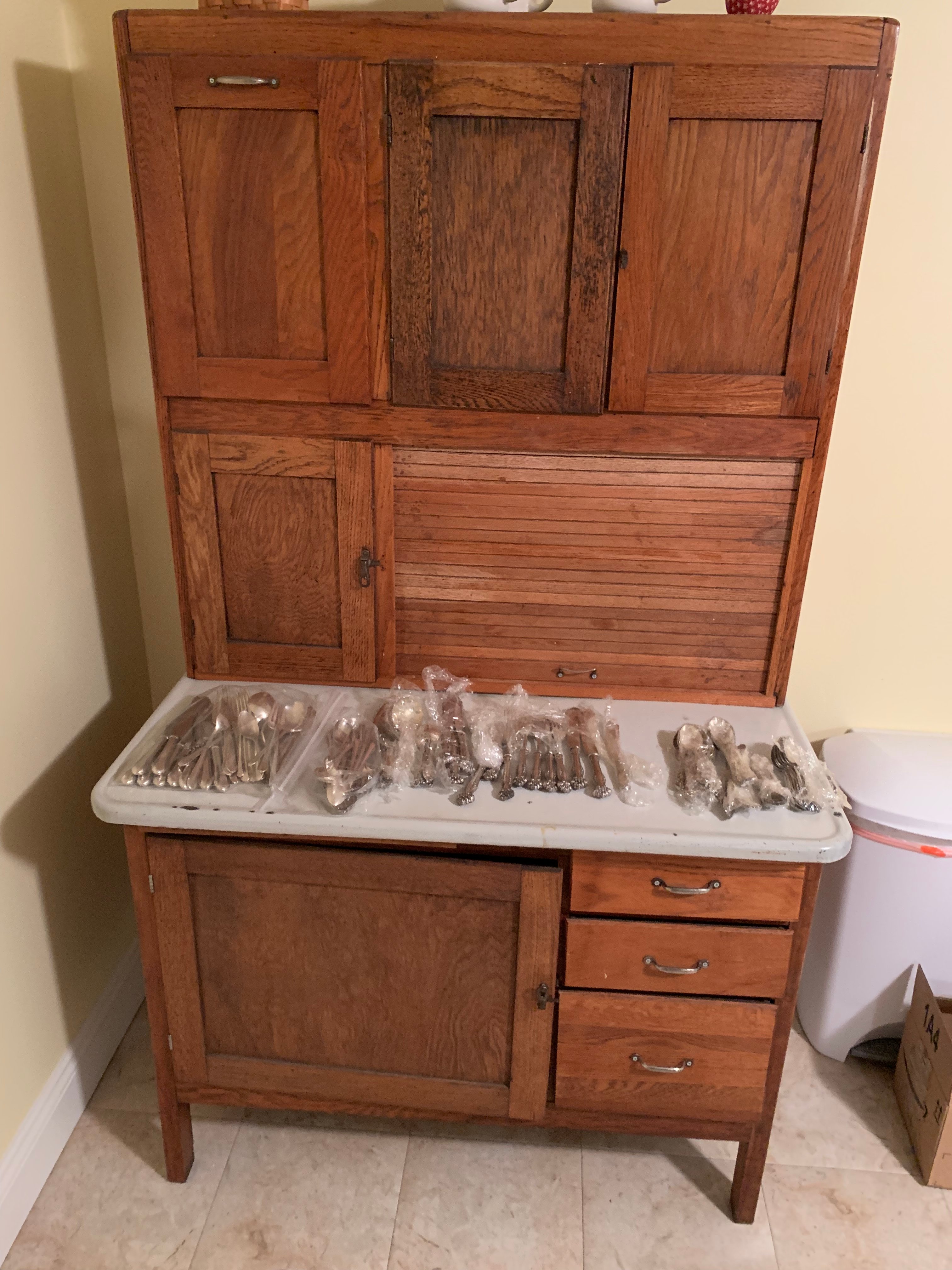 Glass Front China Cabinet; Gate Leg Drop Leaf Table; Drop Front Secretary; Hoosier Style Cabinet; Dry Sink; Settee; 3-Drawer Chest of Drawers; Lamp Tables; Blanket Chest; Drop Leaf End Table; Straight Chairs; Camel Back Trunk; Steamer Trunk; Oak Teachers Desk; Childs Rocker; Army Chest; Finger Lamp; Retro Desk Lamp; Mantle Clock; Figural Clock; Decanters; Cut Glass; Silver Plate Pcs.; Fenton Rose Bowl; Set of Rosalind China; Ped. Cake Plate; Soup Tureen; Vases; Candlesticks; Dazey #40 Glass Butter Churn; Crock Jug w/ Blue; 3 Gal. Crock; Copper Pcs.; Primitive Wood Bowl; School Bell; Spittoon; Copper Coal Bucket; Wicker Laundry Basket; Cultivator; Dog Sled; Hargrove Painting; Chrome Baby Buggy; Doll Buggy; Doll Collection; Wood Barn;