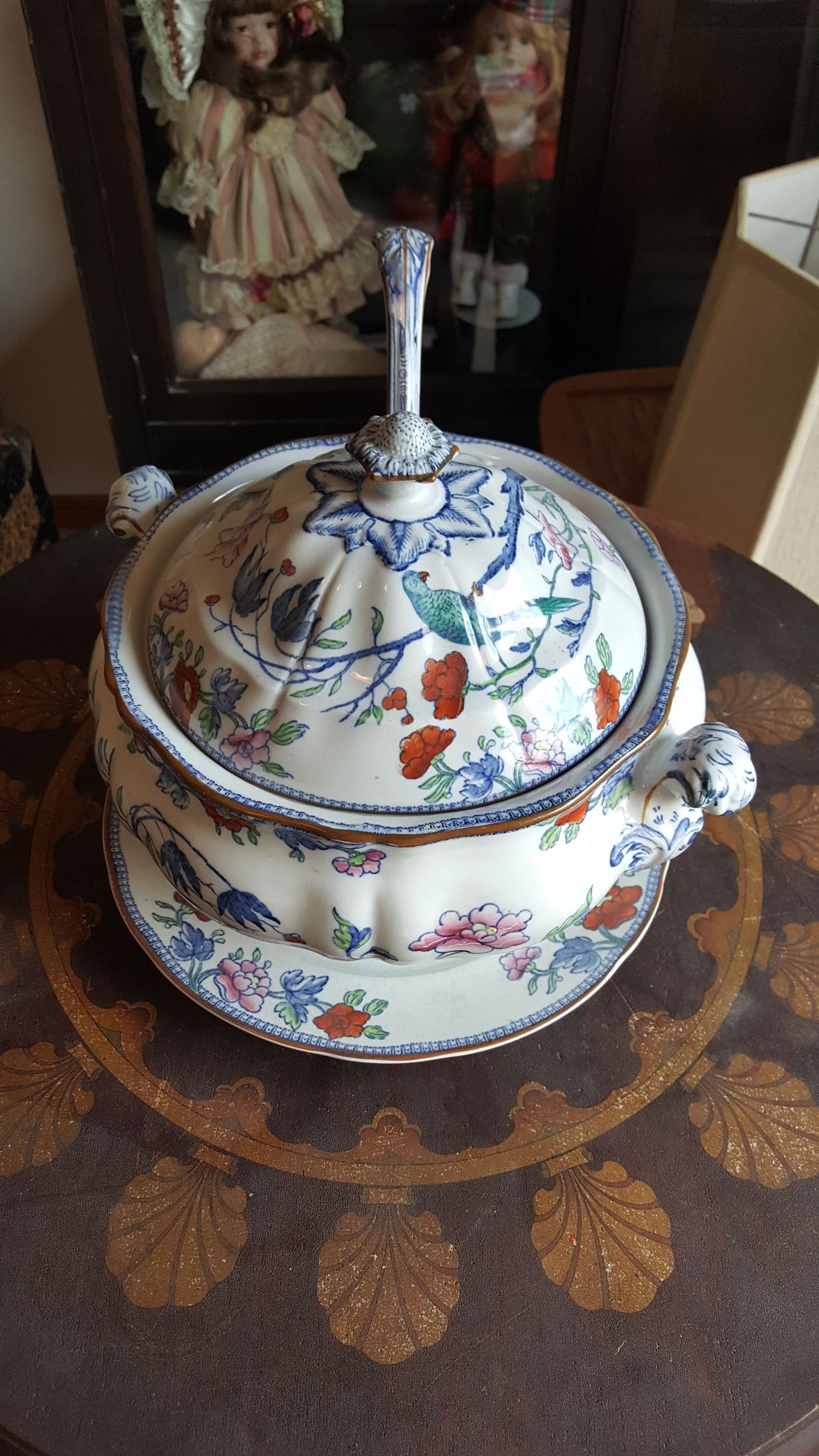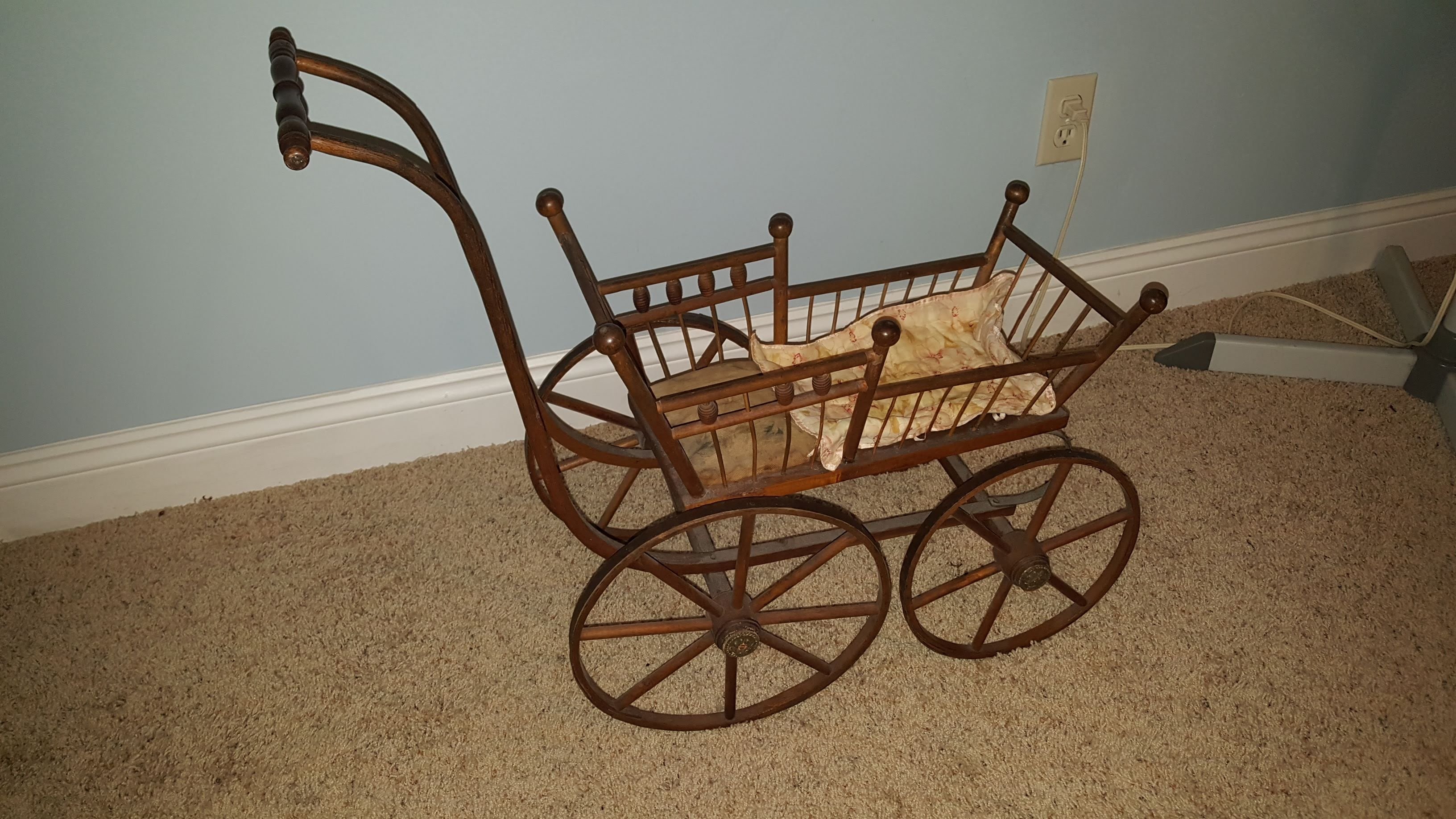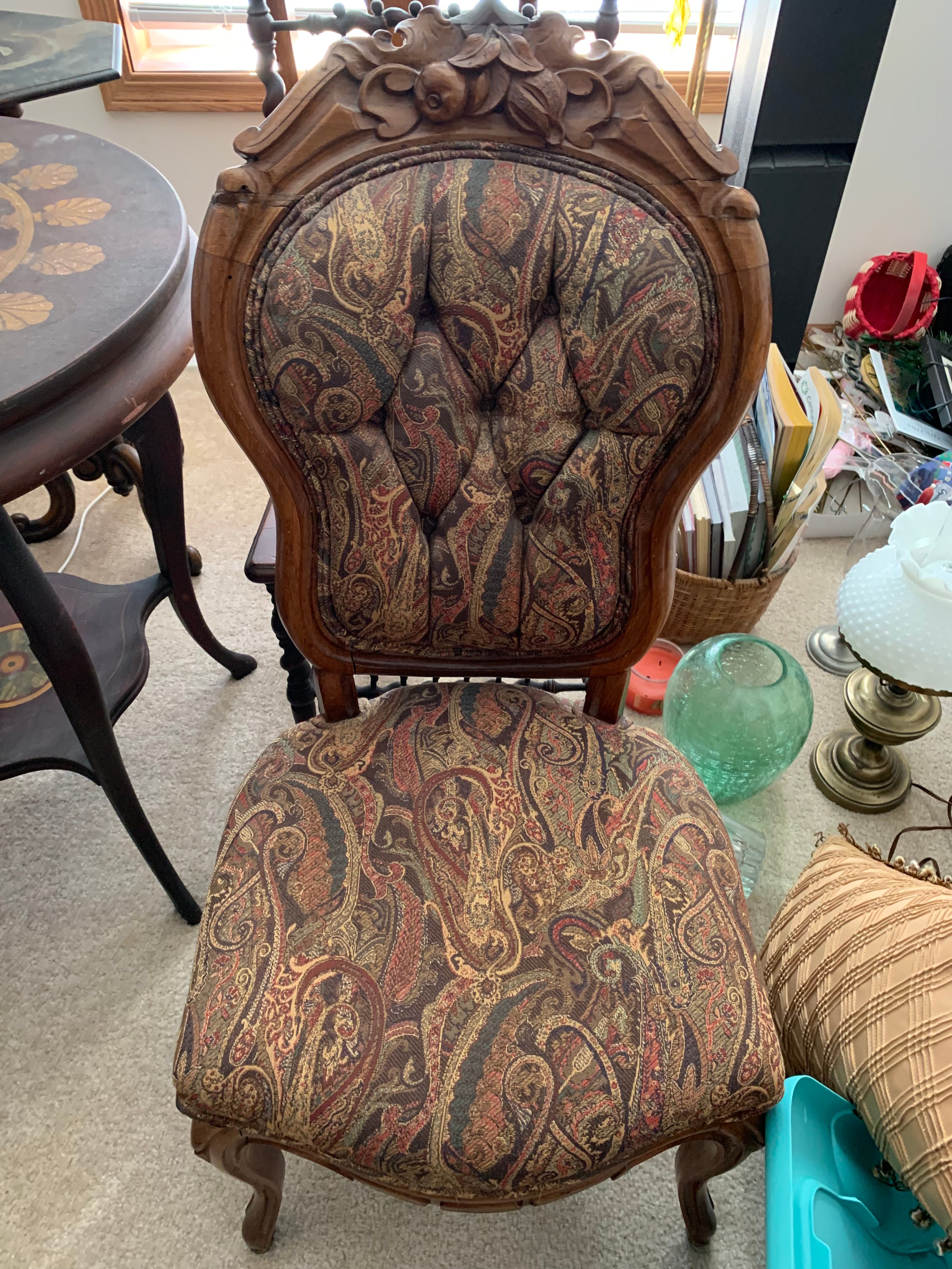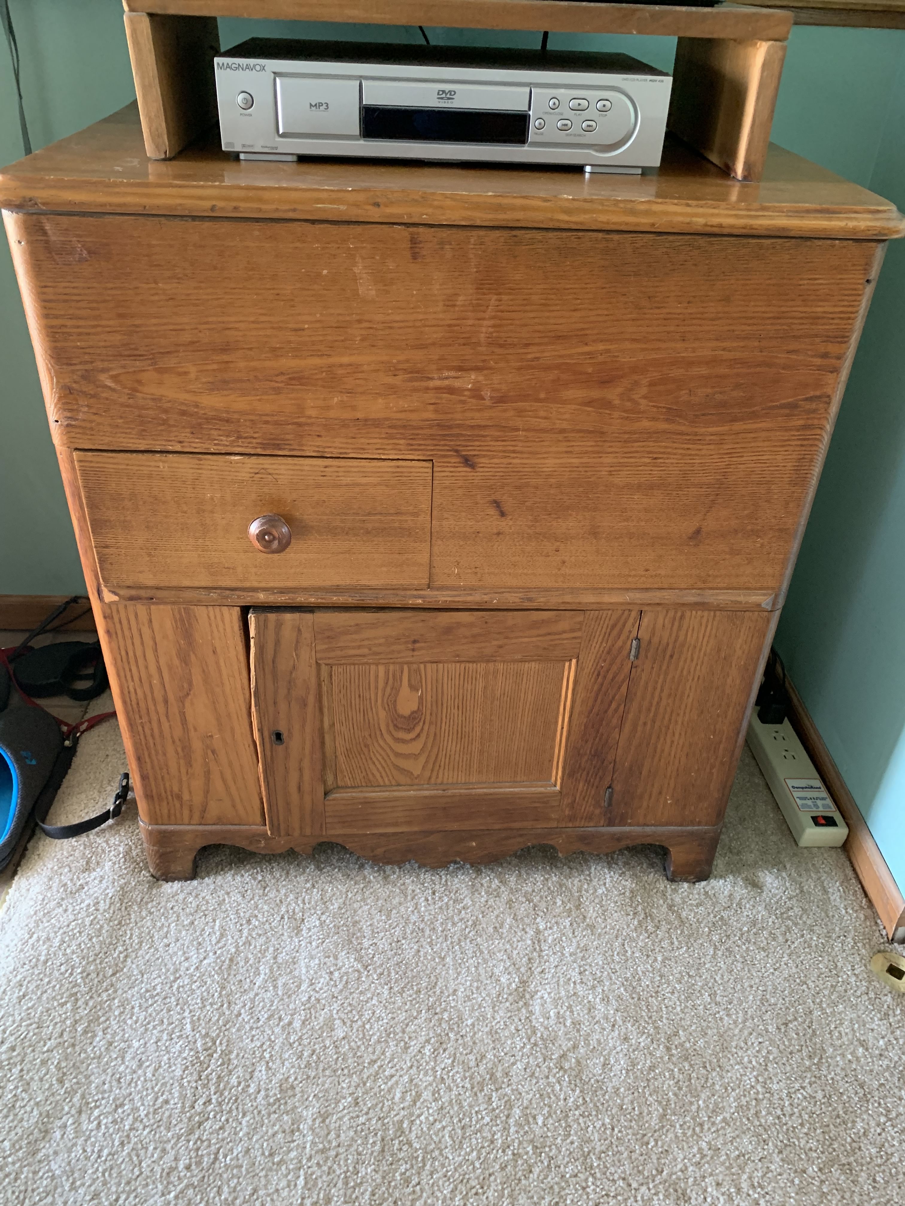 Glass Front China Cabinet; Gate Leg Drop Leaf Table; Drop Front Secretary; Hoosier Style Cabinet; Dry Sink; Settee; 3-Drawer Chest of Drawers; Lamp Tables; Blanket Chest; Drop Leaf End Table; Straight Chairs; Camel Back Trunk; Steamer Trunk; Oak Teachers Desk; Childs Rocker; Army Chest; Finger Lamp; Retro Desk Lamp; Mantle Clock; Figural Clock; Decanters; Cut Glass; Silver Plate Pcs.; Fenton Rose Bowl; Set of Rosalind China; Ped. Cake Plate; Soup Tureen; Vases; Candlesticks; Dazey #40 Glass Butter Churn; Crock Jug w/ Blue; 3 Gal. Crock; Copper Pcs.; Primitive Wood Bowl; School Bell; Spittoon; Copper Coal Bucket; Wicker Laundry Basket; Cultivator; Dog Sled; Hargrove Painting; Chrome Baby Buggy; Doll Buggy; Doll Collection; Wood Barn;