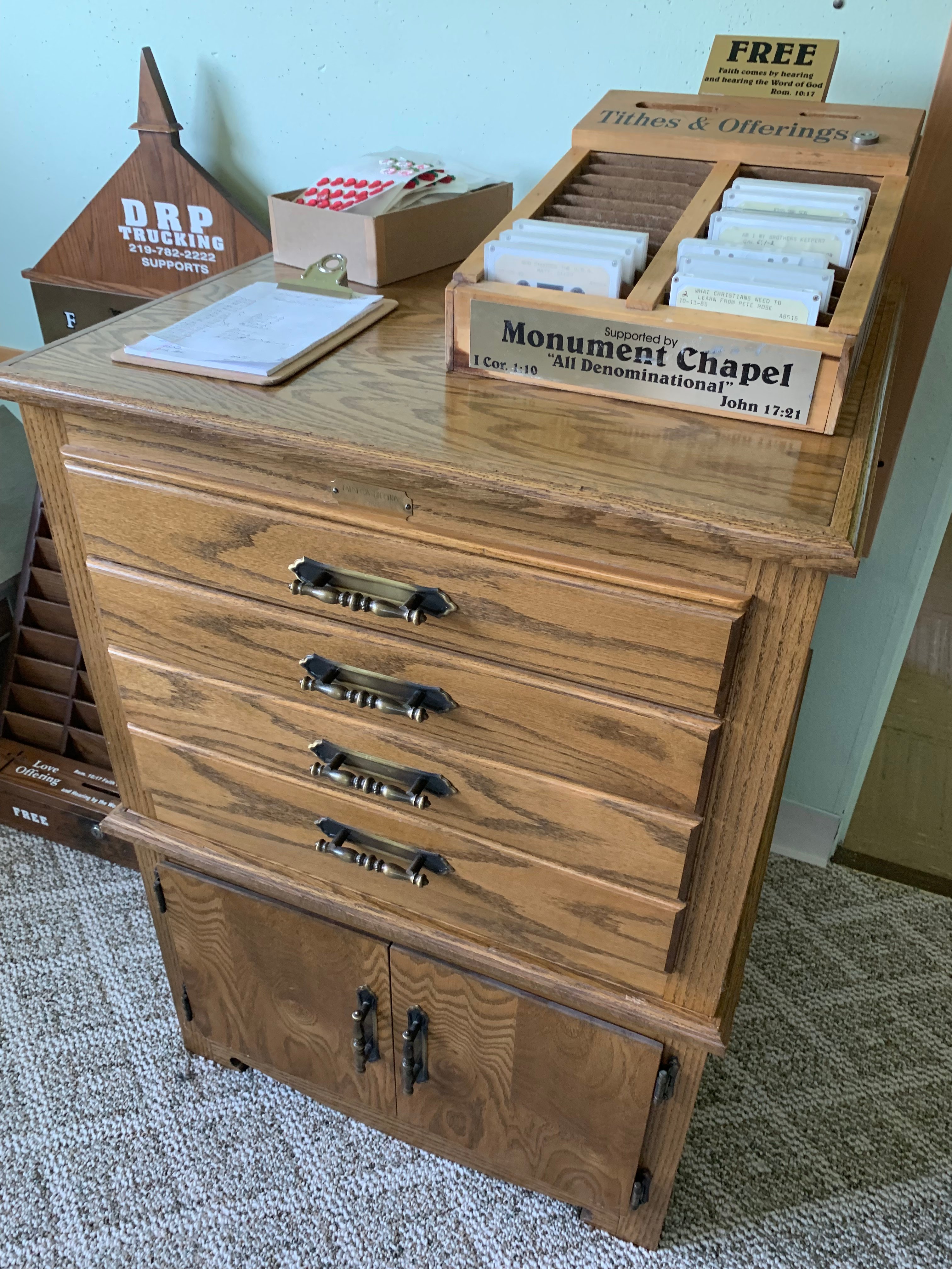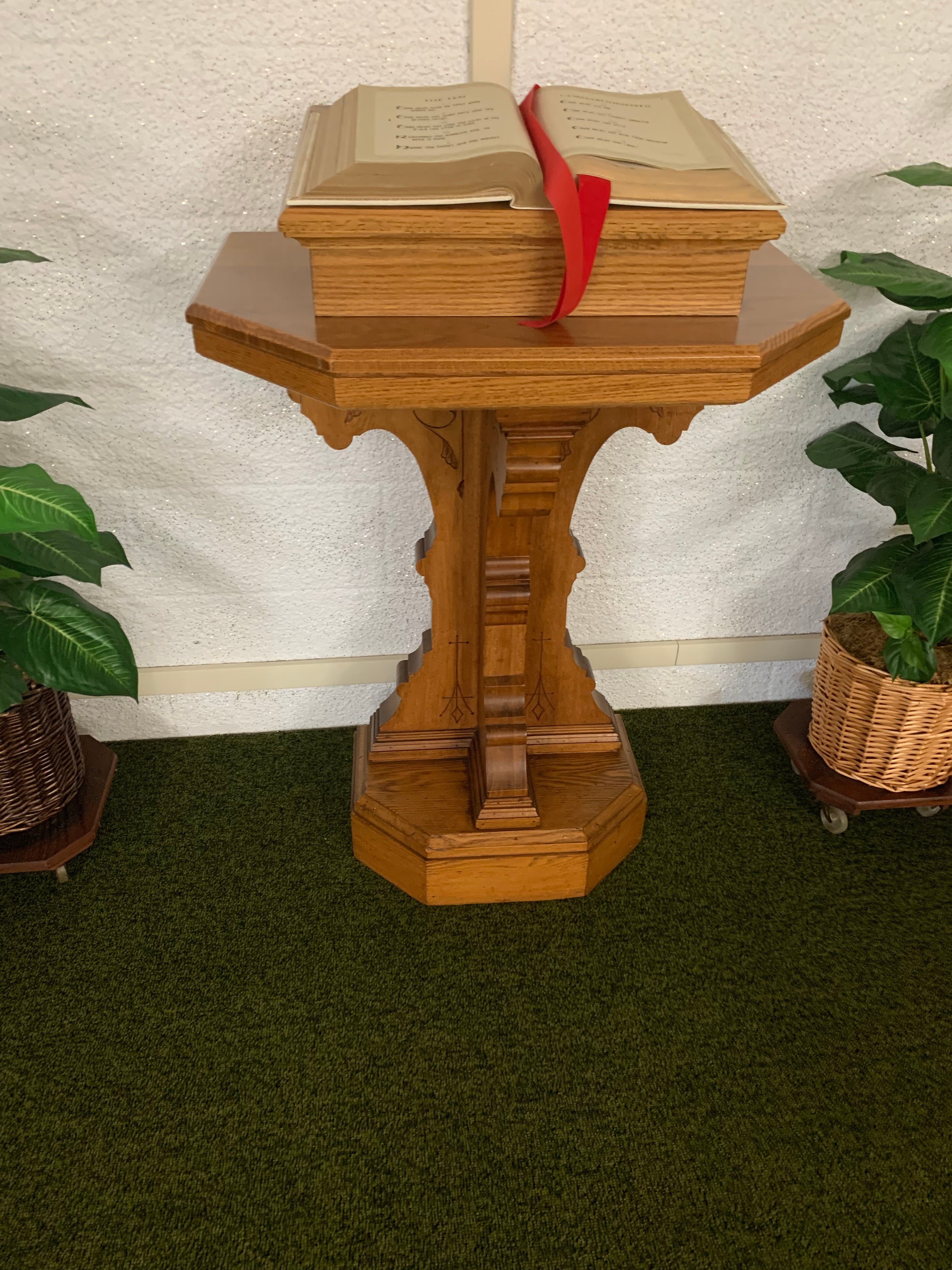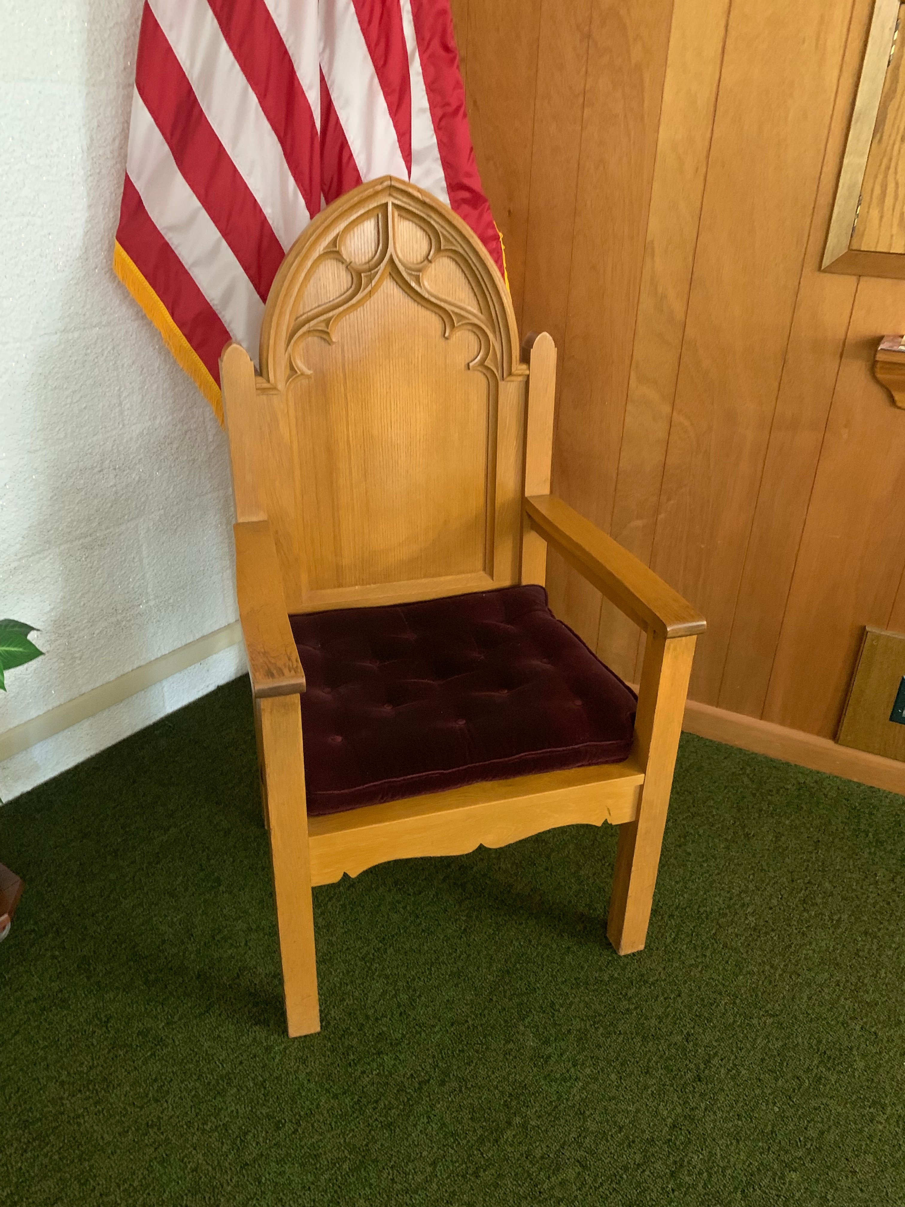 17-Church Pews; 4-Smaller Church Pews; Oak Carved Chairs; Carved Podium; Pulpit; Communion Table; Wurlitzer Organ; Thomas Organ; Estey Spindle Piano; Oak Desk; Oak Cabinets; Vintage Light Fixtures; Leather Sofa; Folding Tables & Chairs; Wall Dividers; Cribs; Changing Table; Childs Picnic Table; Childs Toys; Peavey XR600C Mixer Amp; Pioneer CD Player; TEAC CD Player; Projector; Chalkboards; Bulletin Holders; Donation Boxes; Hymnals & Bibles; Flags; Pictures & Prints; Clocks; Holiday Décor; Primo Water Cooler;