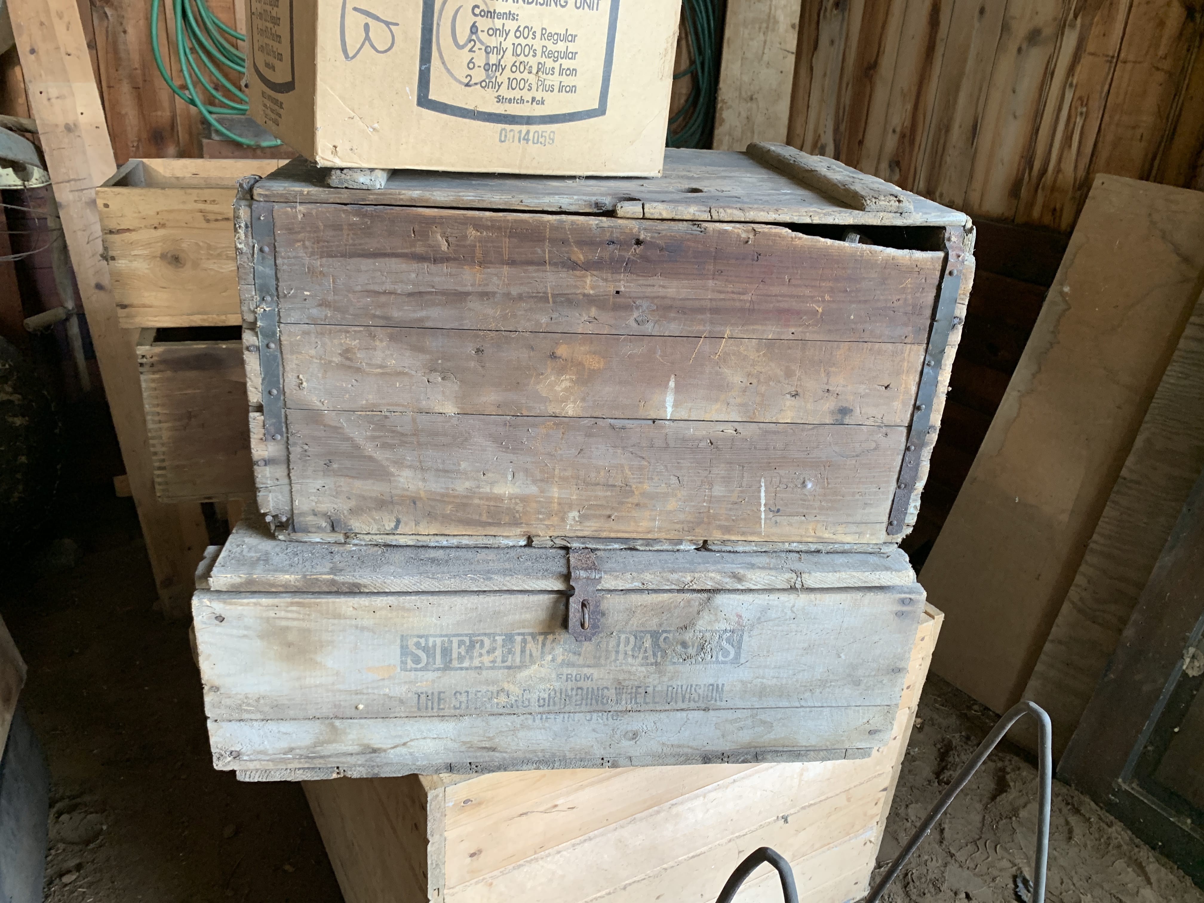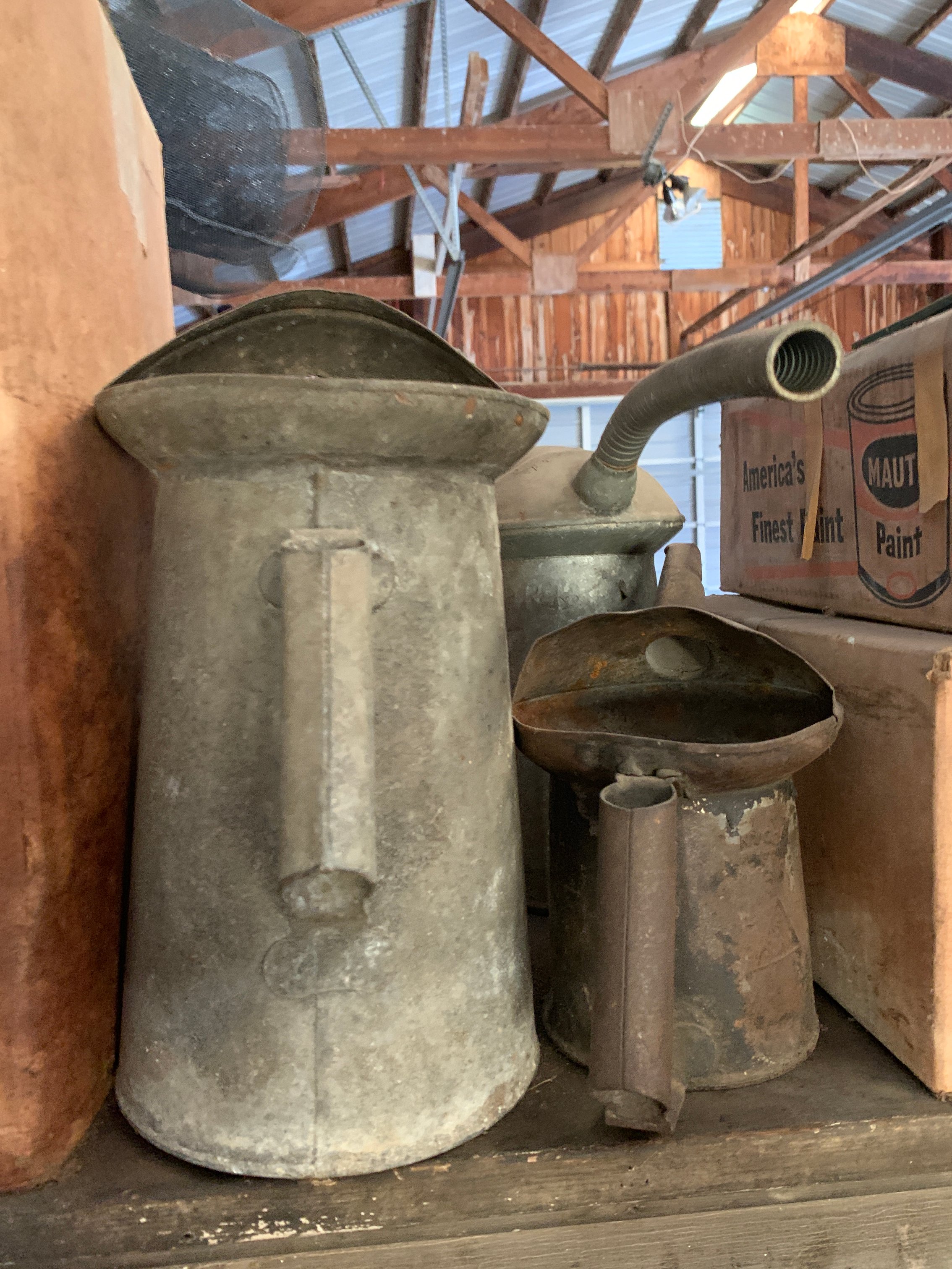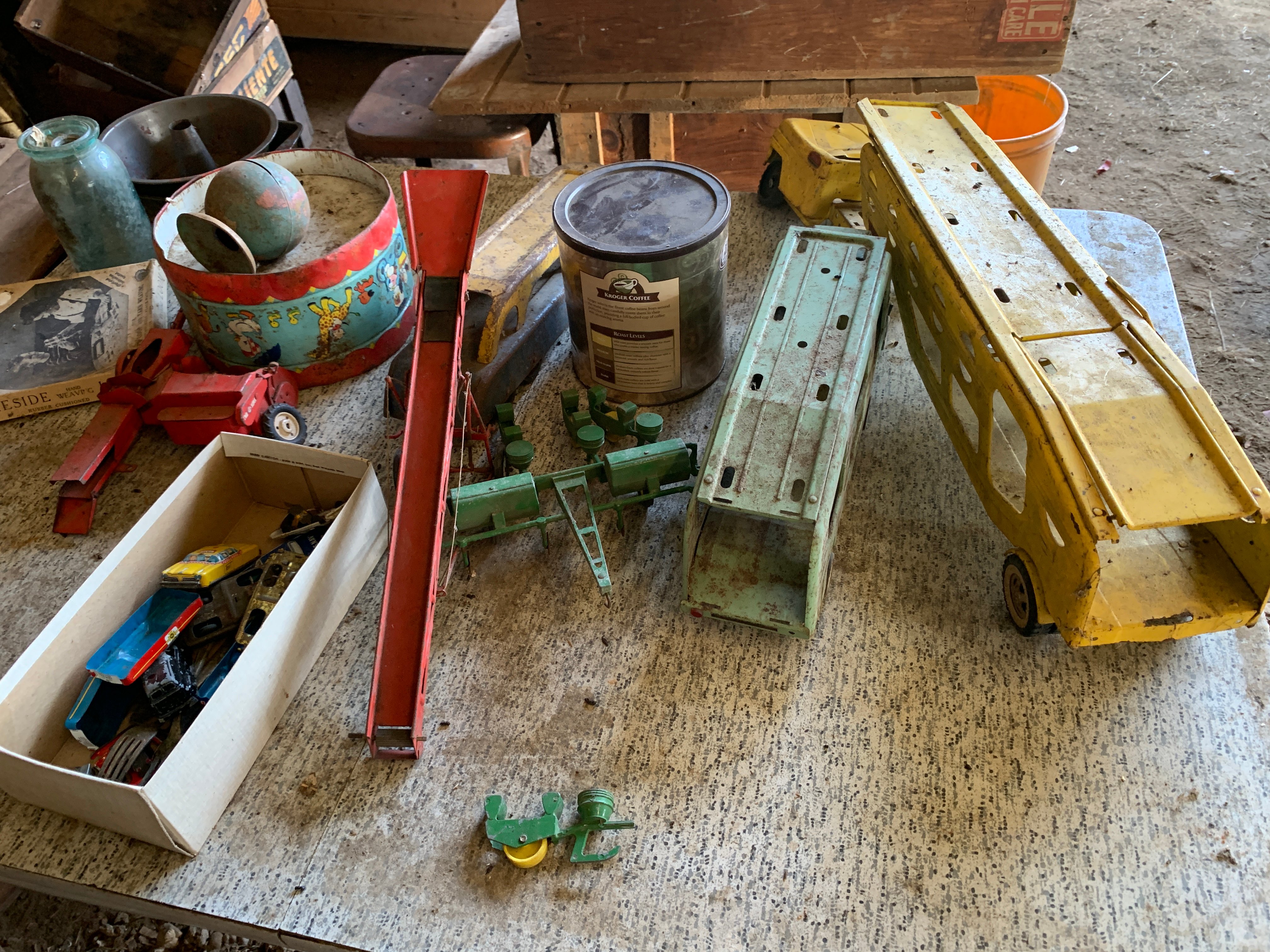 Horse Drawn Sleigh; Primitive Wood Table; Drop Leaf Table & 4 Chairs; Chest of Drawers; Oak Office Chair; Antique Mirror; Aluminum Canister Set; Canning Jars inc. Blue; Enamelware; Wood Advertising Crates; Safe-Way Food Lockers; Berry Boxes; Meat Grinder; Wood Ironing Board; Mobil Oil Can; Gal. Oil Cans & Handy Oilers; Antique Tools; Pulleys; Huffy Scout Bike; Wood Sled; Globe; Vintage Toy Trucks & Farm Toys; HOUSEHOLD: Lg. Chest Freezer; Kenmore Refrigerator; Kenmore Gas Stove; Kitchen Tables & Chairs; Tilt-Top Table; Lift Chair; Twin Beds; Sofa Tables; File Cabinets; Lamps inc. Floor; Dressing Mirror; Microwave; Pots, Pans, Dishes, Bakeware, Utensils & Sm. Appliances; Dyson Vacuum; Cabinet Sewing Machine; Sewing Notions; Exercise Bike;