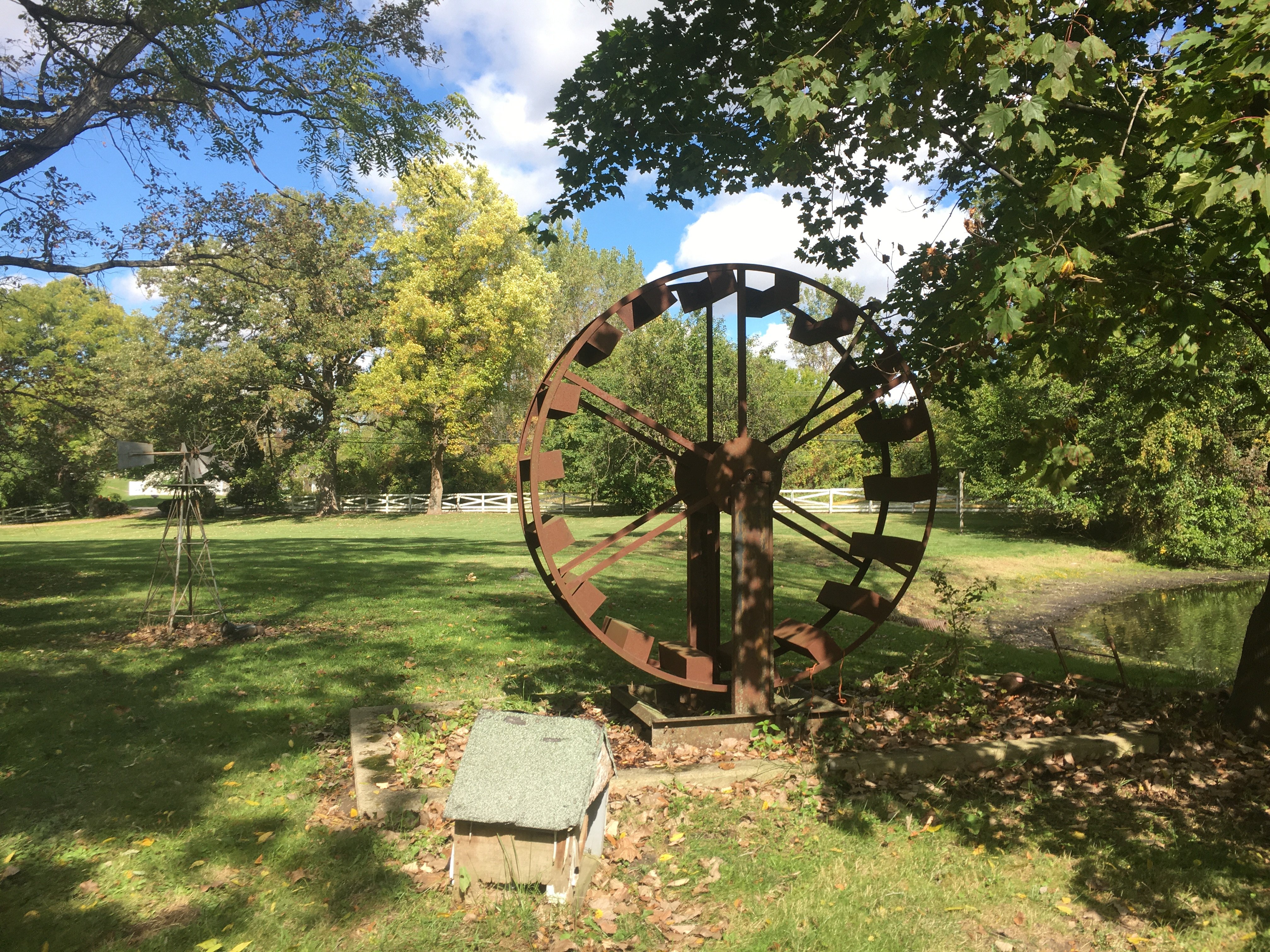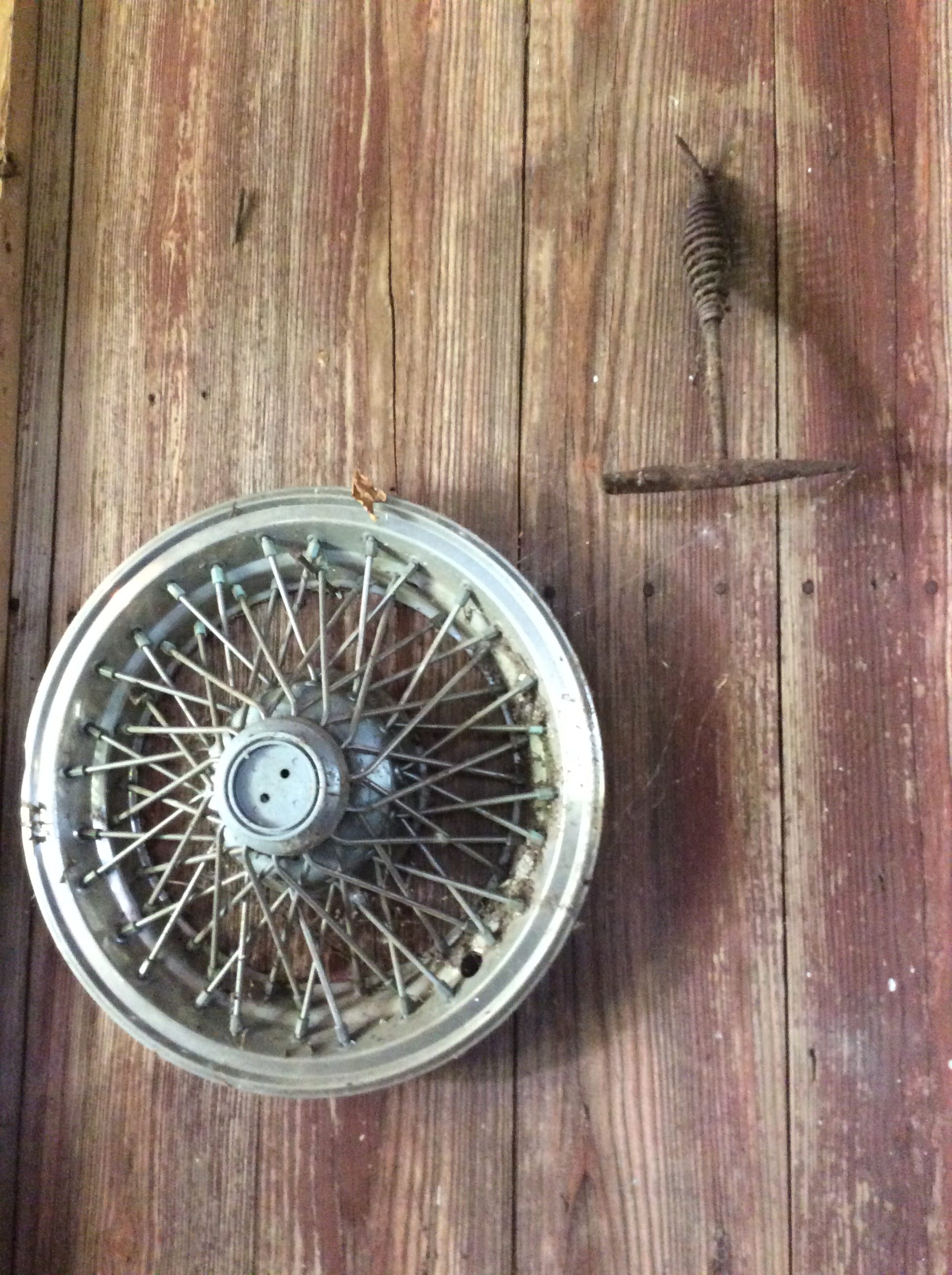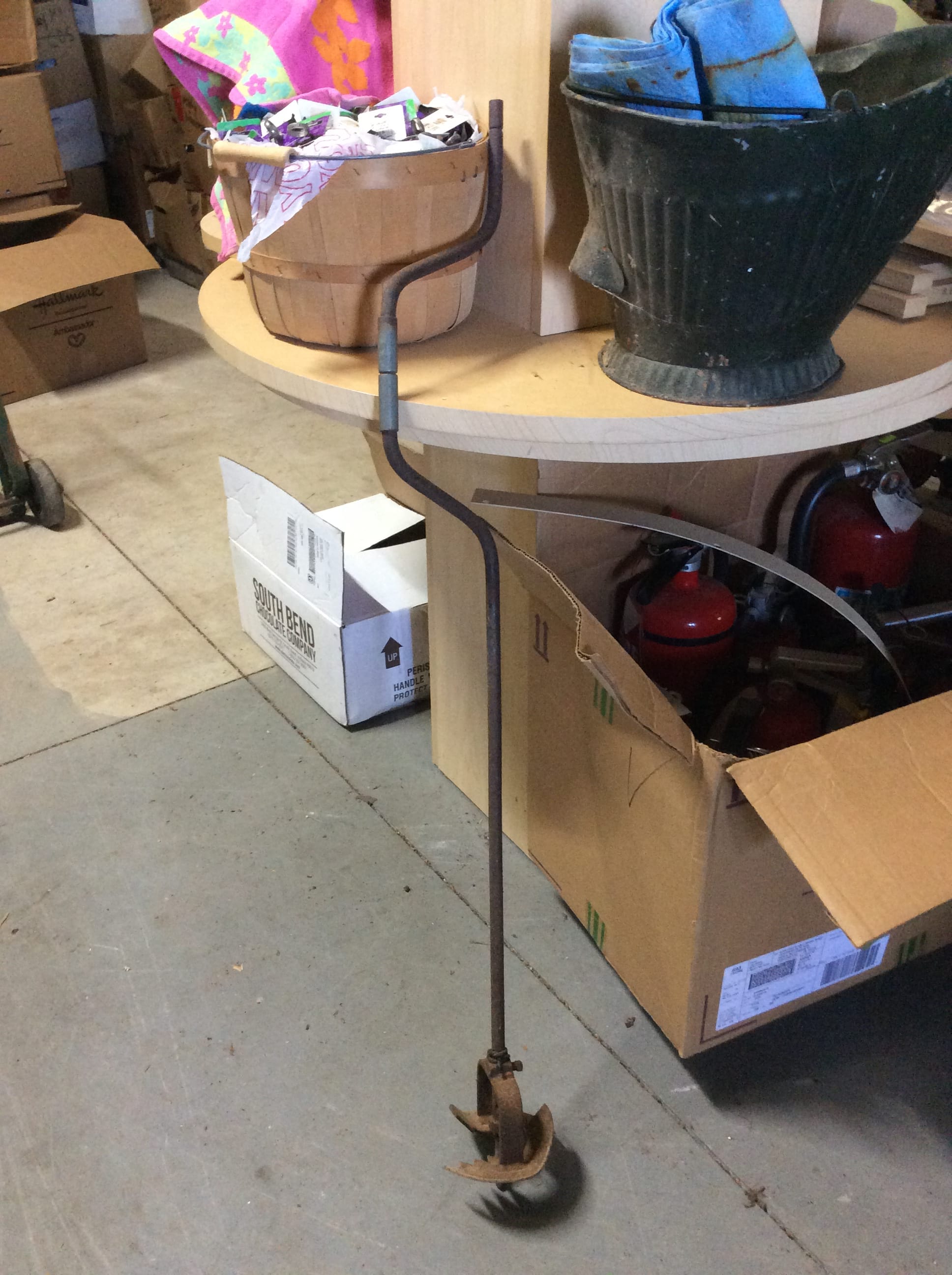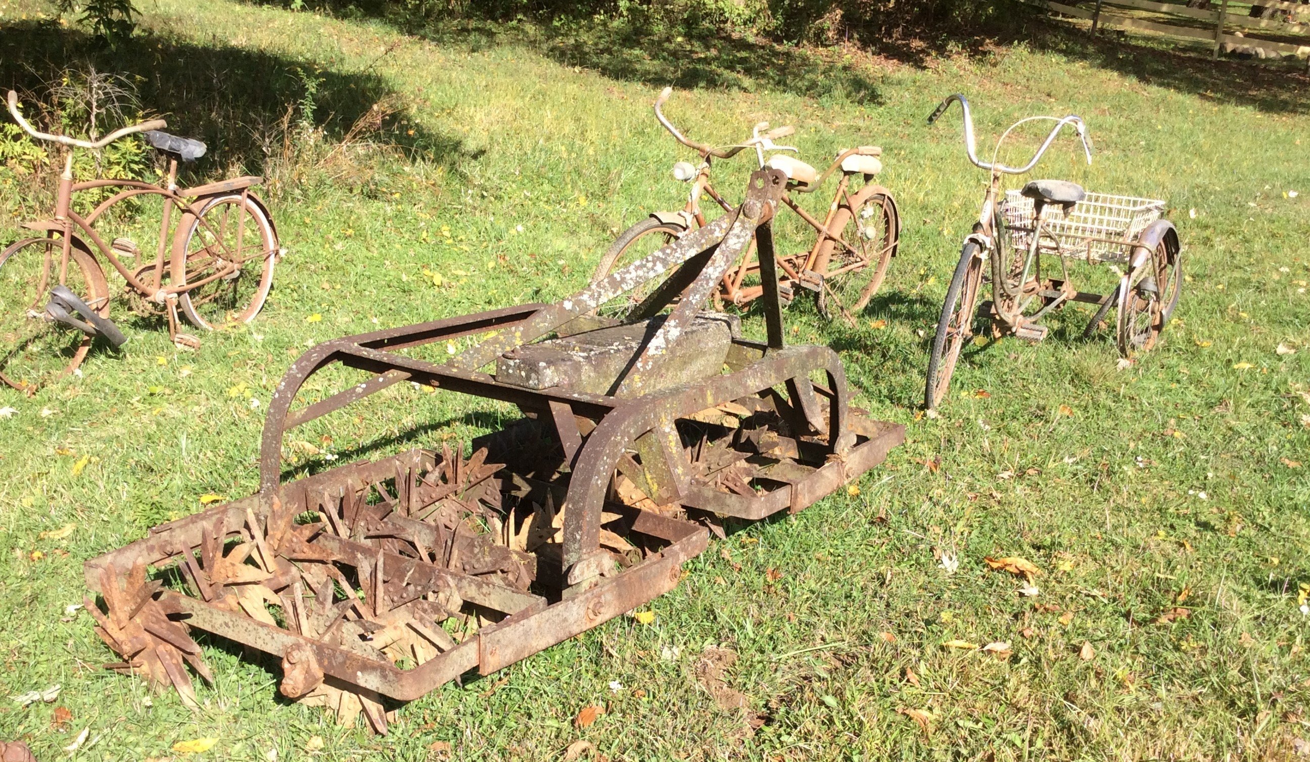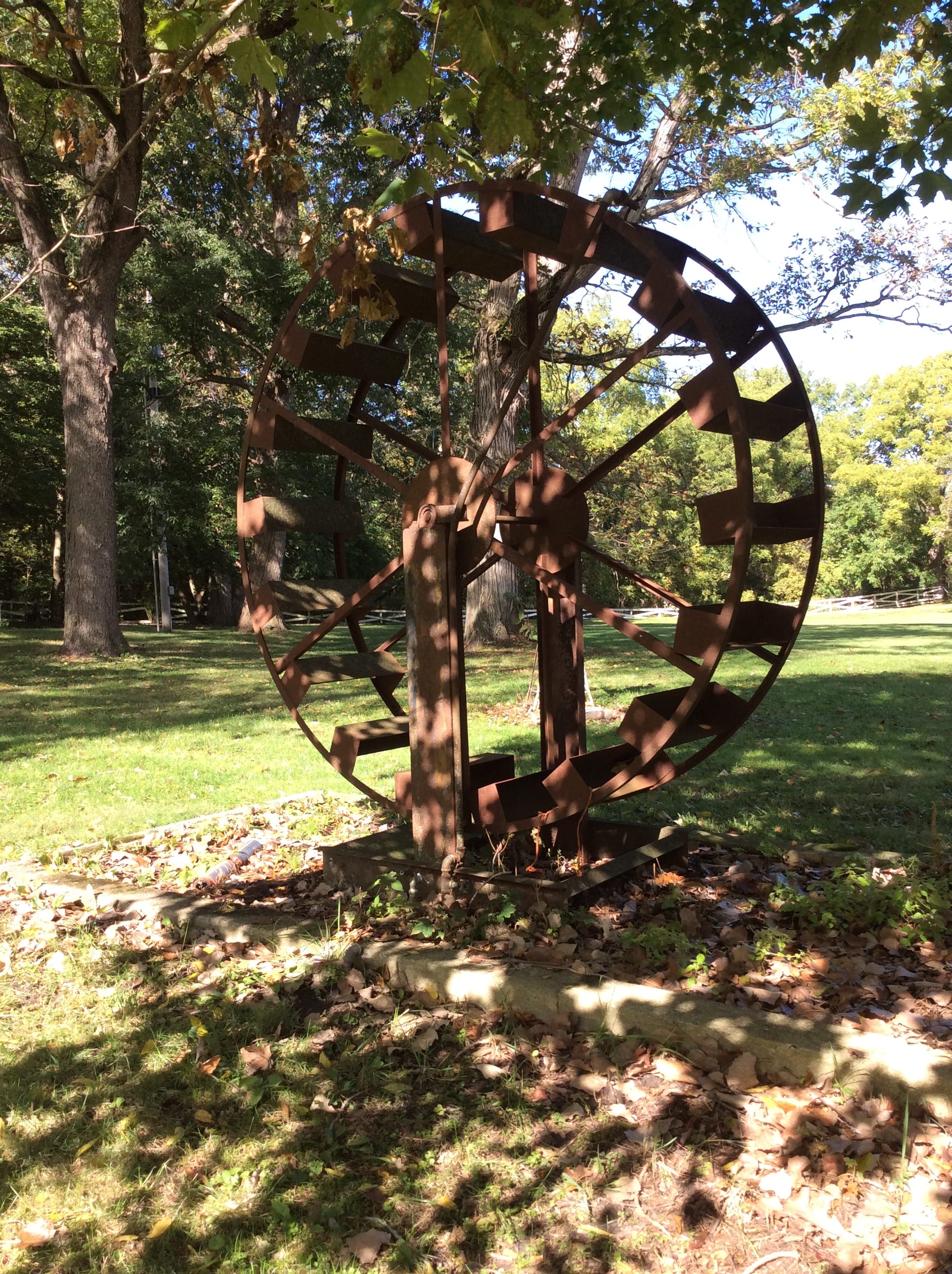 Iron Skillets; Wood Corn Sheller; Water Wheel; Barn Lanterns; Coal Bucket; Spring