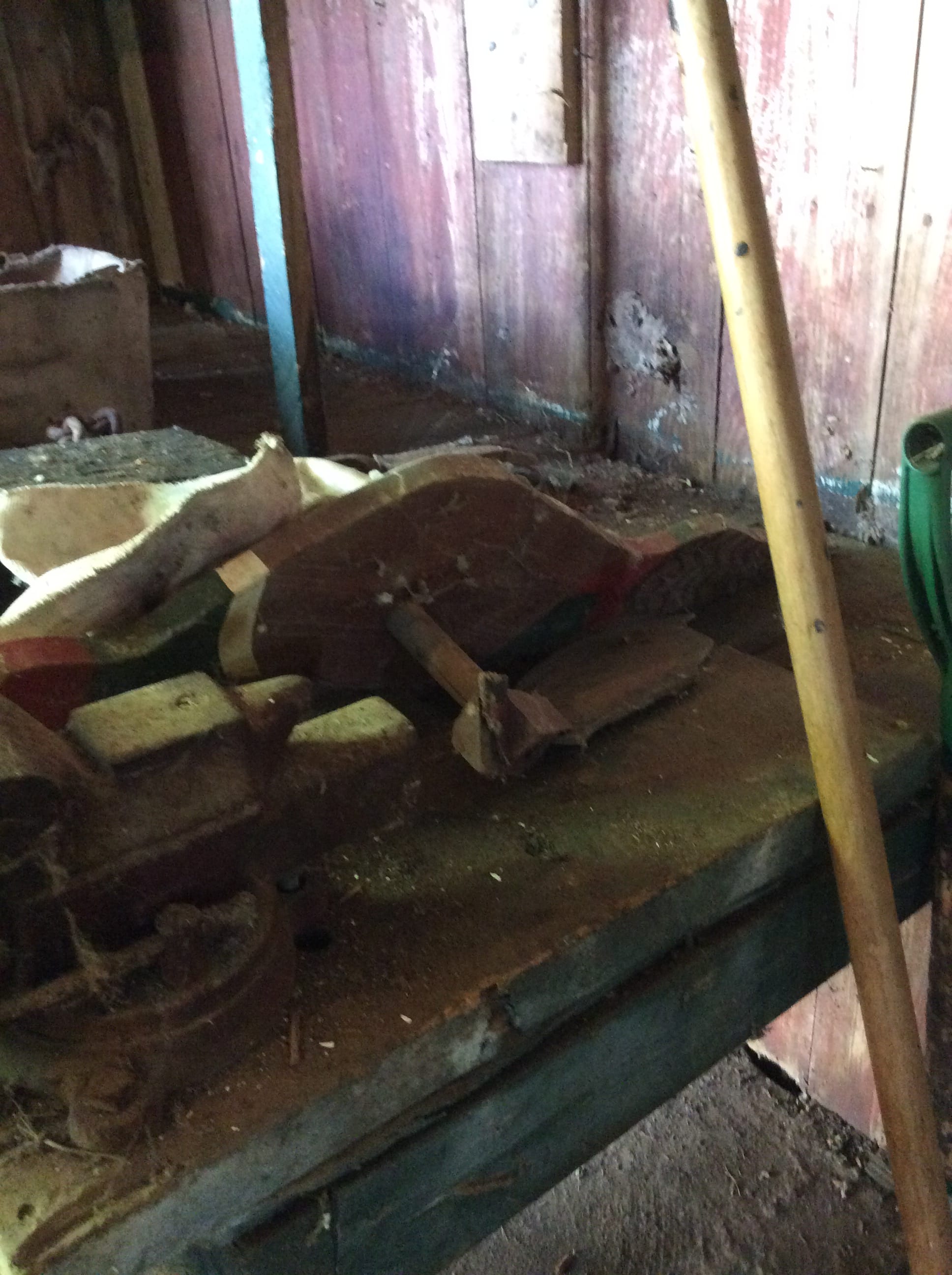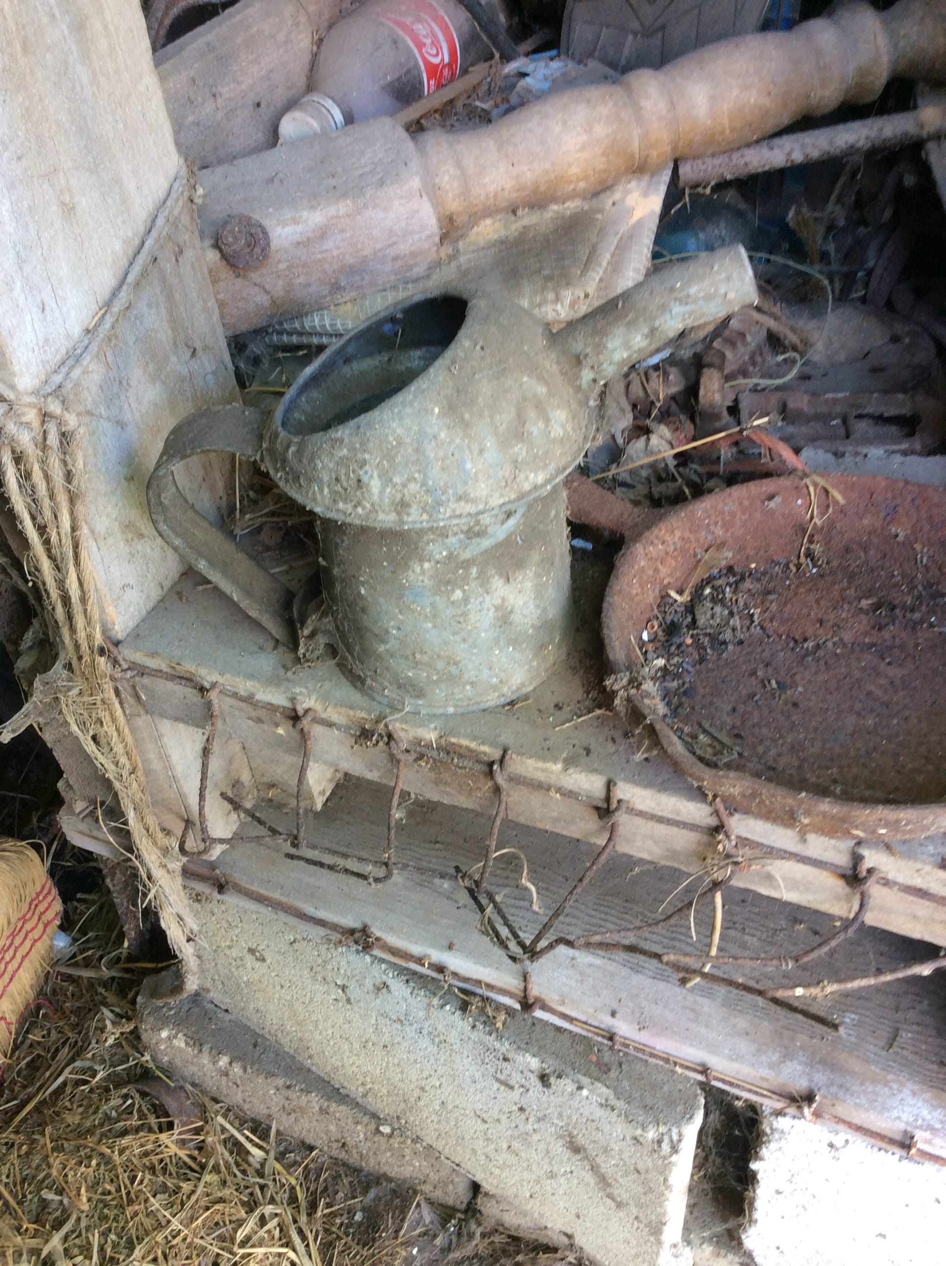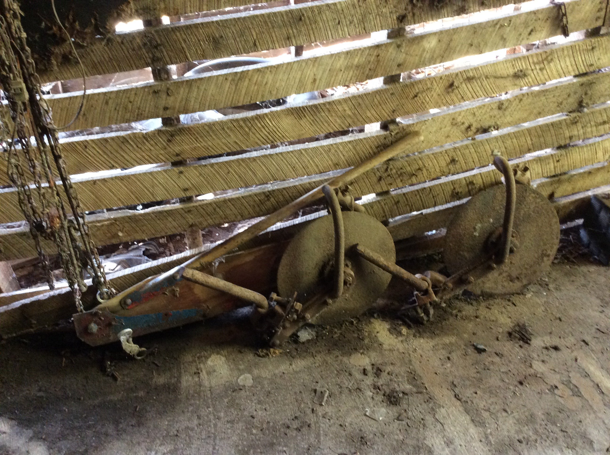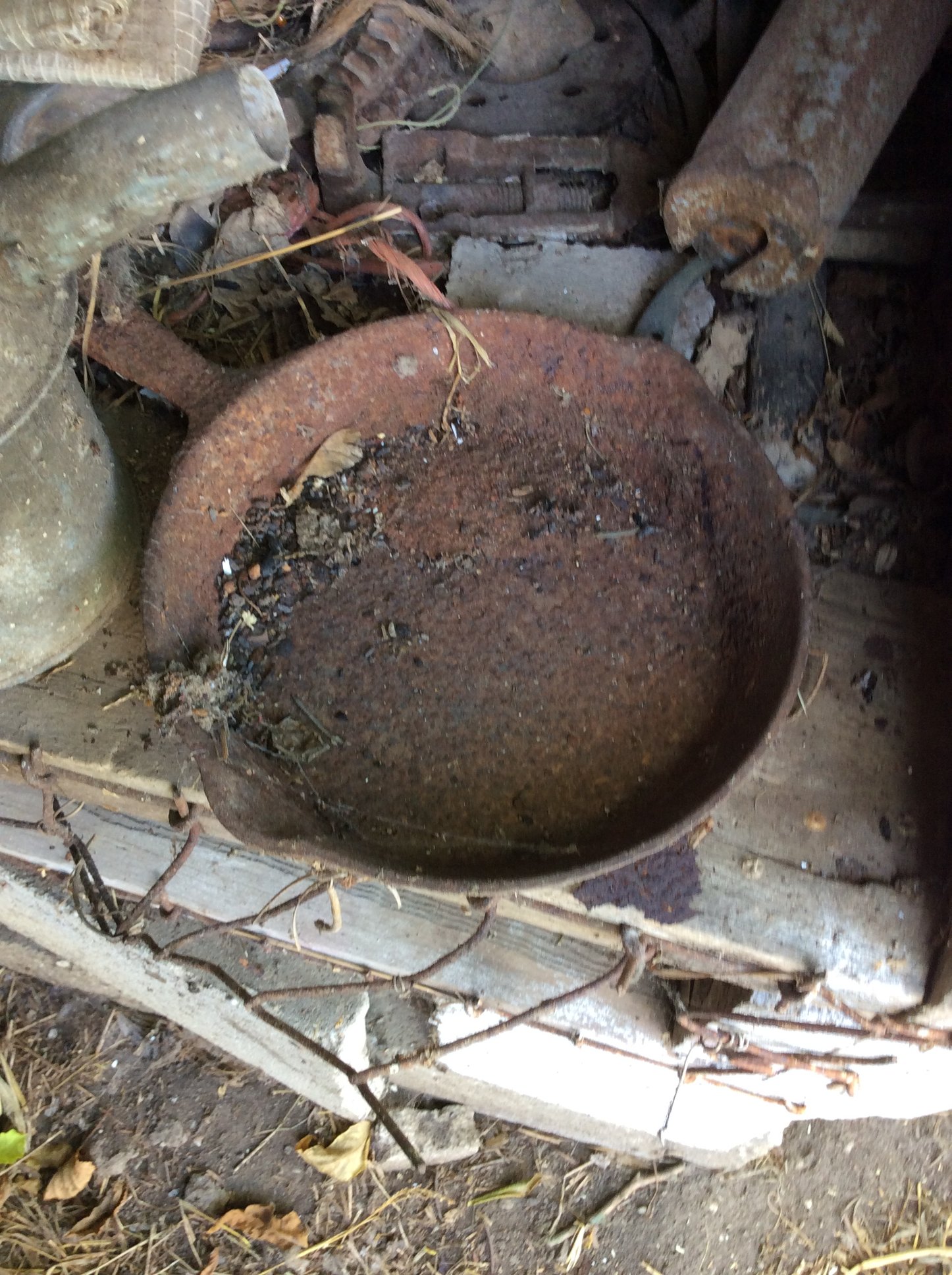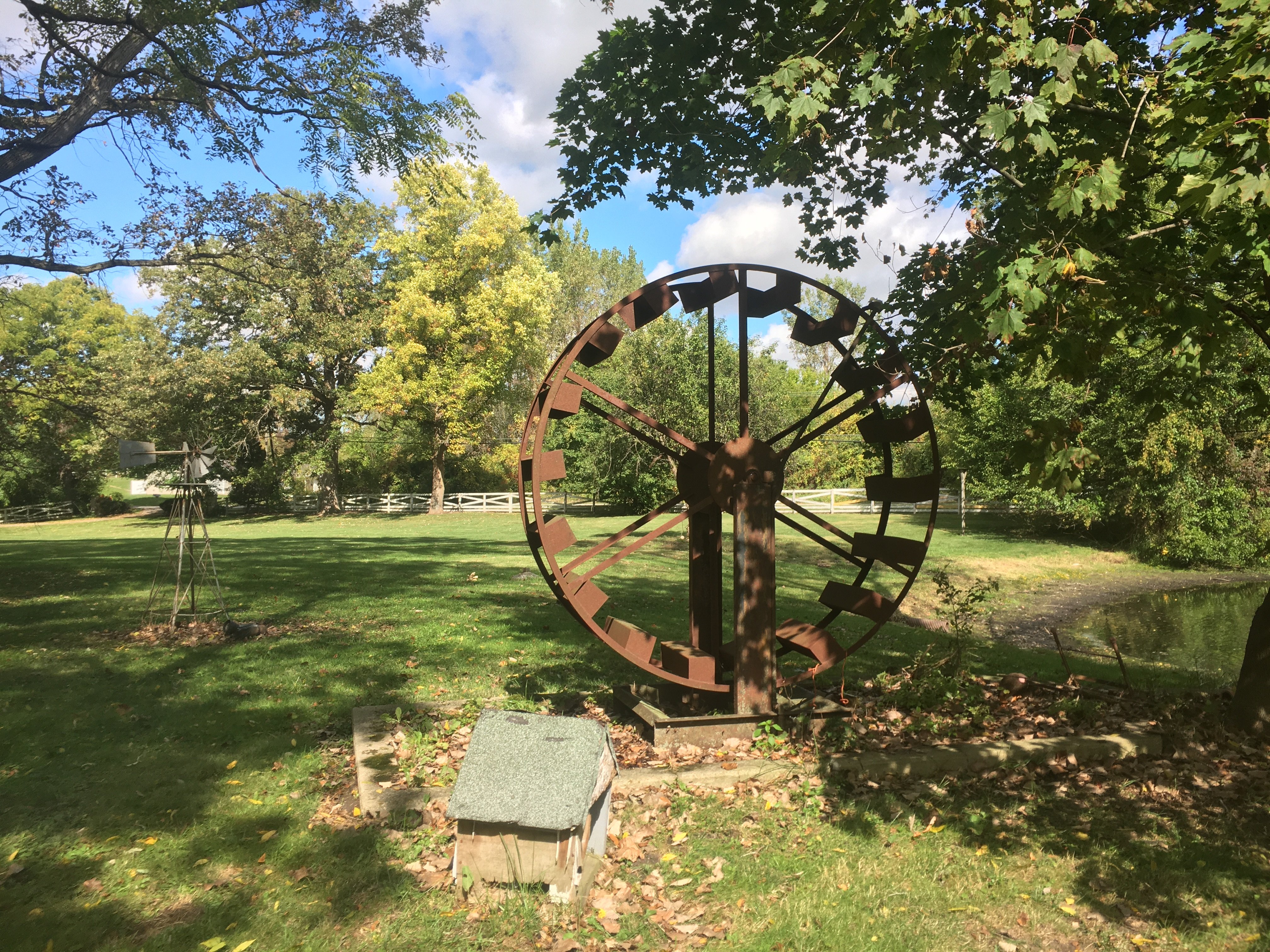 Iron Skillets; Wood Corn Sheller; Water Wheel; Barn Lanterns; Coal Bucket; Spring