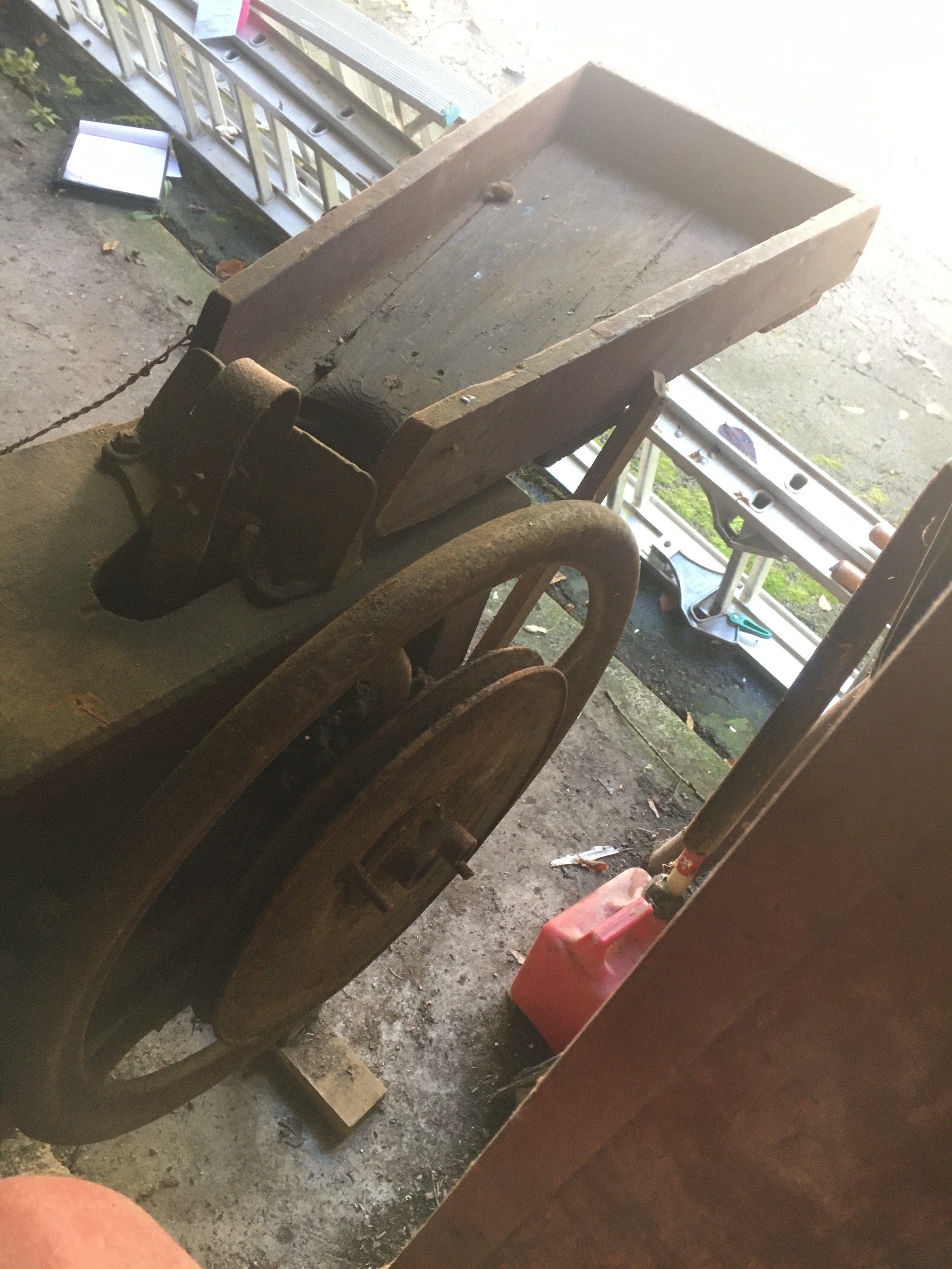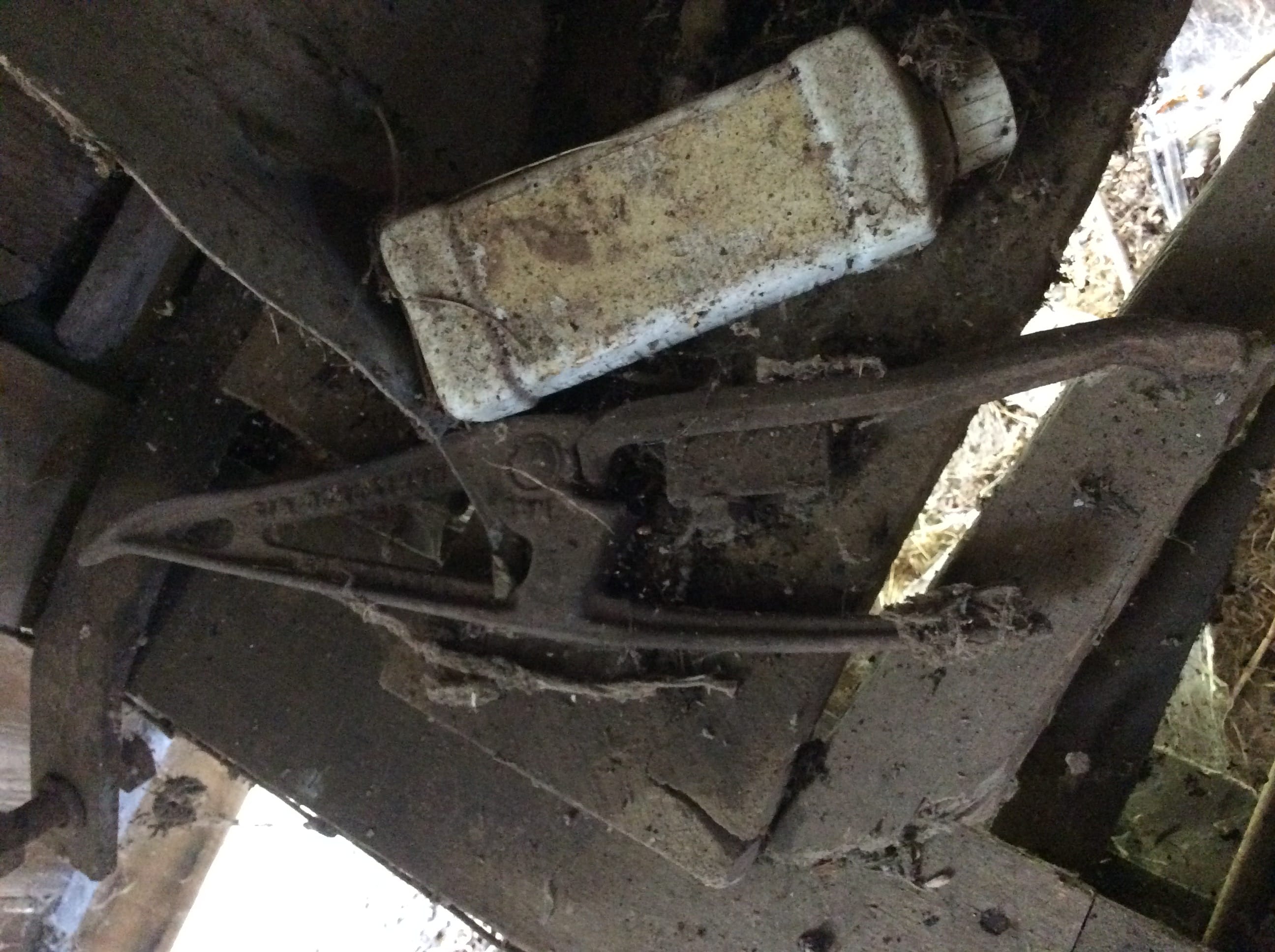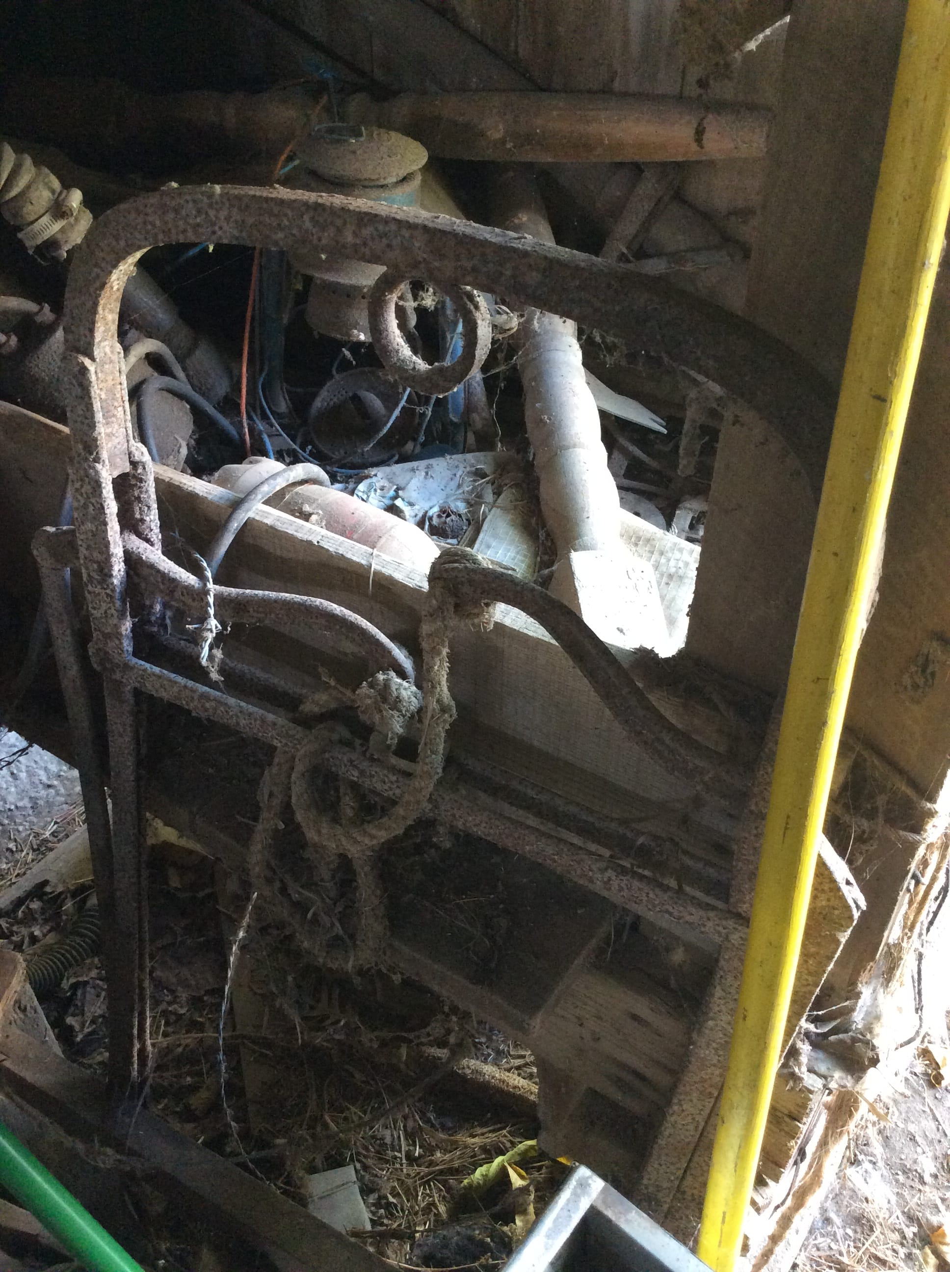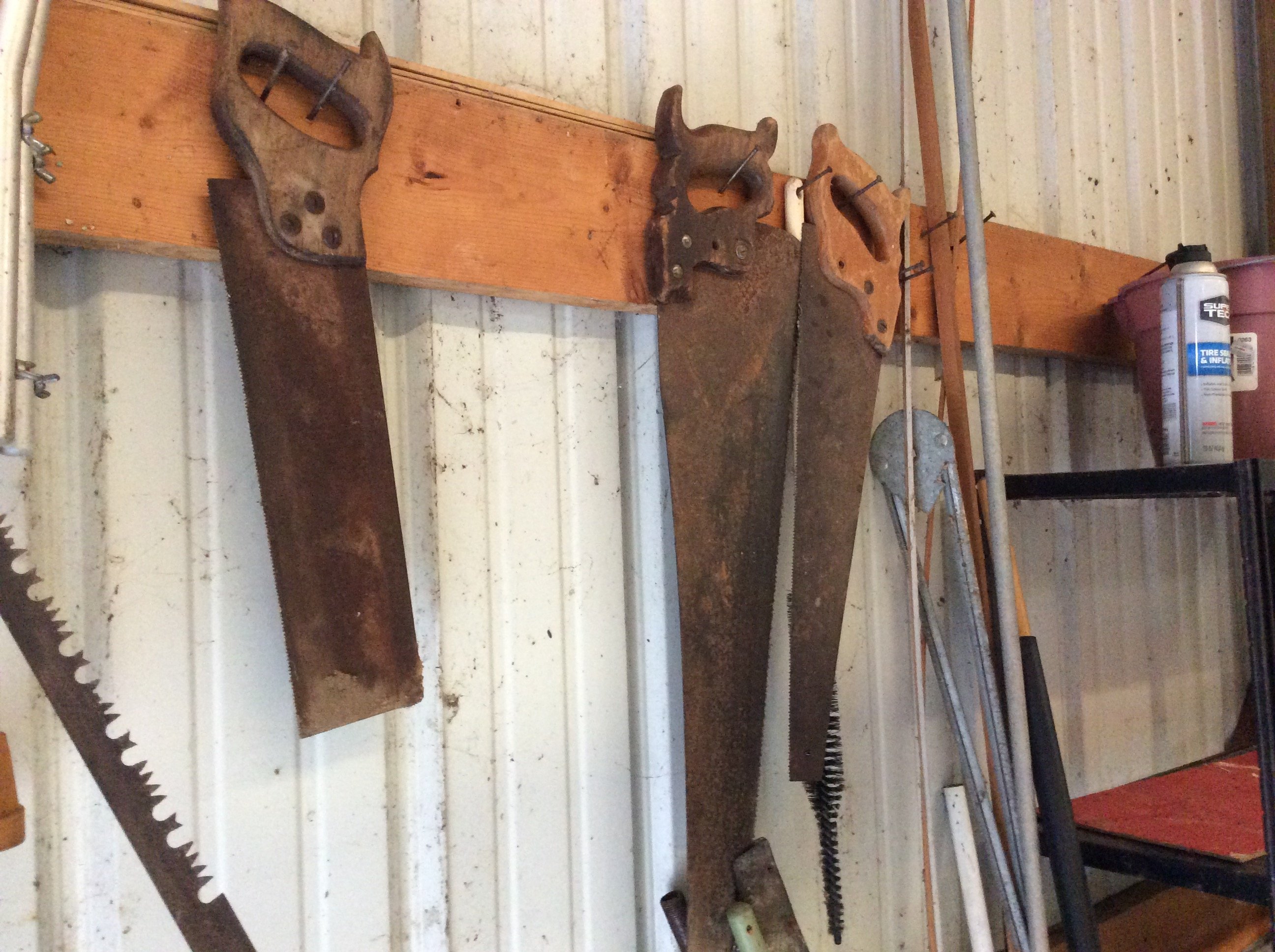 Seat; Hay Trolley; Galvanized Oil Cans, Buckets & Tubs; Hand Saws; Antique