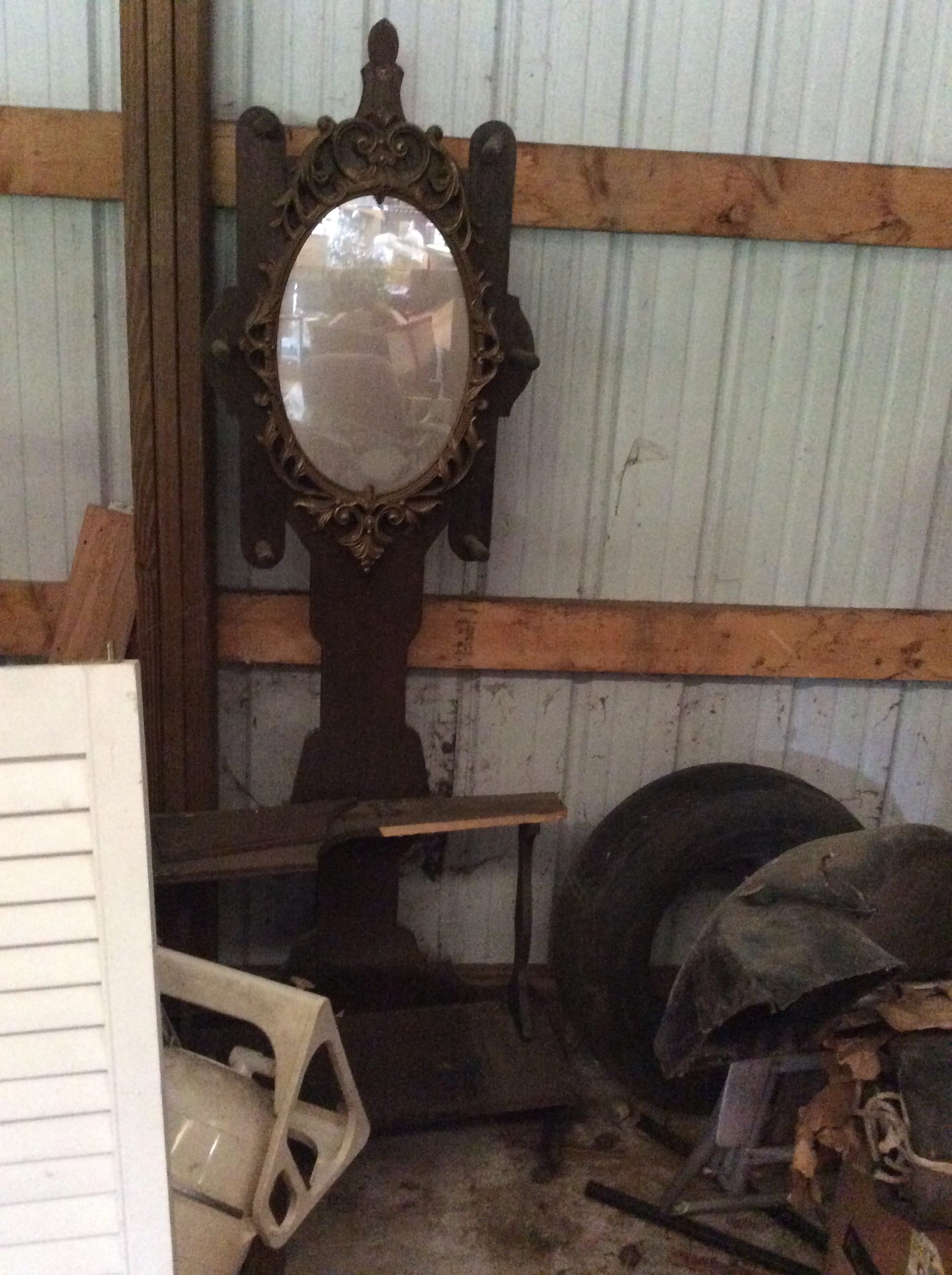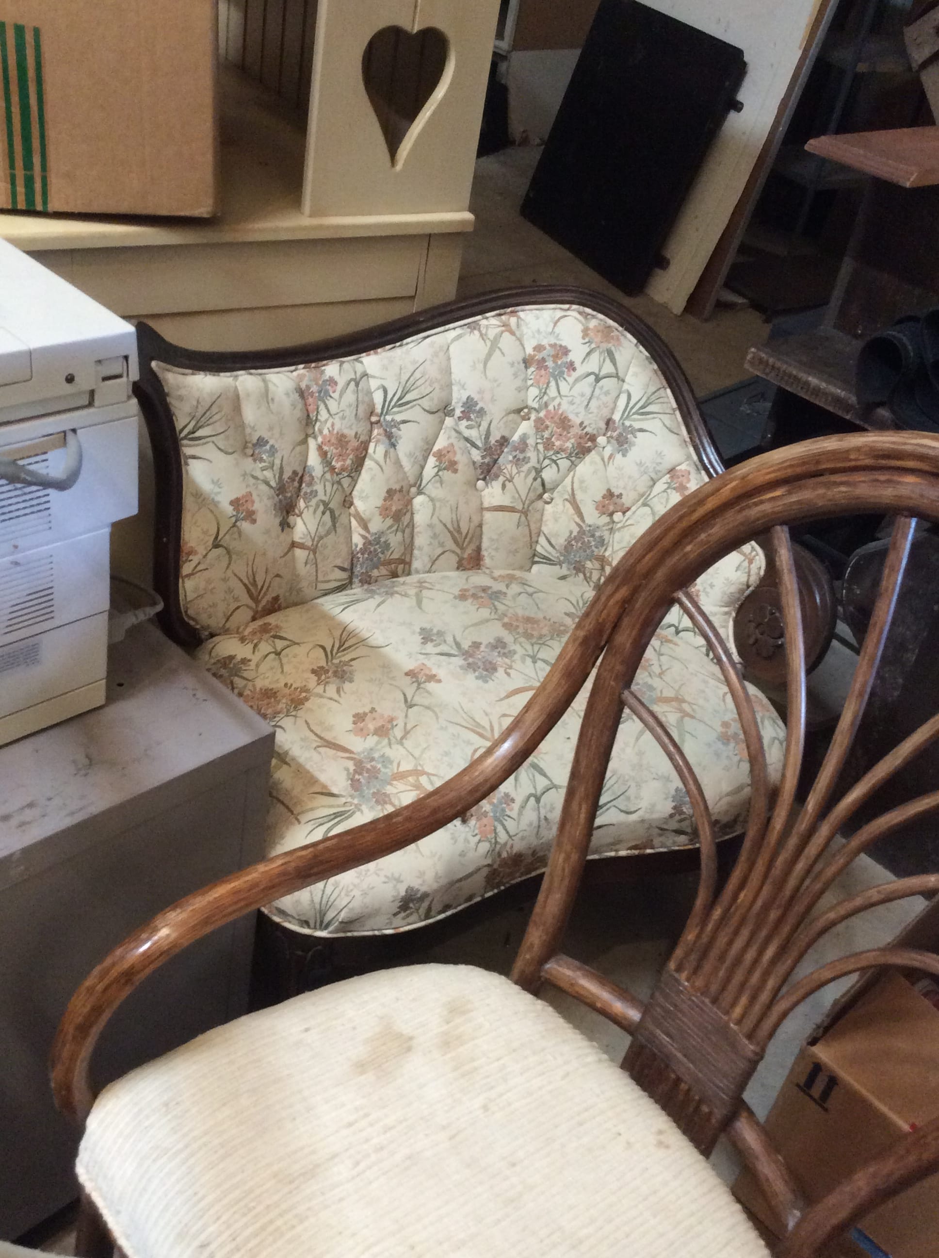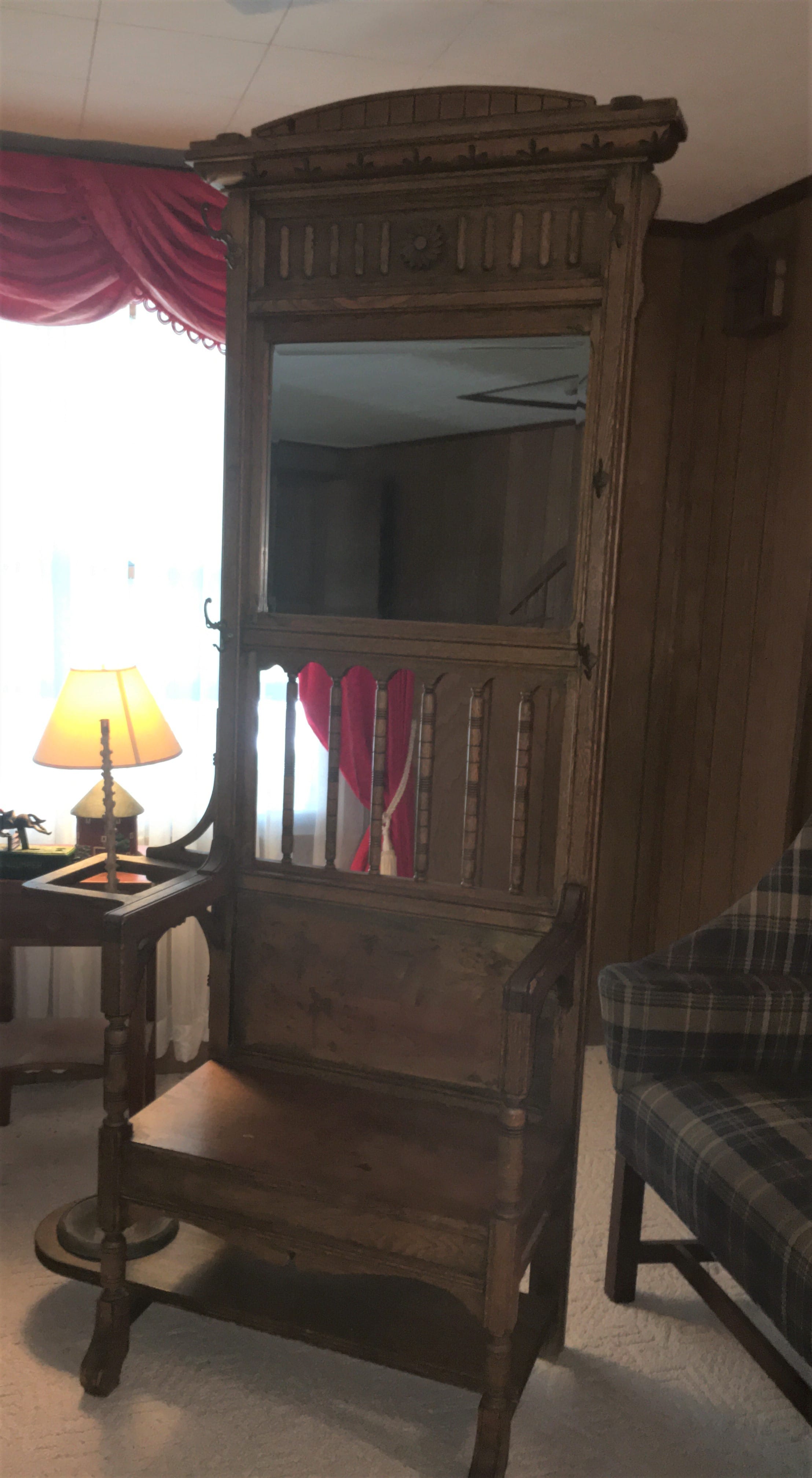 Settee; Vic. Straight Chairs; Drop Leaf Tables; Vic. Hall Mirrors; Antique Bed;