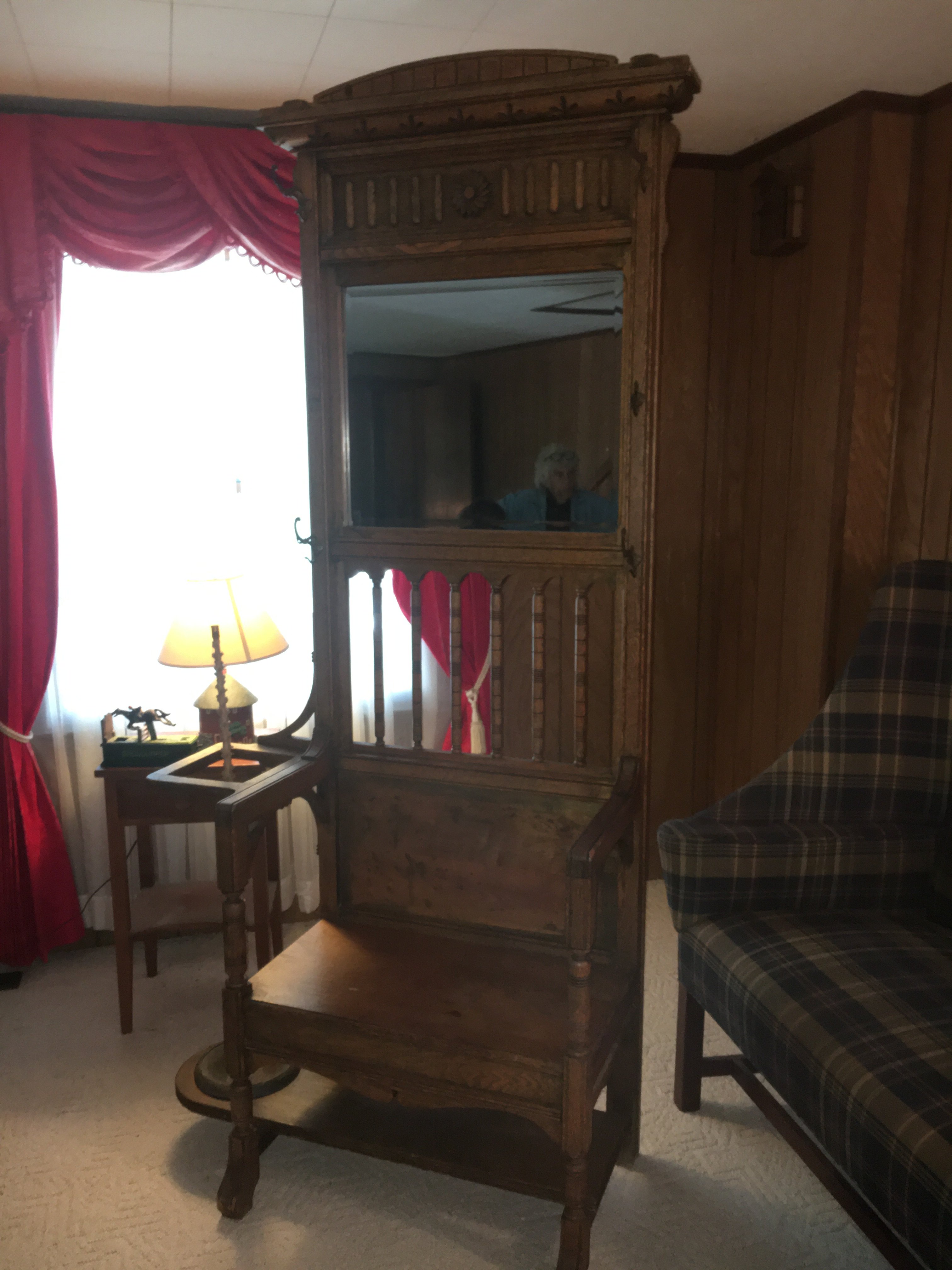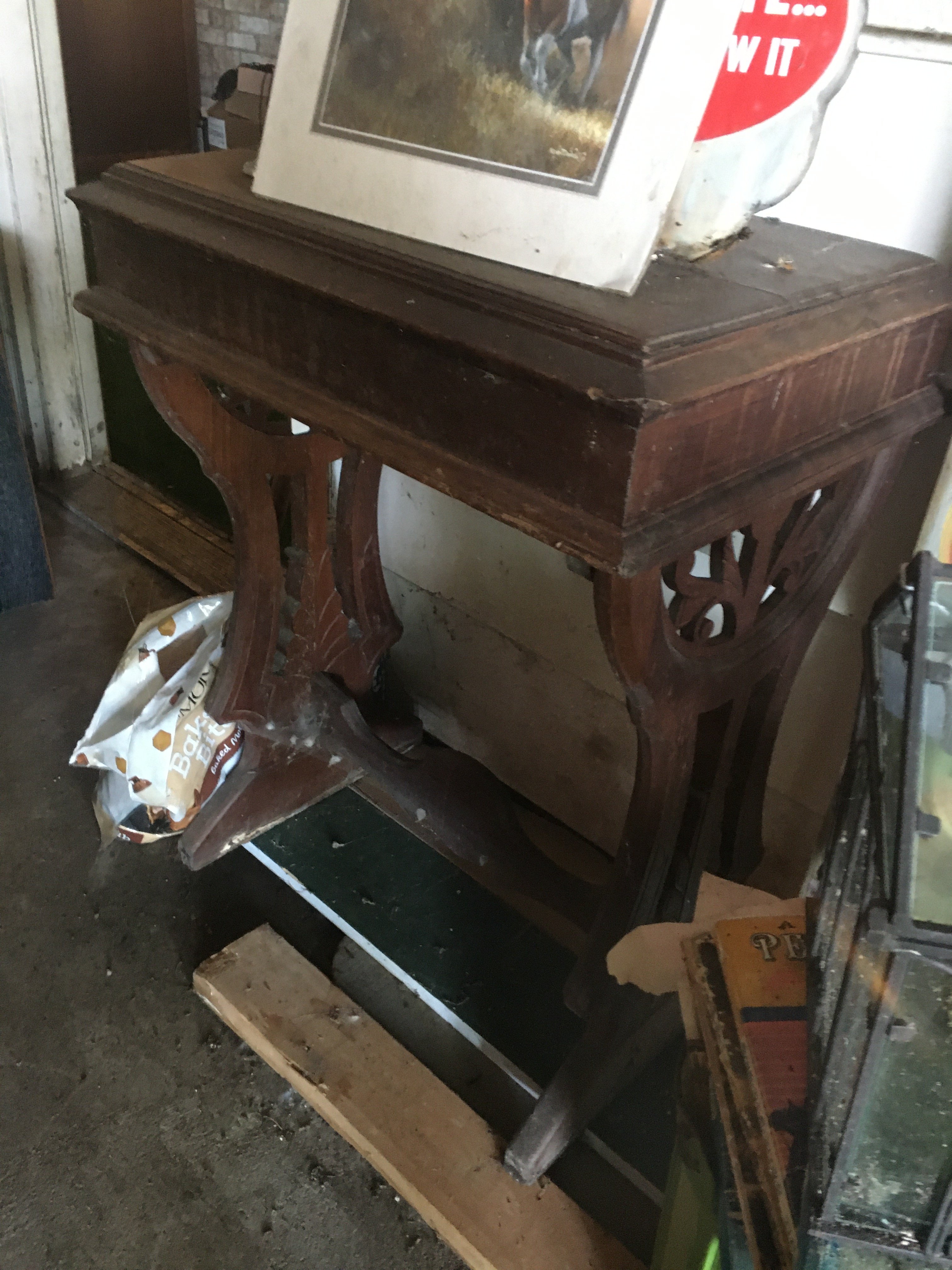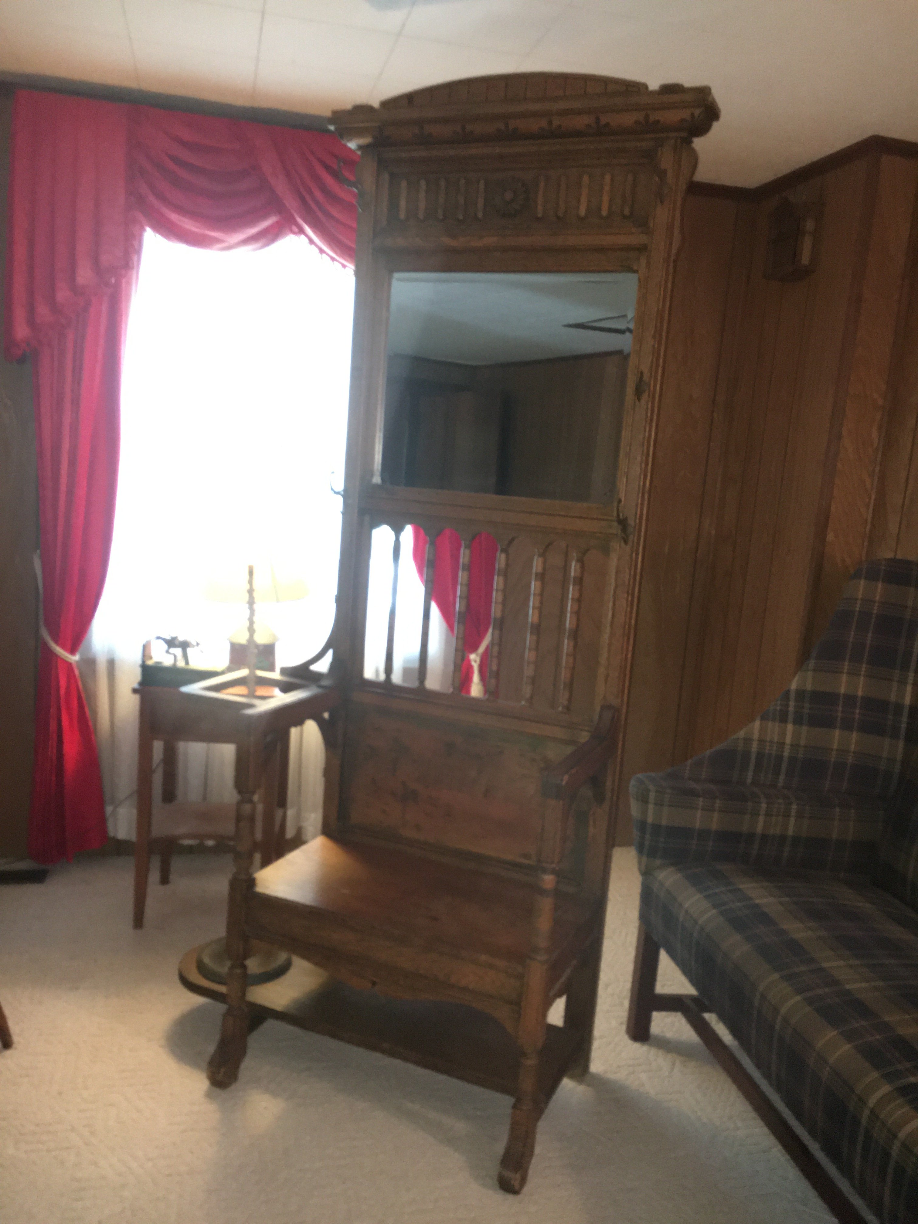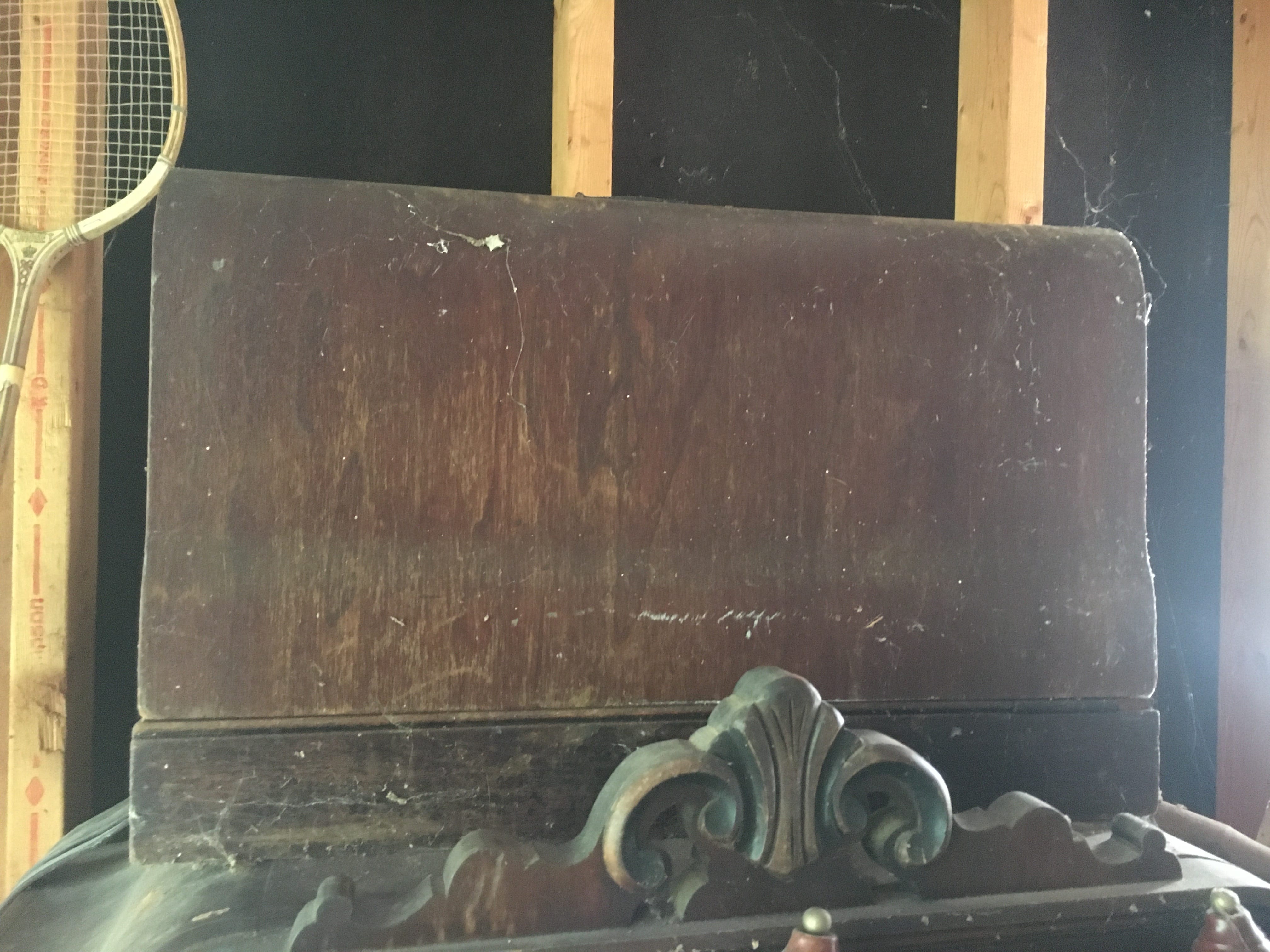 Settee; Vic. Straight Chairs; Drop Leaf Tables; Vic. Hall Mirrors; Antique Bed;