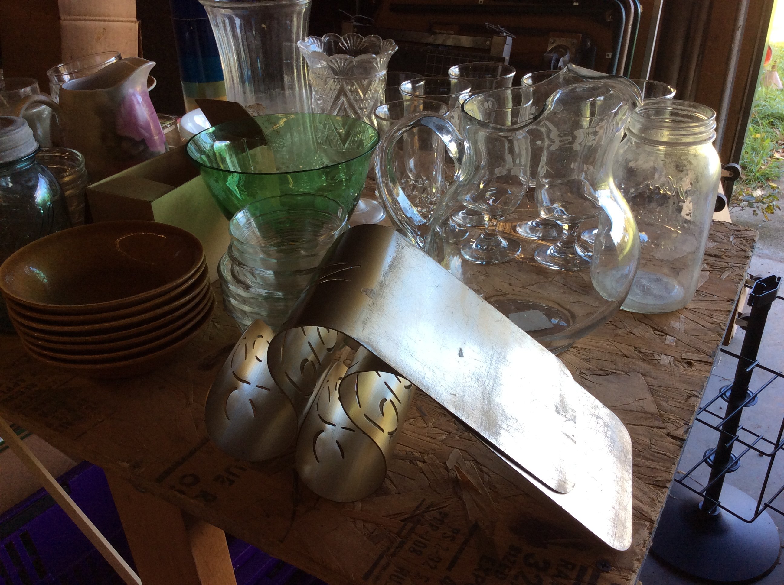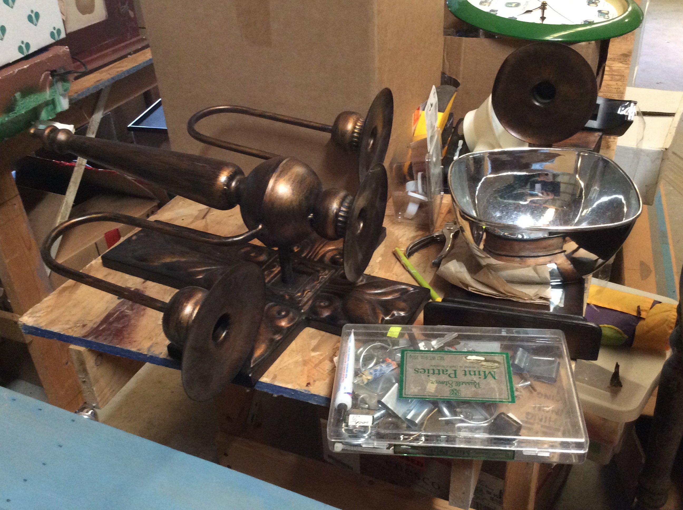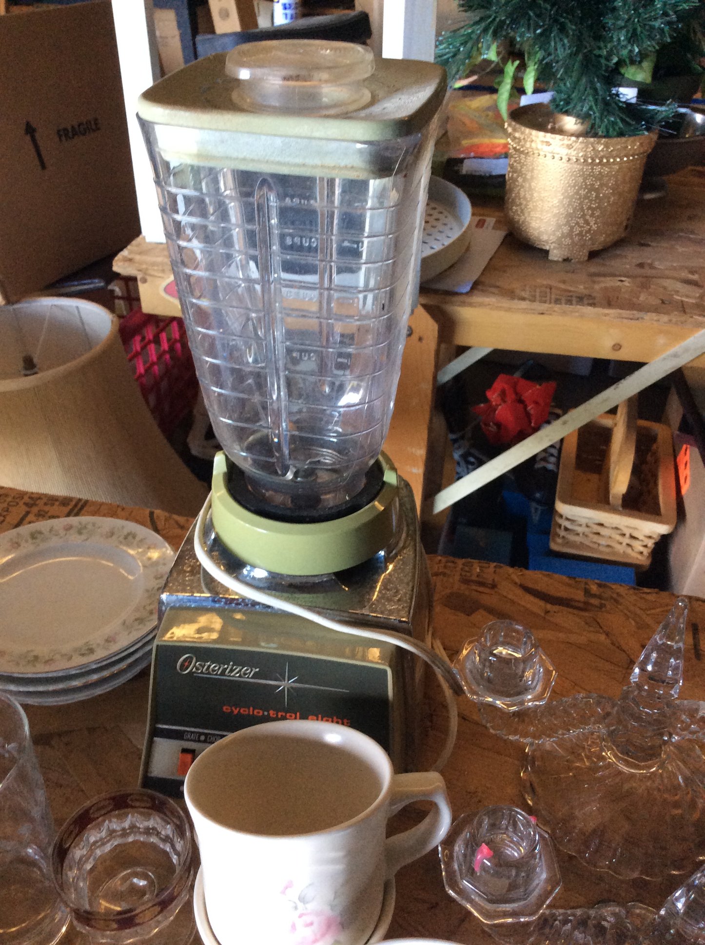 Rotary Sewing Machine; Vintage Fans; Kitchen Scale; Cream Top Milk Bottle; Decanters;