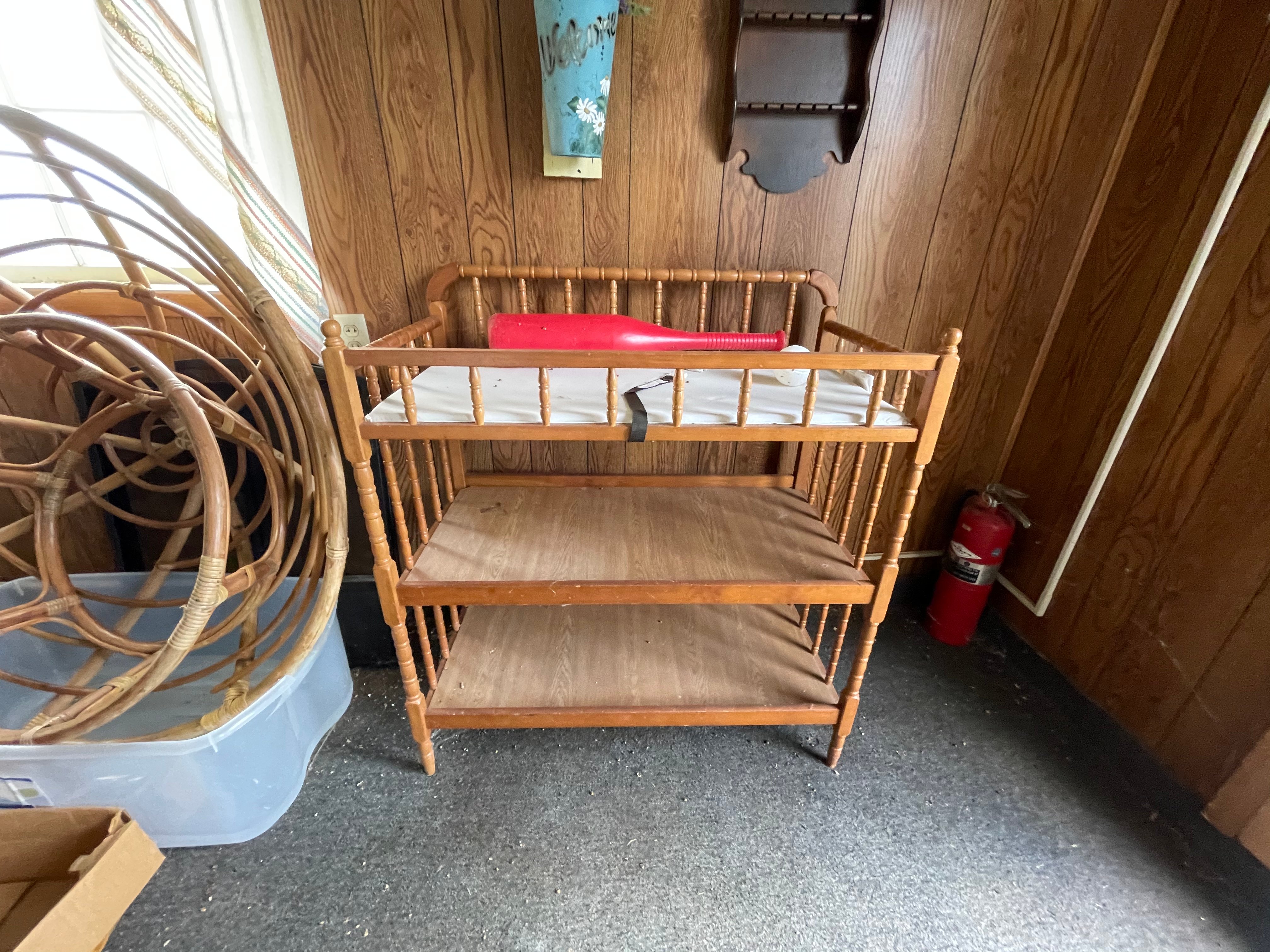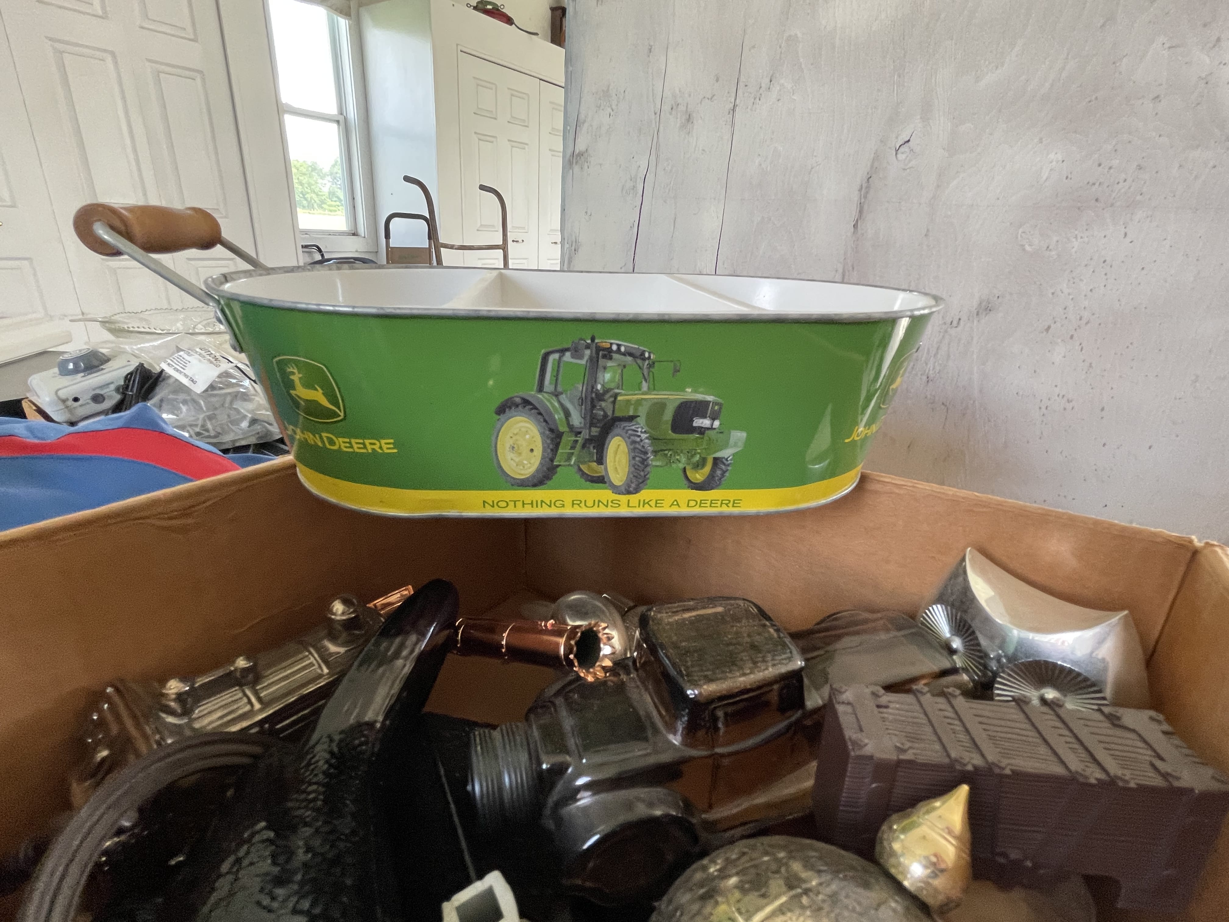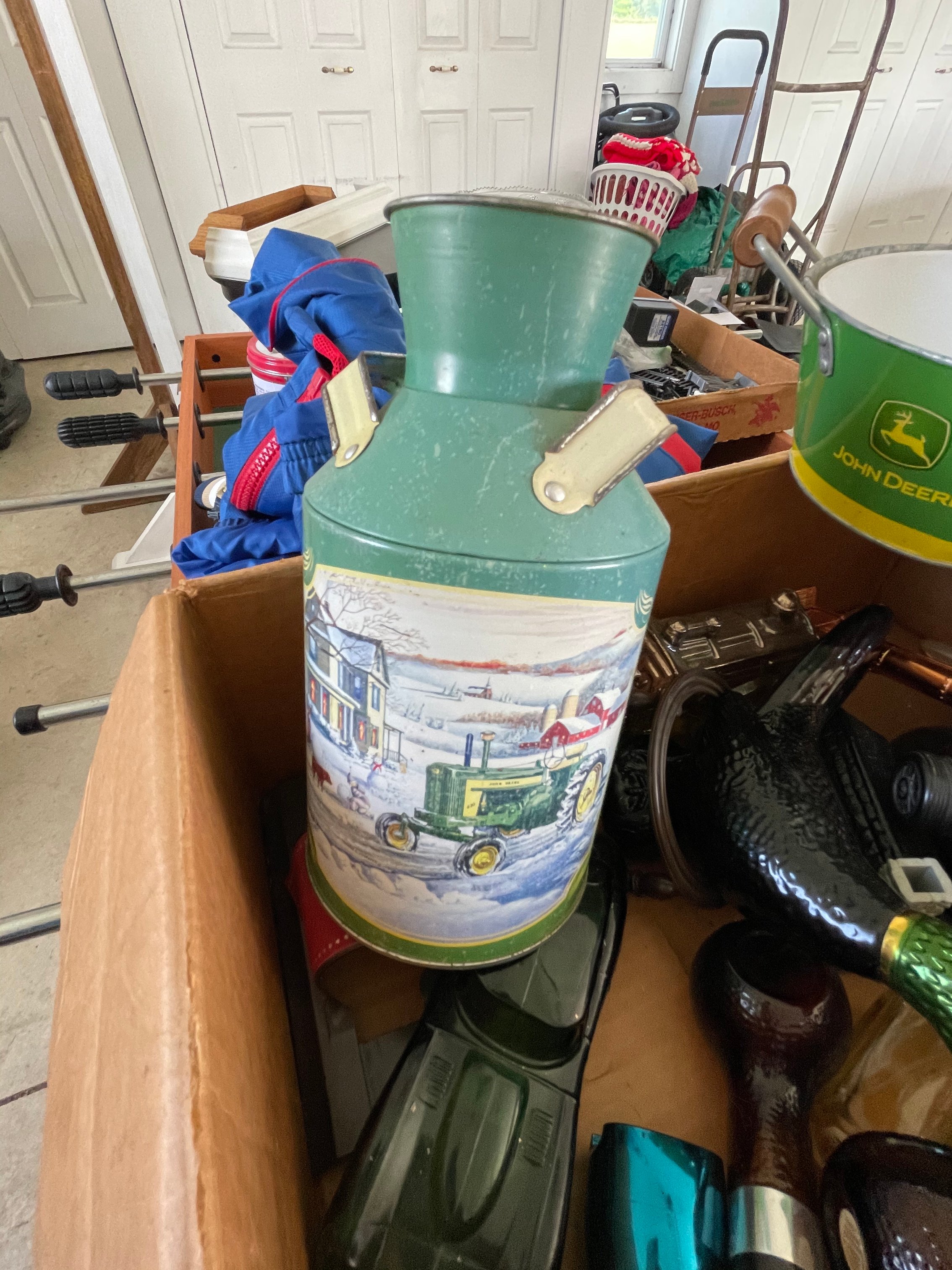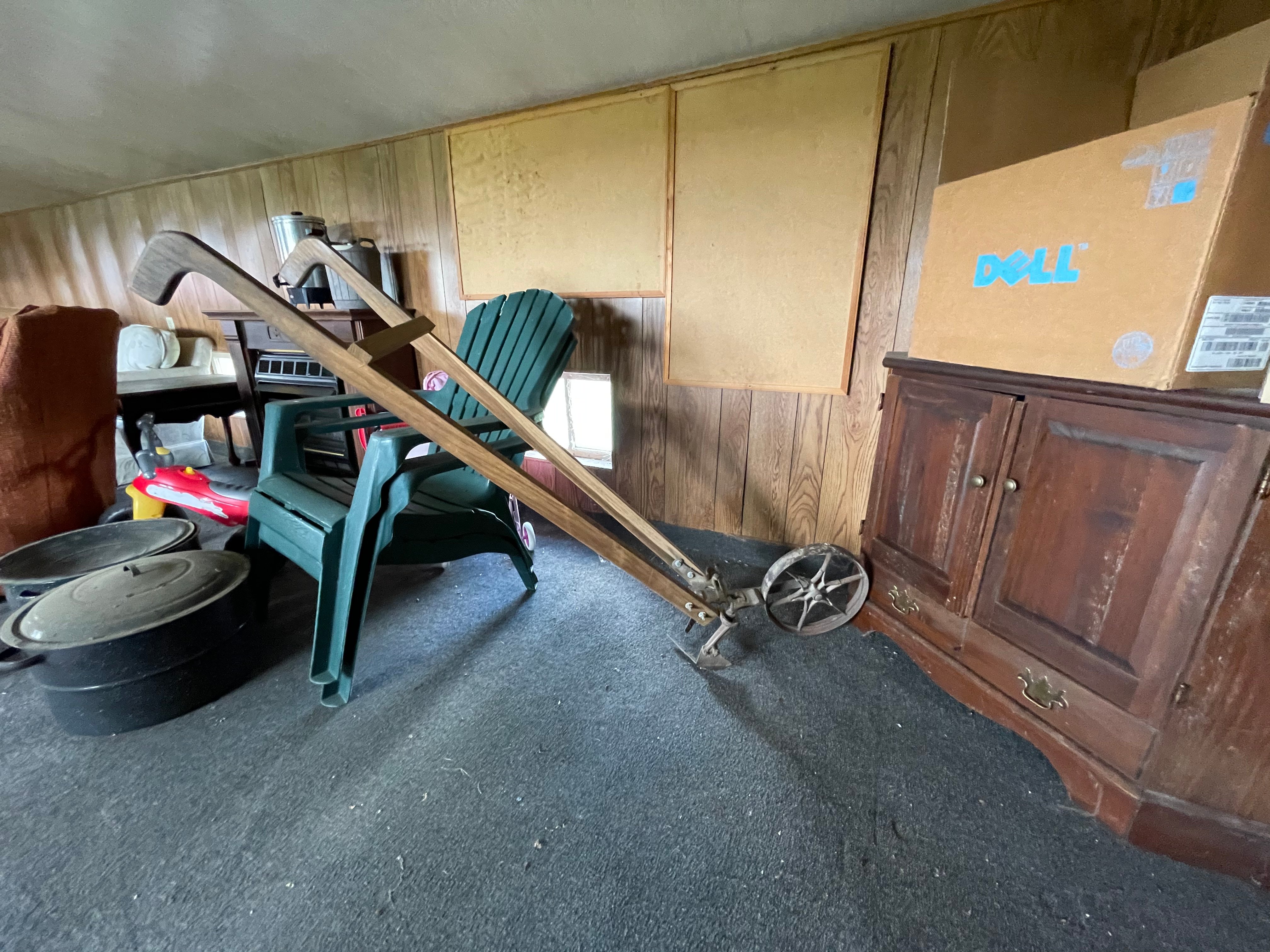 Painted Waterfall Chest of Drawers; Dining Room Table & Chairs; Slant Front Desk; School Desk; Dry Sink; Ladderback Chairs; Jenny Lind Changing Table; Set of Lockers; Hall Tree; Wall Clock; Ridgeway Grandfather Clock; Oil Lamps; Pfaltzgraff Set of Dishes & Canisters; Green Depression Glass; Ruby Glass; Aluminum Pitcher; Decanters; Cast Iron Bell; Antique Doors; Barn Windows; Milk Can; Buck Saw; Garden Planter; Antique Tools; Wood Tool Chest; Rag Rugs; Wood Pulleys; Pioneer Thermometer; Repair Manuals inc. Chiltons; Records: Elvis Presley, Diana Ross & The Supremes, Ray Charles, Kansas, KISS & More; Lil Red Wagon; 15+ Franklin Mint Tractor Knives; John Deere Collectables; Kids Toys; Doll Rocker: