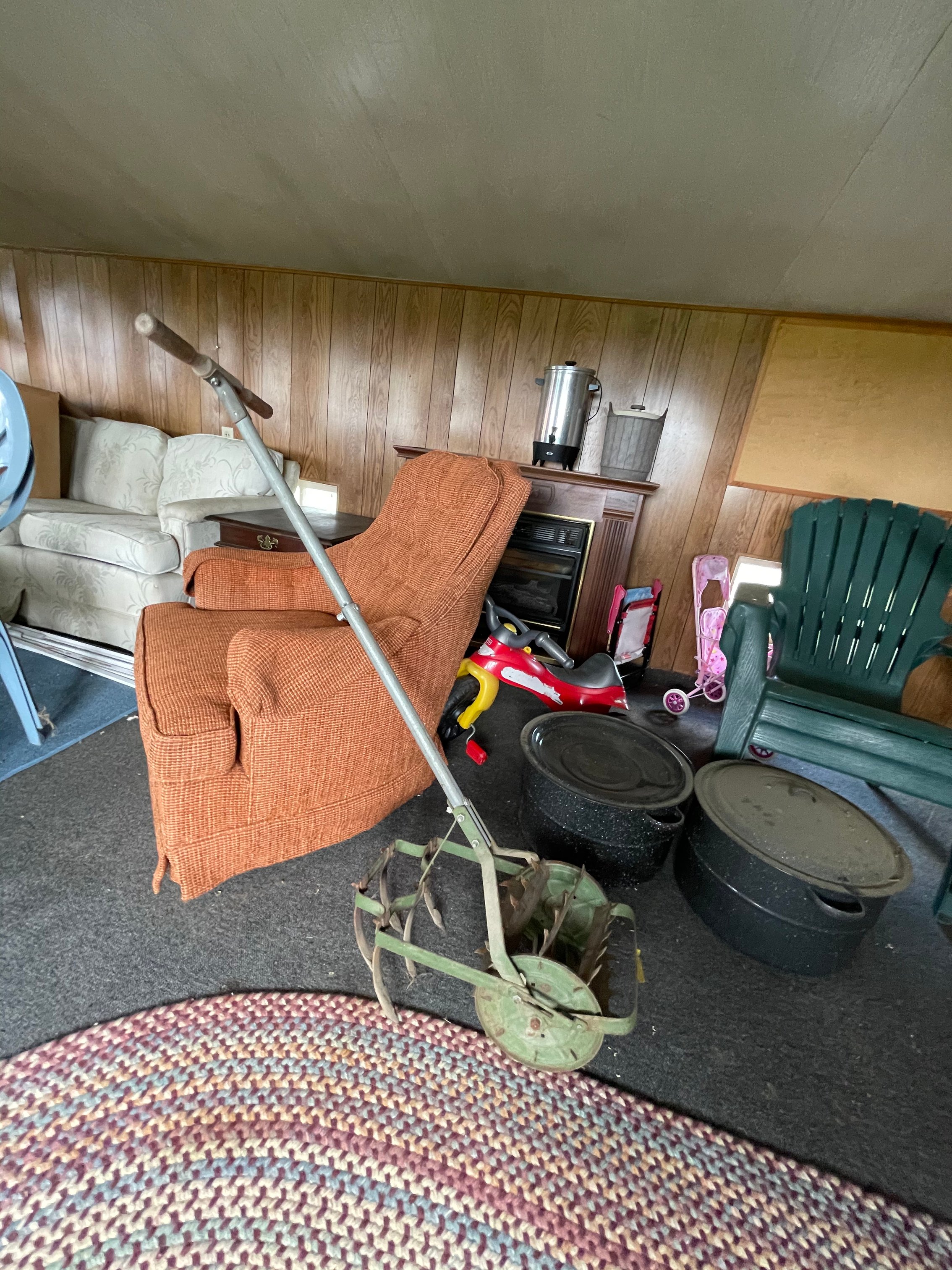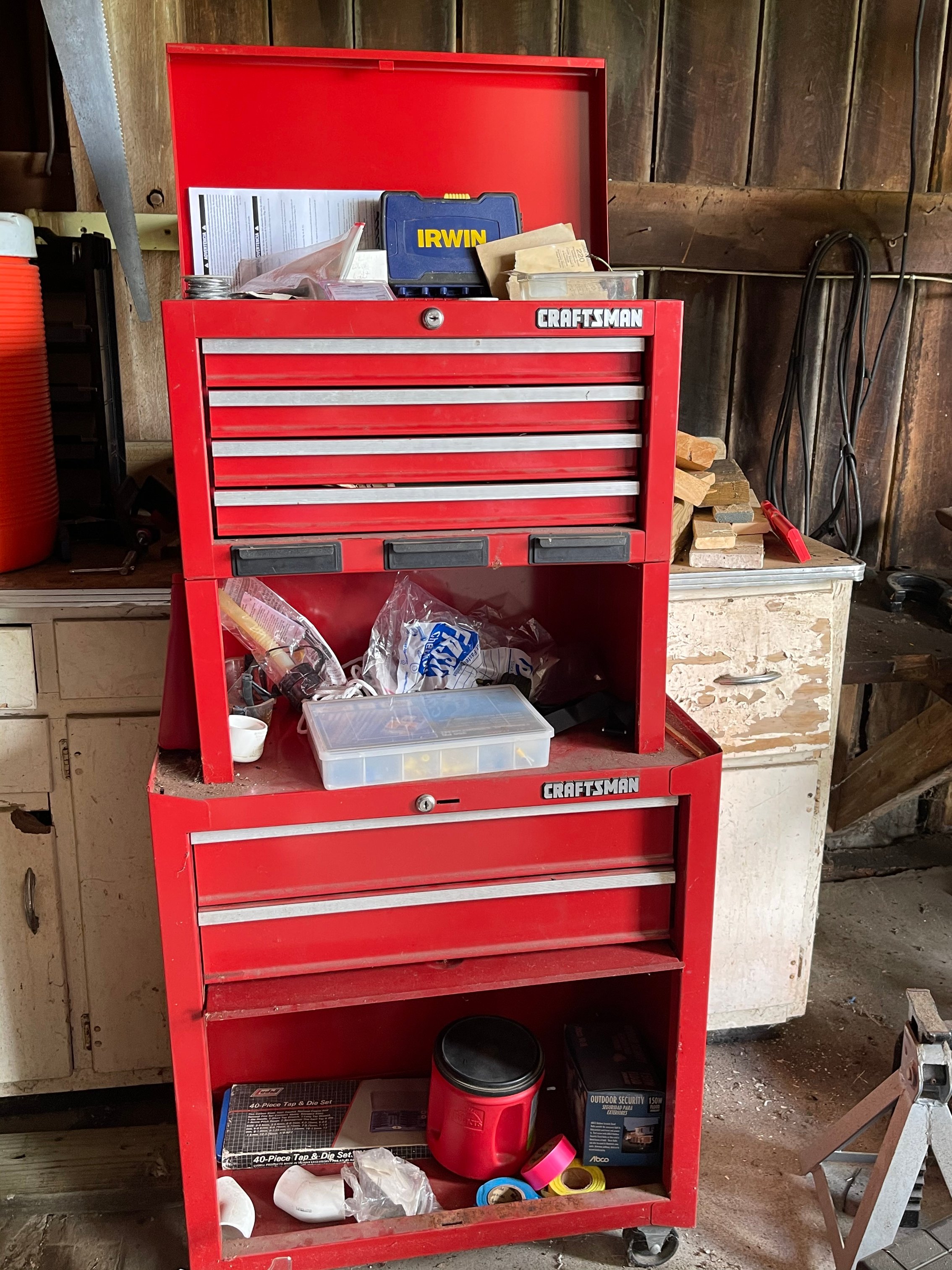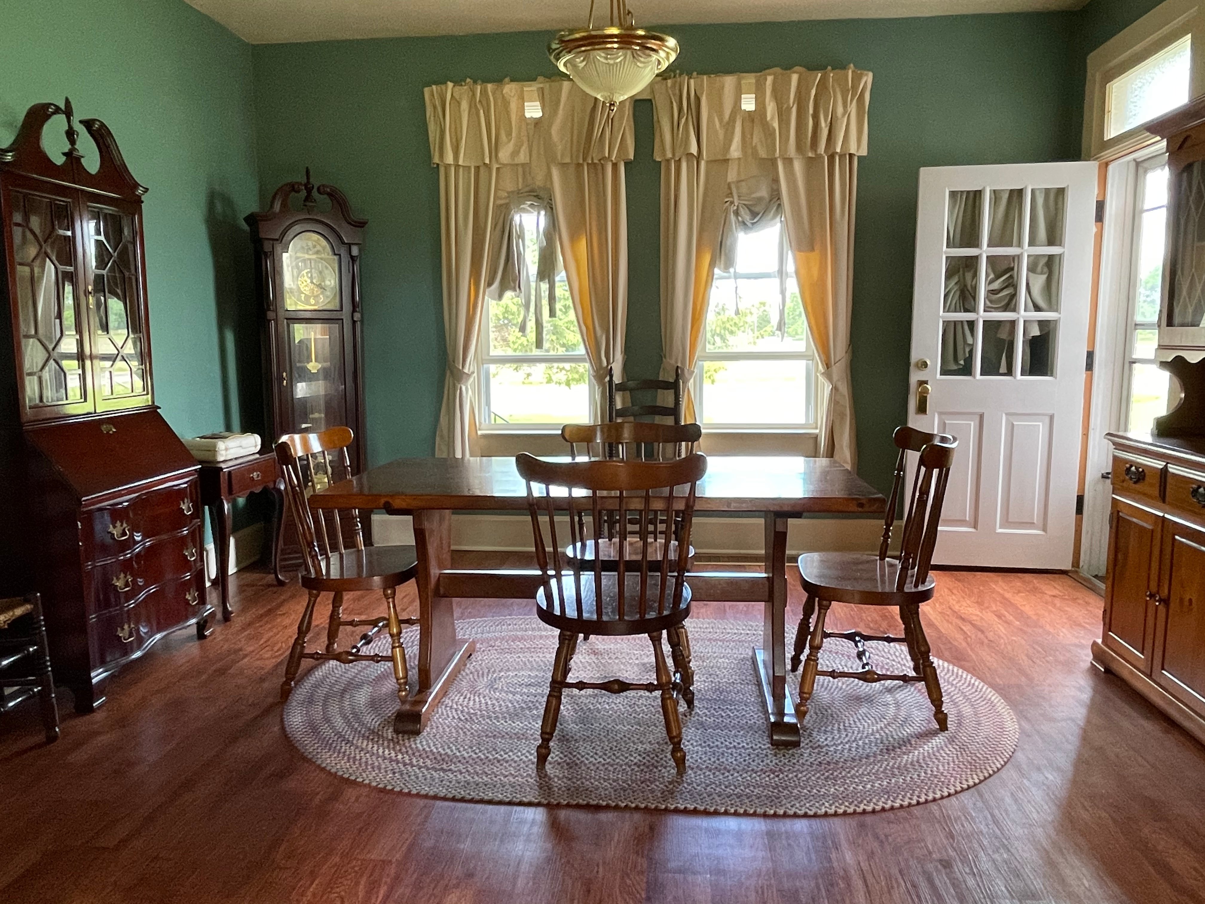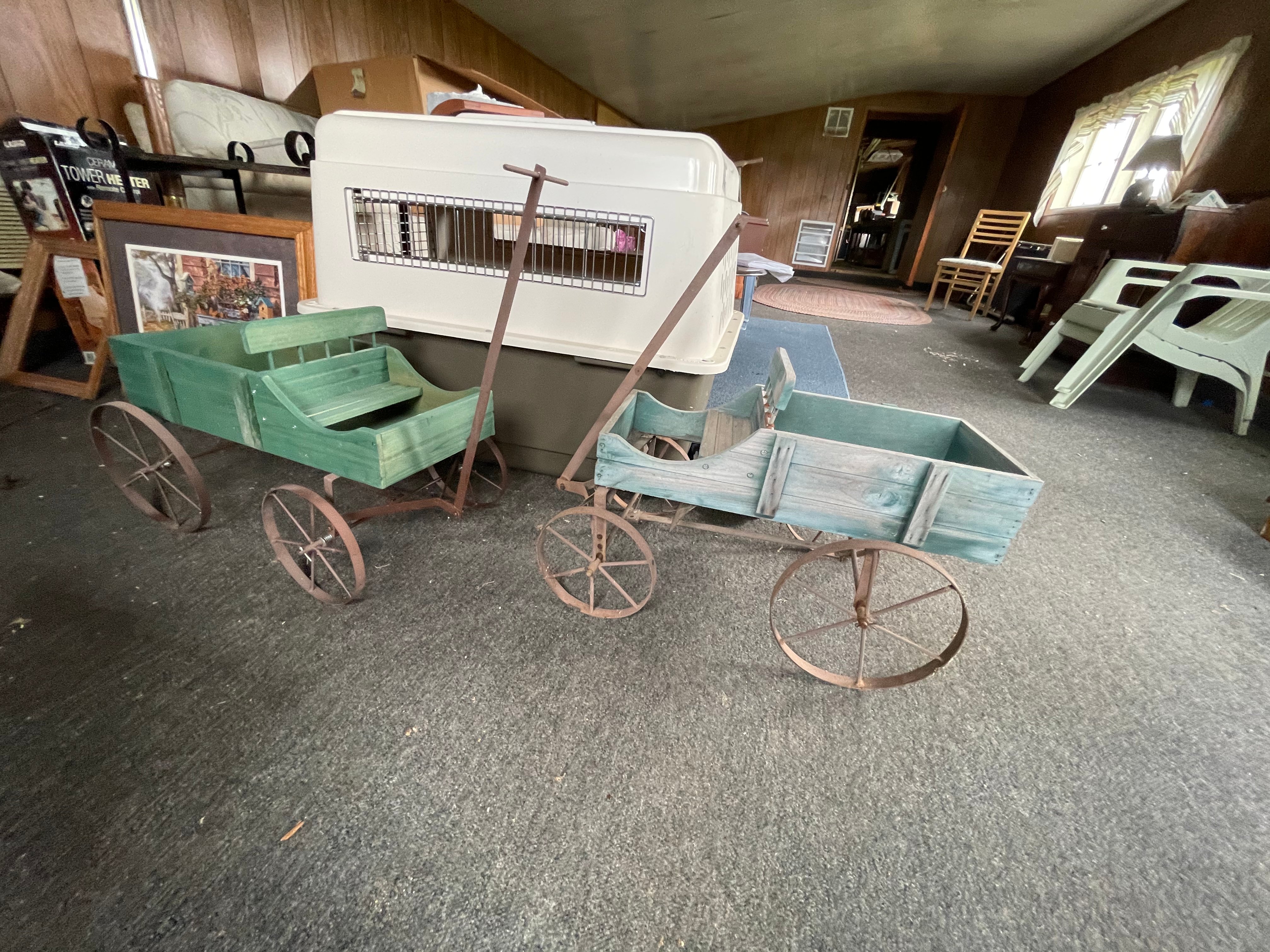Painted Waterfall Chest of Drawers; Dining Room Table & Chairs; Slant Front Desk; School Desk; Dry Sink; Ladderback Chairs; Jenny Lind Changing Table; Set of Lockers; Hall Tree; Wall Clock; Ridgeway Grandfather Clock; Oil Lamps; Pfaltzgraff Set of Dishes & Canisters; Green Depression Glass; Ruby Glass; Aluminum Pitcher; Decanters; Cast Iron Bell; Antique Doors; Barn Windows; Milk Can; Buck Saw; Garden Planter; Antique Tools; Wood Tool Chest; Rag Rugs; Wood Pulleys; Pioneer Thermometer; Repair Manuals inc. Chiltons; Records: Elvis Presley, Diana Ross & The Supremes, Ray Charles, Kansas, KISS & More; Lil Red Wagon; 15+ Franklin Mint Tractor Knives; John Deere Collectables; Kids Toys; Doll Rocker: