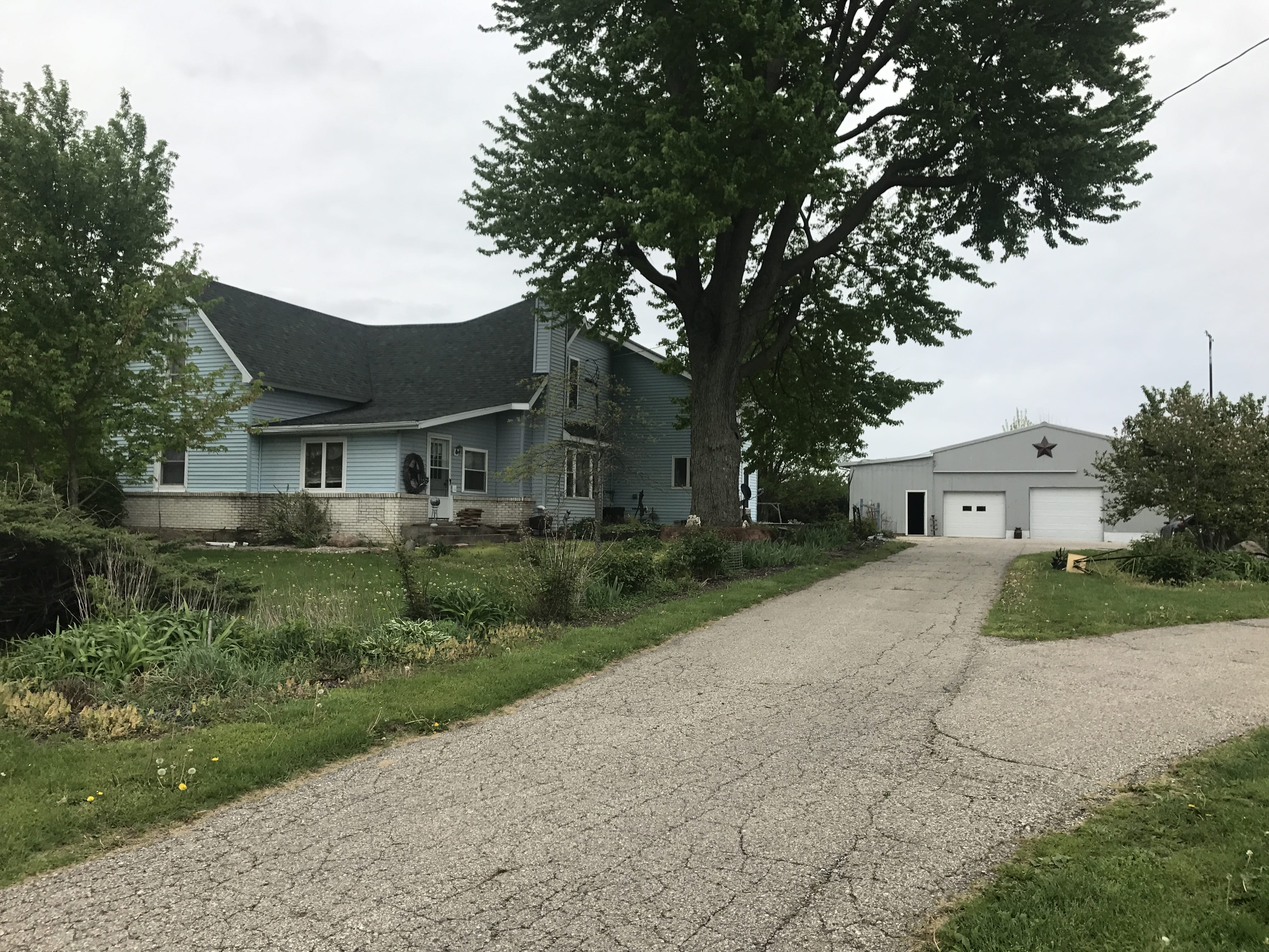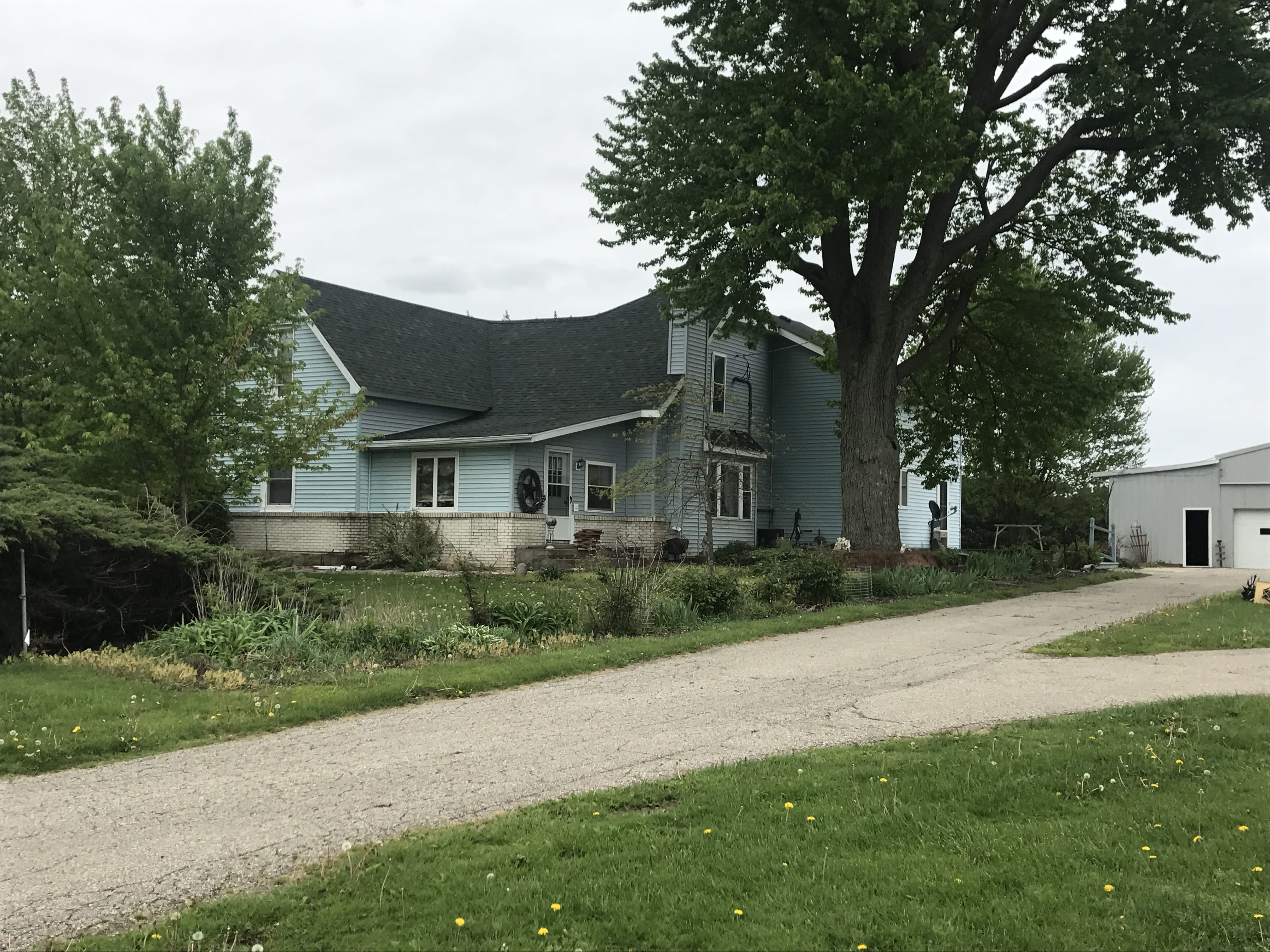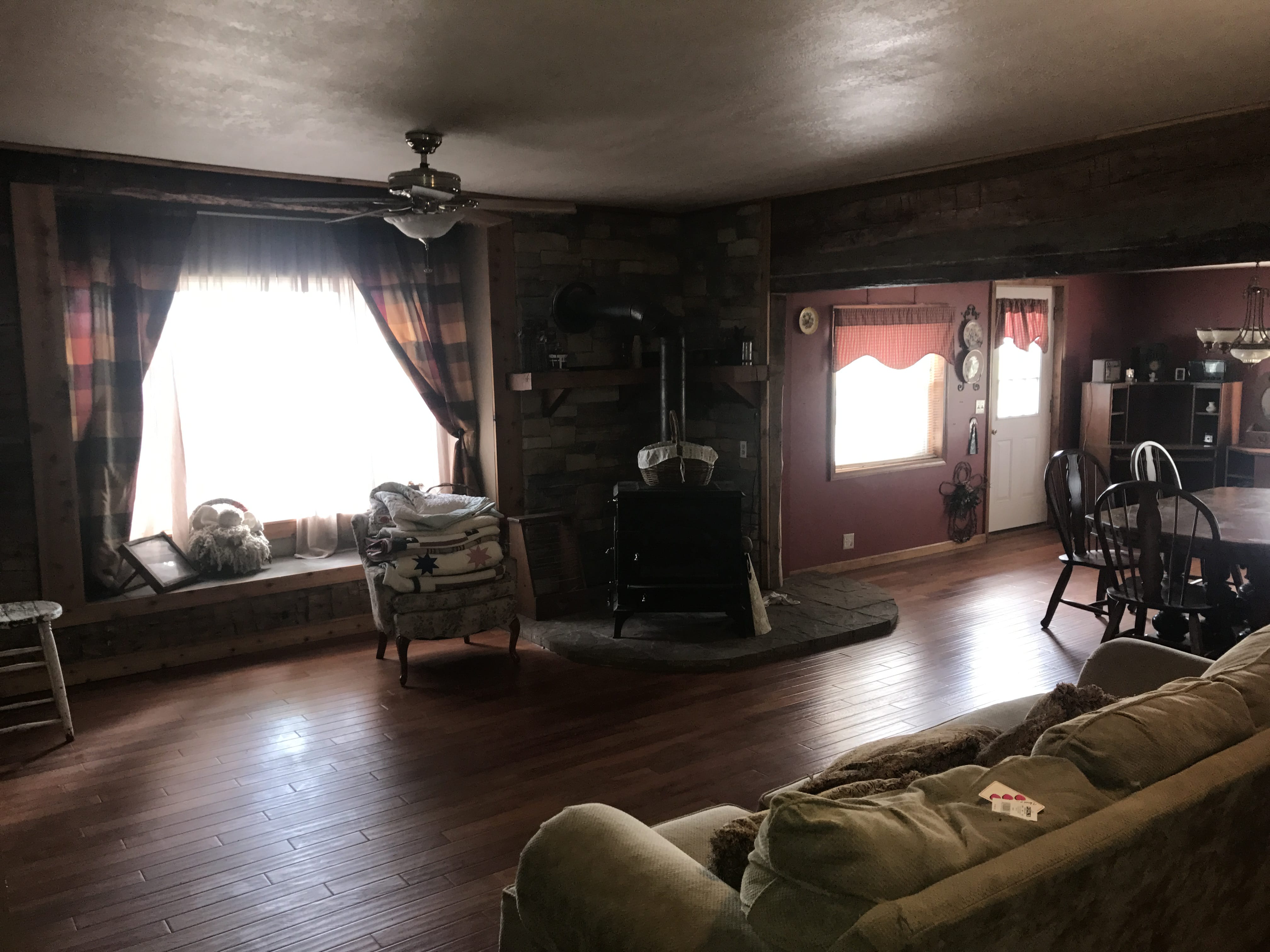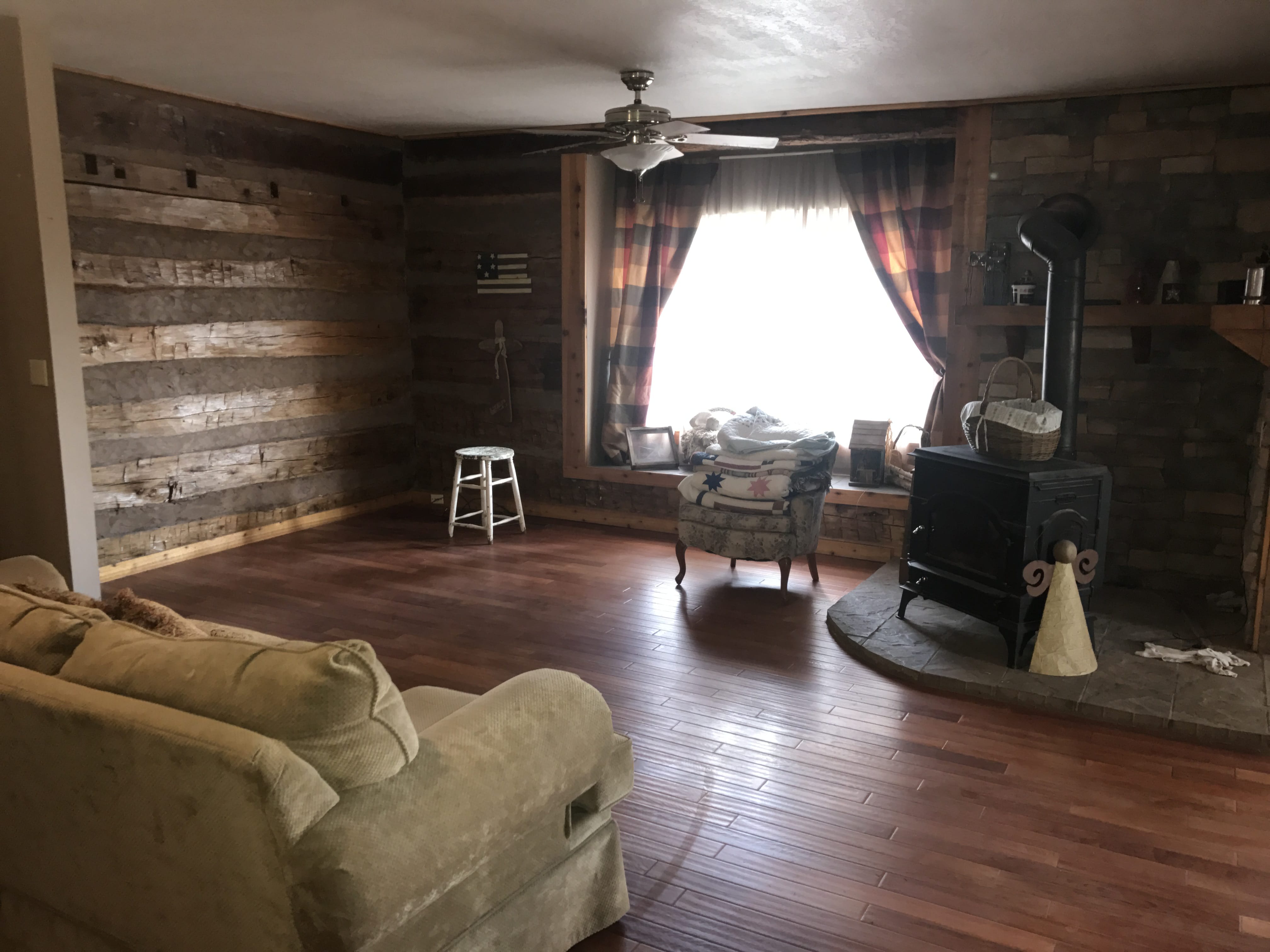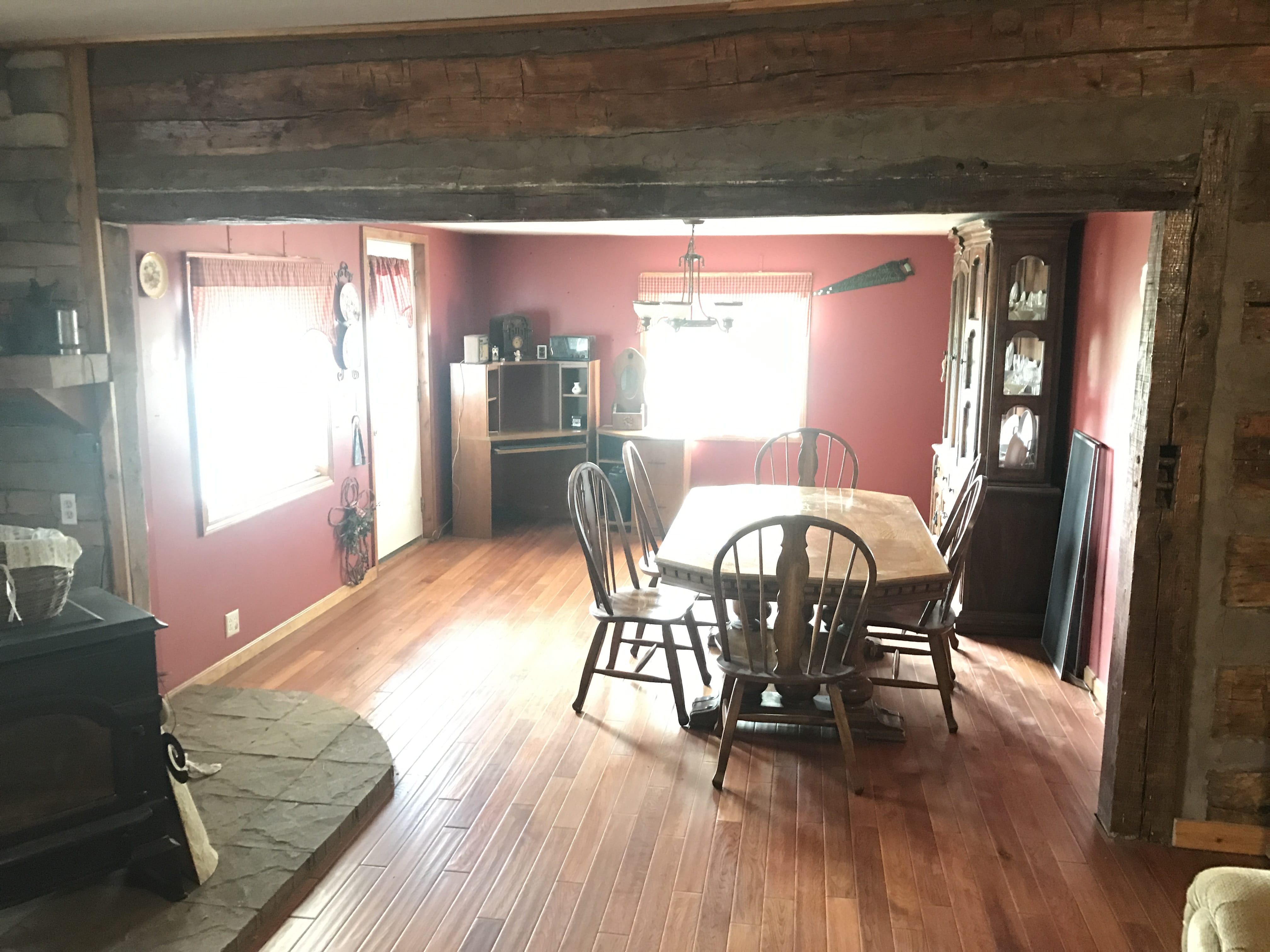 Large country home with a Log Cabin Style inside featuring 5 bedrooms, 2.5 bath home situated with a tree-lined perimeter on 5.2 acres.
