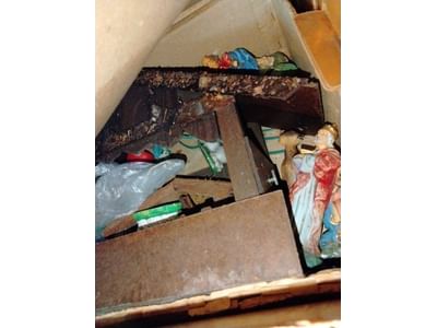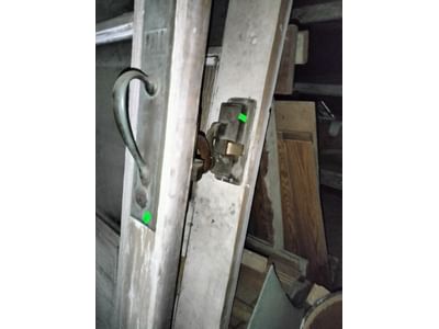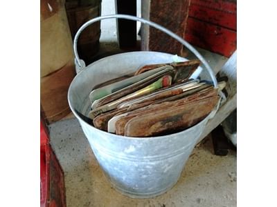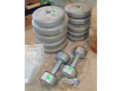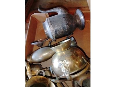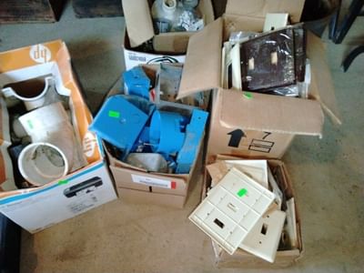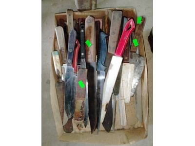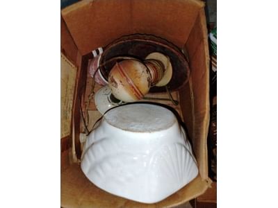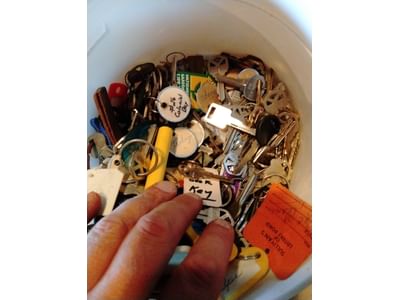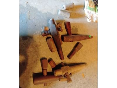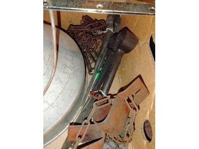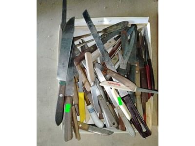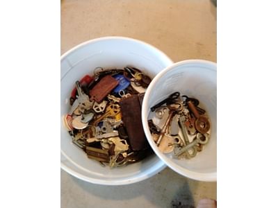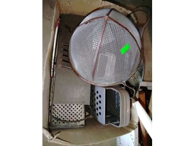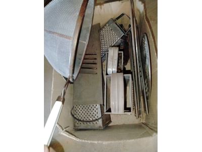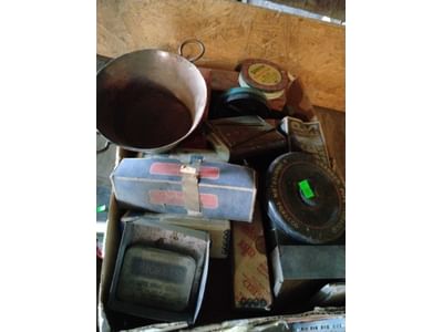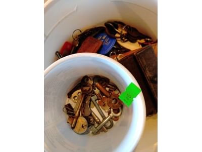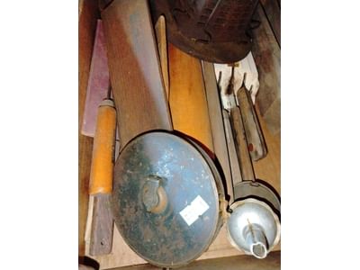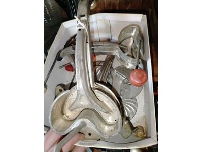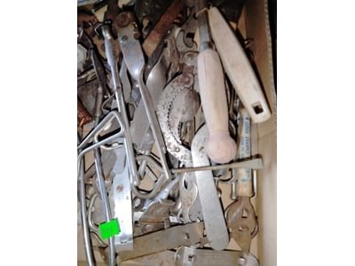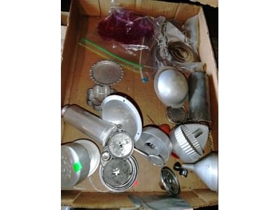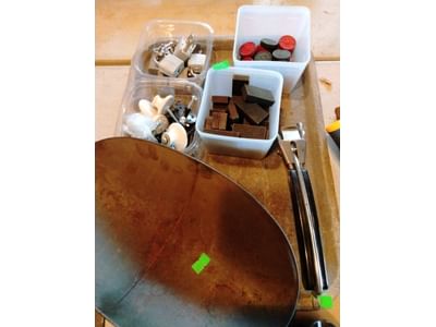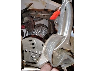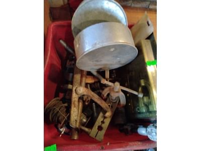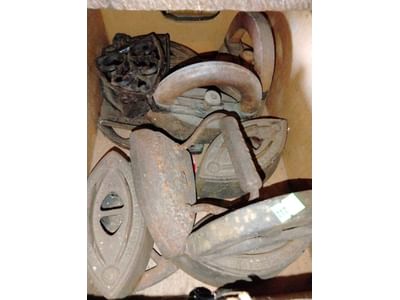 129 Padlocks, knobs, dominoes, checkers, metal scale pan, pot handle