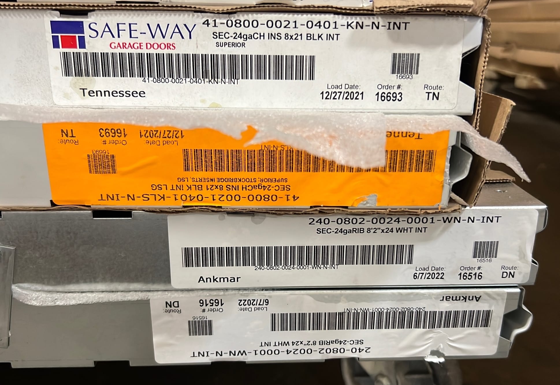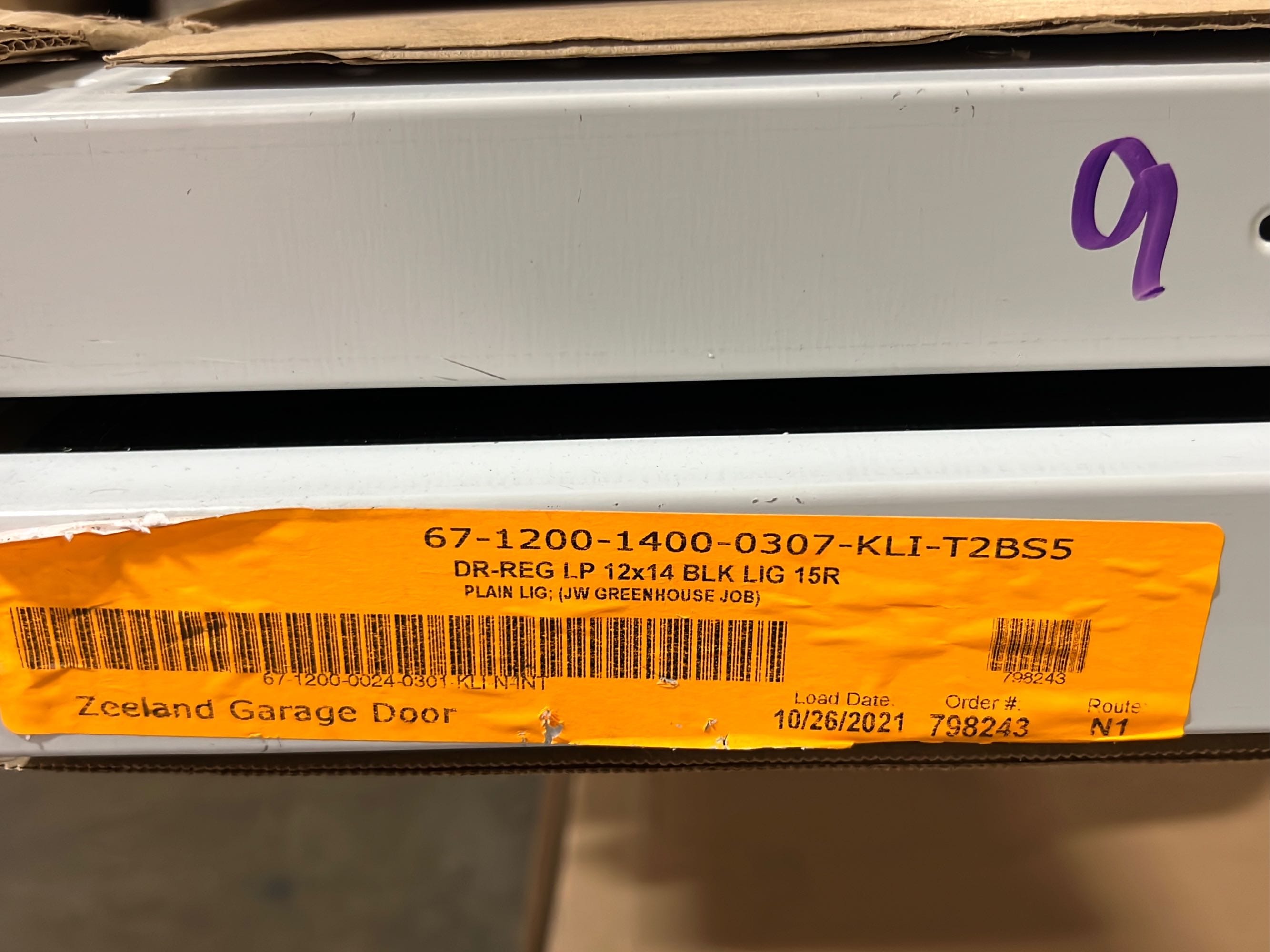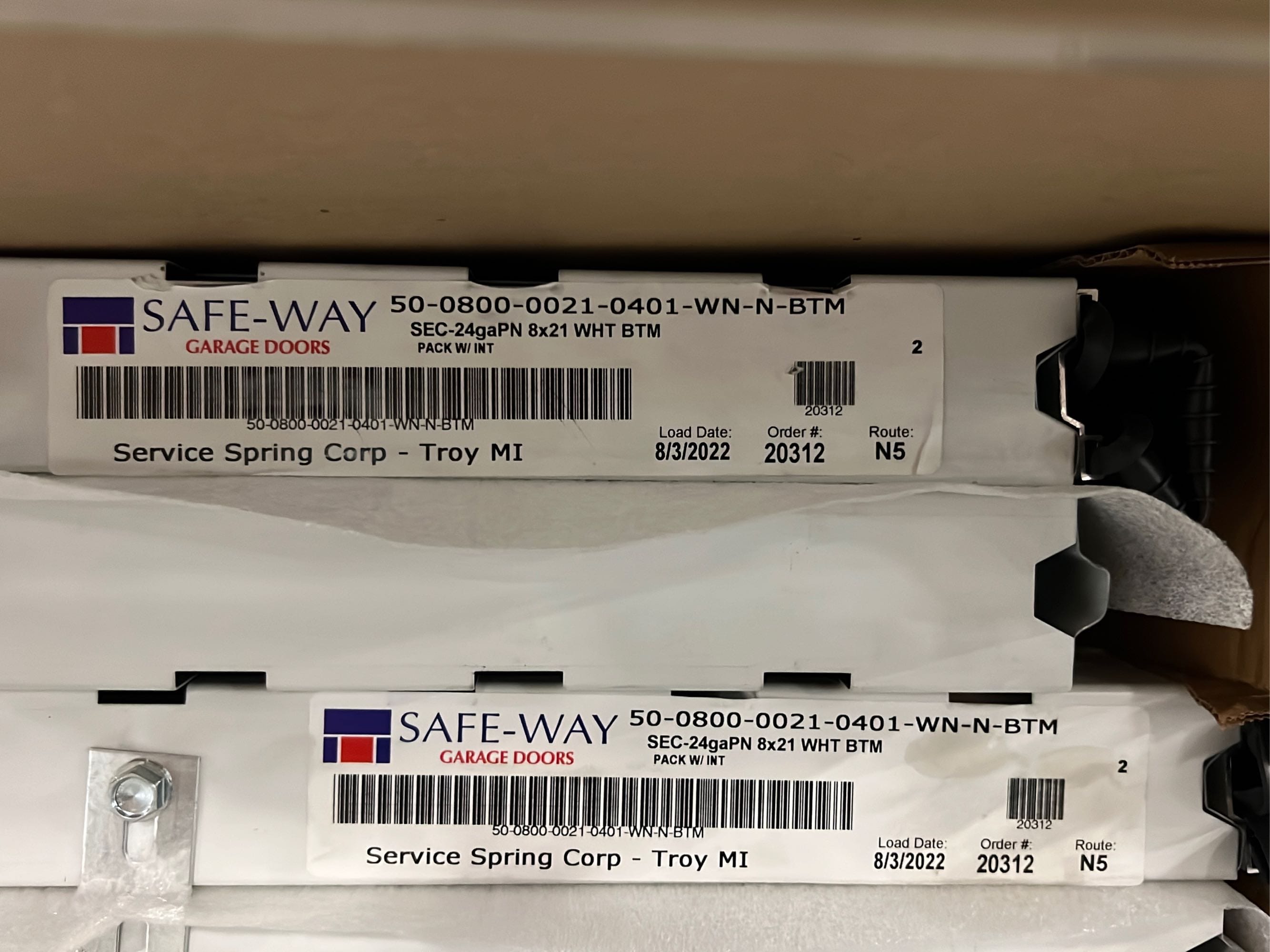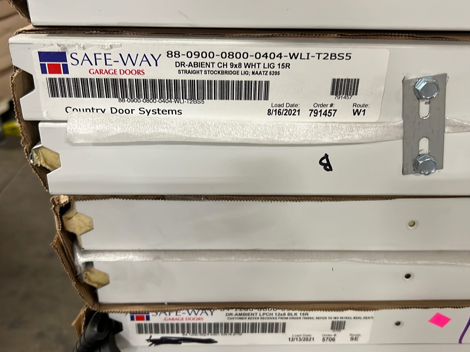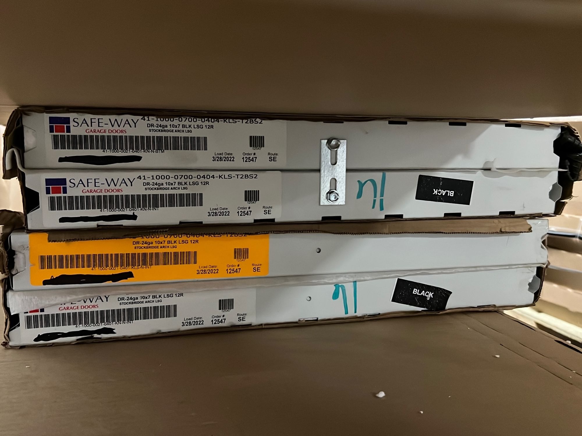 11 Garage Door Panels - (5) 12’2”x24” White, (1) 12’2”x21” White, (4) 8’x24” Black, (2) 7’x18” White, (1) 10’x21” White, (2) 7’5”x21”, (2) 8’x18” White, (1) 10’x21” White, (2) 8’x21” Black, (2) 9’x21” White, (10) 10’4”x18” White