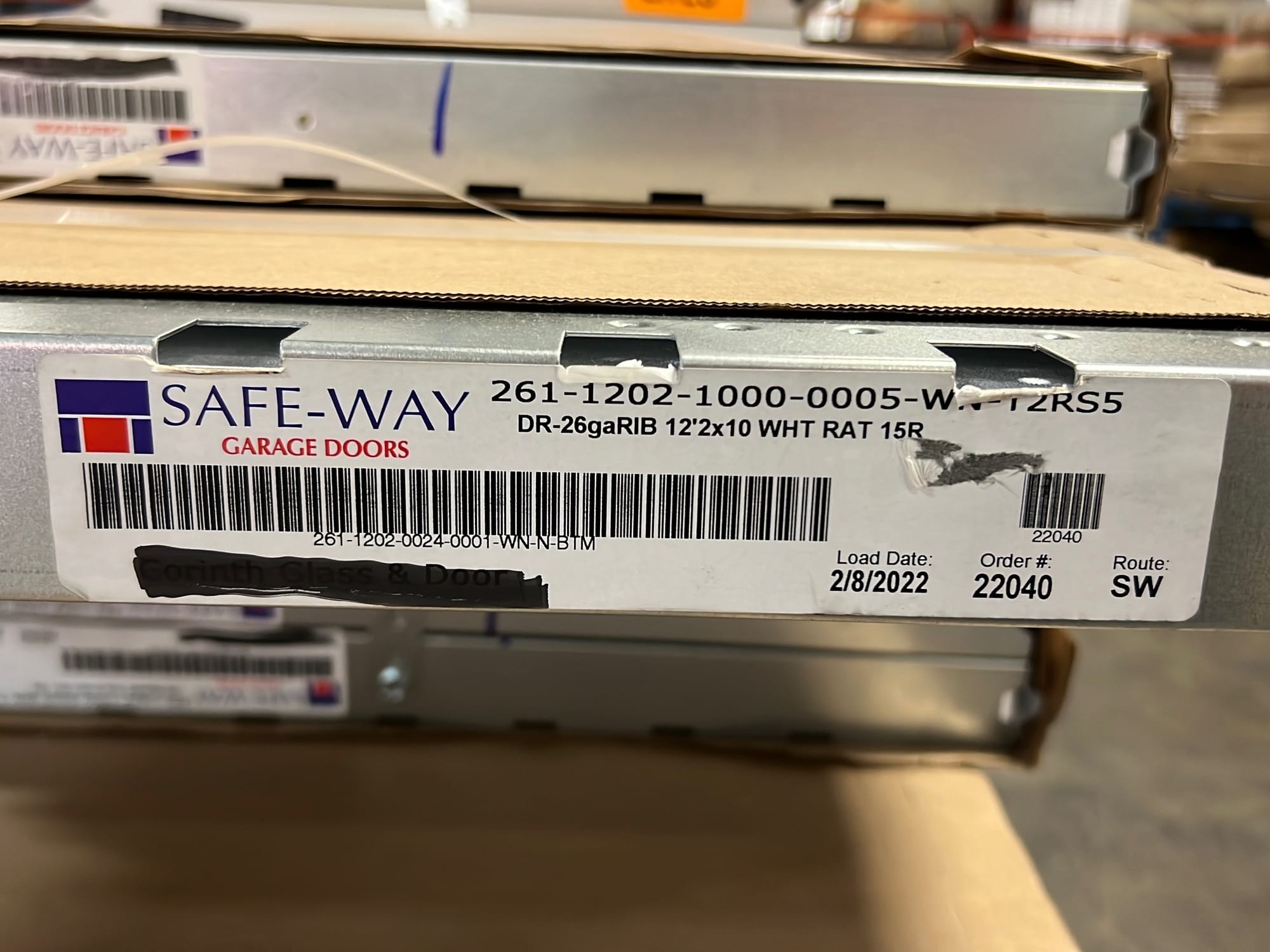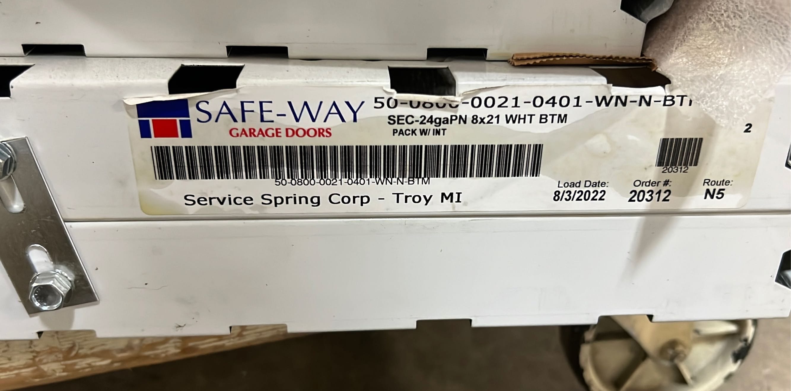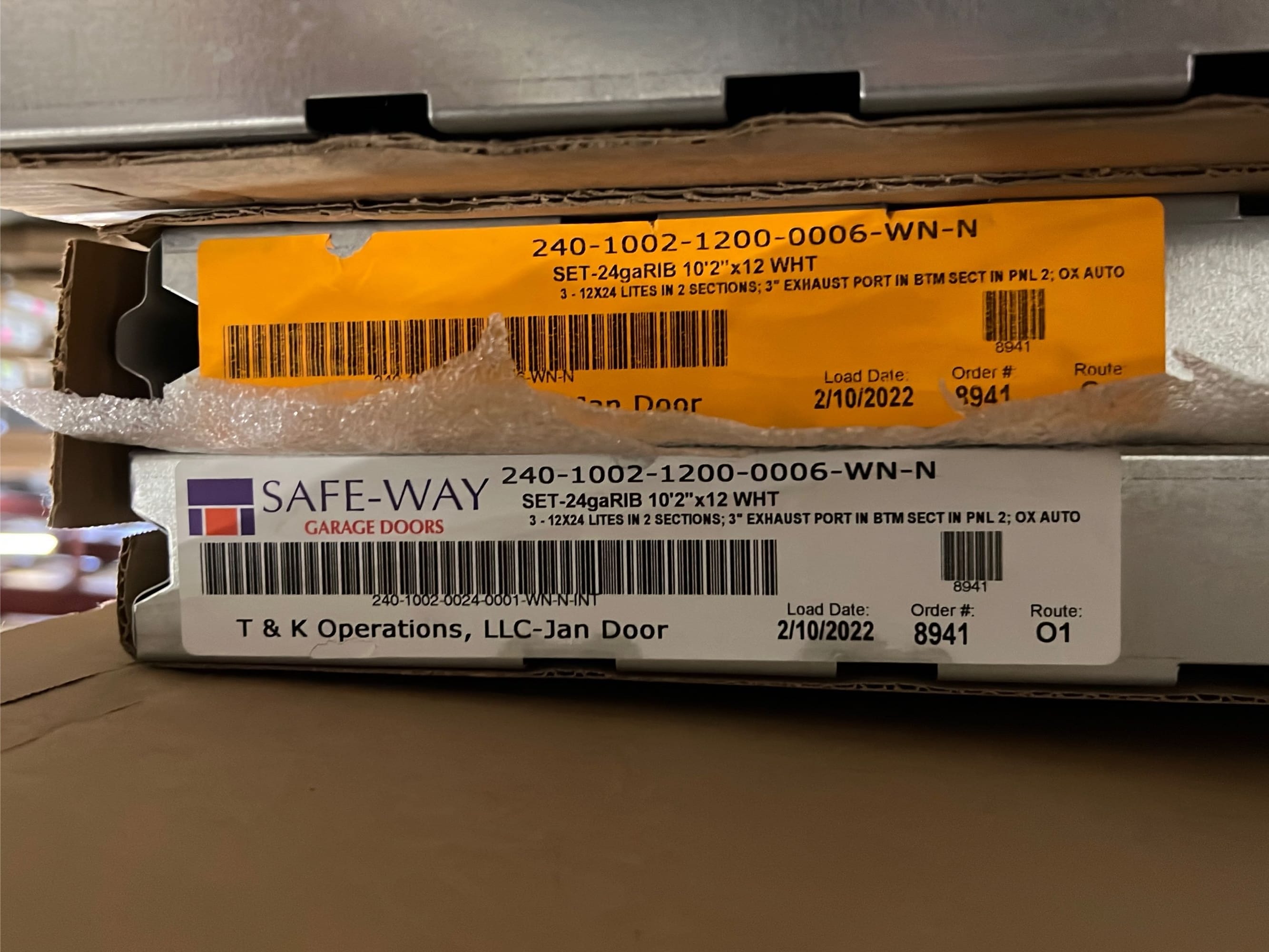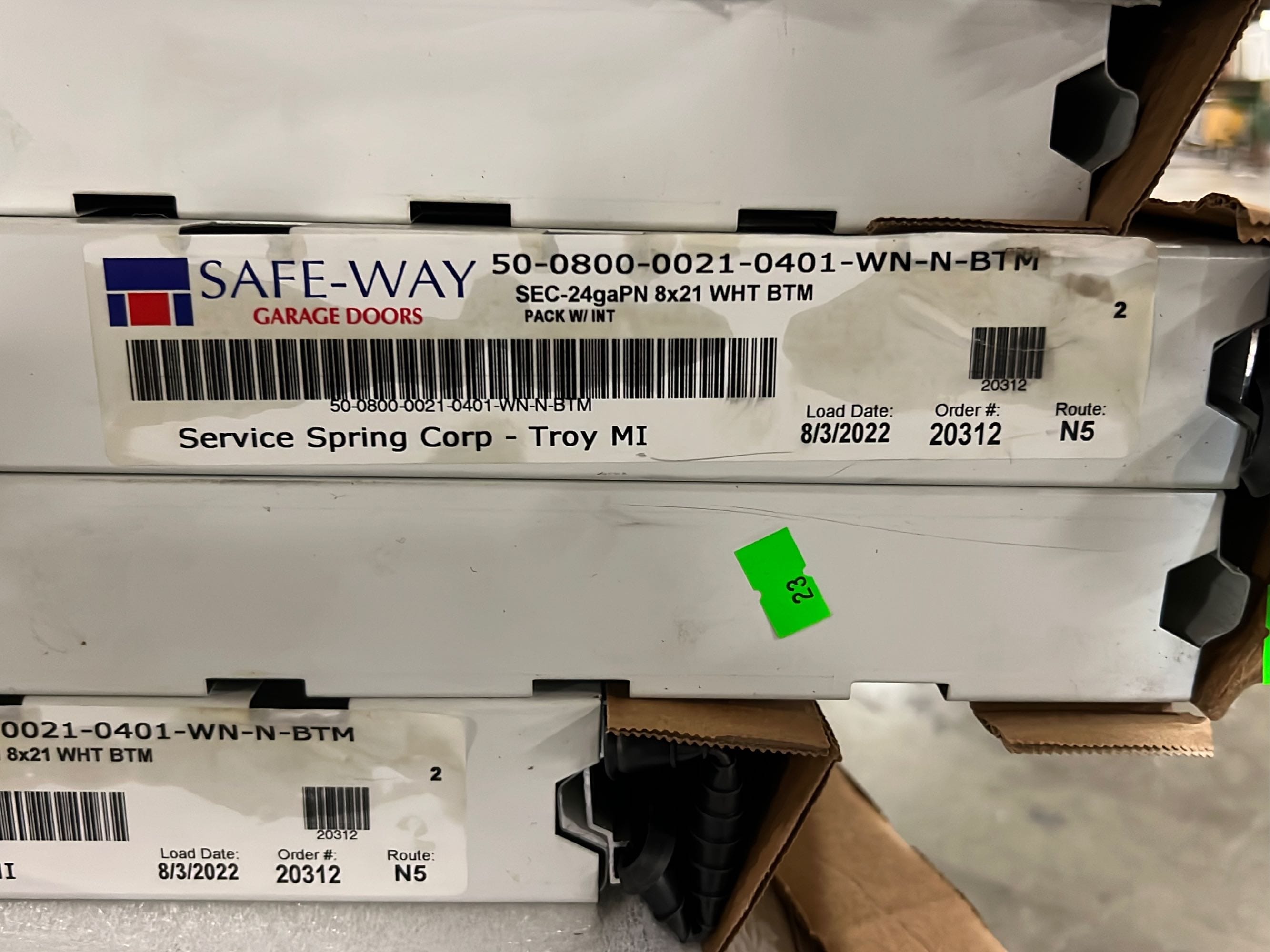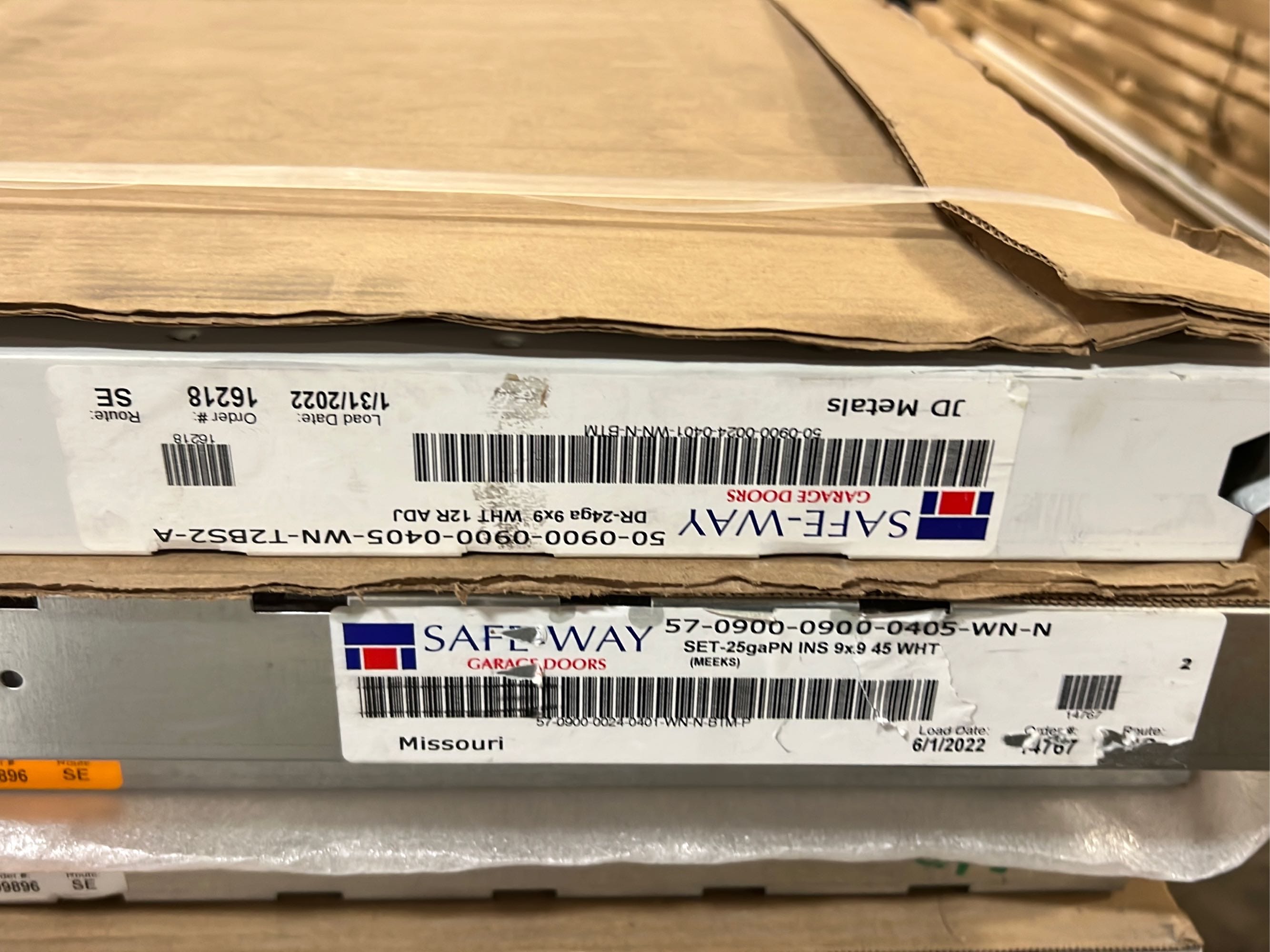 11 Garage Door Panels - (5) 12’2”x24” White, (1) 12’2”x21” White, (4) 8’x24” Black, (2) 7’x18” White, (1) 10’x21” White, (2) 7’5”x21”, (2) 8’x18” White, (1) 10’x21” White, (2) 8’x21” Black, (2) 9’x21” White, (10) 10’4”x18” White
