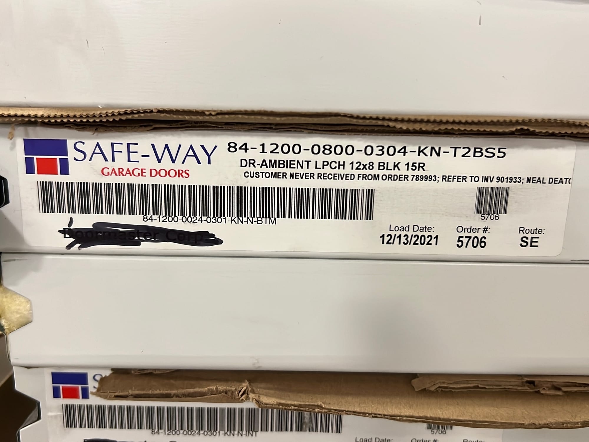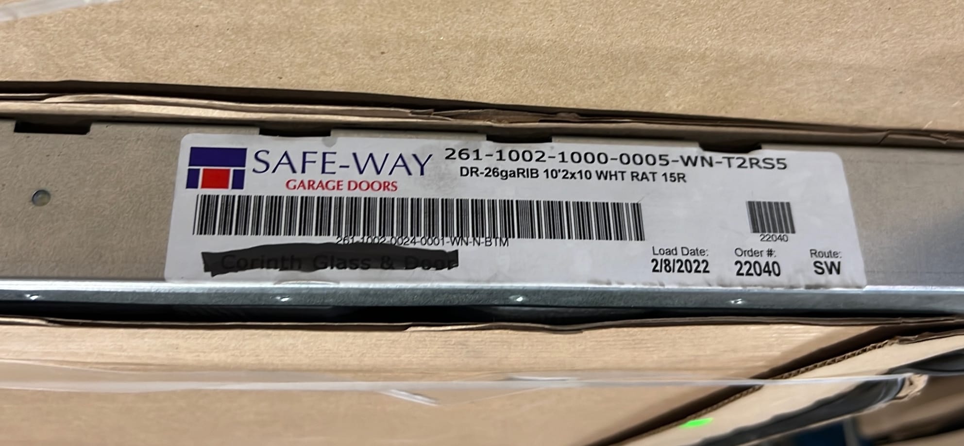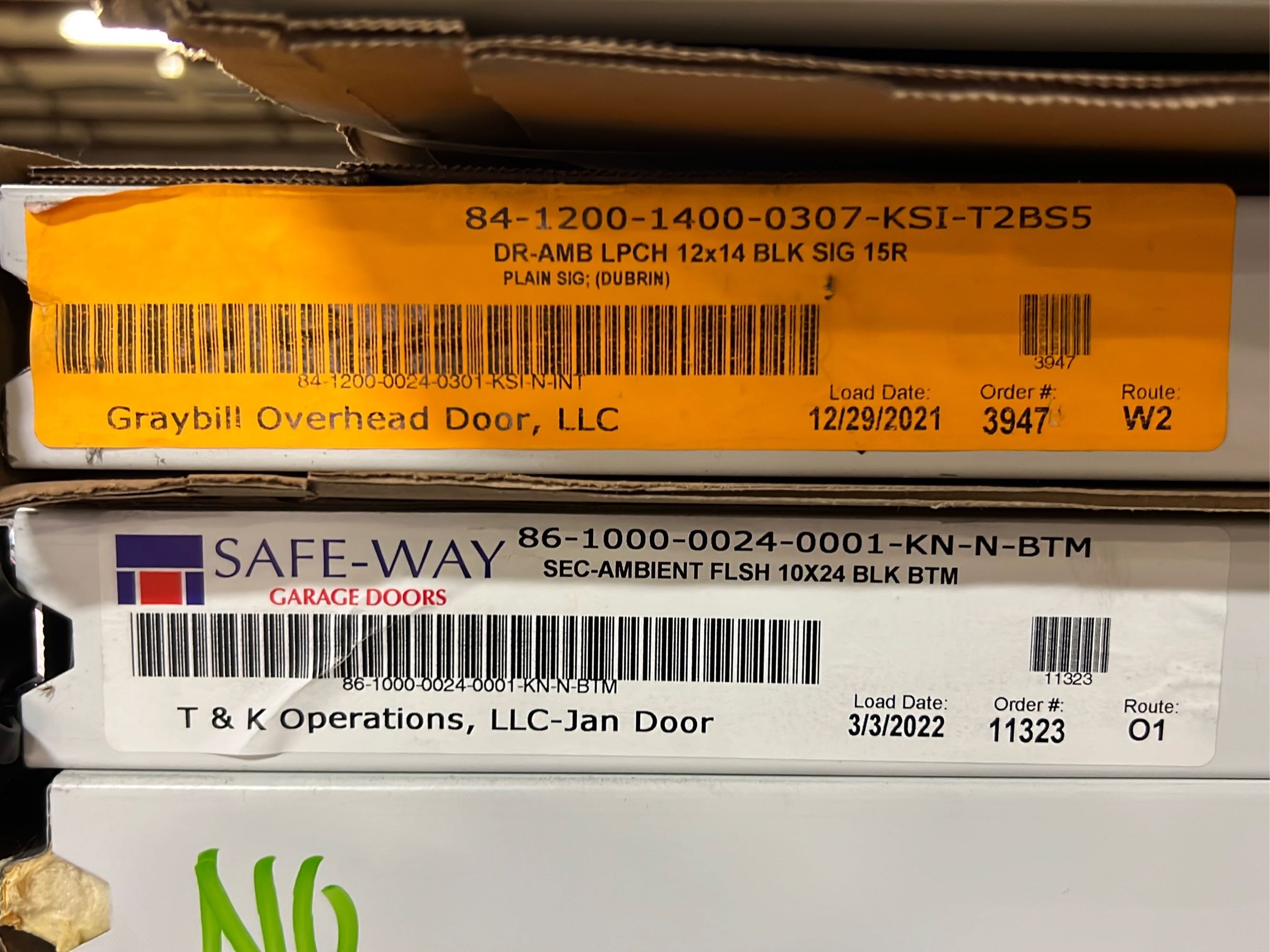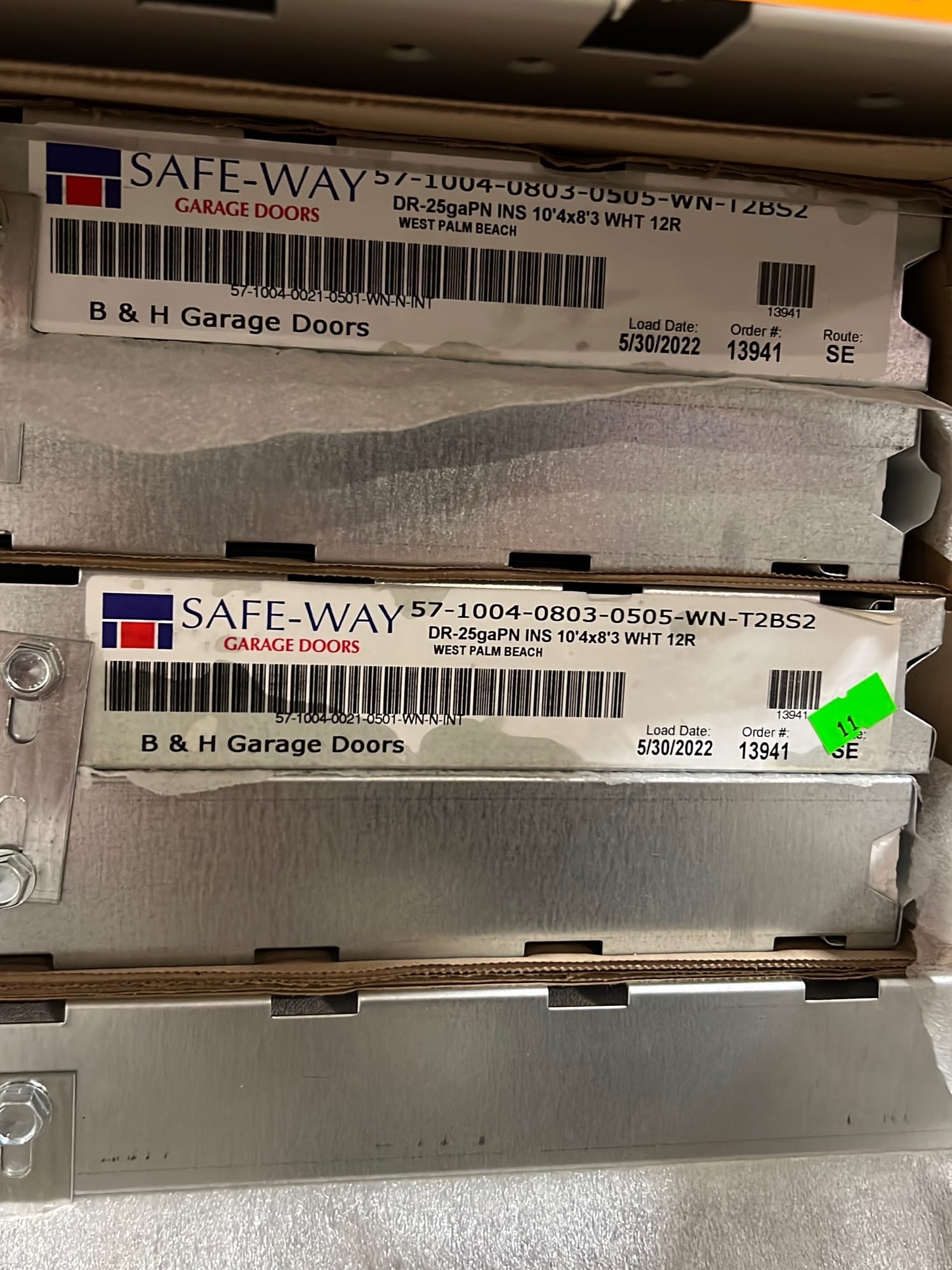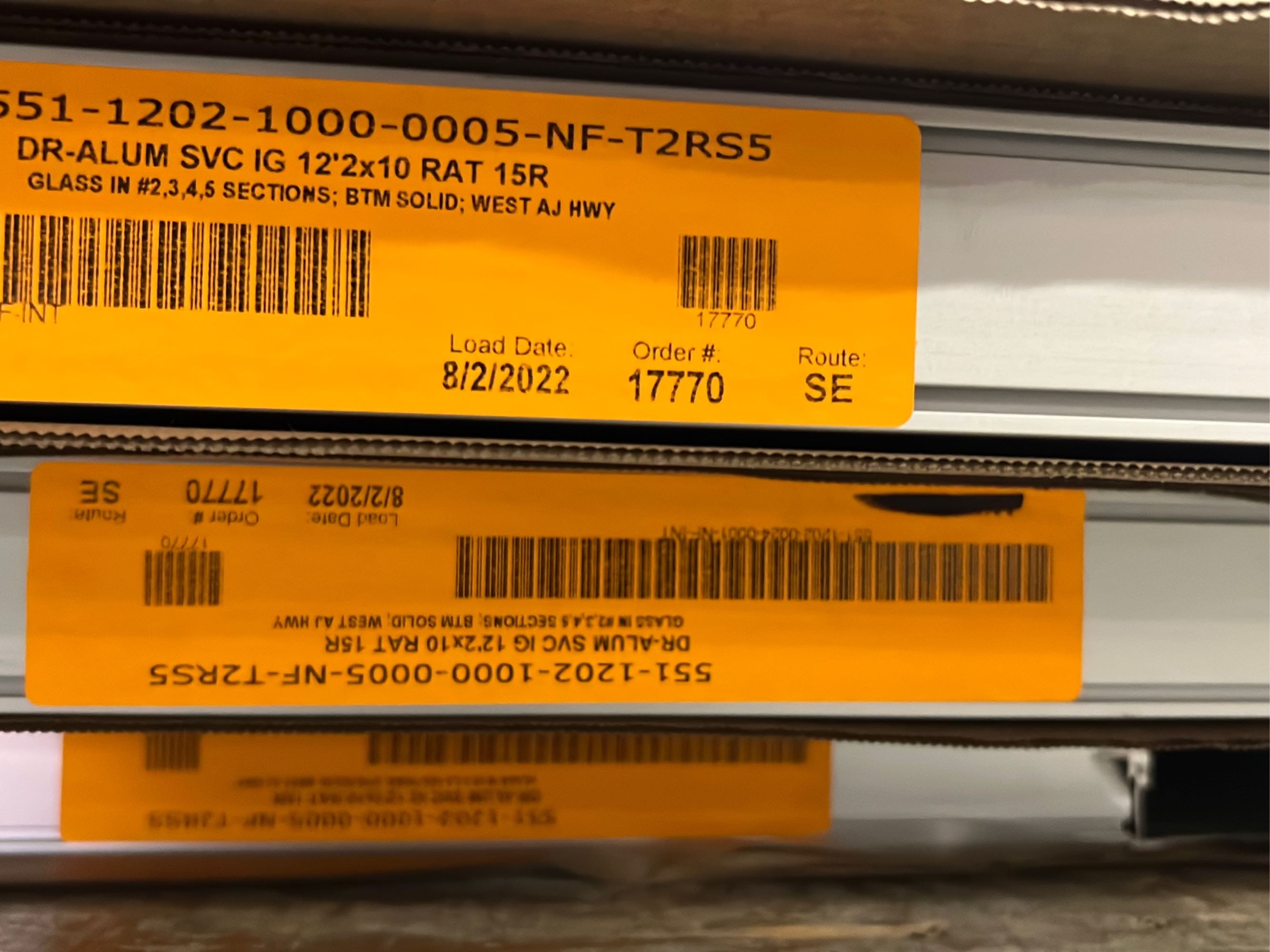 11 Garage Door Panels - (5) 12’2”x24” White, (1) 12’2”x21” White, (4) 8’x24” Black, (2) 7’x18” White, (1) 10’x21” White, (2) 7’5”x21”, (2) 8’x18” White, (1) 10’x21” White, (2) 8’x21” Black, (2) 9’x21” White, (10) 10’4”x18” White