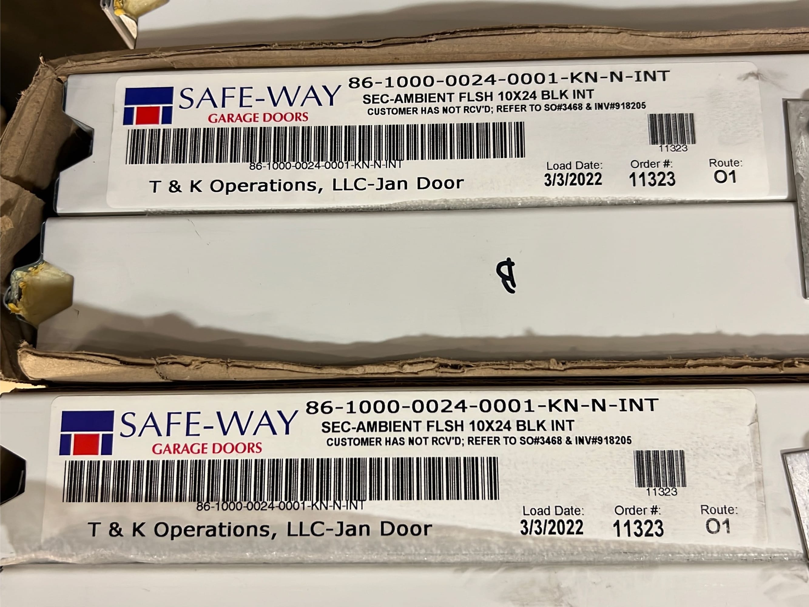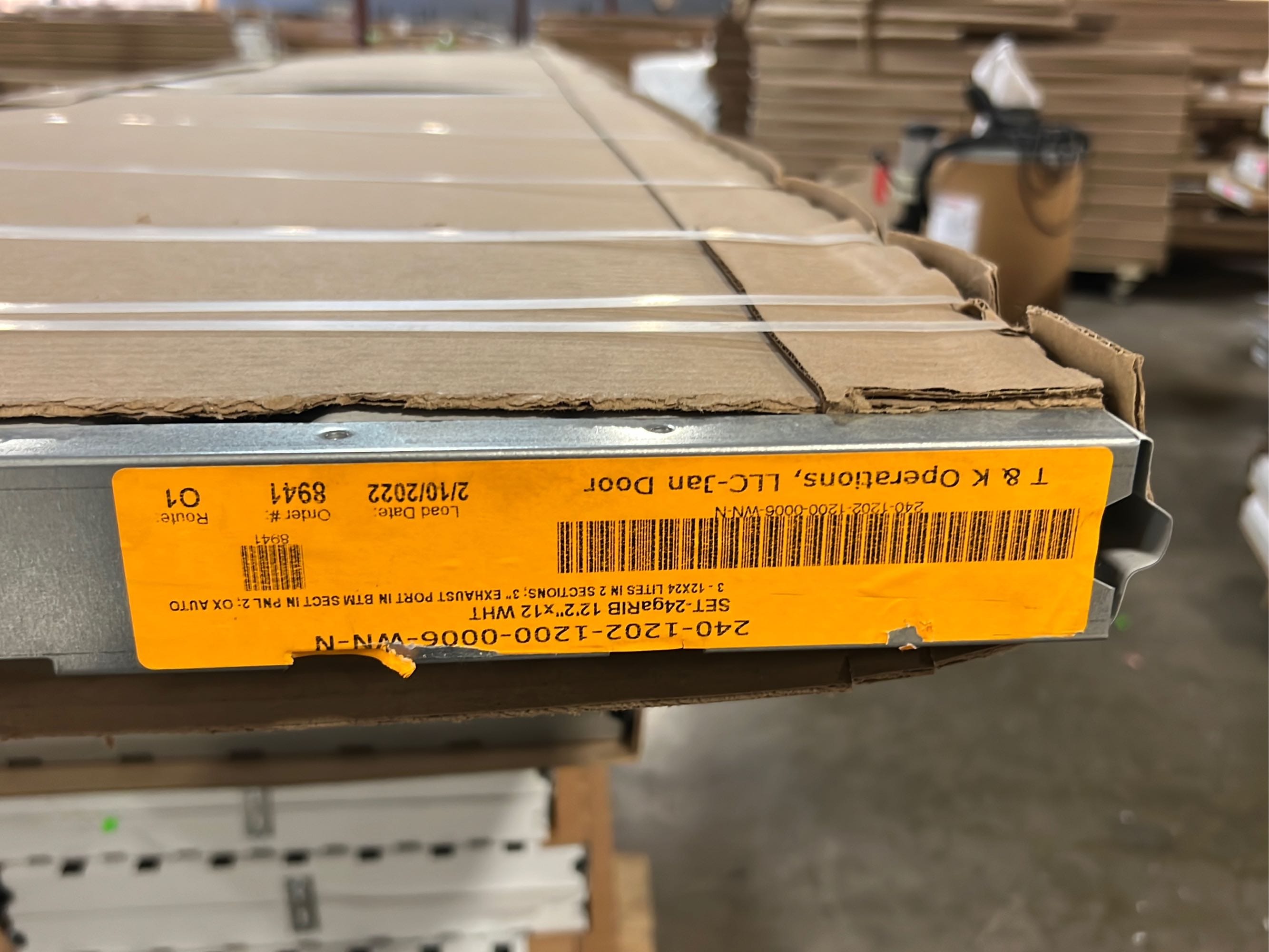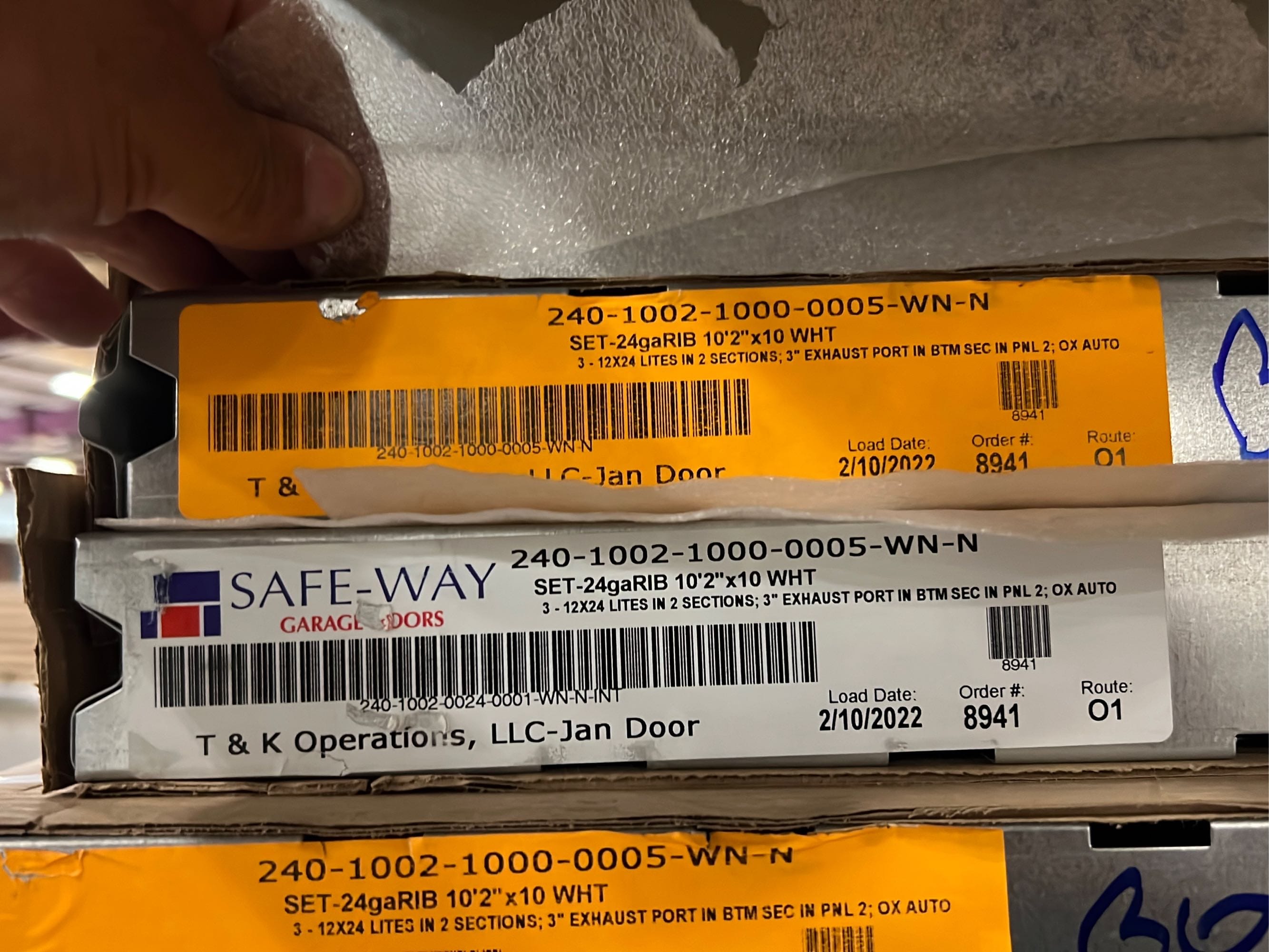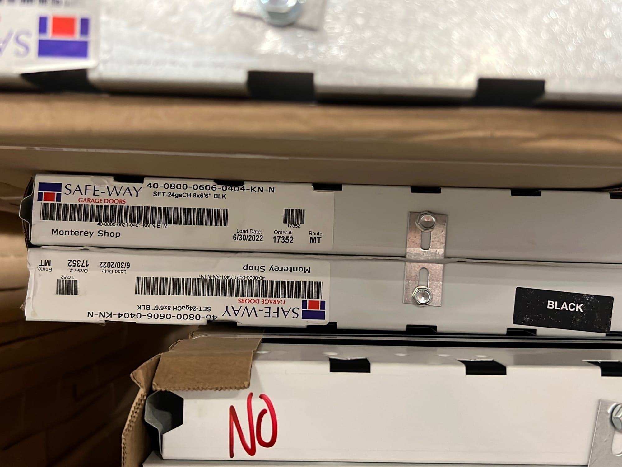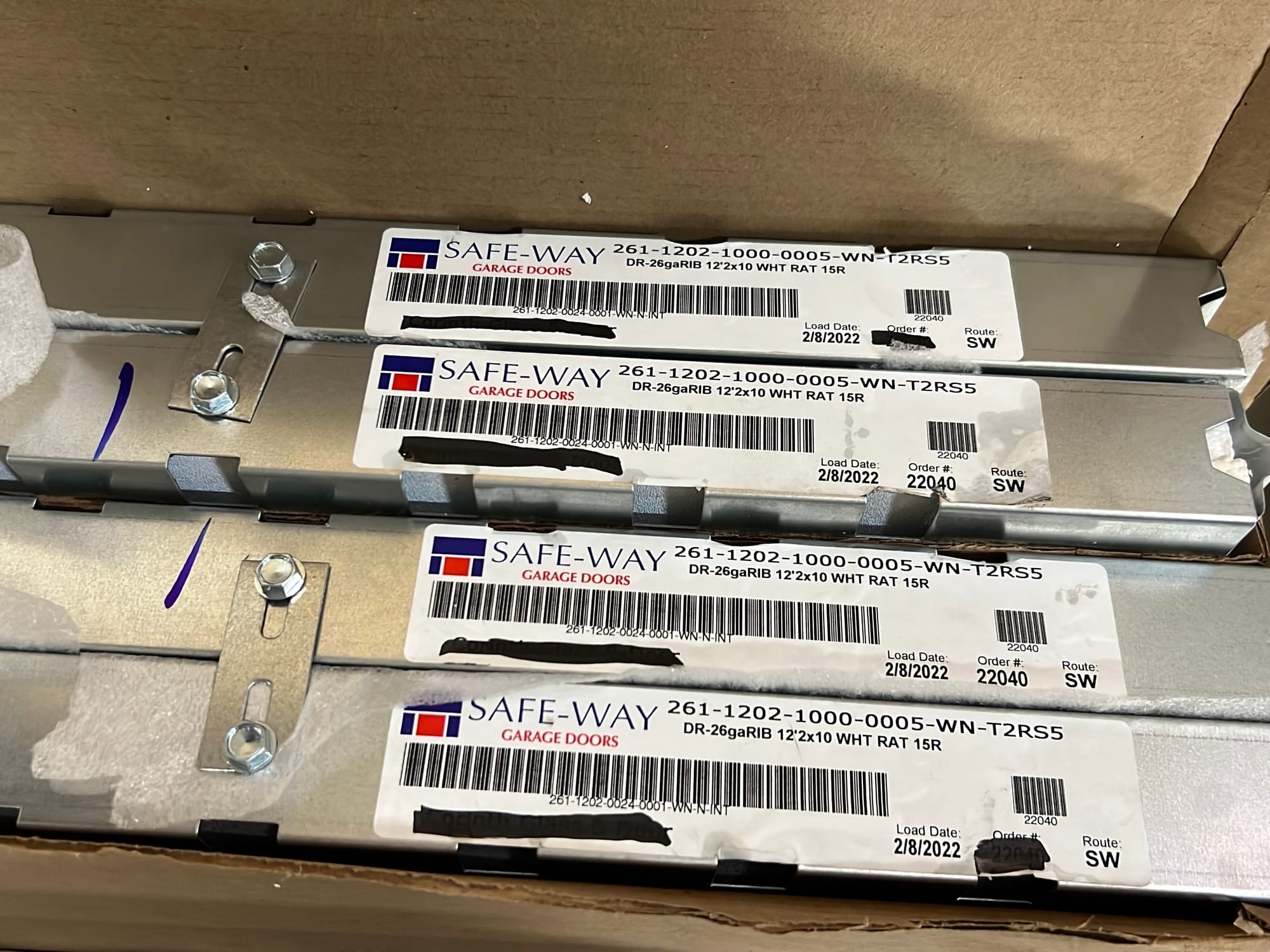 11 Garage Door Panels - (5) 12’2”x24” White, (1) 12’2”x21” White, (4) 8’x24” Black, (2) 7’x18” White, (1) 10’x21” White, (2) 7’5”x21”, (2) 8’x18” White, (1) 10’x21” White, (2) 8’x21” Black, (2) 9’x21” White, (10) 10’4”x18” White