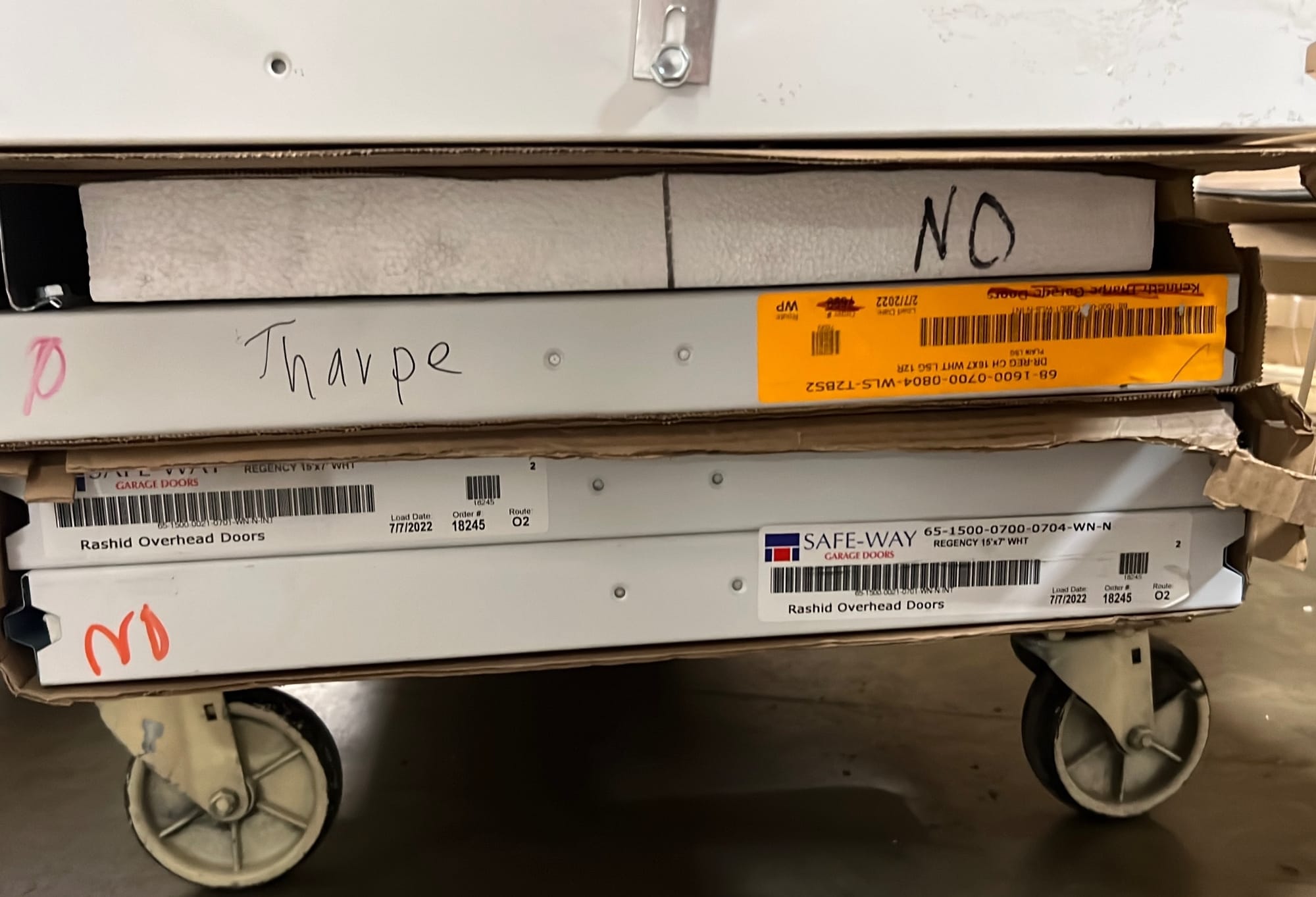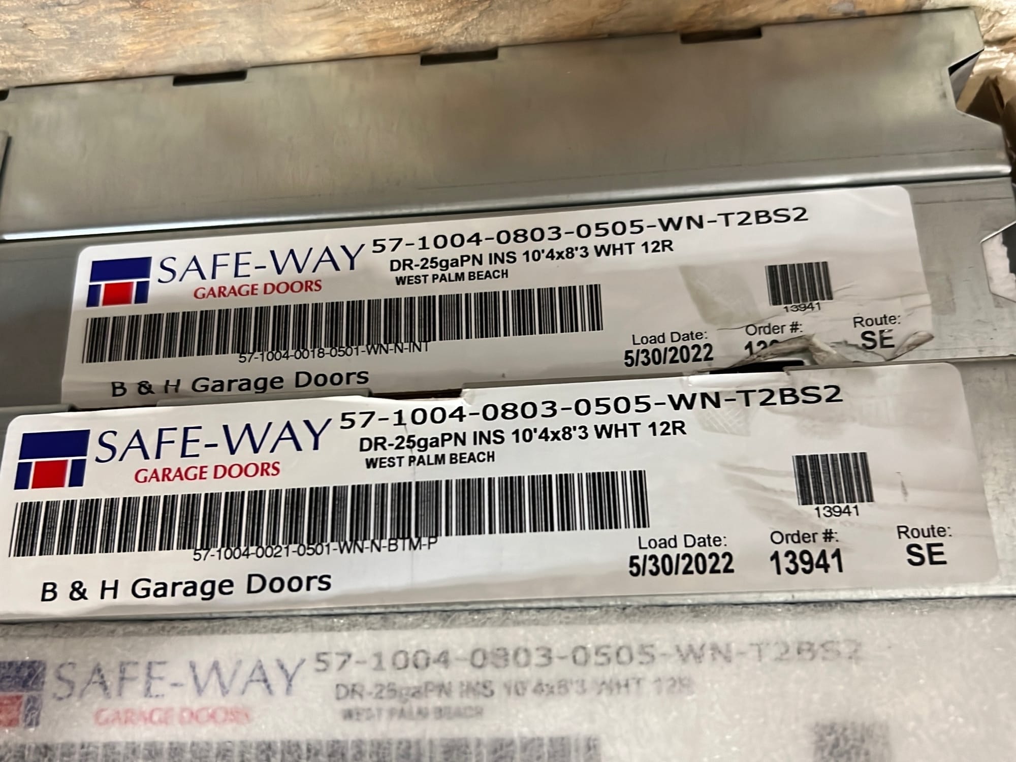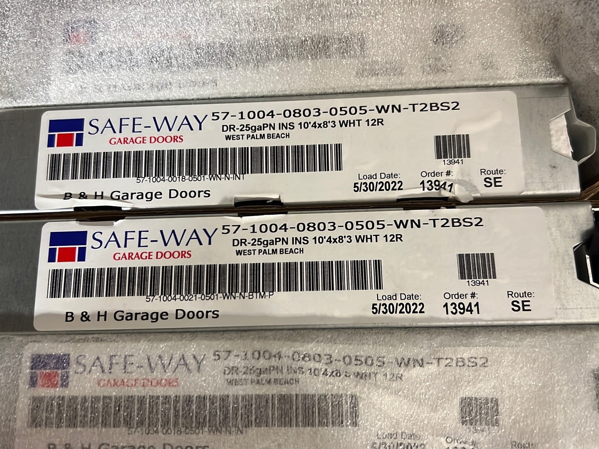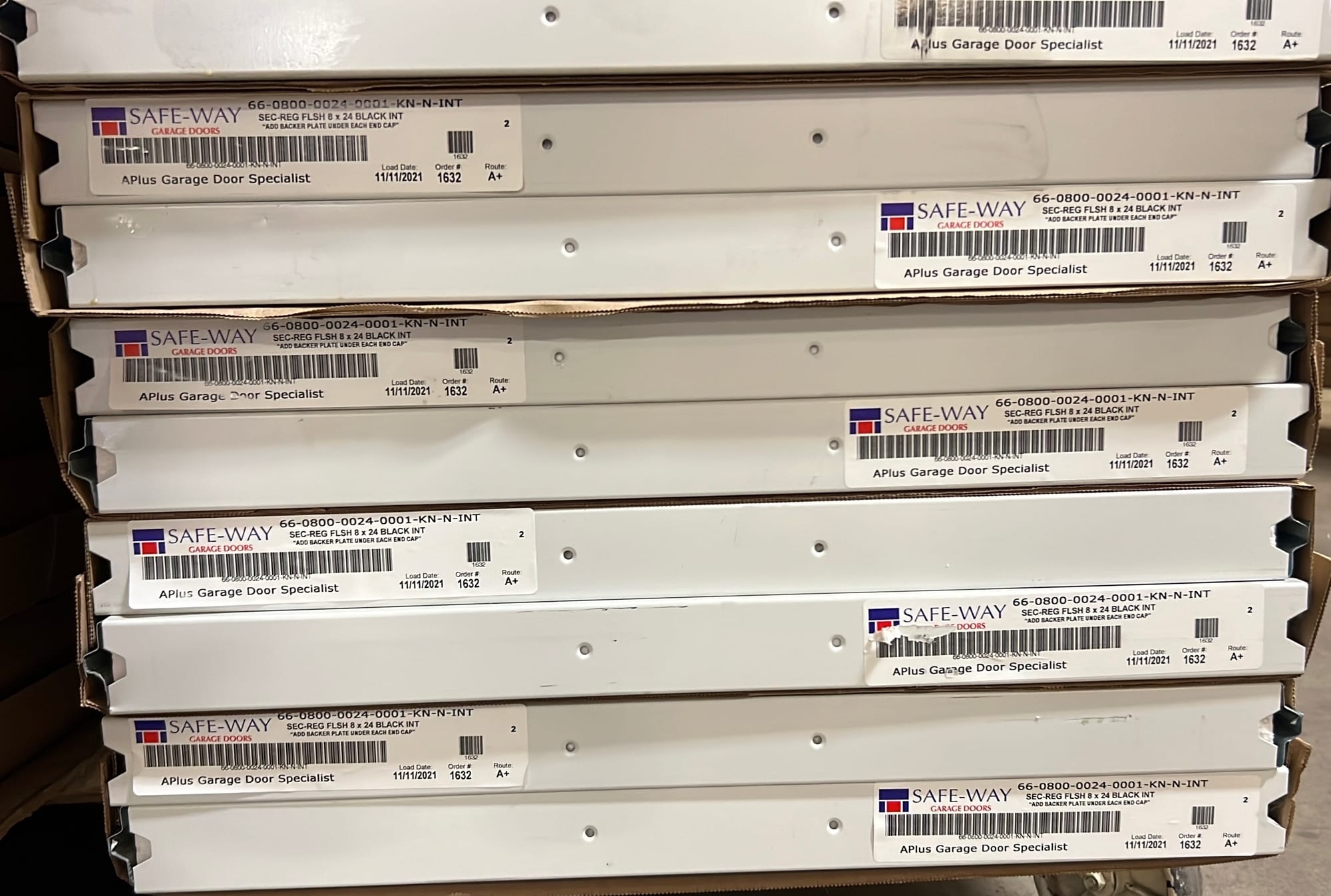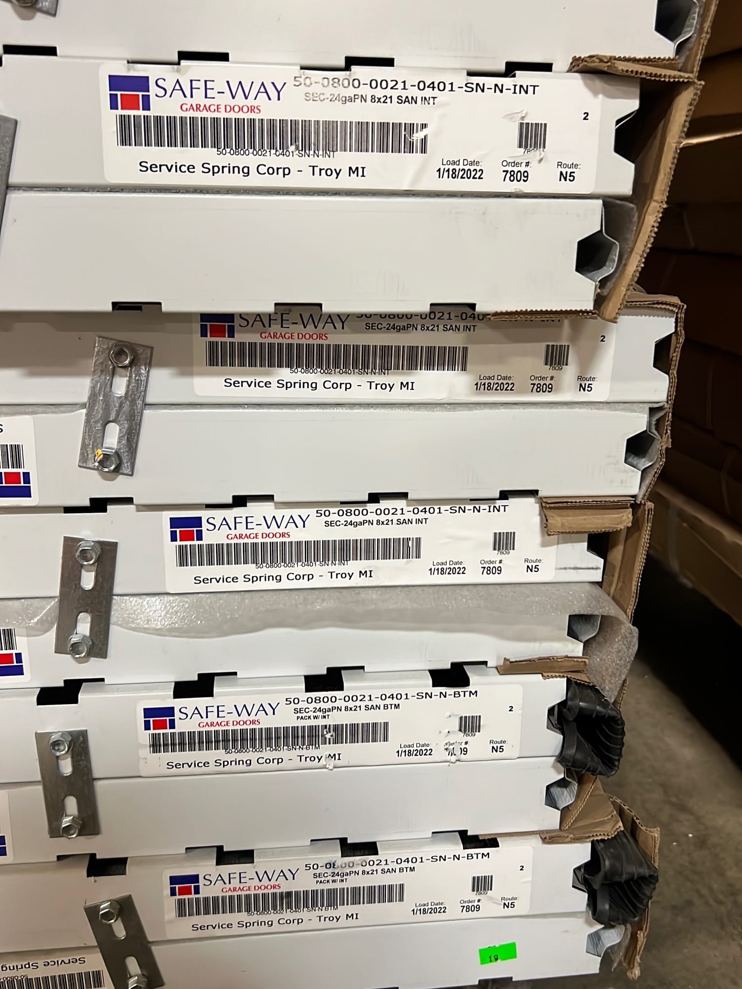 11 Garage Door Panels - (5) 12’2”x24” White, (1) 12’2”x21” White, (4) 8’x24” Black, (2) 7’x18” White, (1) 10’x21” White, (2) 7’5”x21”, (2) 8’x18” White, (1) 10’x21” White, (2) 8’x21” Black, (2) 9’x21” White, (10) 10’4”x18” White