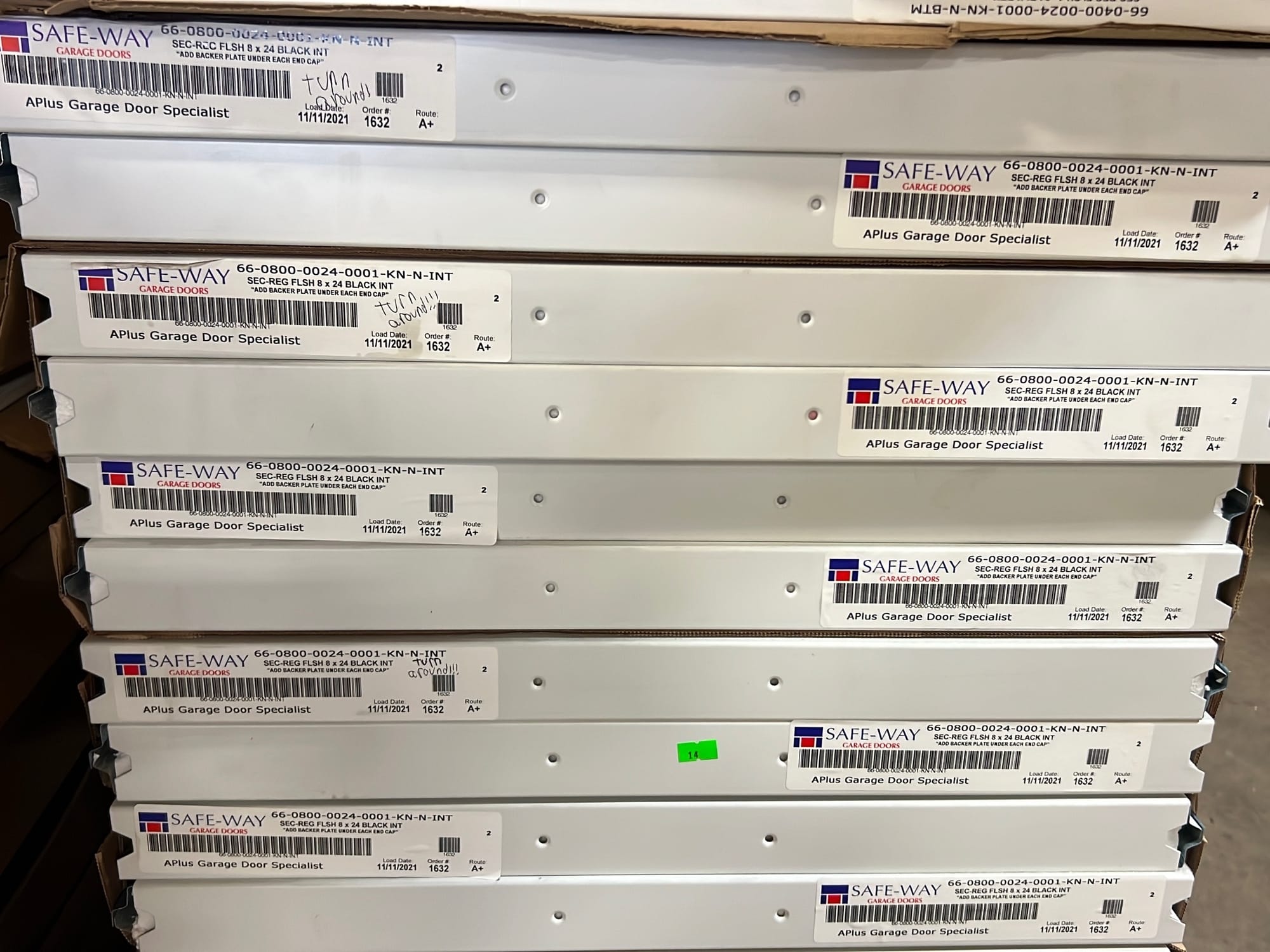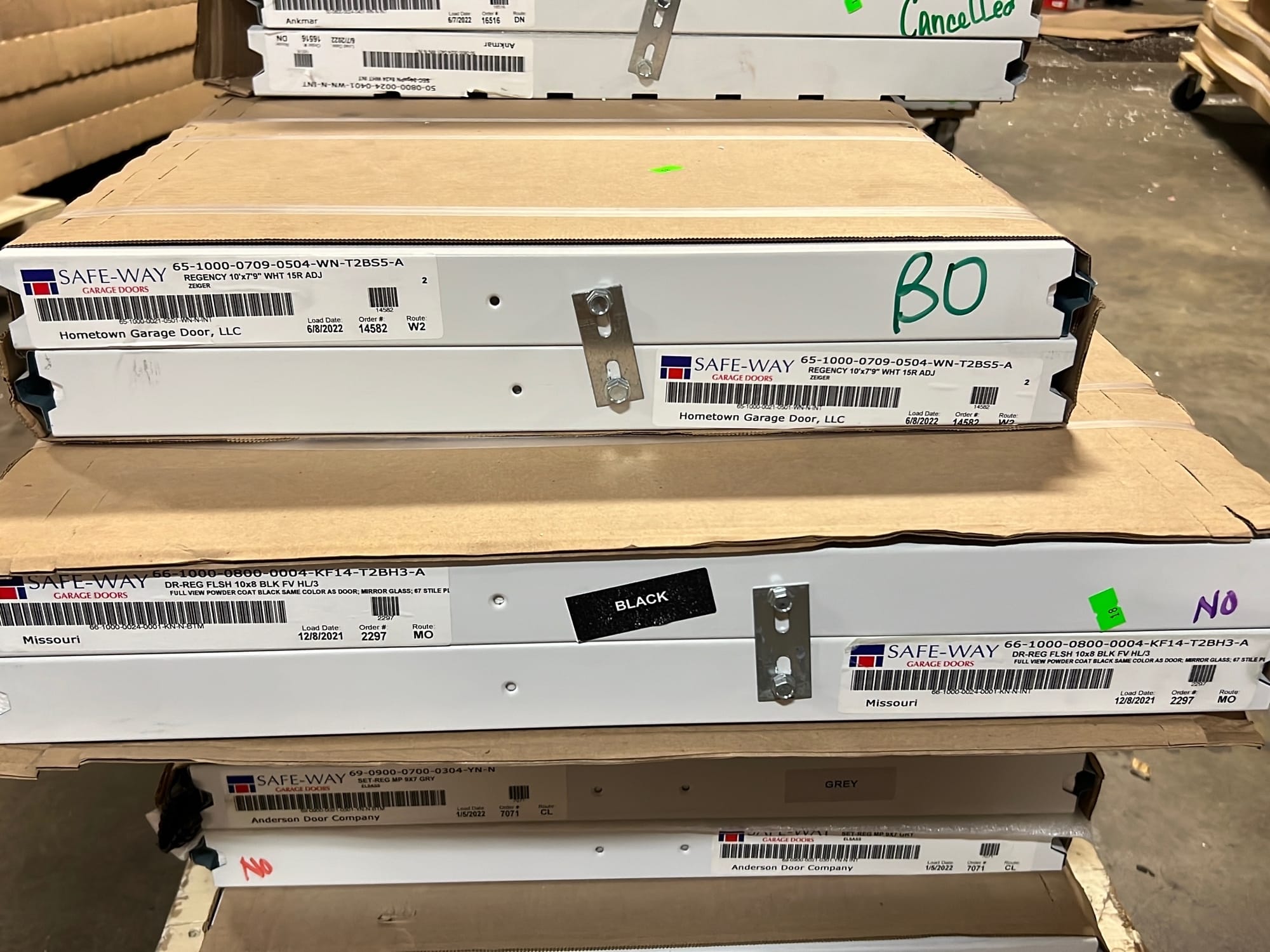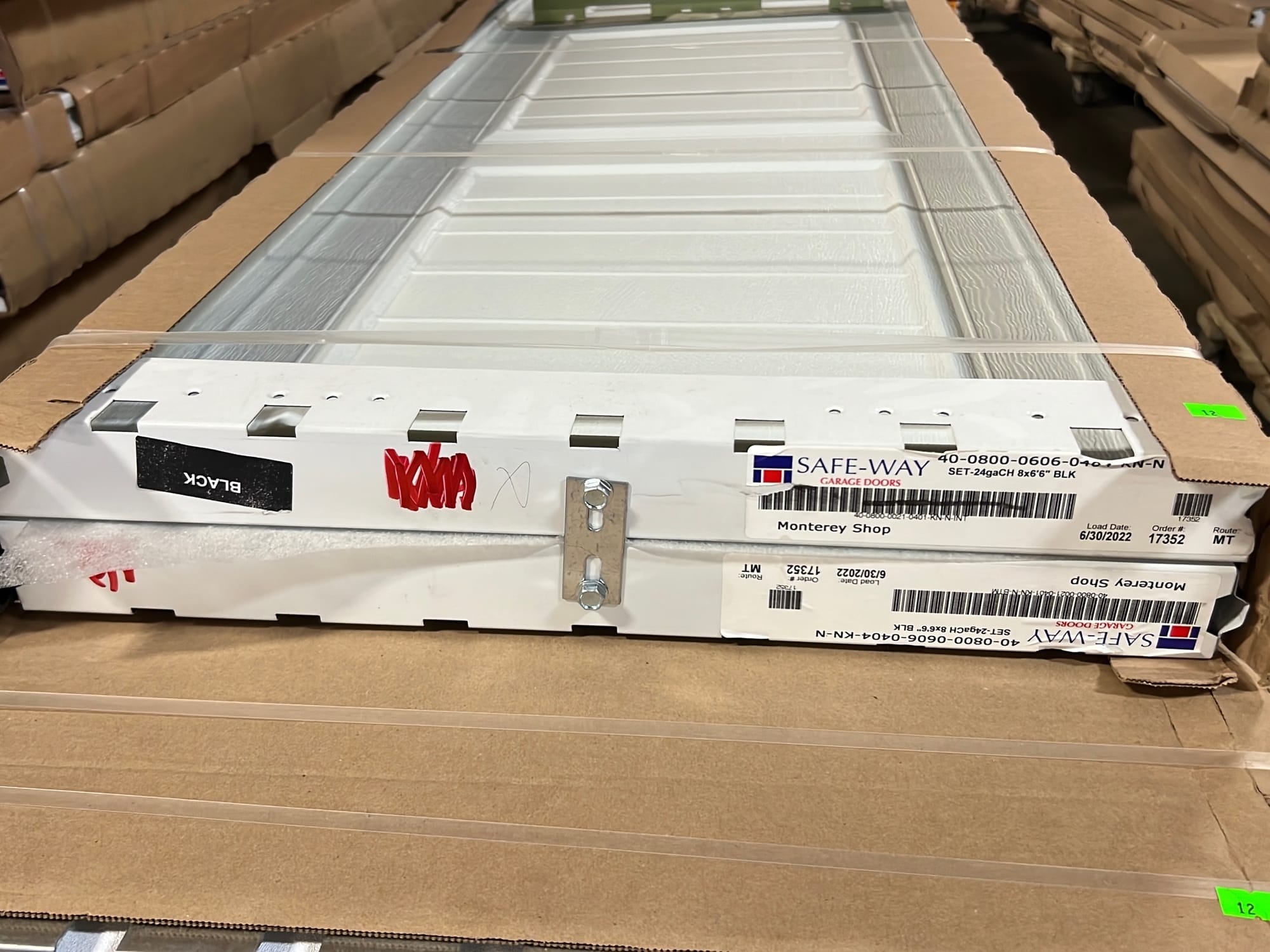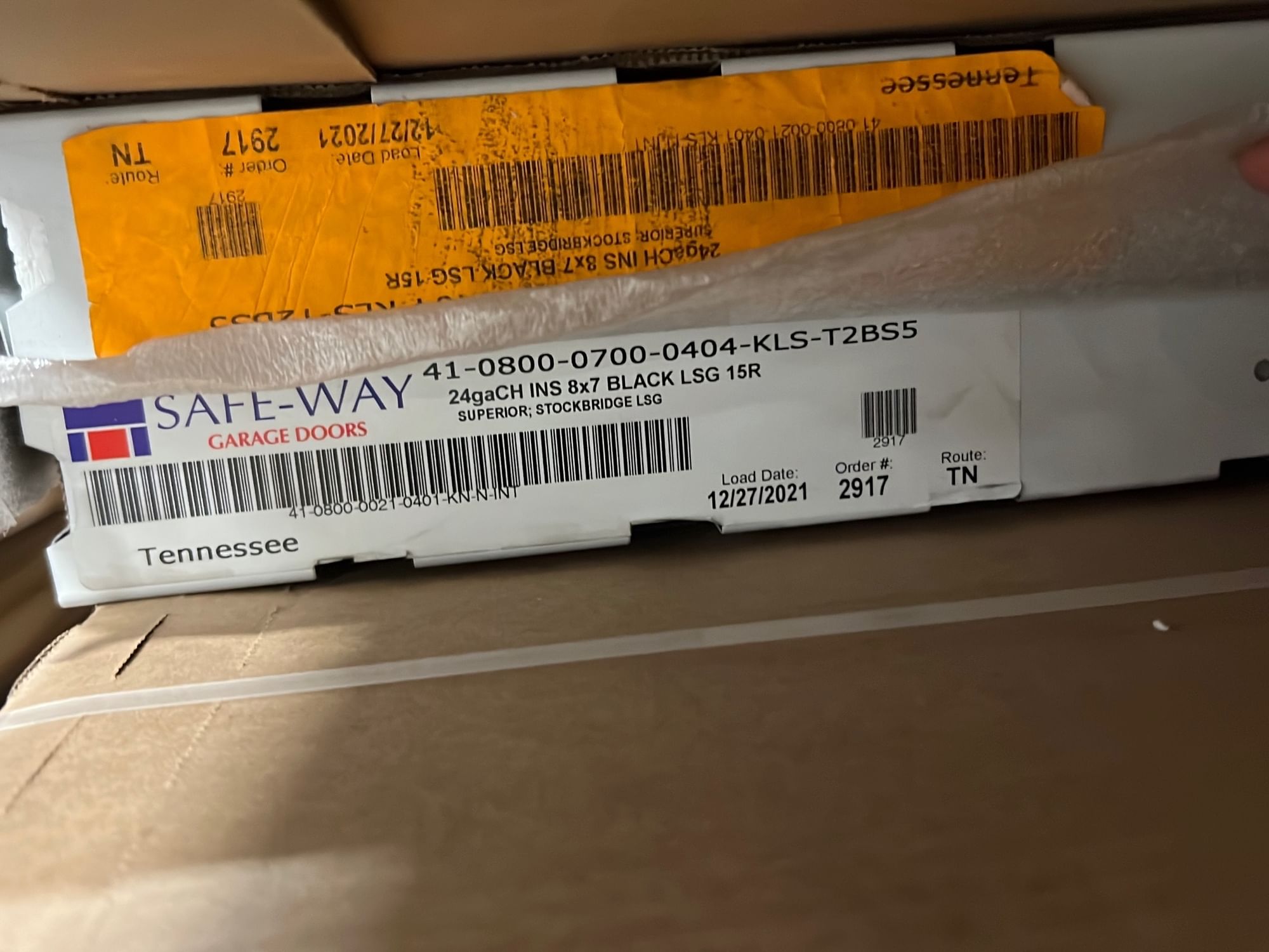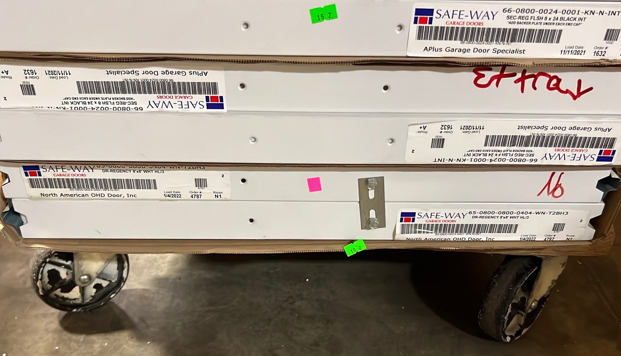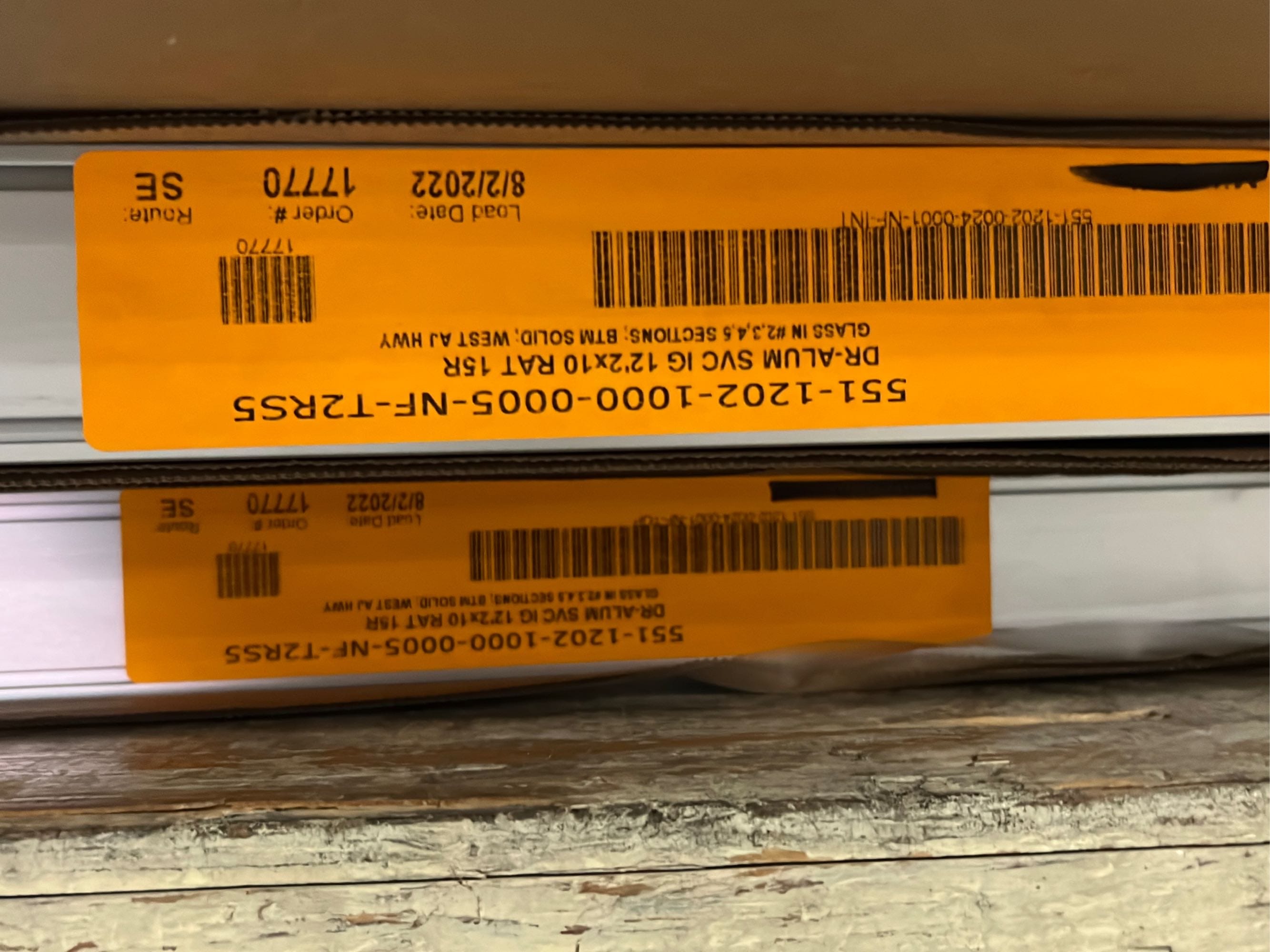 11 Garage Door Panels - (5) 12’2”x24” White, (1) 12’2”x21” White, (4) 8’x24” Black, (2) 7’x18” White, (1) 10’x21” White, (2) 7’5”x21”, (2) 8’x18” White, (1) 10’x21” White, (2) 8’x21” Black, (2) 9’x21” White, (10) 10’4”x18” White