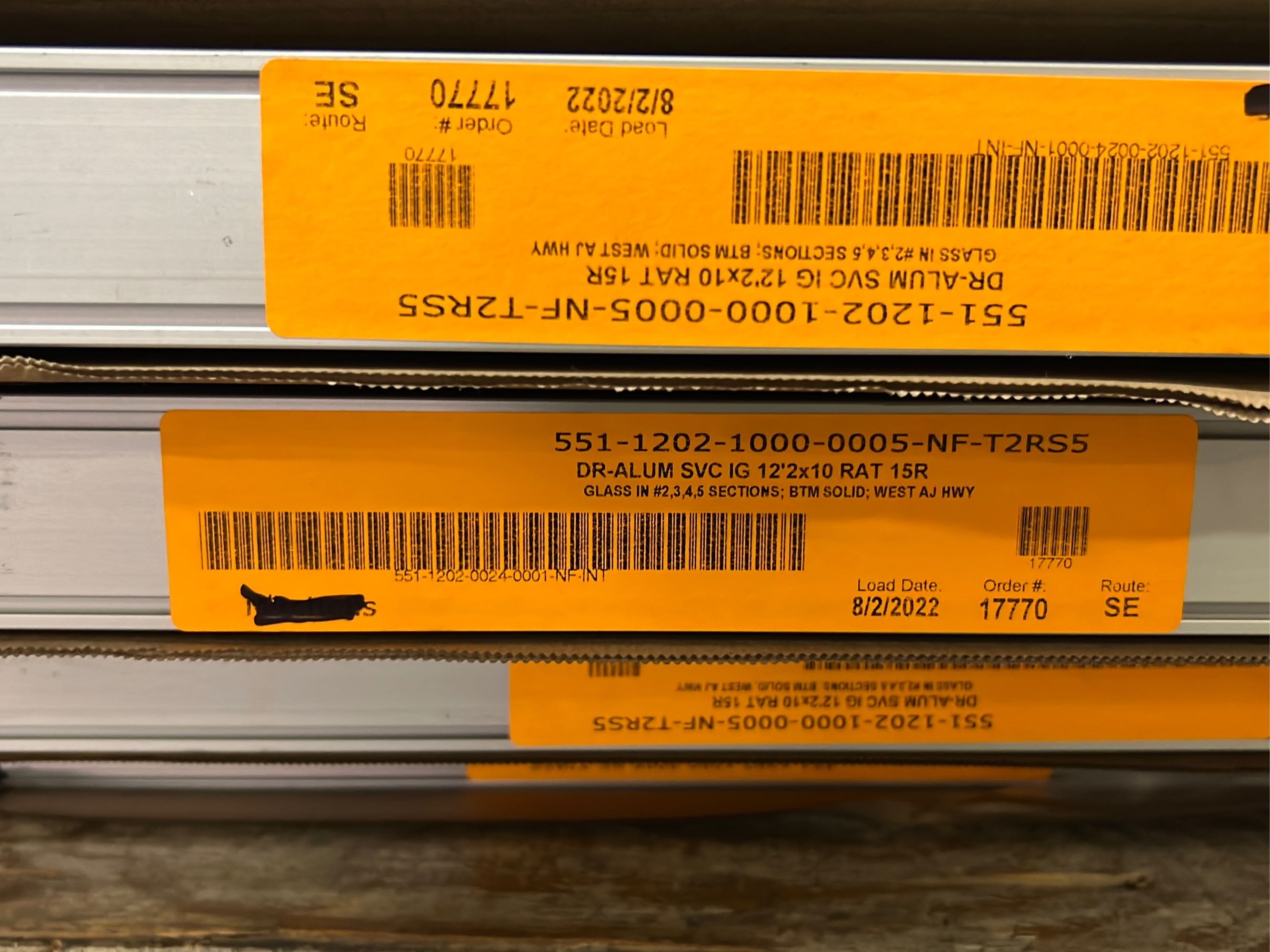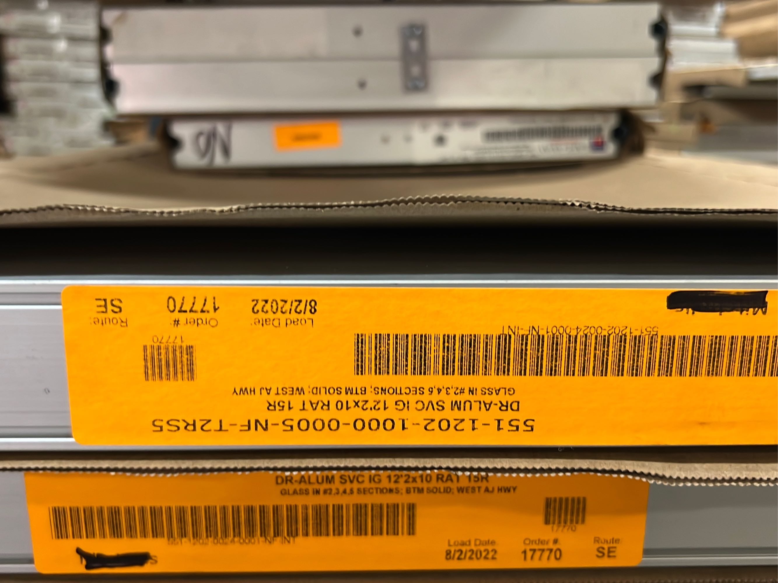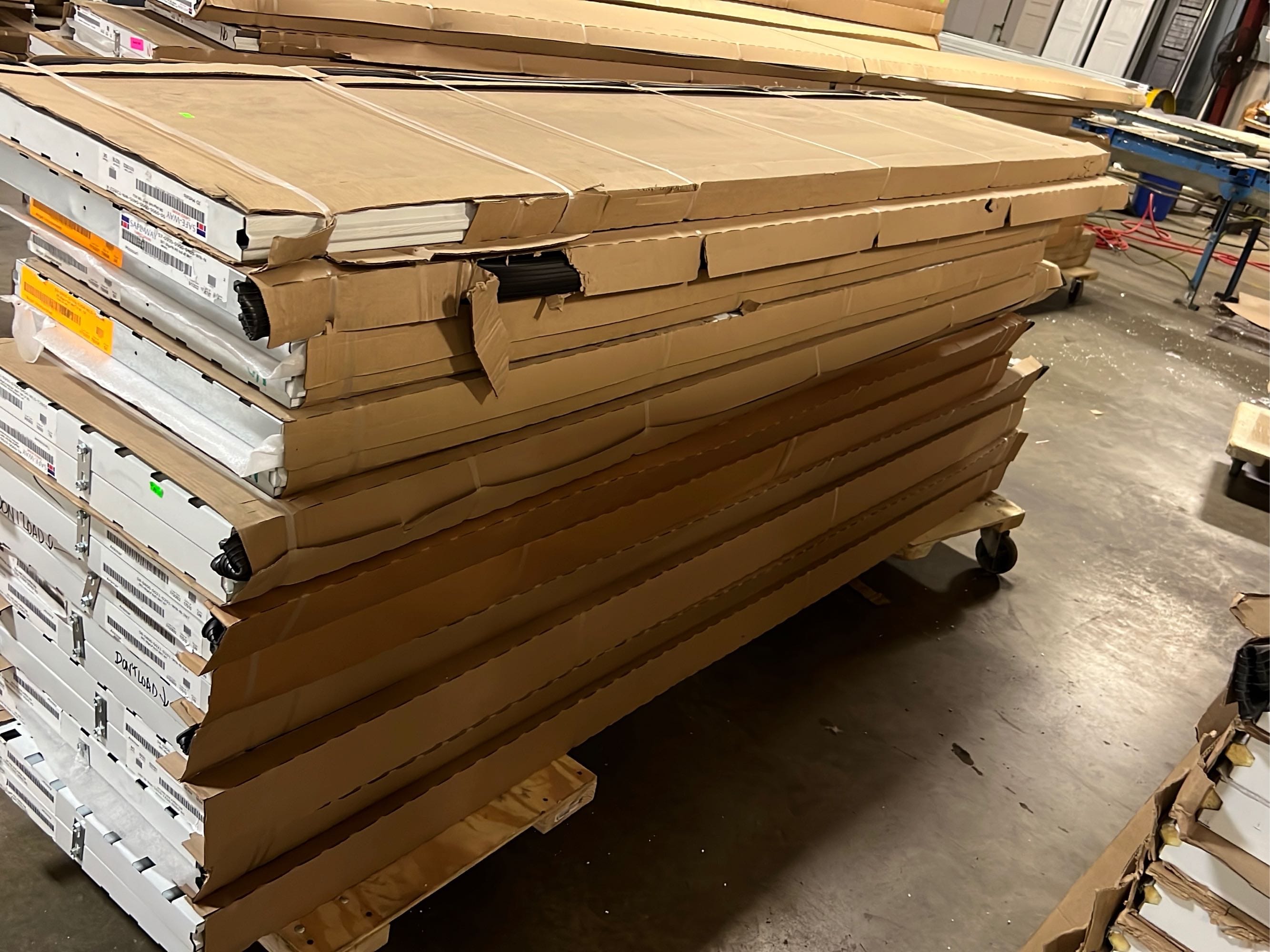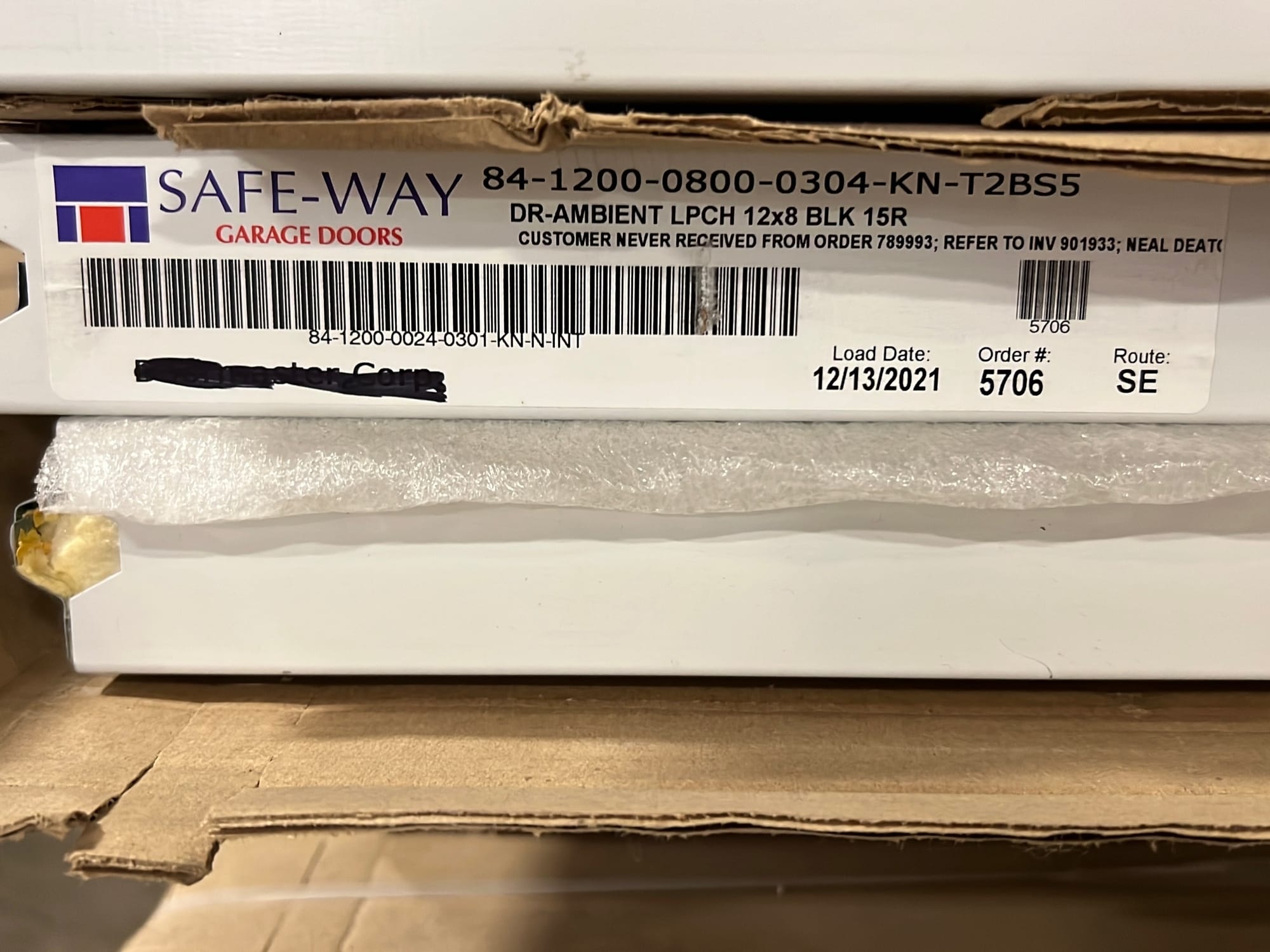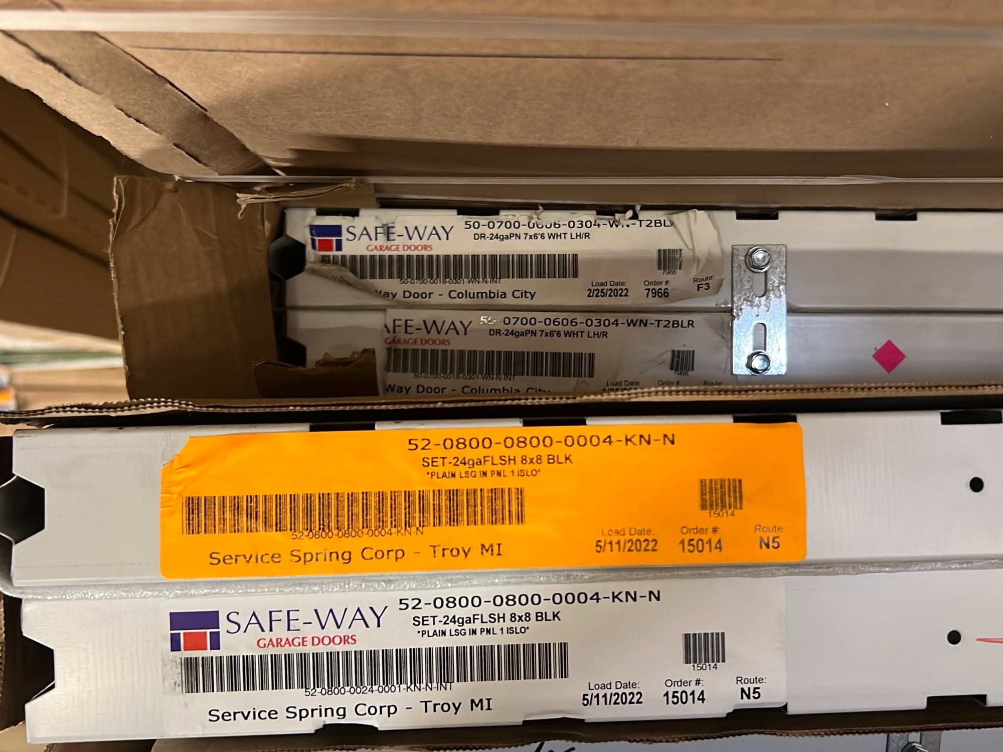 11 Garage Door Panels - (5) 12’2”x24” White, (1) 12’2”x21” White, (4) 8’x24” Black, (2) 7’x18” White, (1) 10’x21” White, (2) 7’5”x21”, (2) 8’x18” White, (1) 10’x21” White, (2) 8’x21” Black, (2) 9’x21” White, (10) 10’4”x18” White