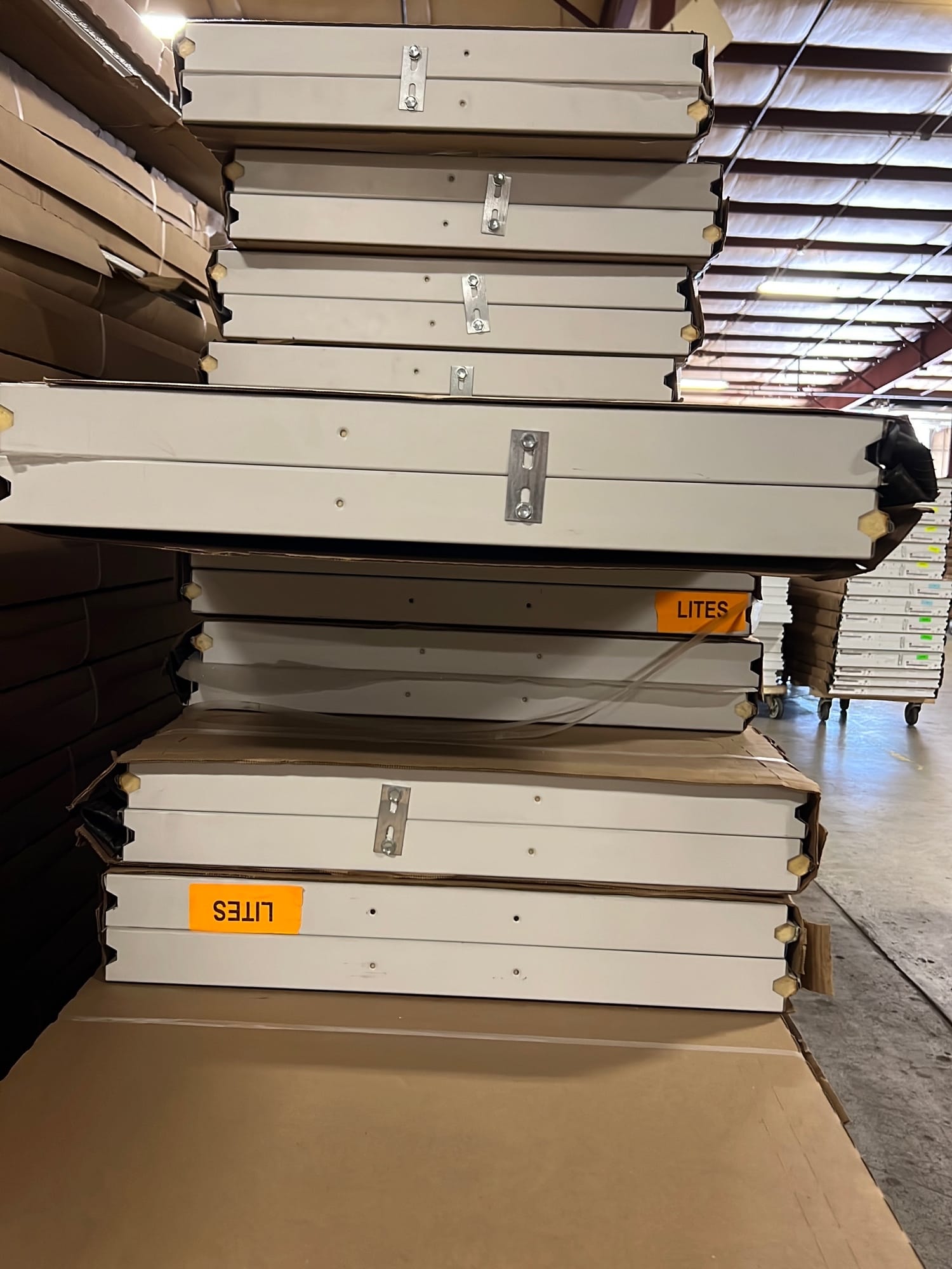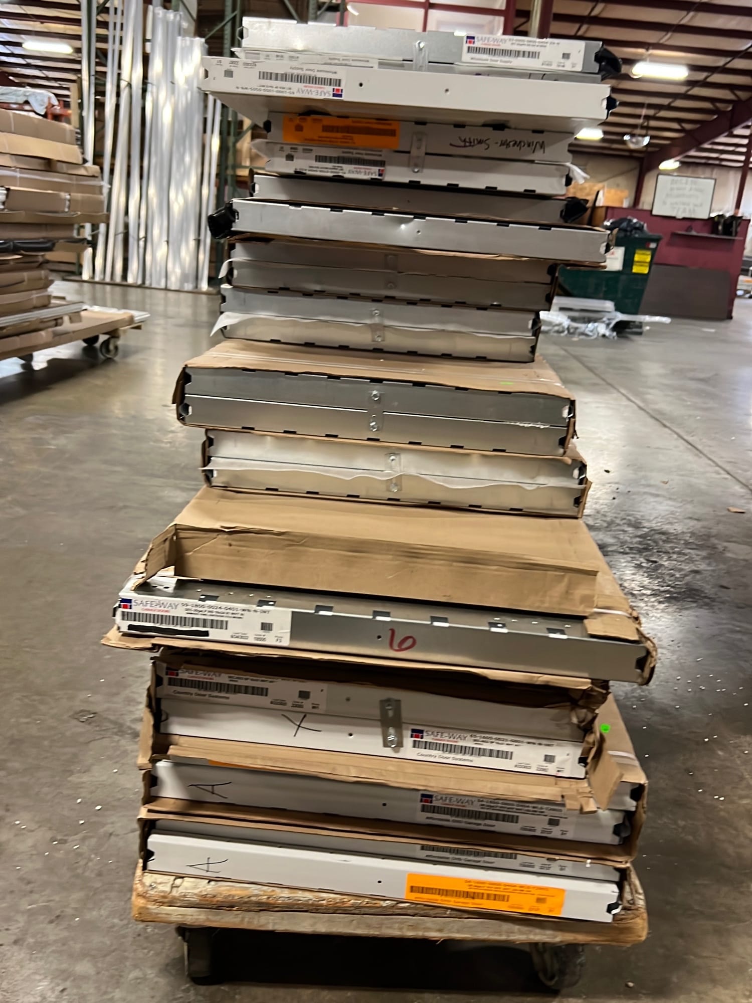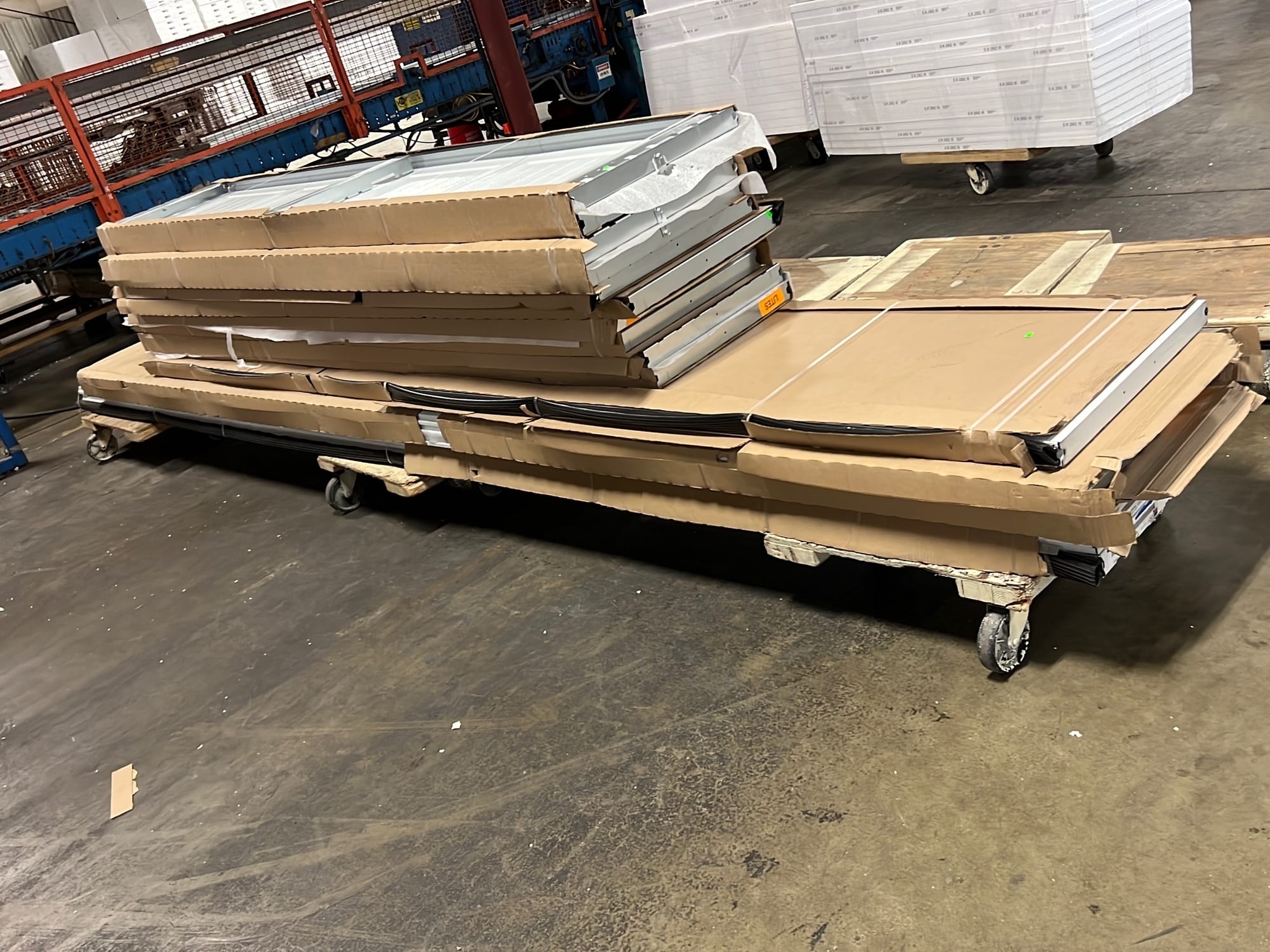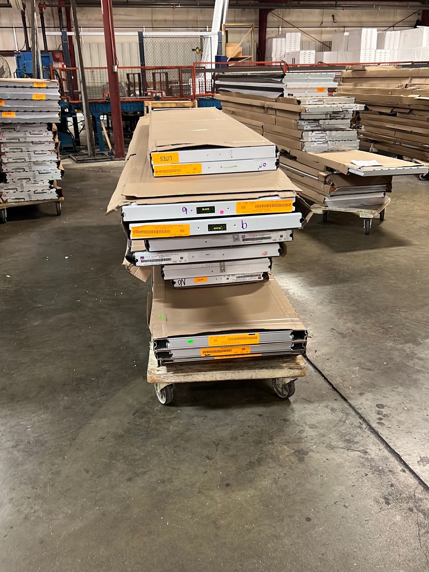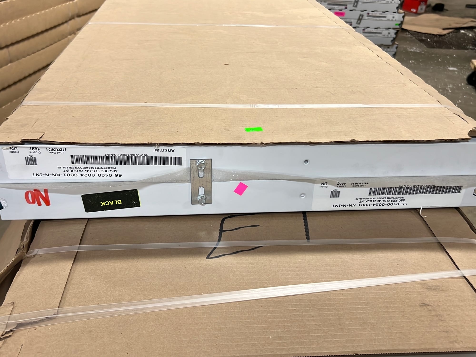11 Garage Door Panels - (5) 12’2”x24” White, (1) 12’2”x21” White, (4) 8’x24” Black, (2) 7’x18” White, (1) 10’x21” White, (2) 7’5”x21”, (2) 8’x18” White, (1) 10’x21” White, (2) 8’x21” Black, (2) 9’x21” White, (10) 10’4”x18” White