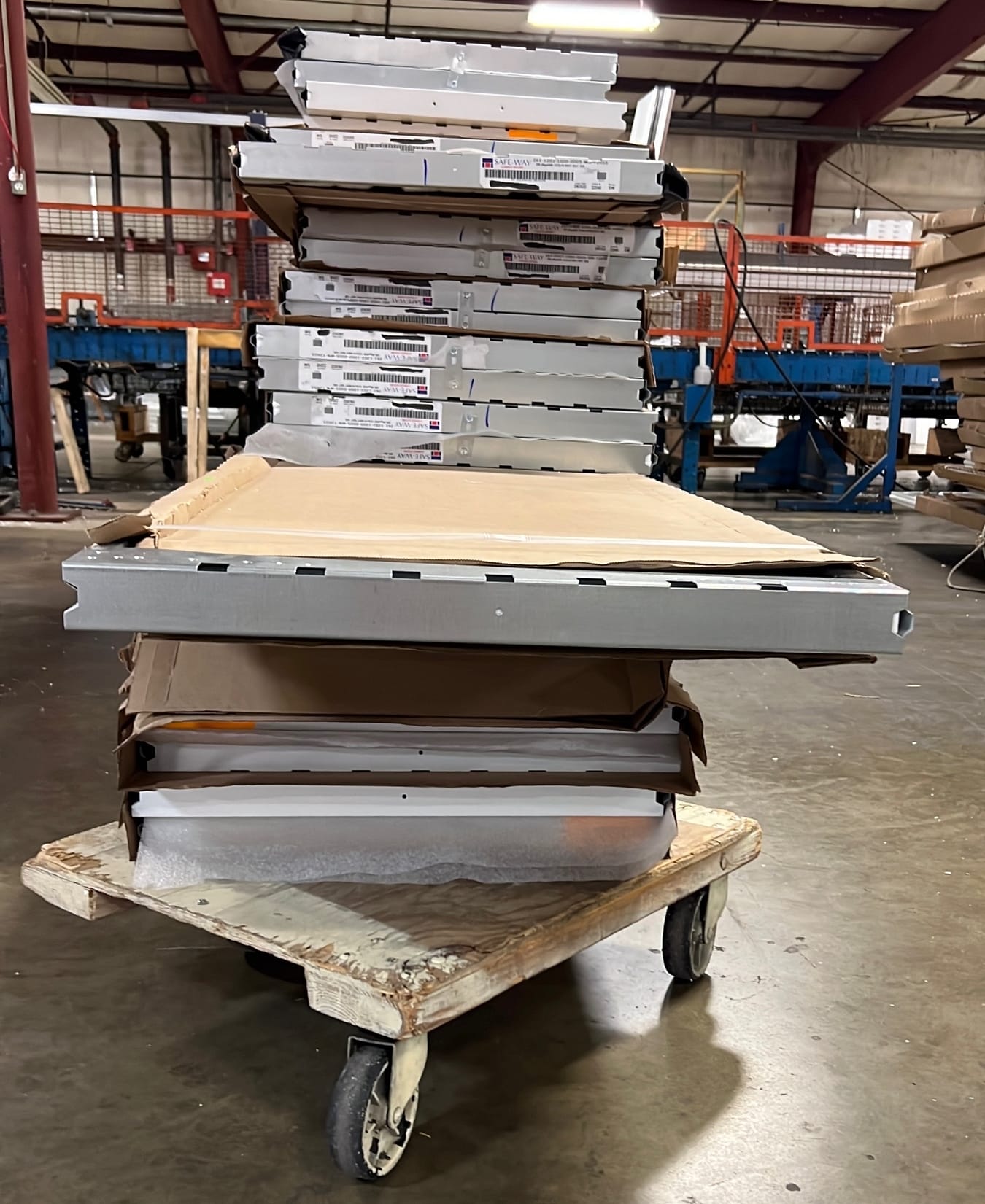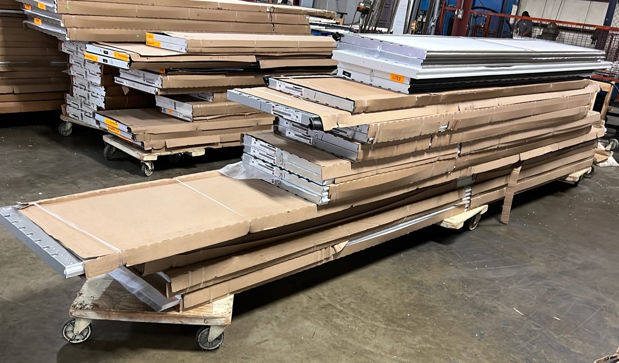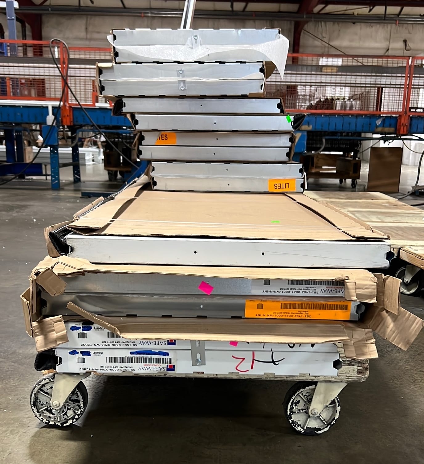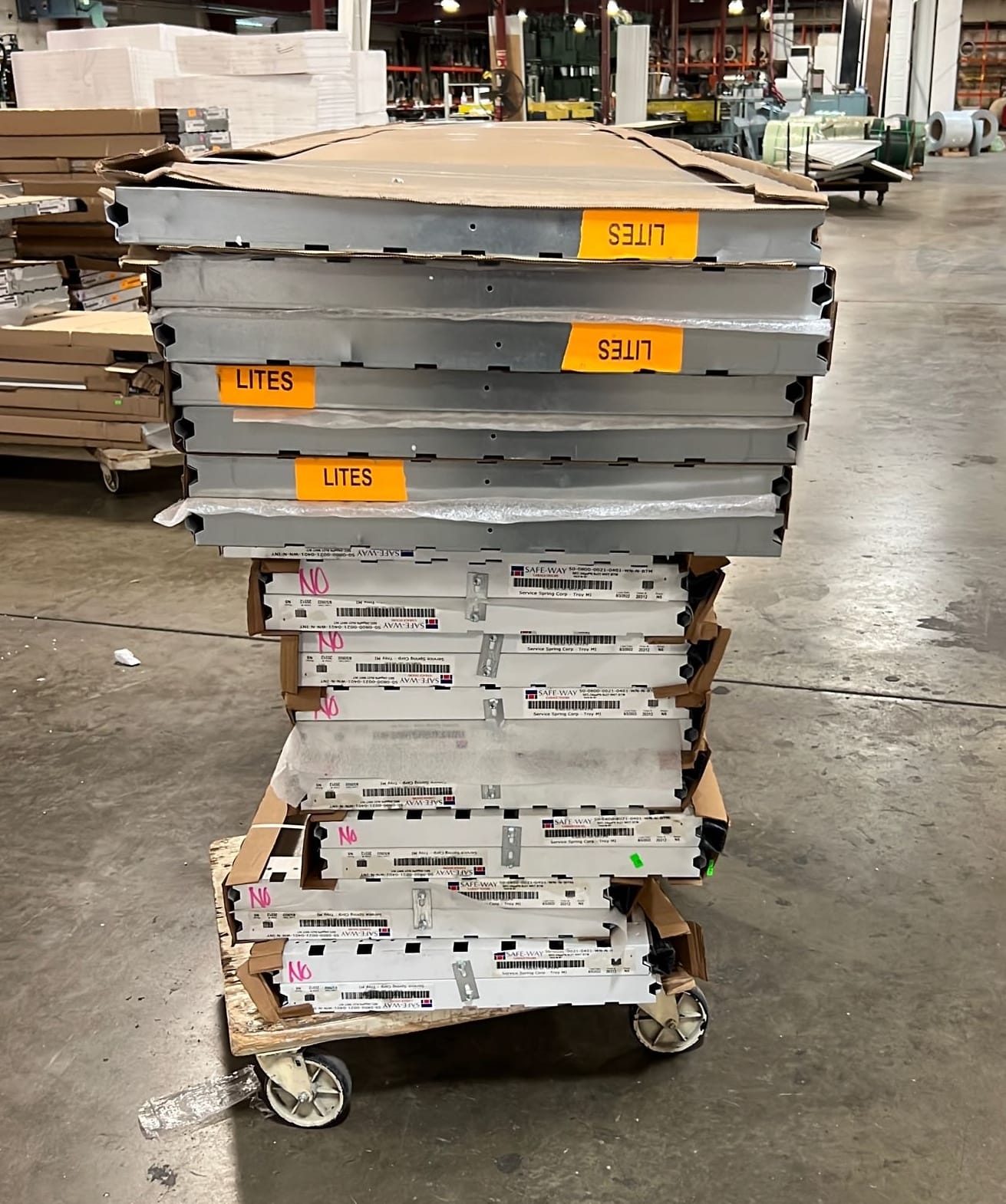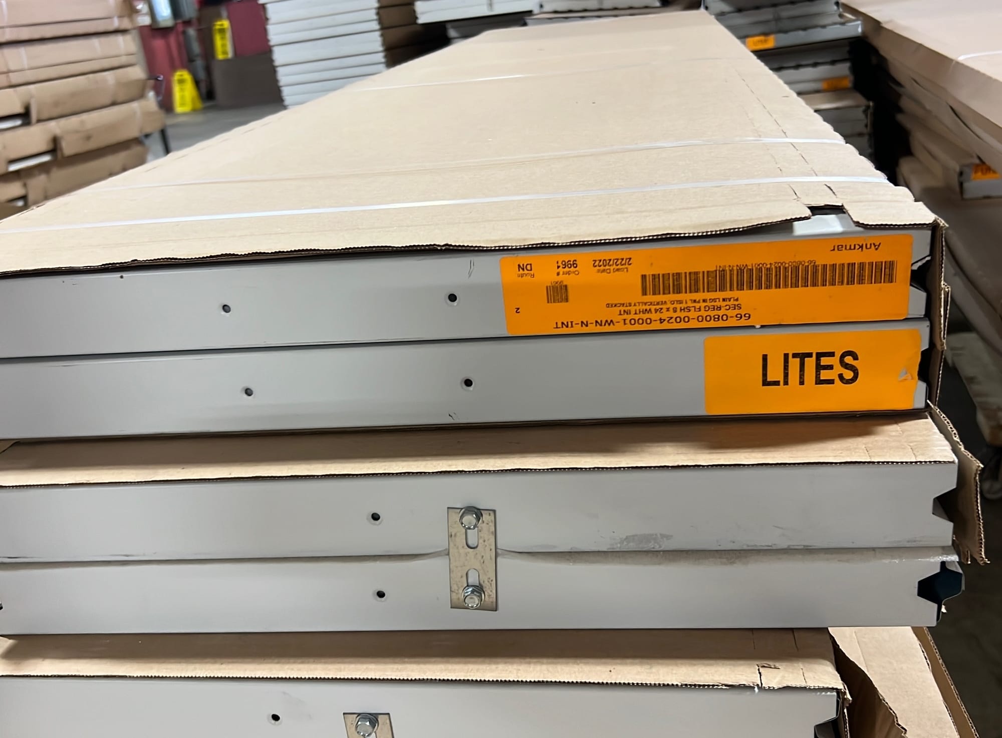 11 Garage Door Panels - (5) 12’2”x24” White, (1) 12’2”x21” White, (4) 8’x24” Black, (2) 7’x18” White, (1) 10’x21” White, (2) 7’5”x21”, (2) 8’x18” White, (1) 10’x21” White, (2) 8’x21” Black, (2) 9’x21” White, (10) 10’4”x18” White