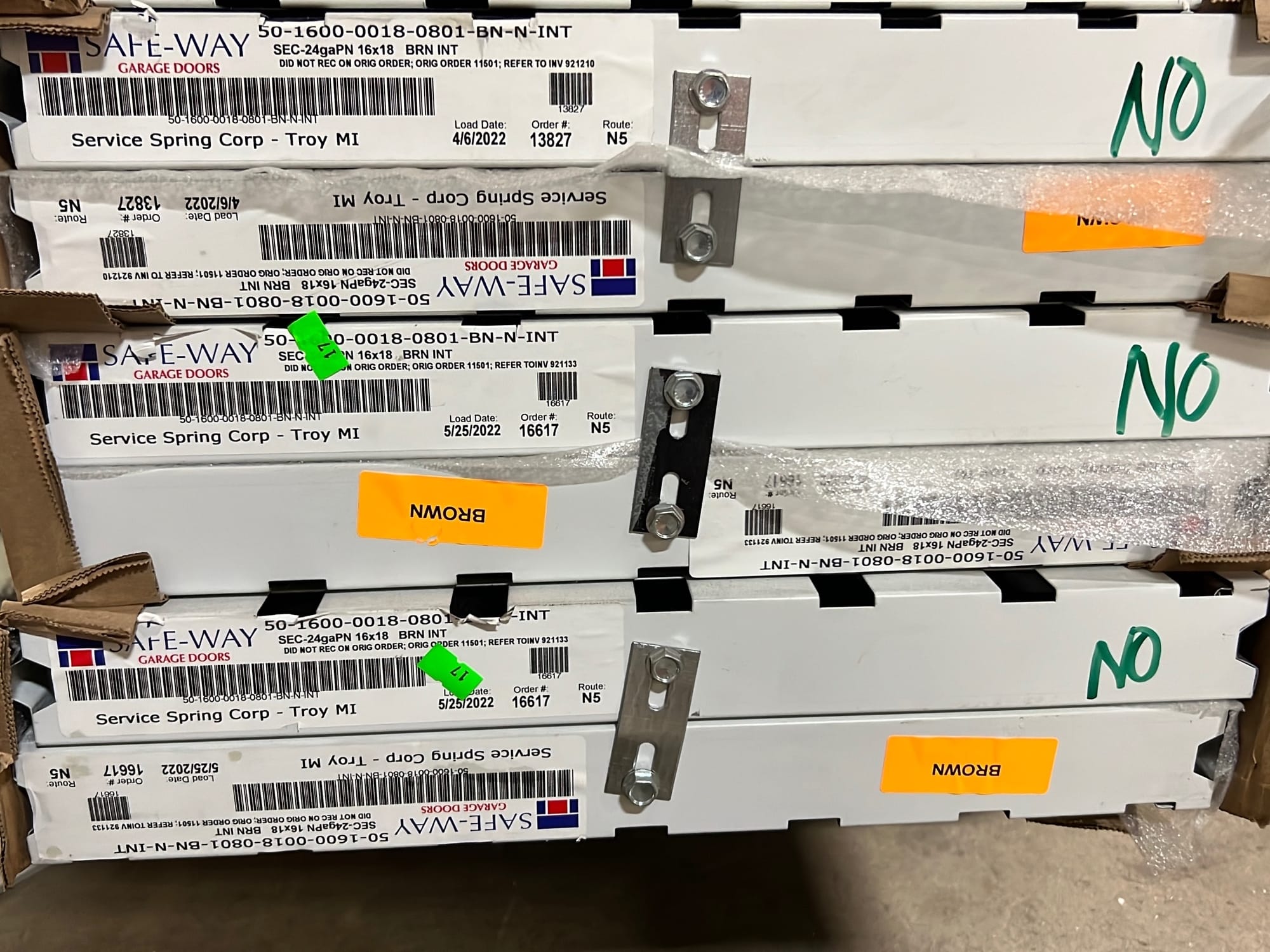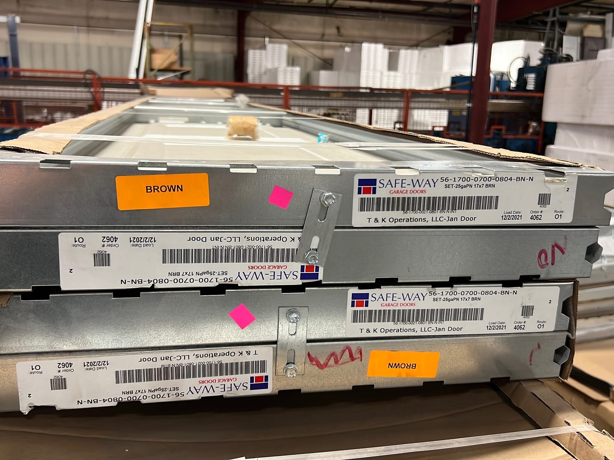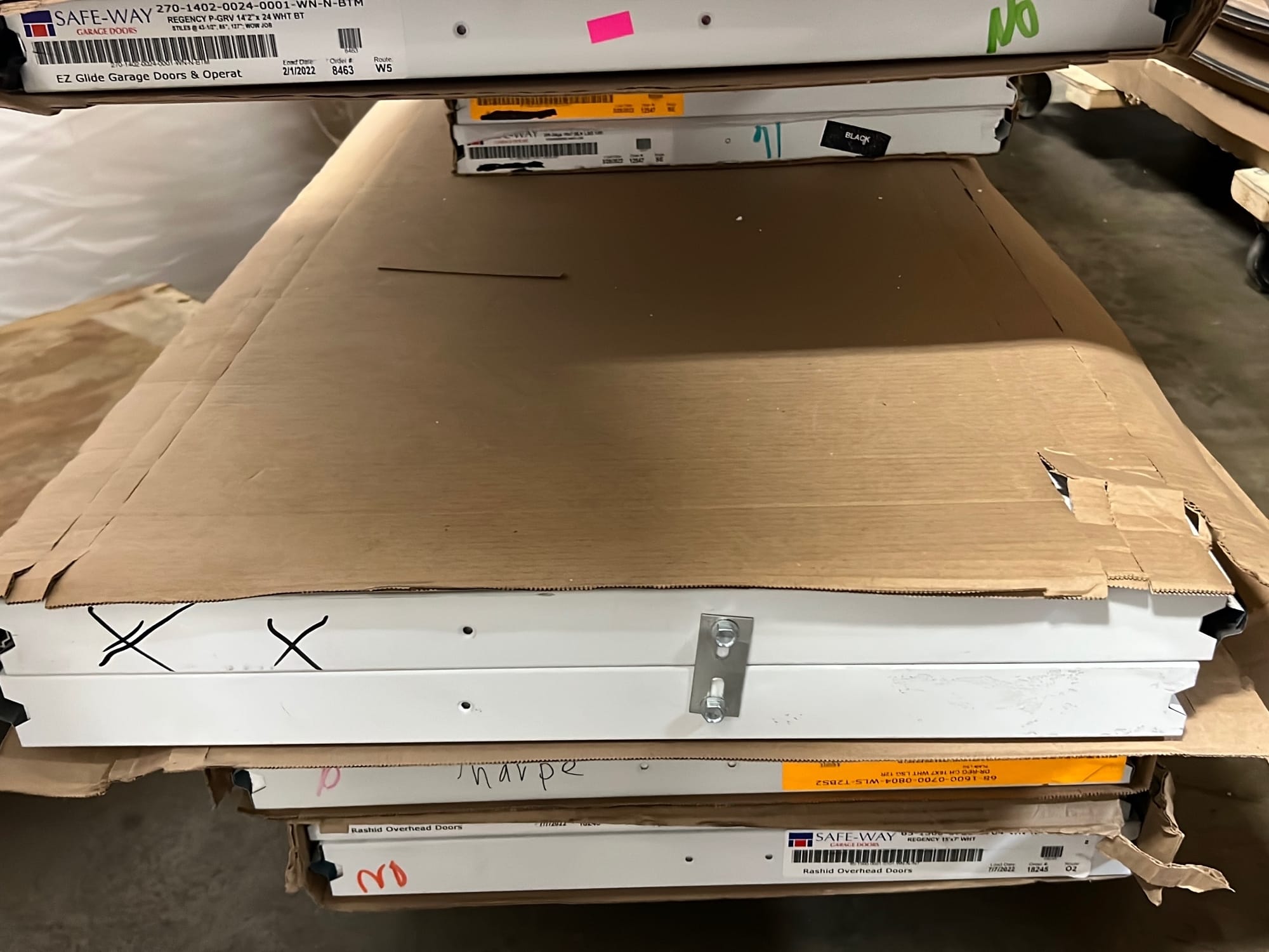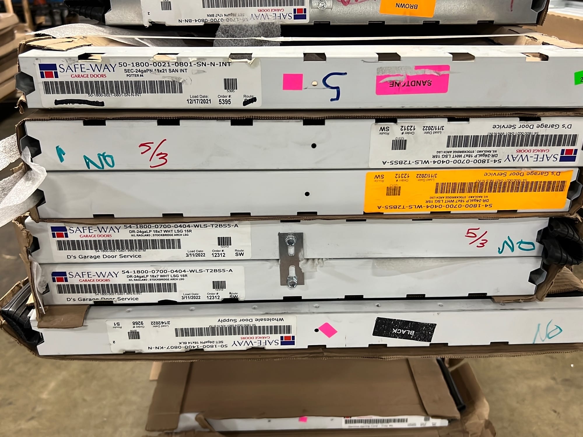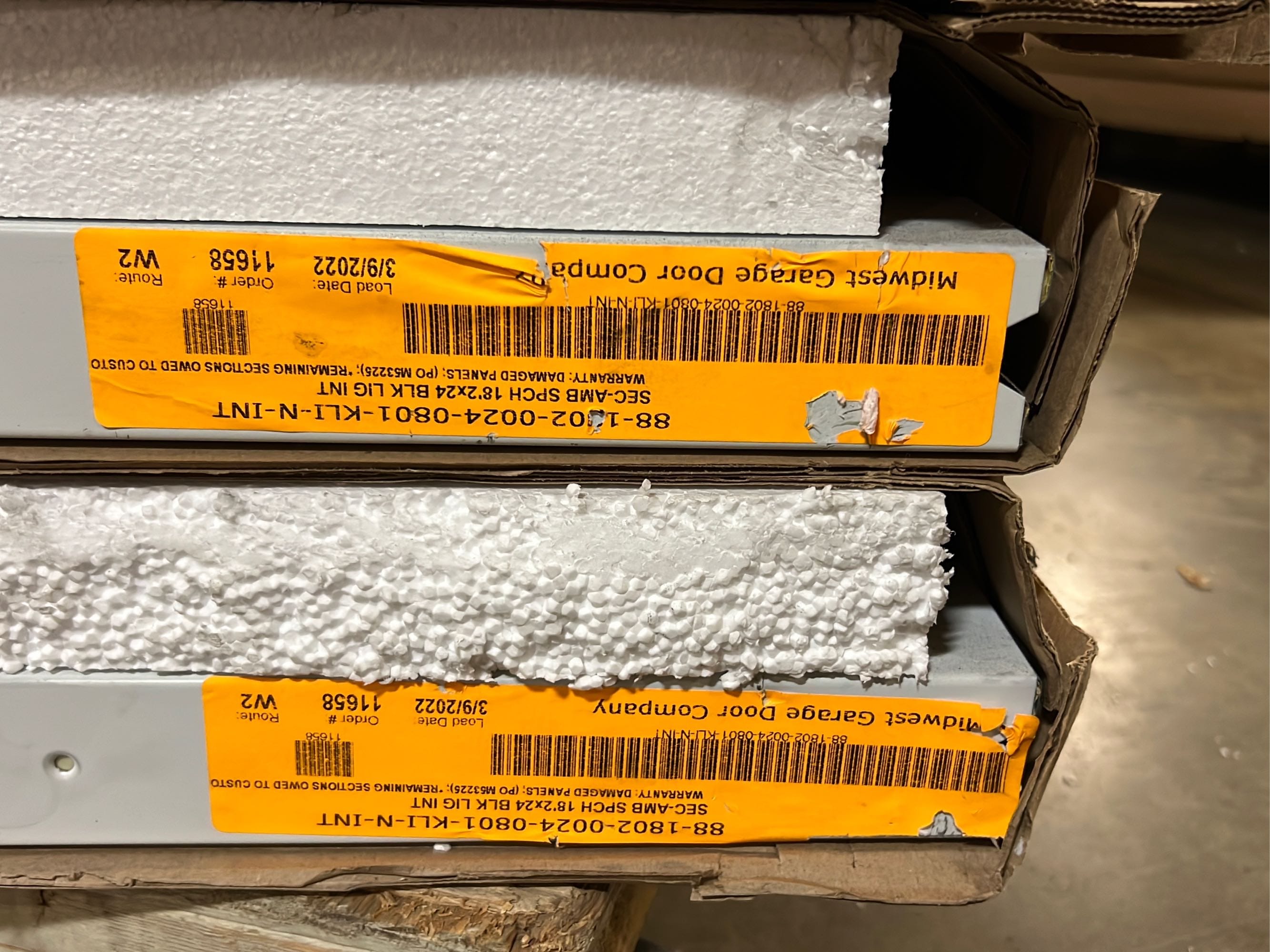 26 Garage Door Panels - (4) 17’x21” Brown, (1) 18’x21” Sandtone, (4) 18’x21” White, (1) 18’x24” Black, (2) 15’x18” White, (1) 14’2”x24” White, (4) 12’x24” Brown, (2) 12’x21” White, (1) 14’2”x24” White, (1) 12’2”x24” White, (1) 10’x24” Black, (1) 20’x24” White marked damaged