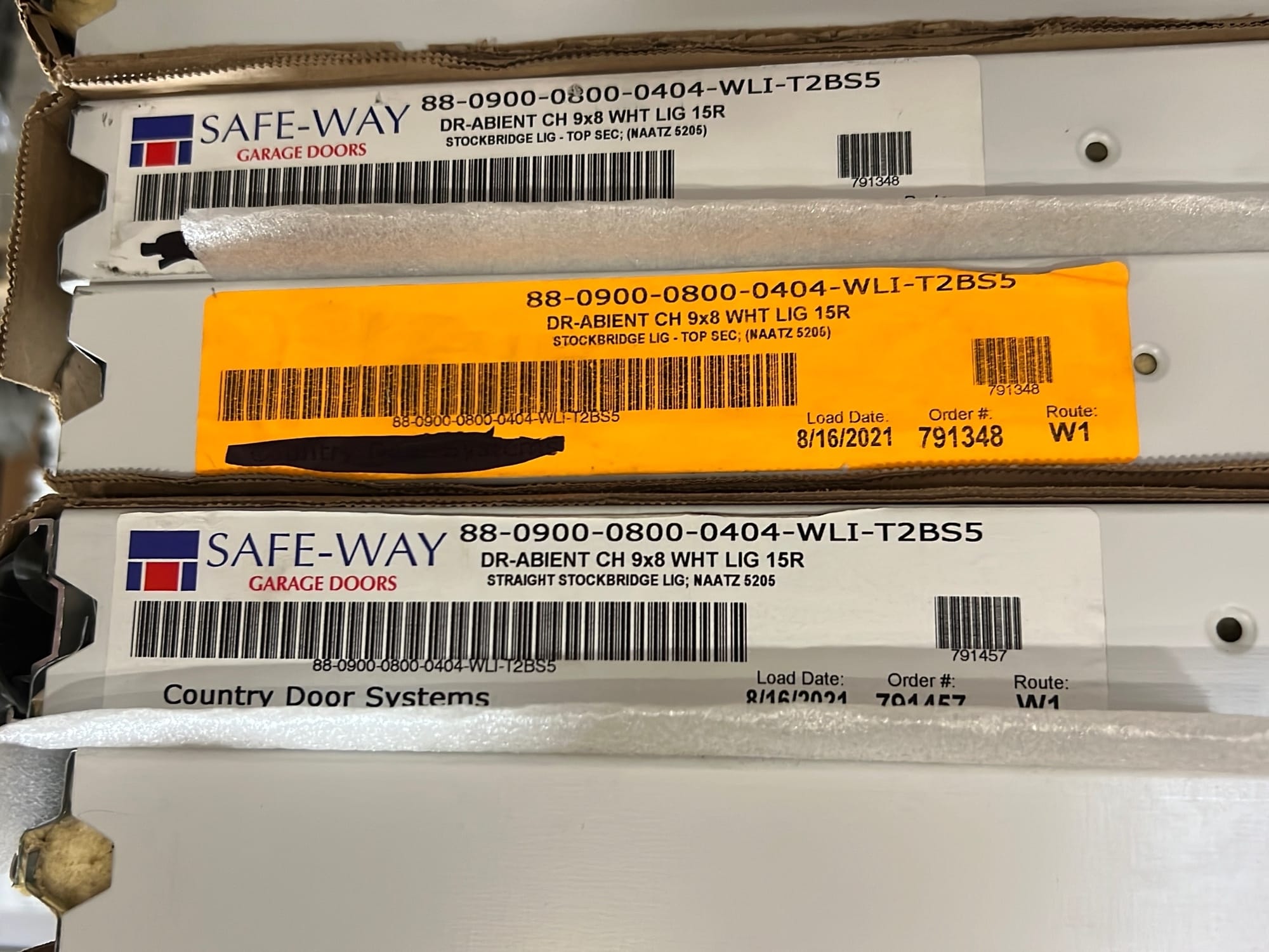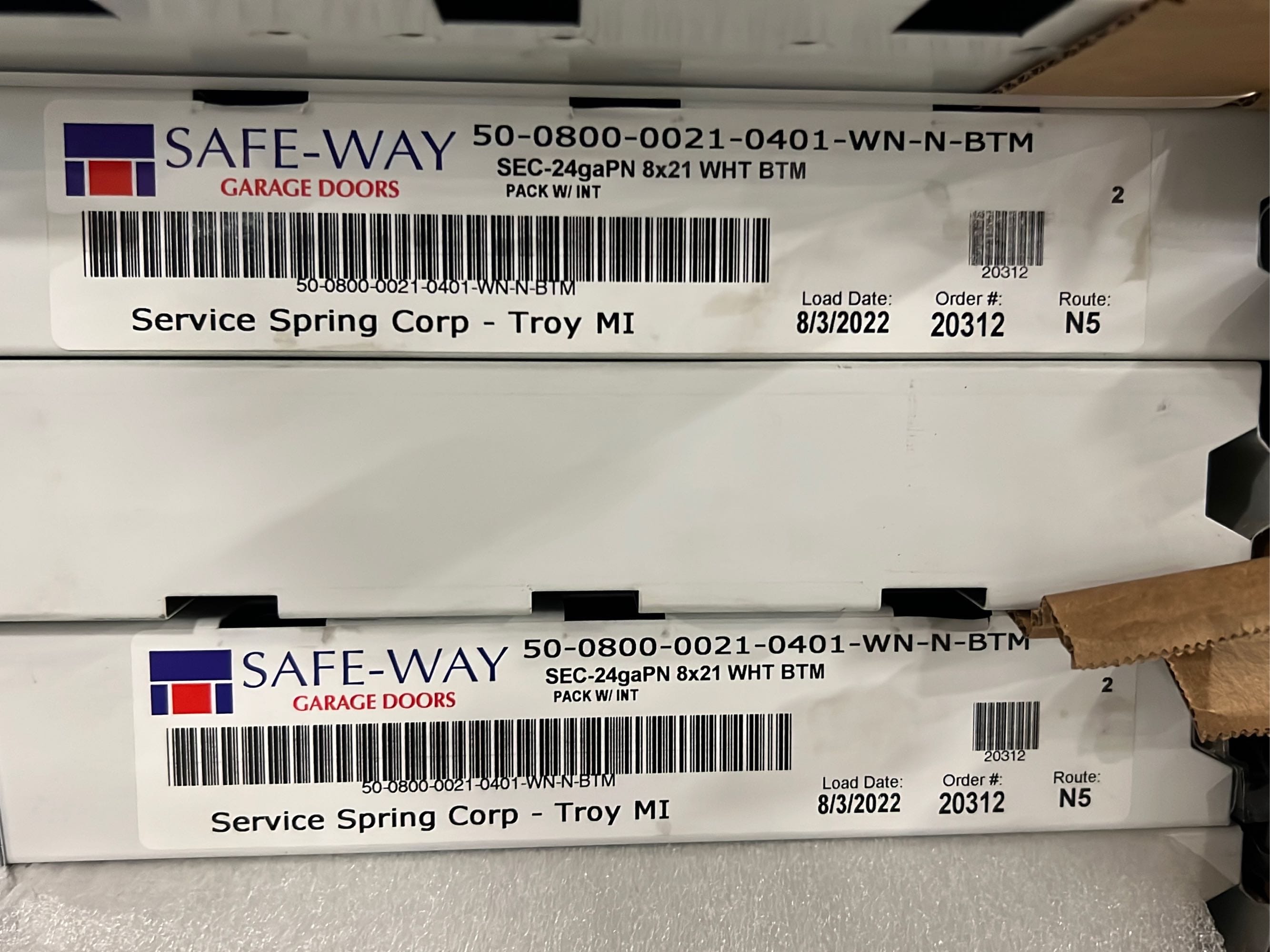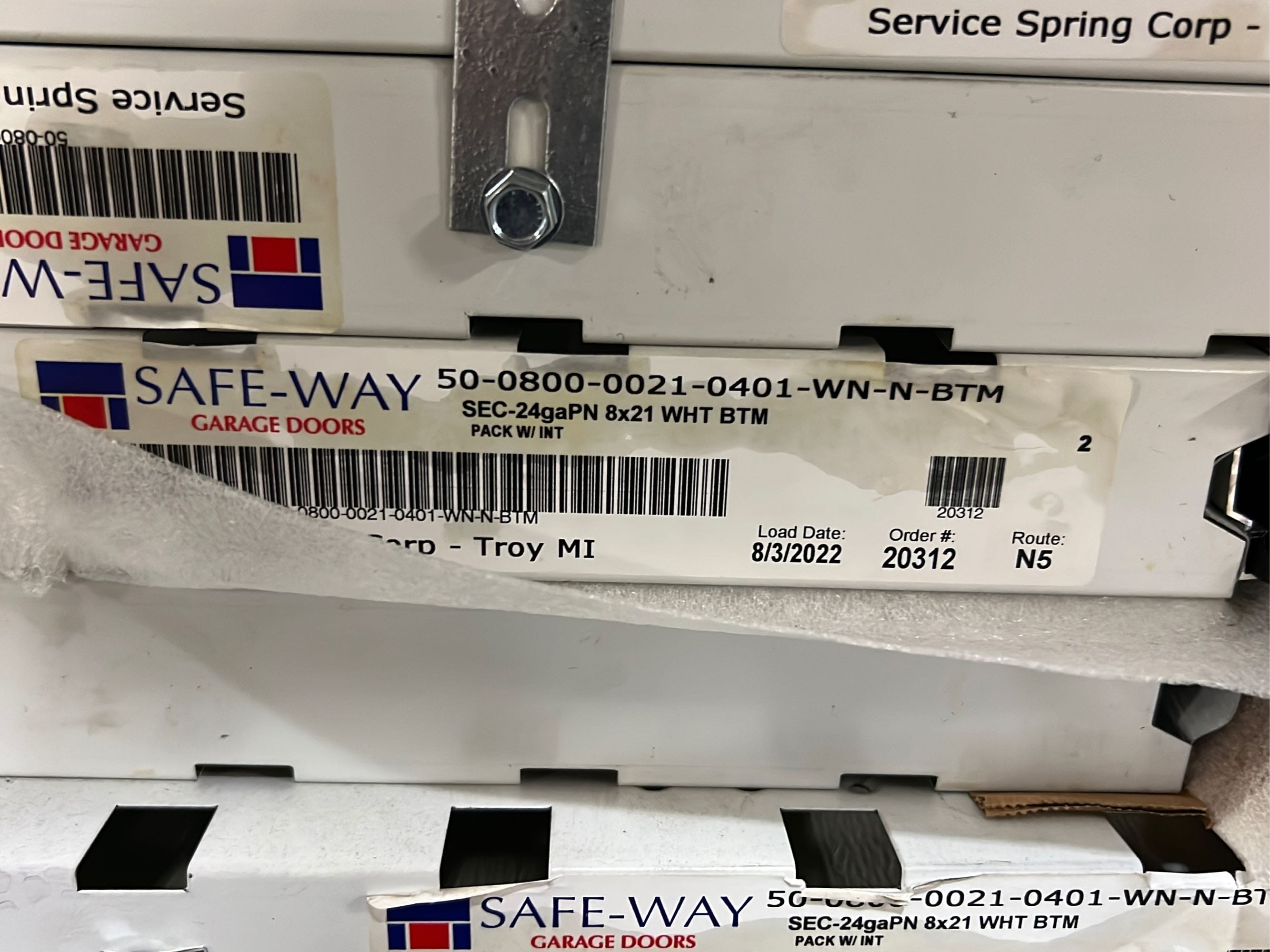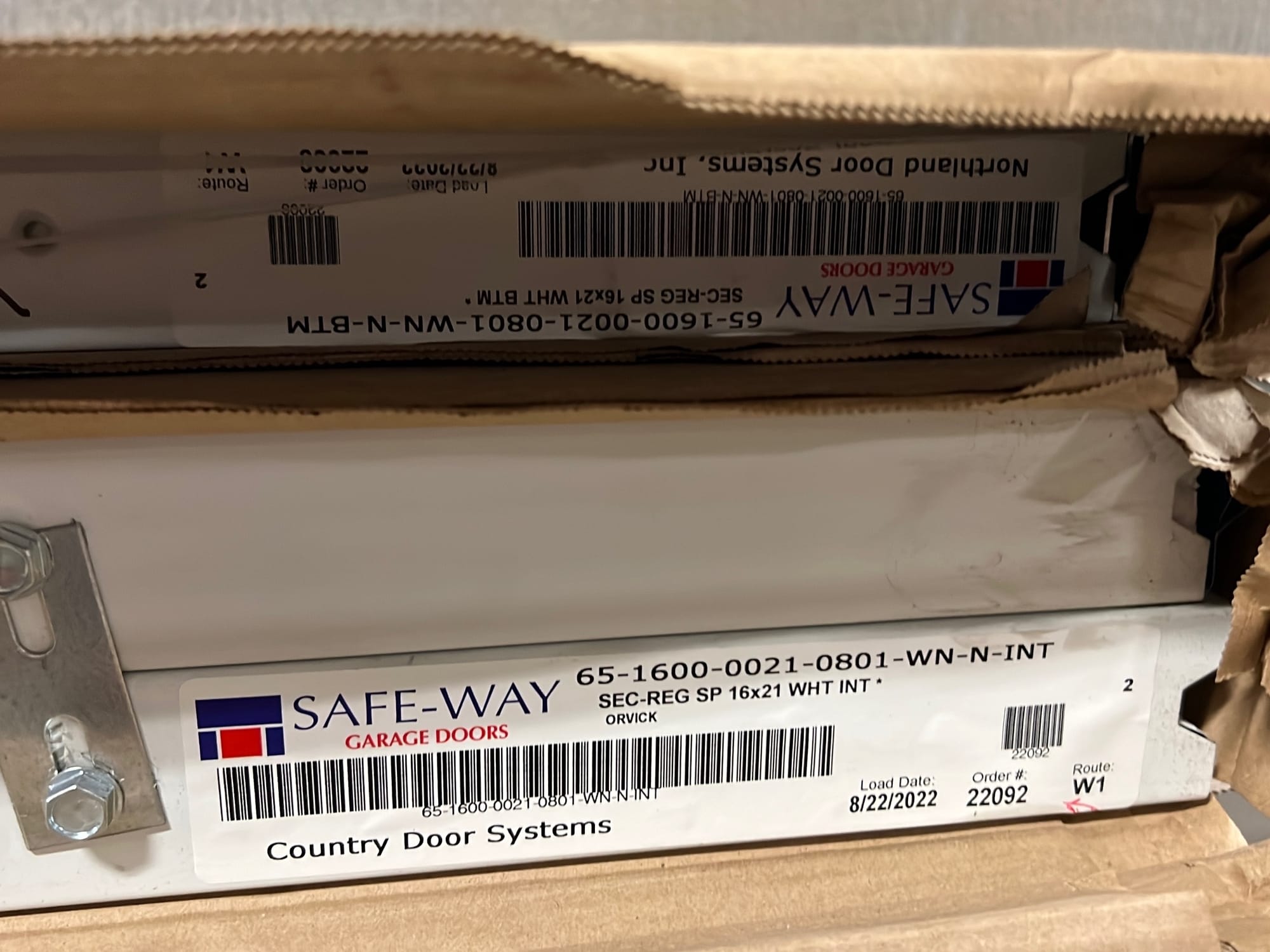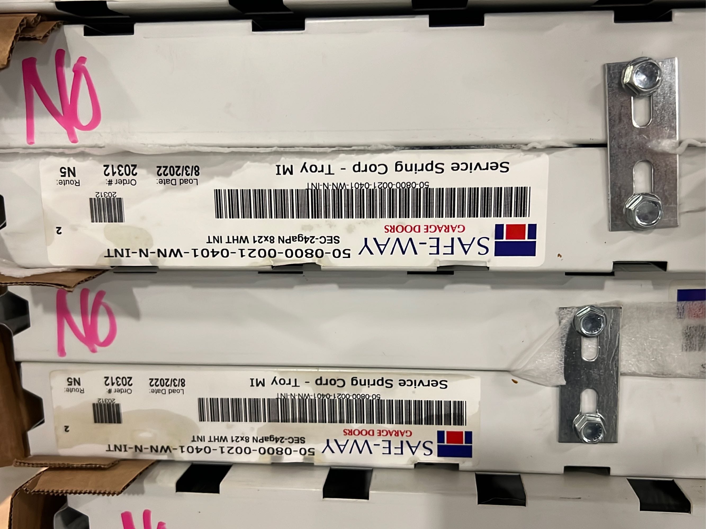21 Garage Door Panels - (2) 9’x24” White, (4) 8’x21” White, (4) 8’x21” White, (2) 9’x21” White, (4) 8’x21” White, (8) 9’x21” White