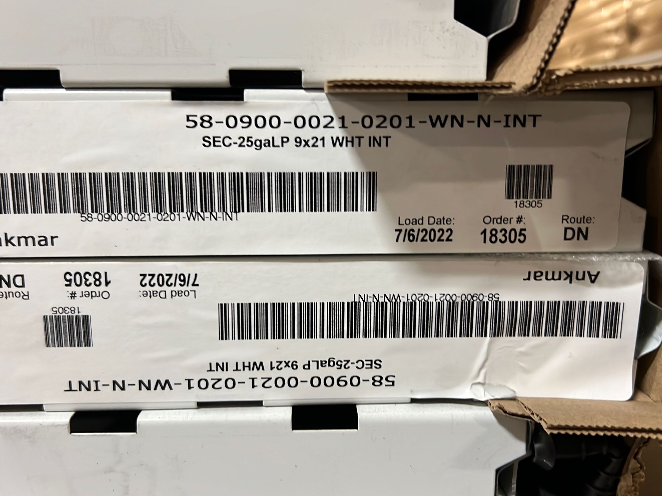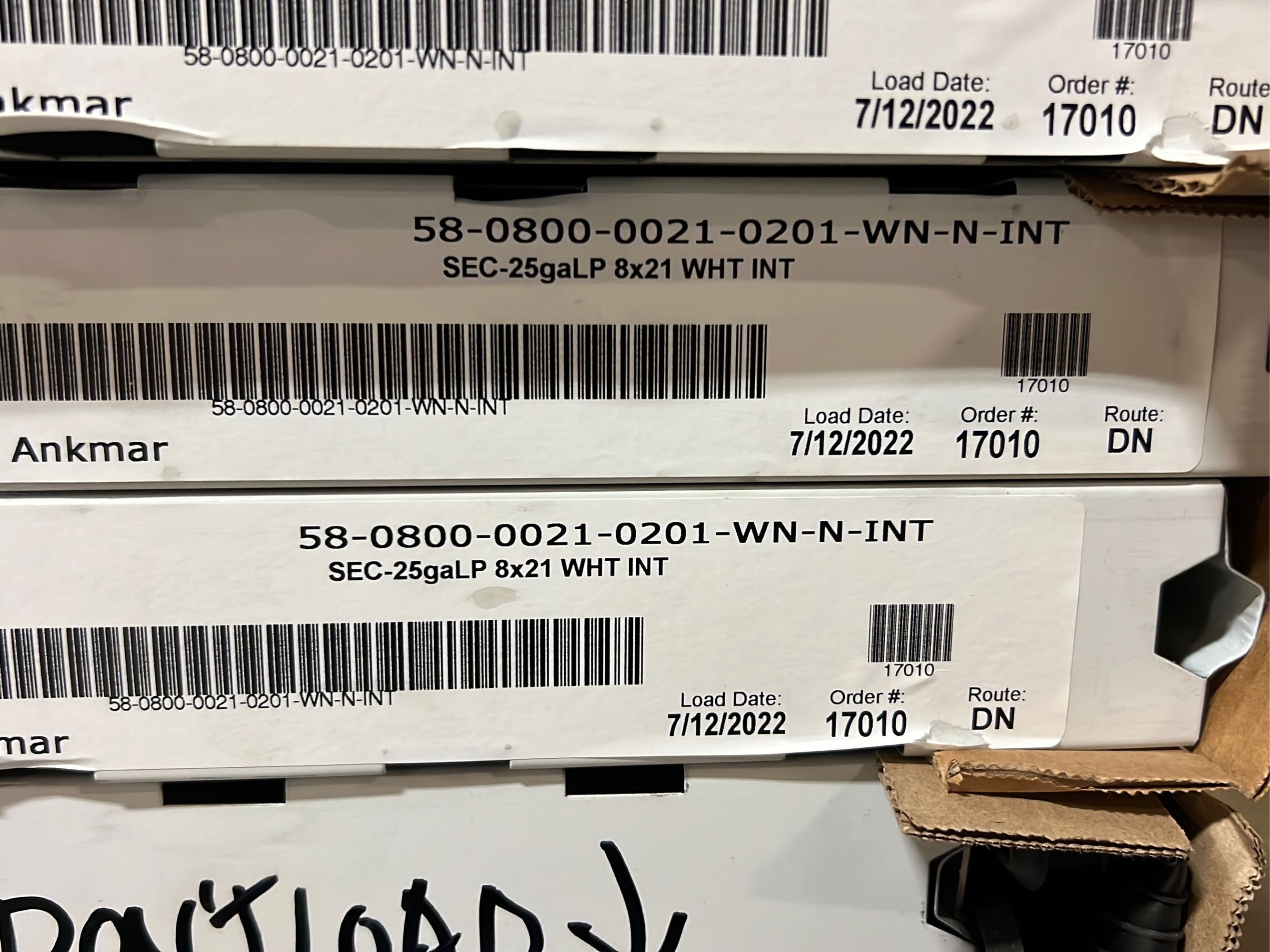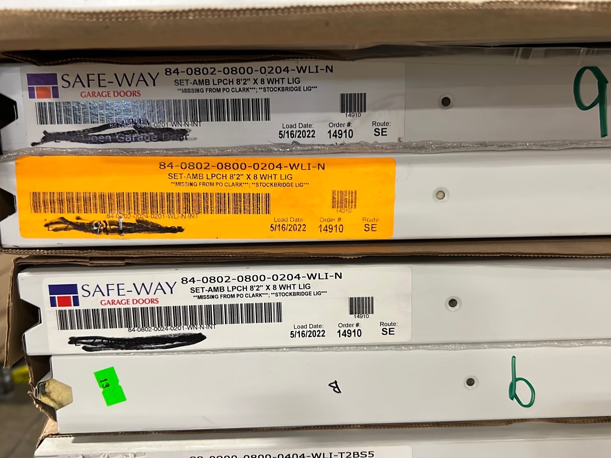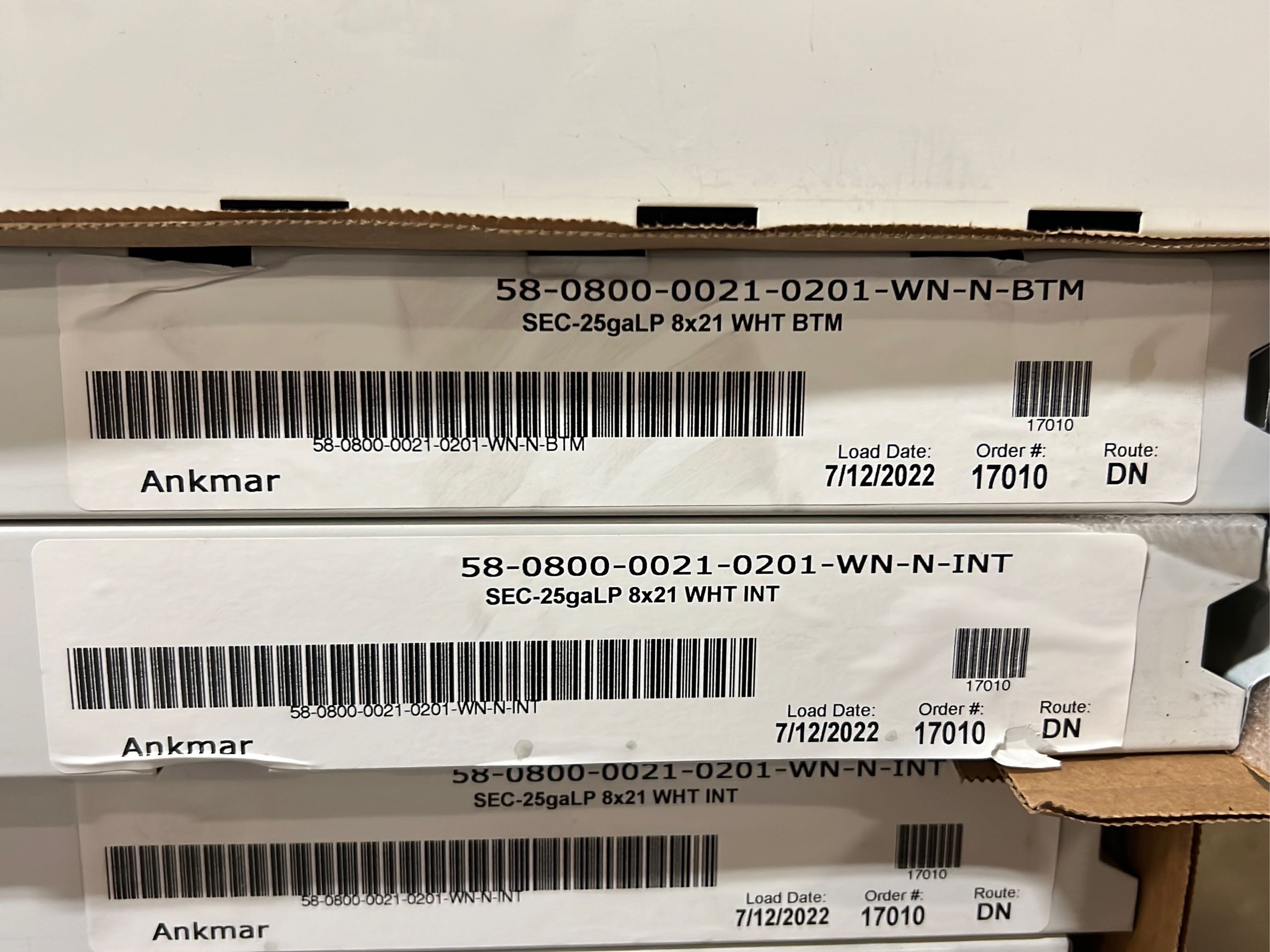 21 Garage Door Panels - (2) 9’x24” White, (4) 8’x21” White, (4) 8’x21” White, (2) 9’x21” White, (4) 8’x21” White, (8) 9’x21” White