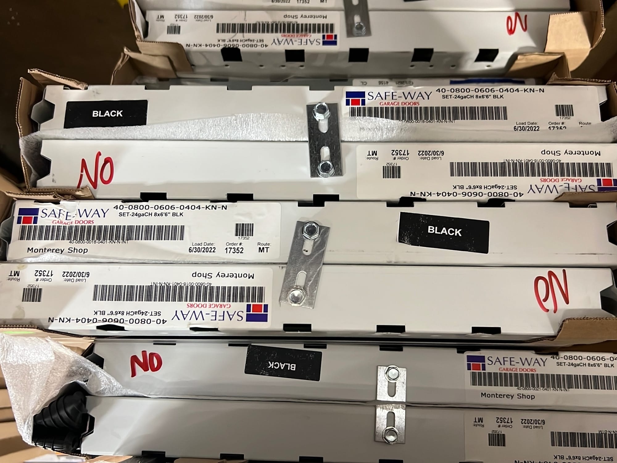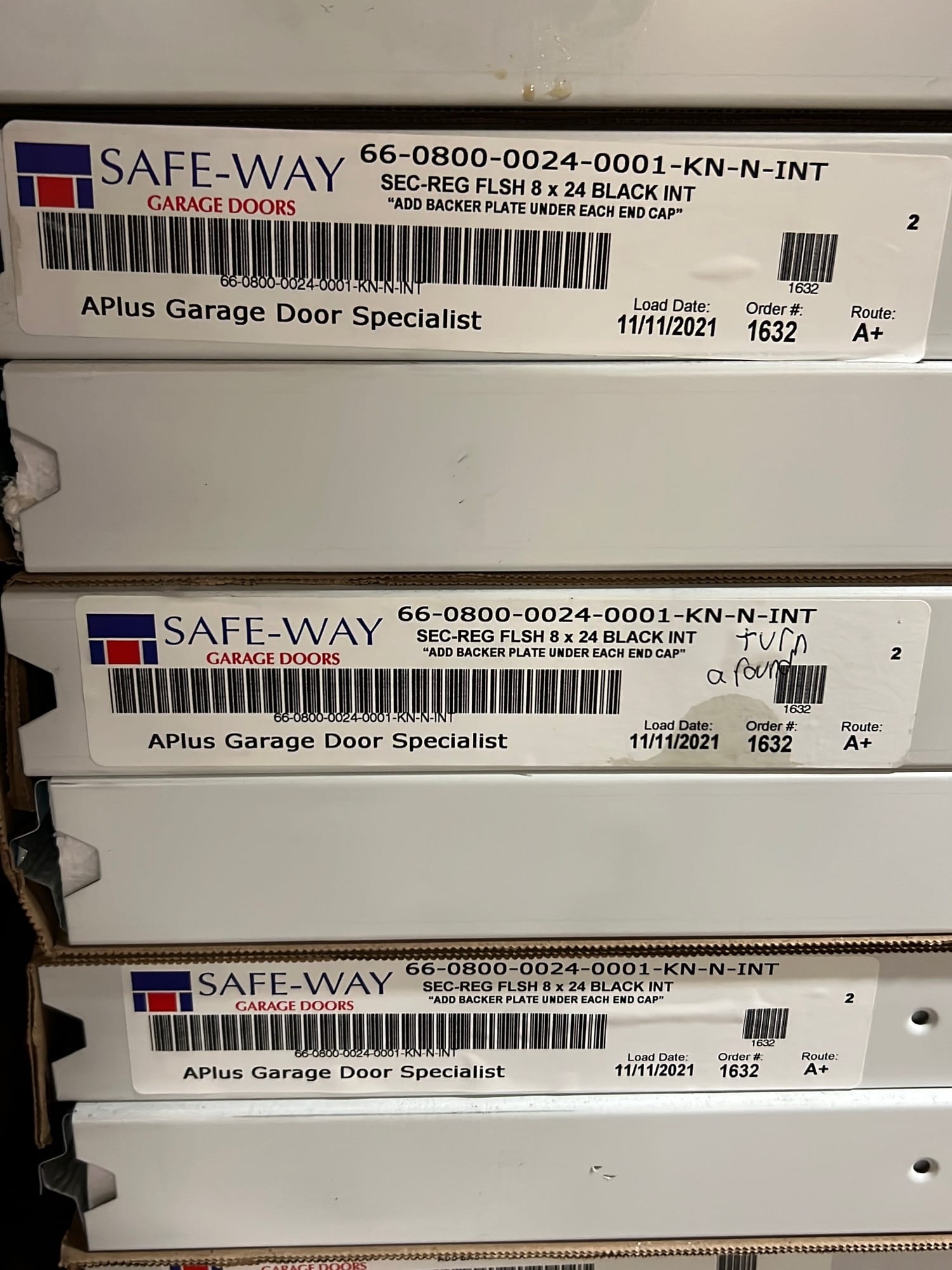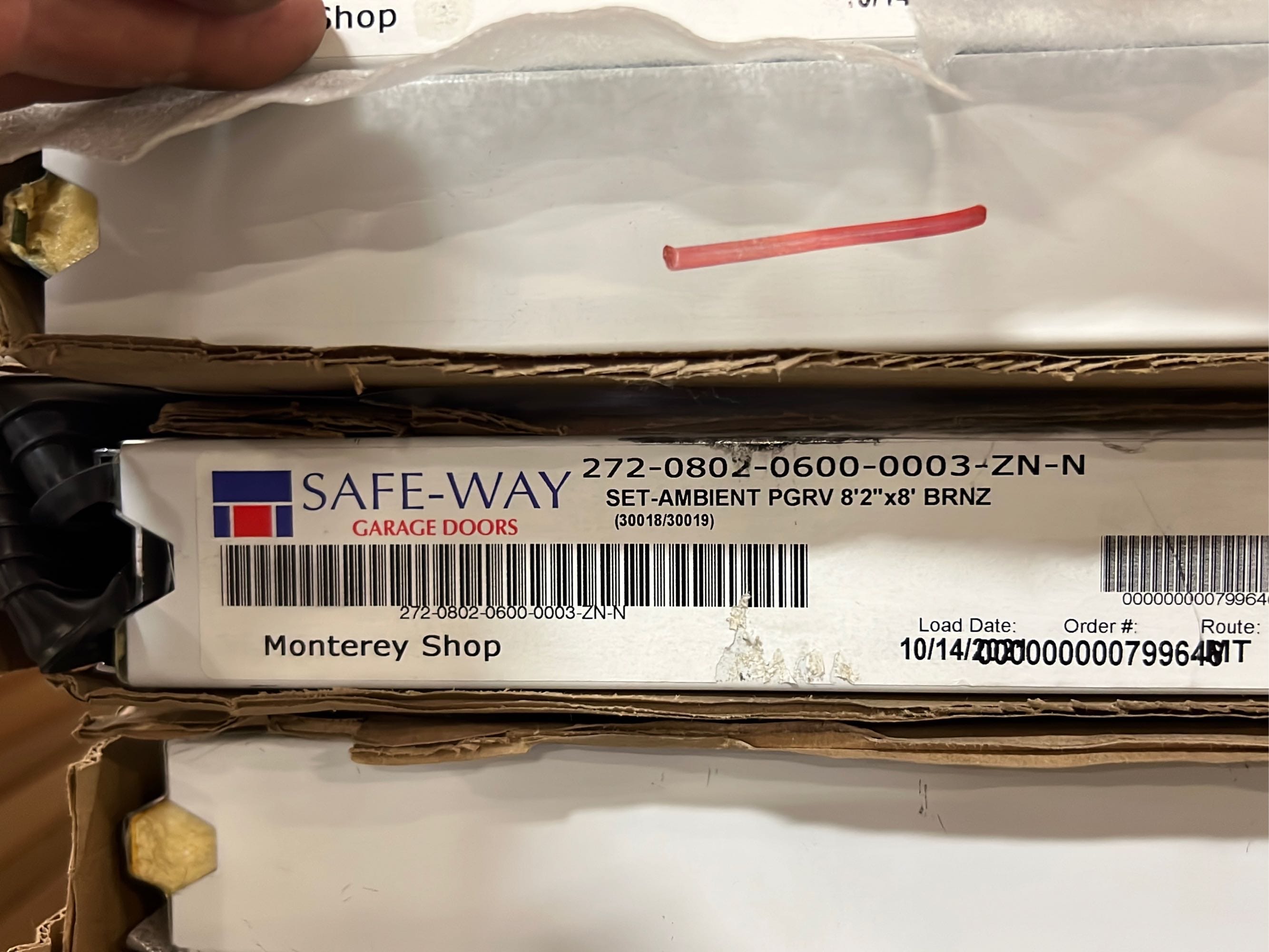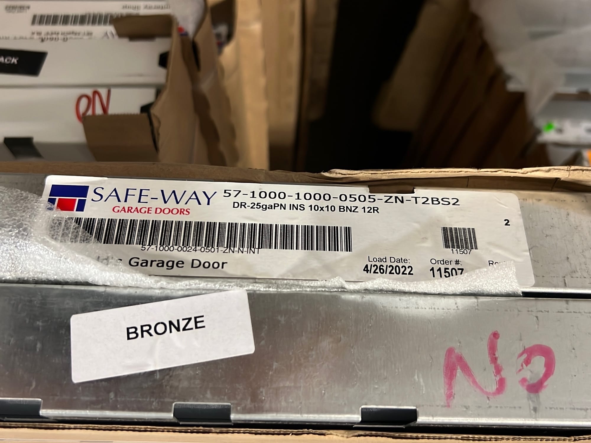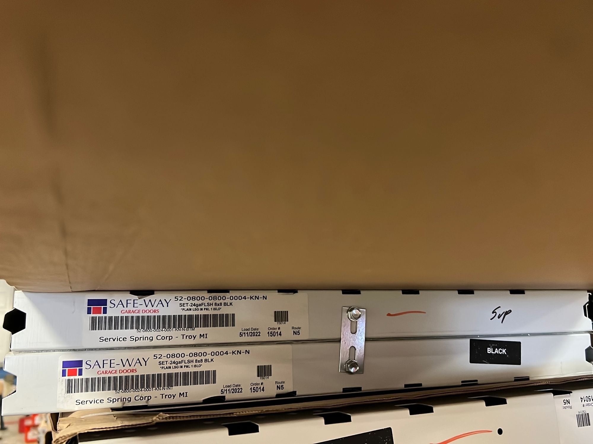12 Garage Door Panels - (12) 8’6”x21” Black, (2) 10’x24” Bronze, (2) 7’x18” White, (2) 8’x21” Black, (2) 8’2”x24” White