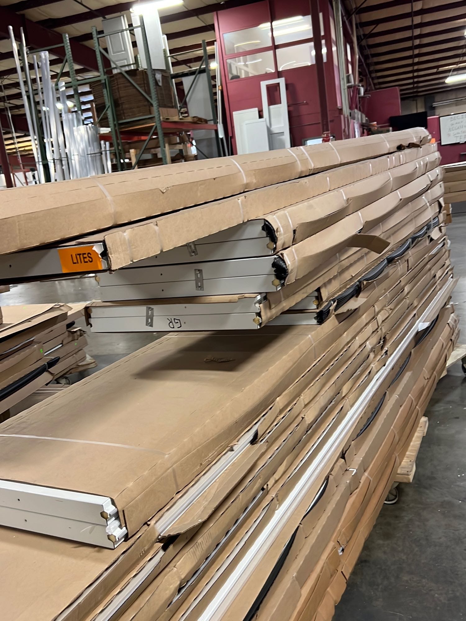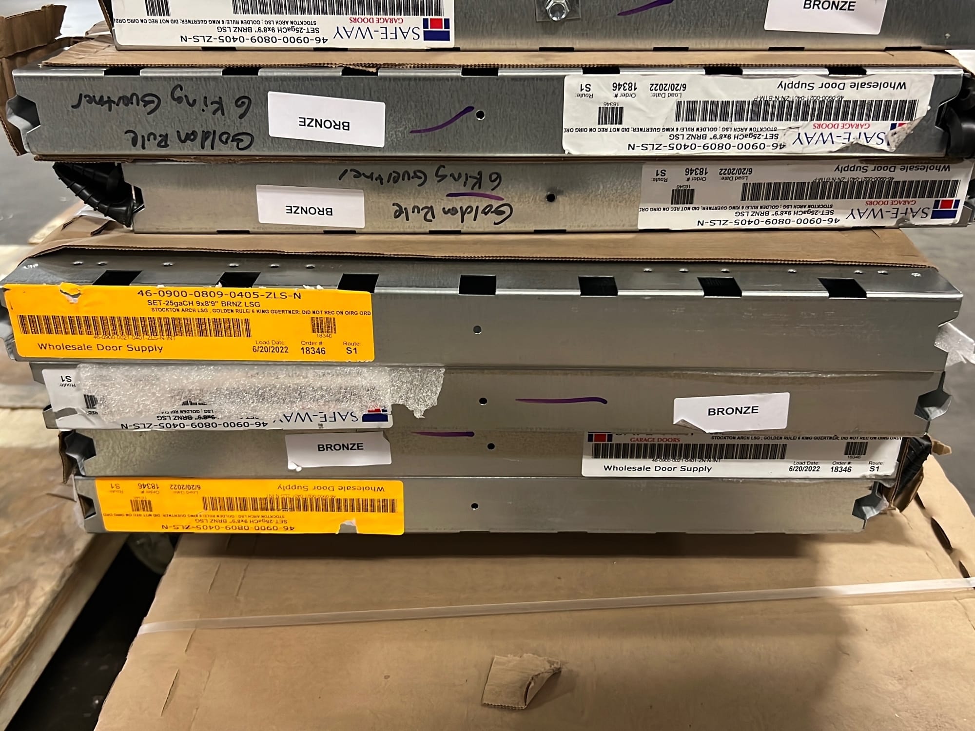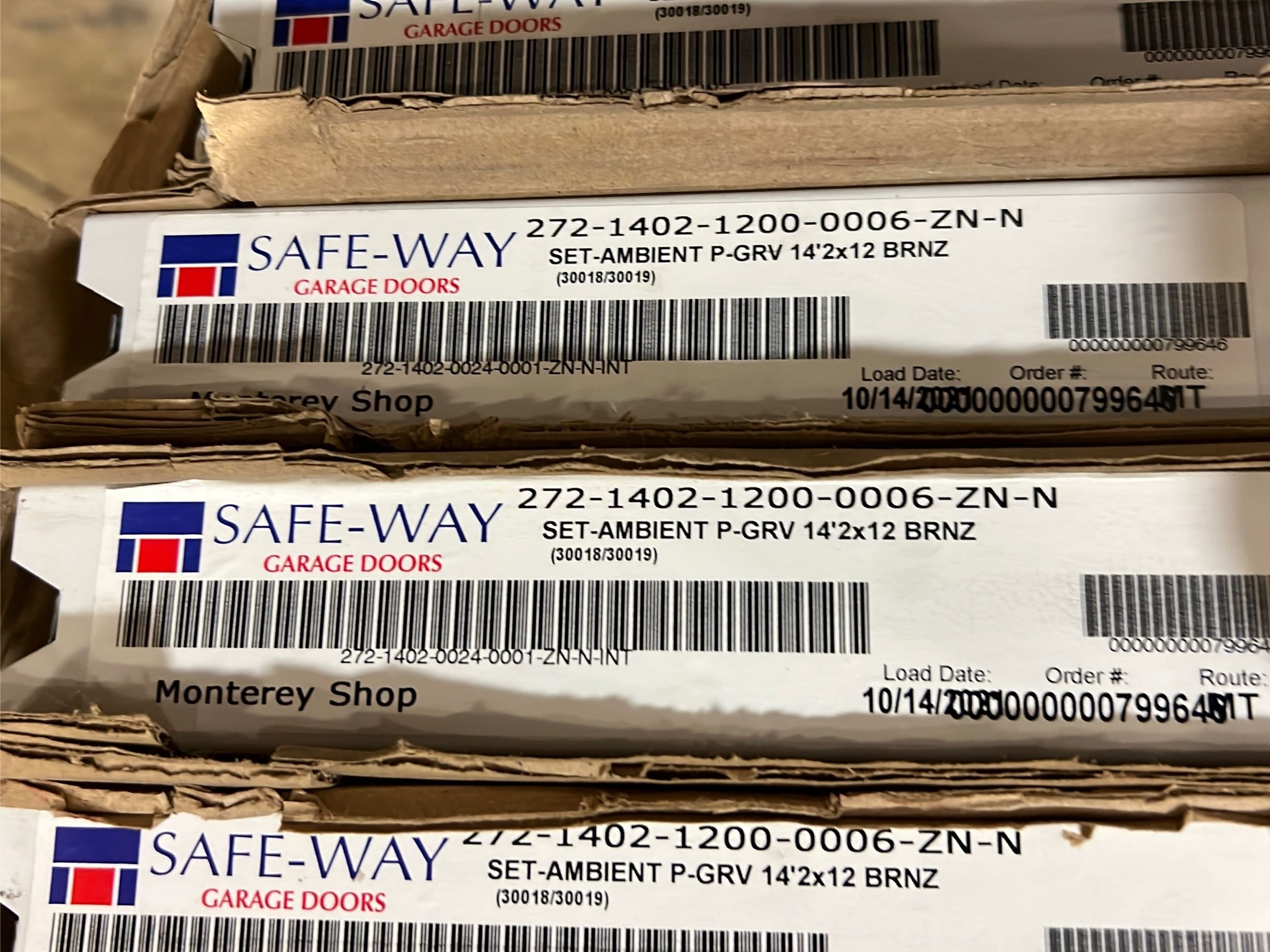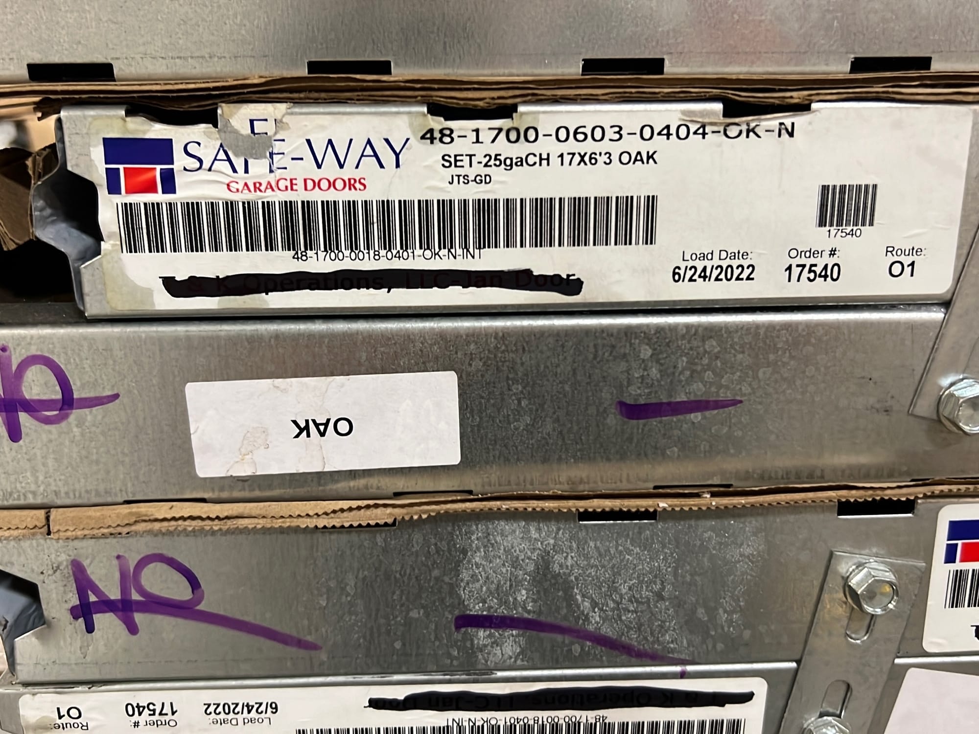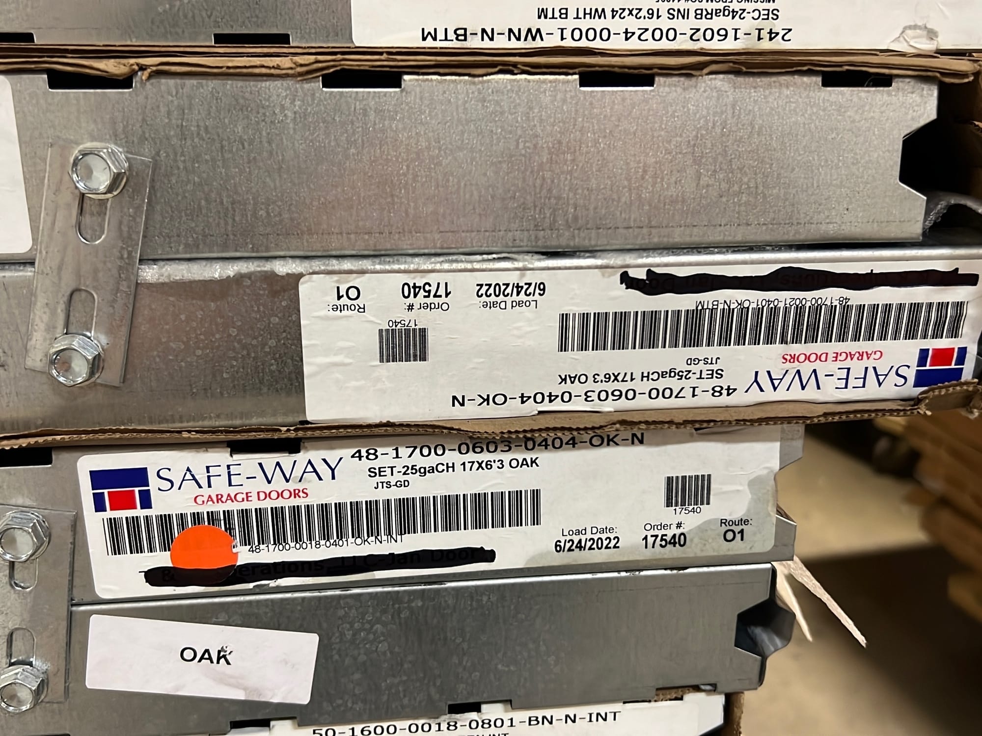 14 Garage Door Panels - (1) 10’x24” Oak, (1) 9’x24” Bronze, (1) 10’x18” White, (2) 6’x21” White, (2) 6’x24” White, (24) 8’x24” Black, (2) 4’x24” Black