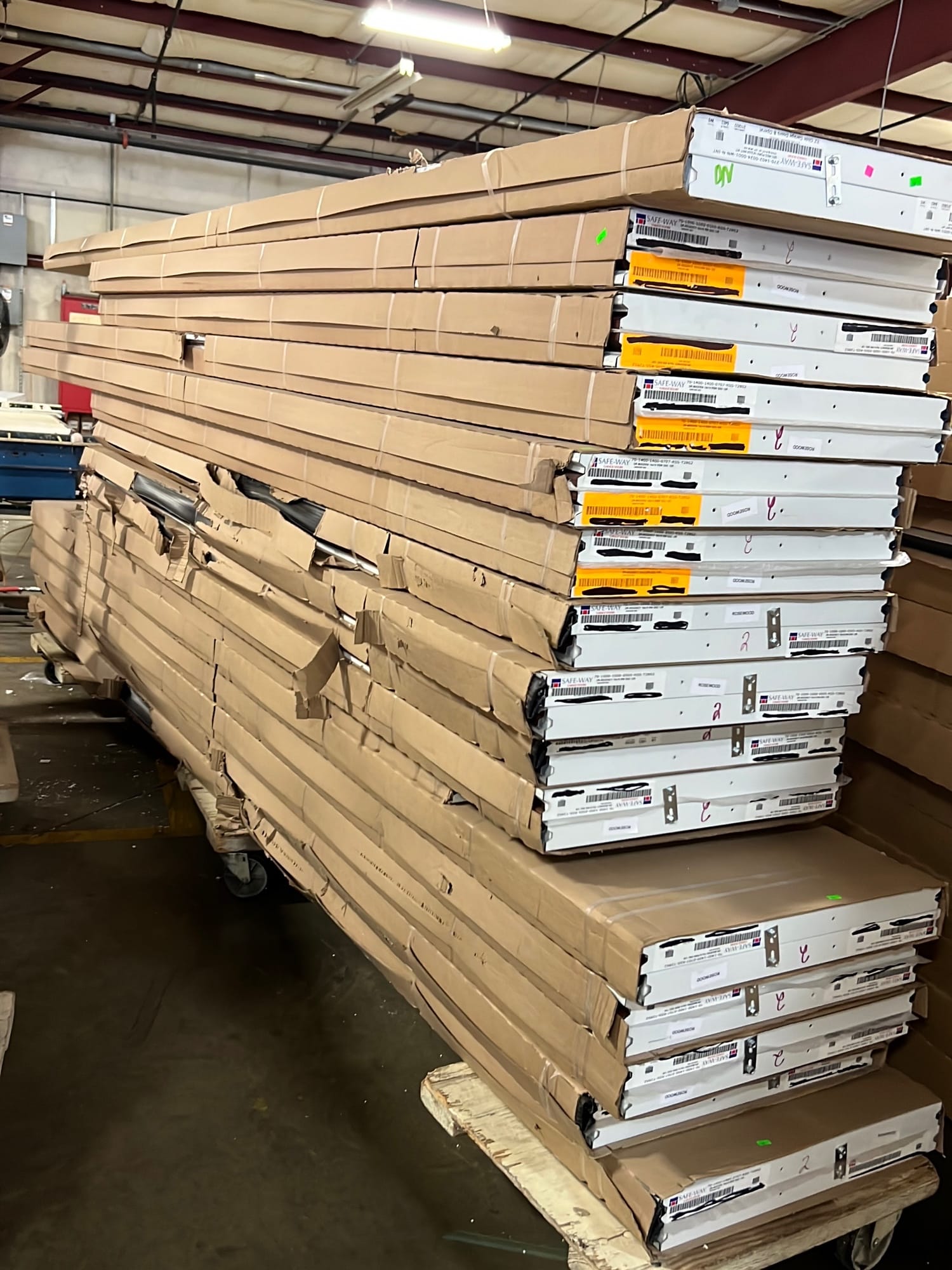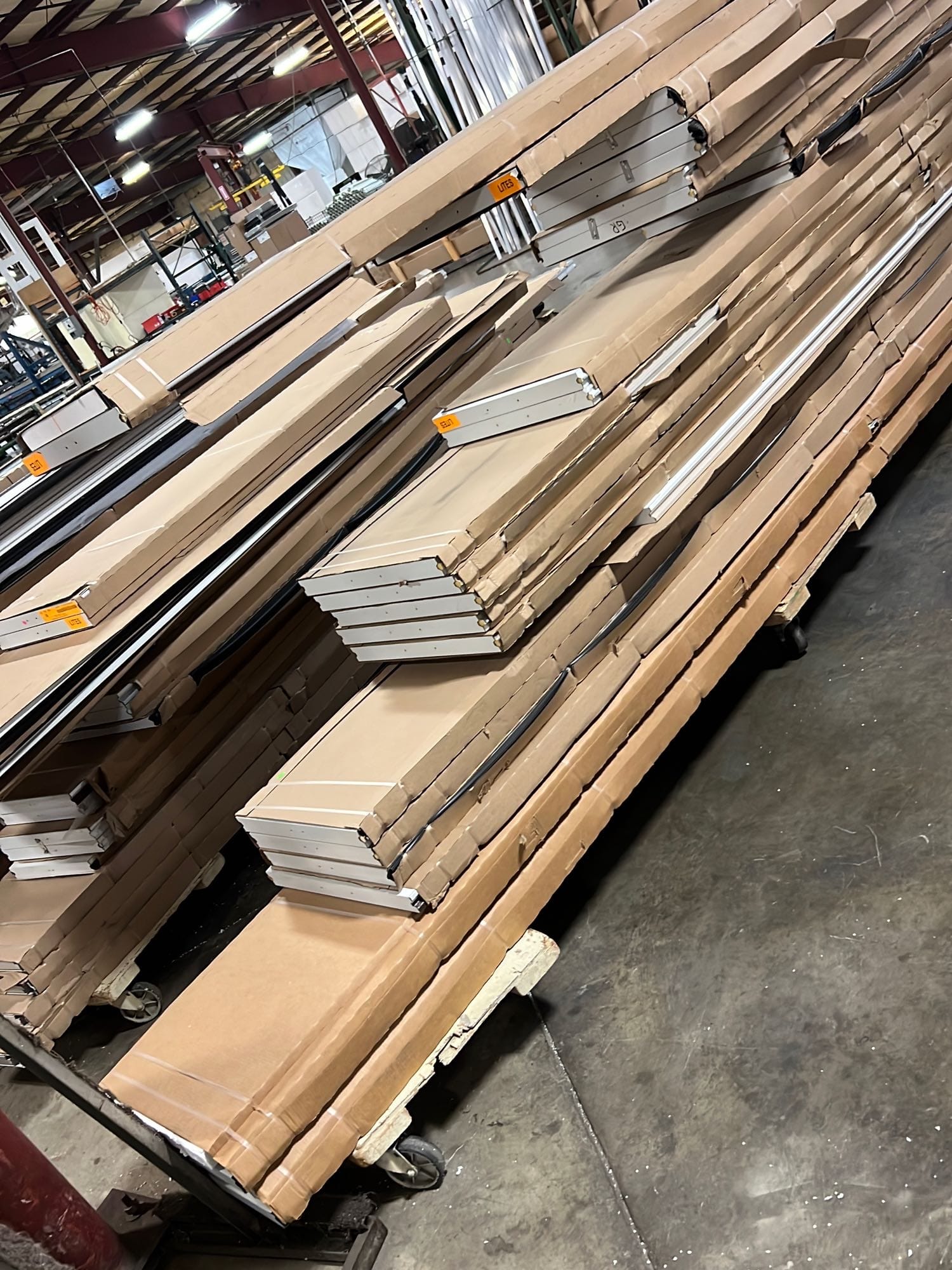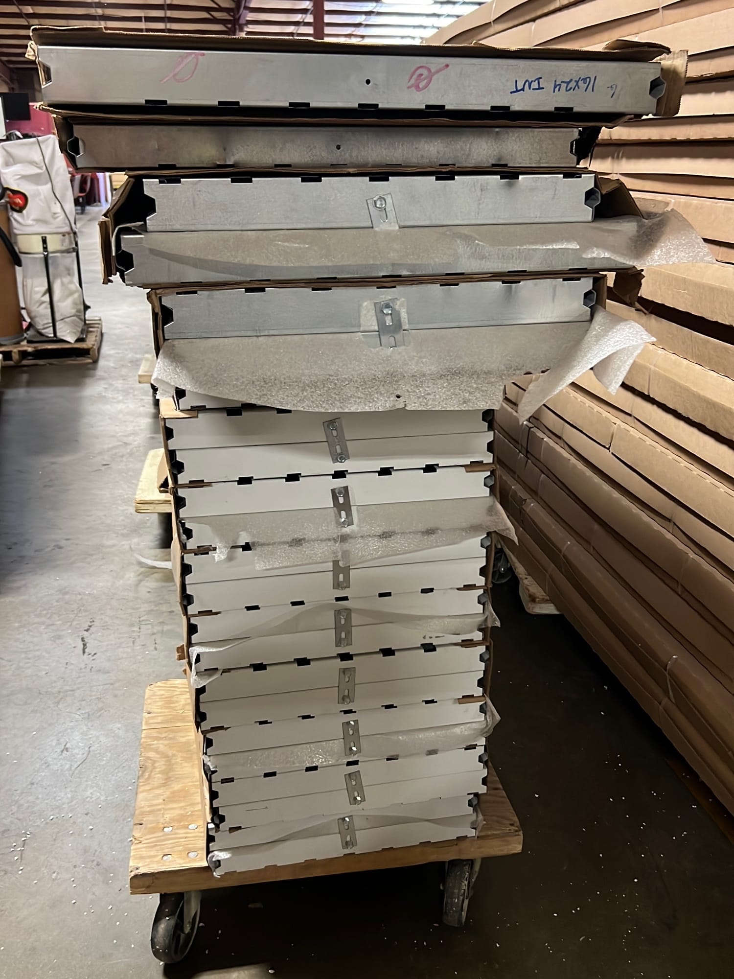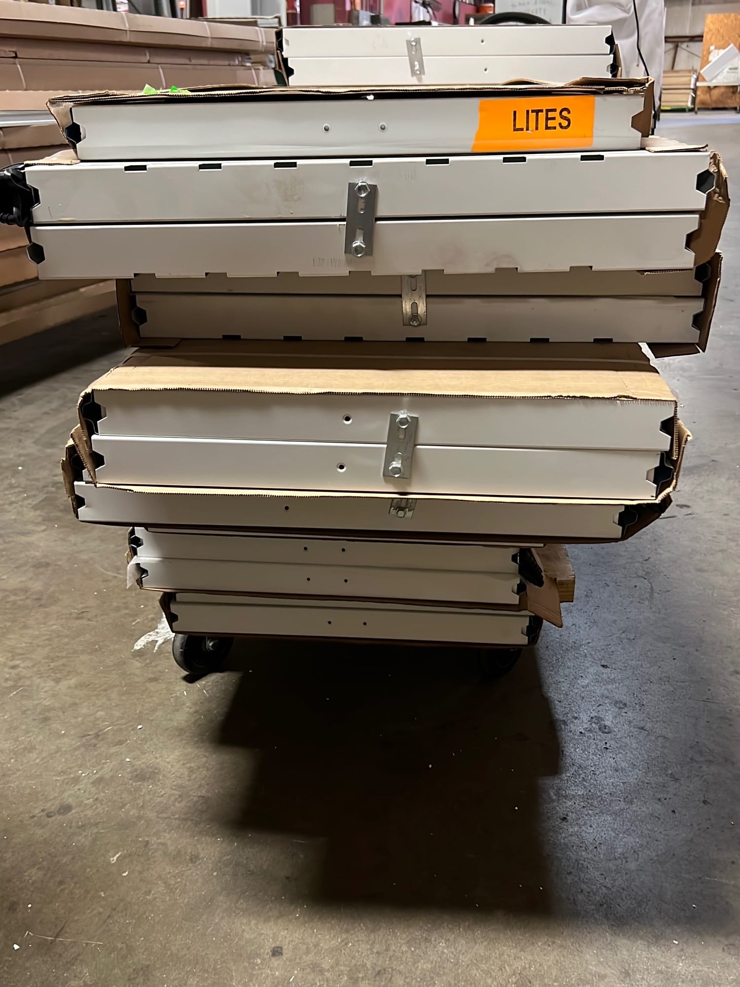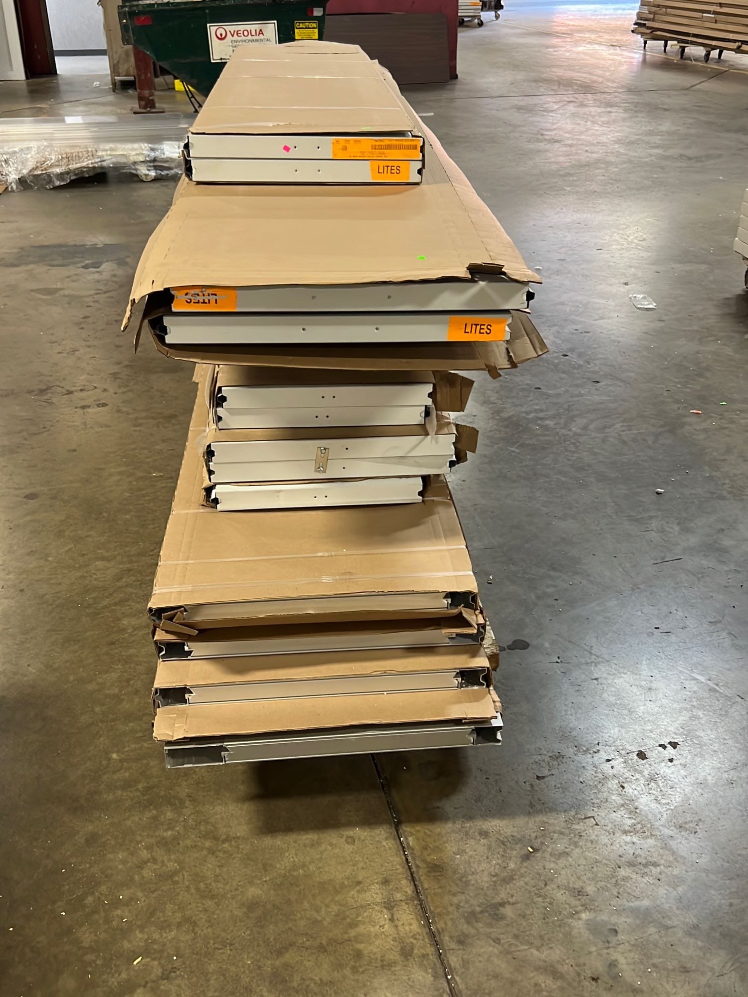 14 Garage Door Panels - (1) 10’x24” Oak, (1) 9’x24” Bronze, (1) 10’x18” White, (2) 6’x21” White, (2) 6’x24” White, (24) 8’x24” Black, (2) 4’x24” Black
