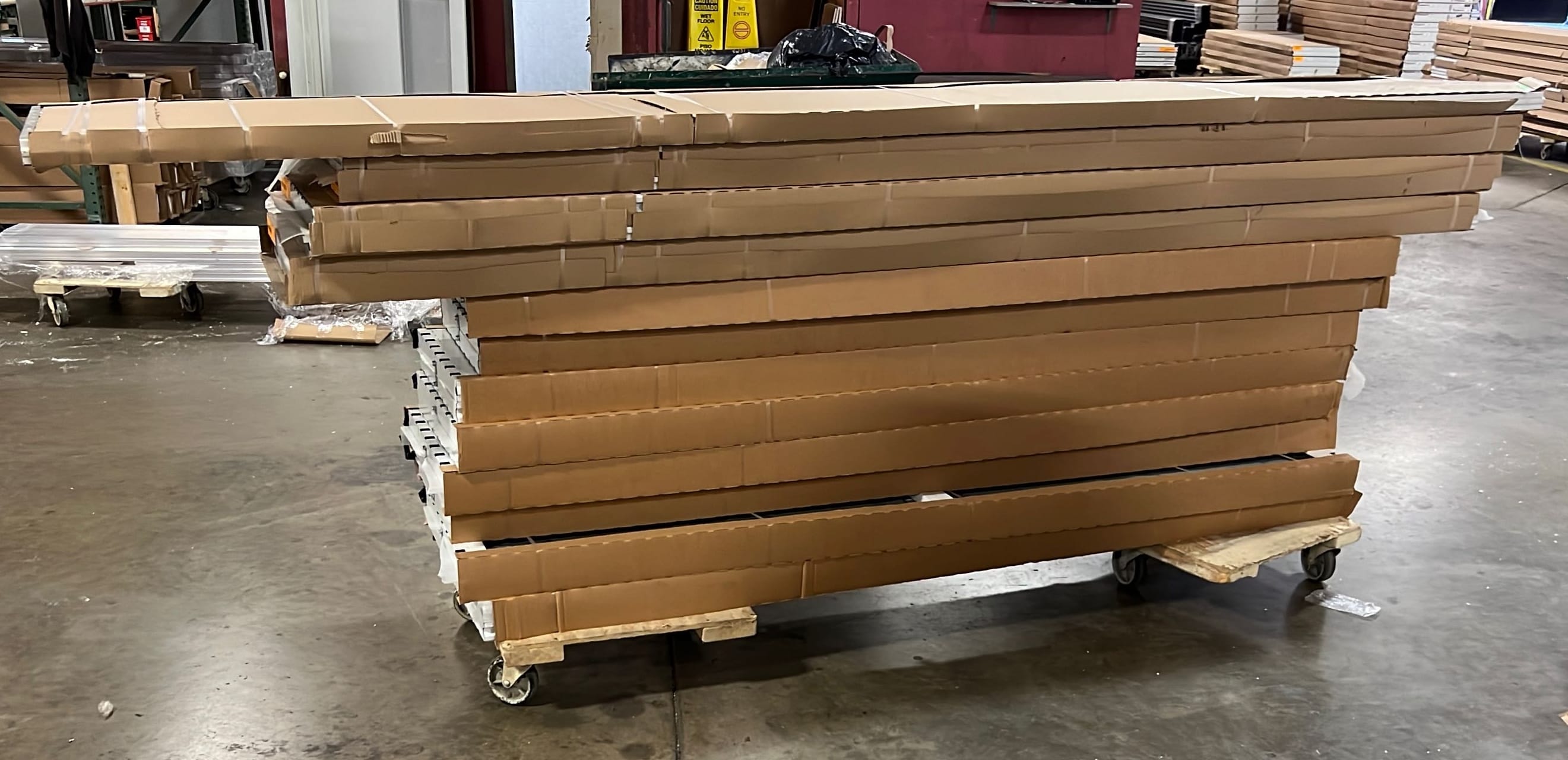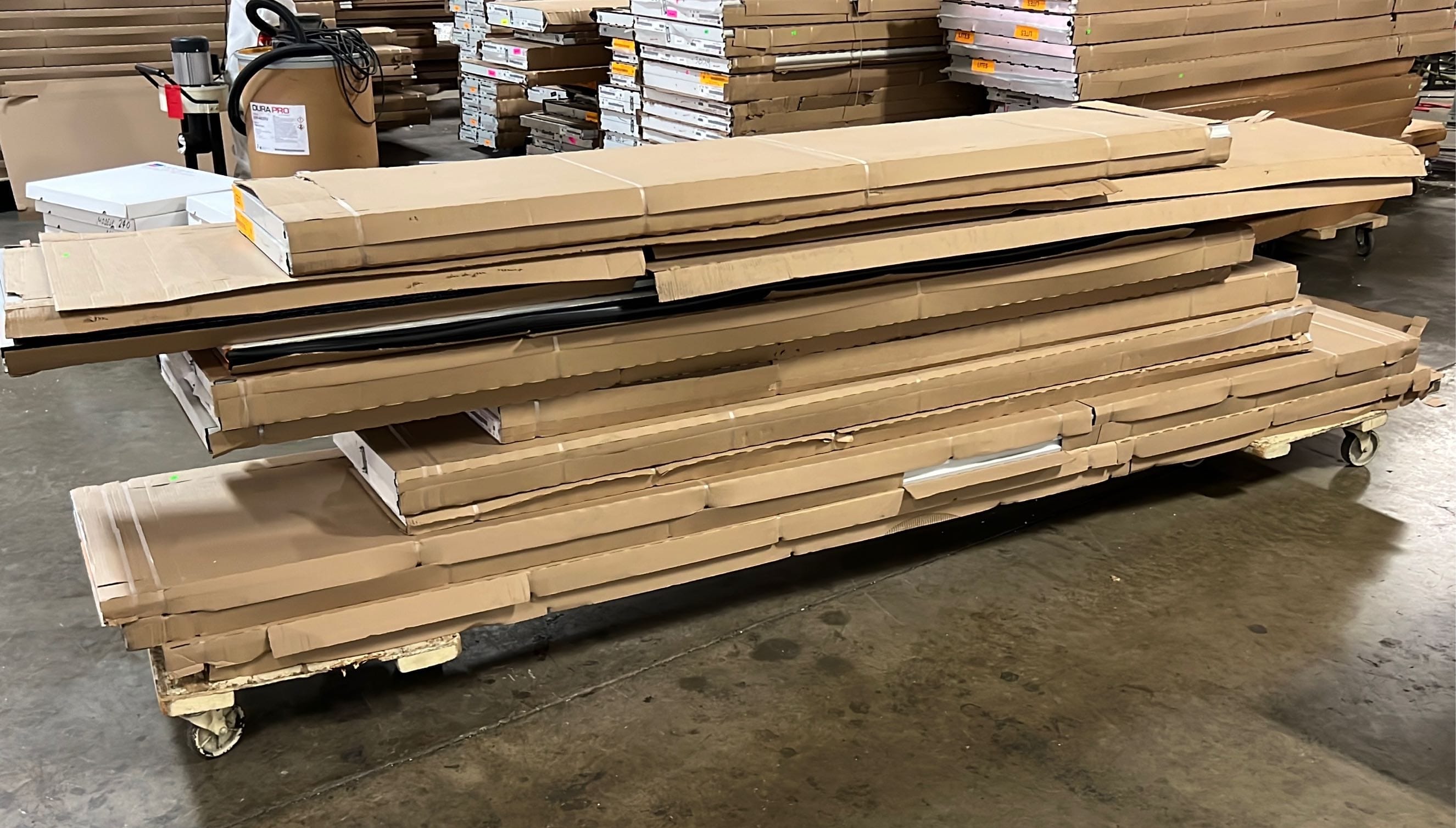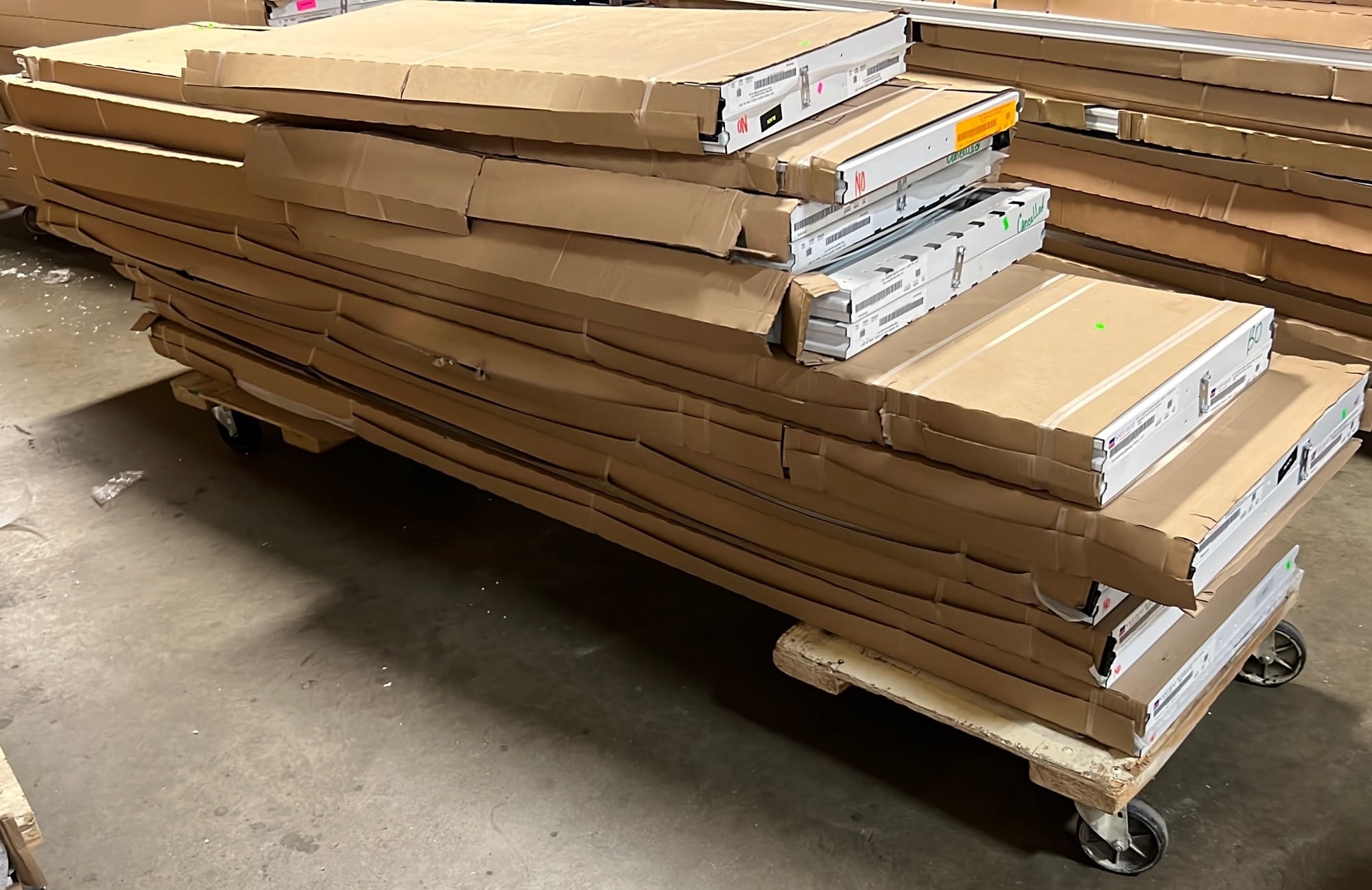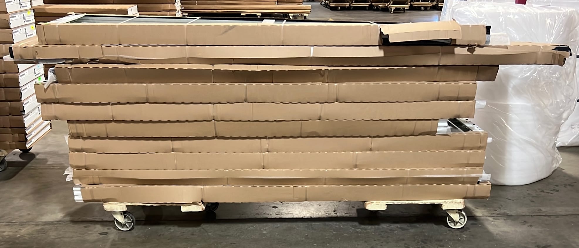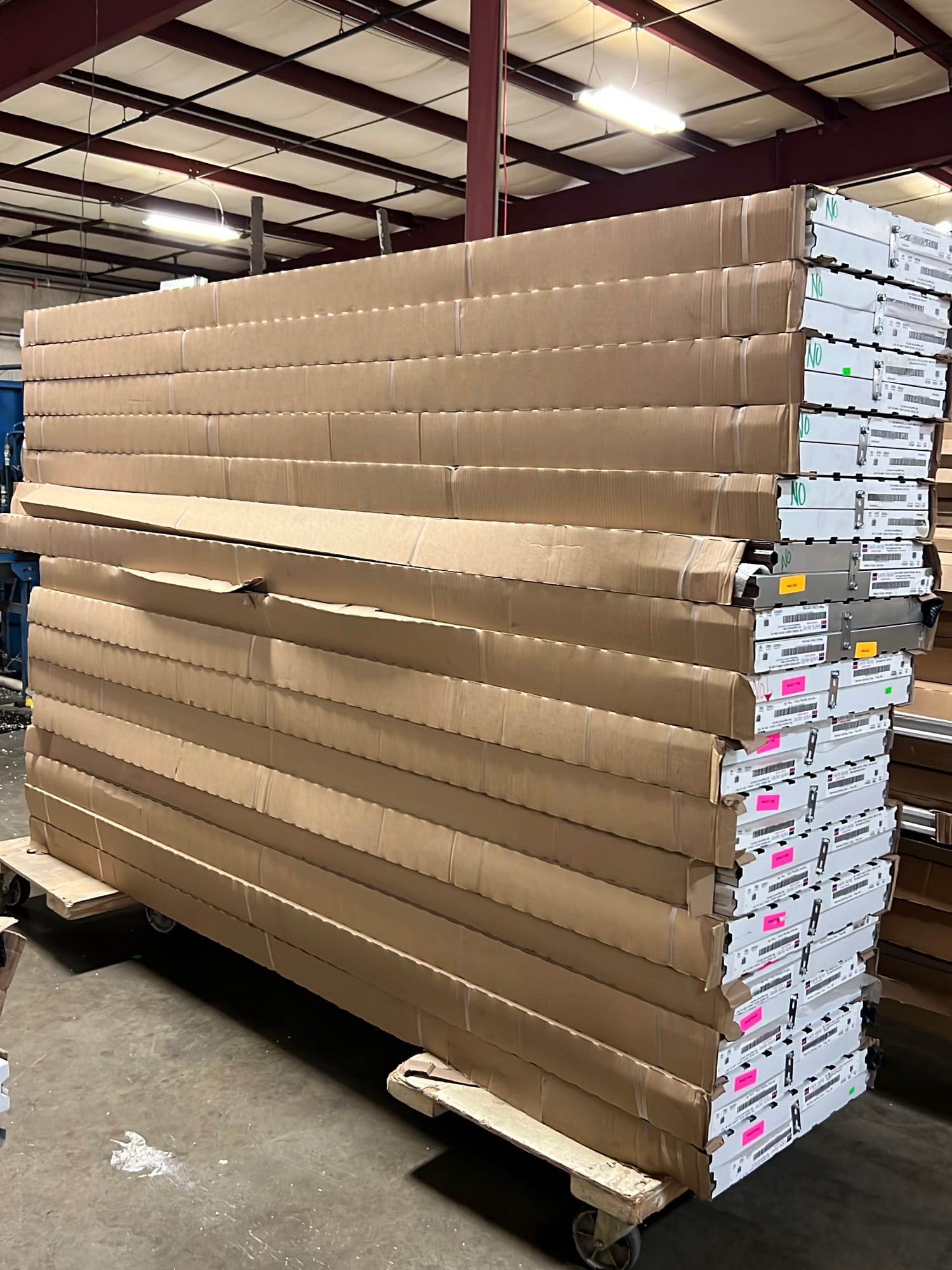 14 Garage Door Panels - (1) 10’x24” Oak, (1) 9’x24” Bronze, (1) 10’x18” White, (2) 6’x21” White, (2) 6’x24” White, (24) 8’x24” Black, (2) 4’x24” Black