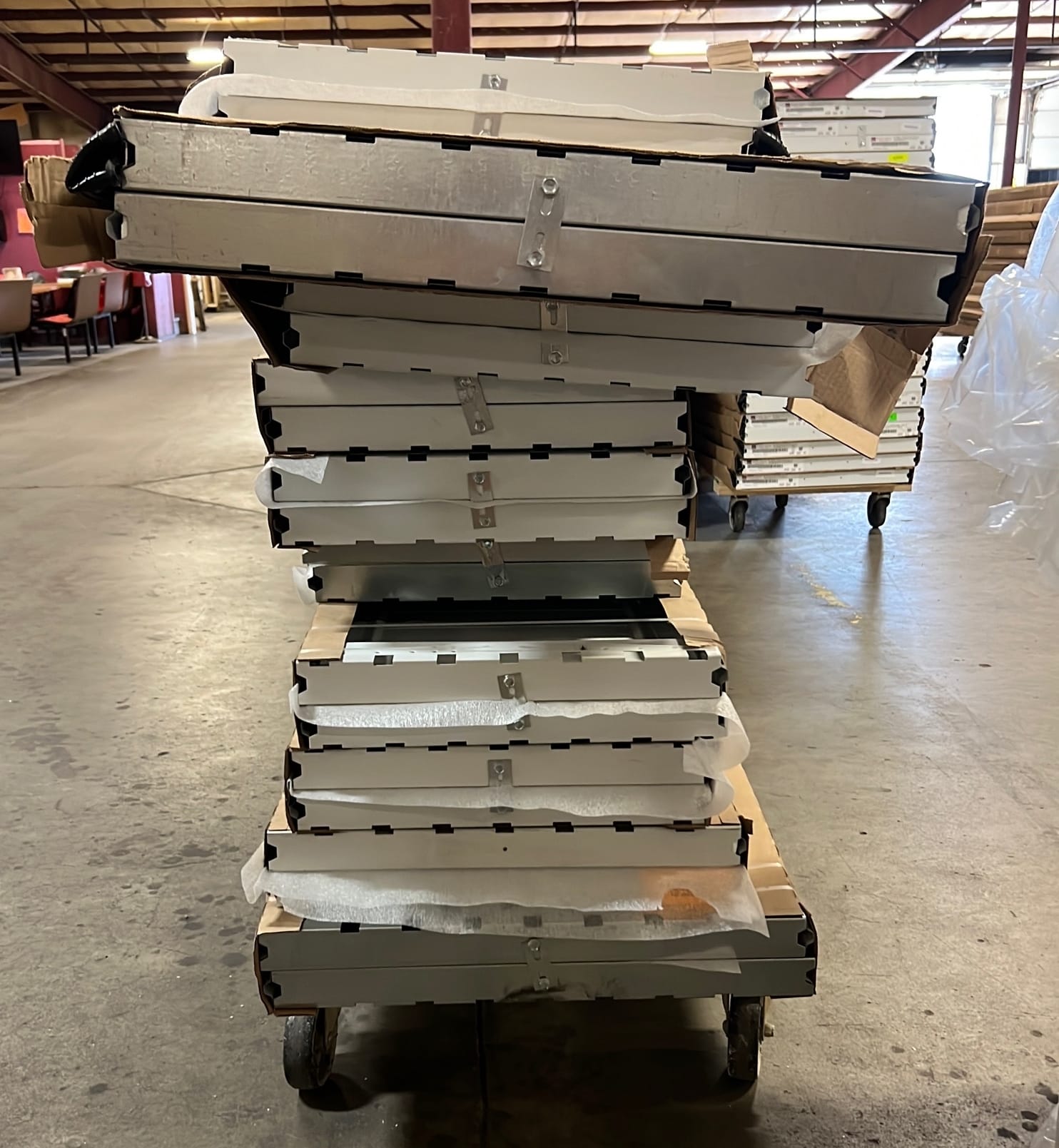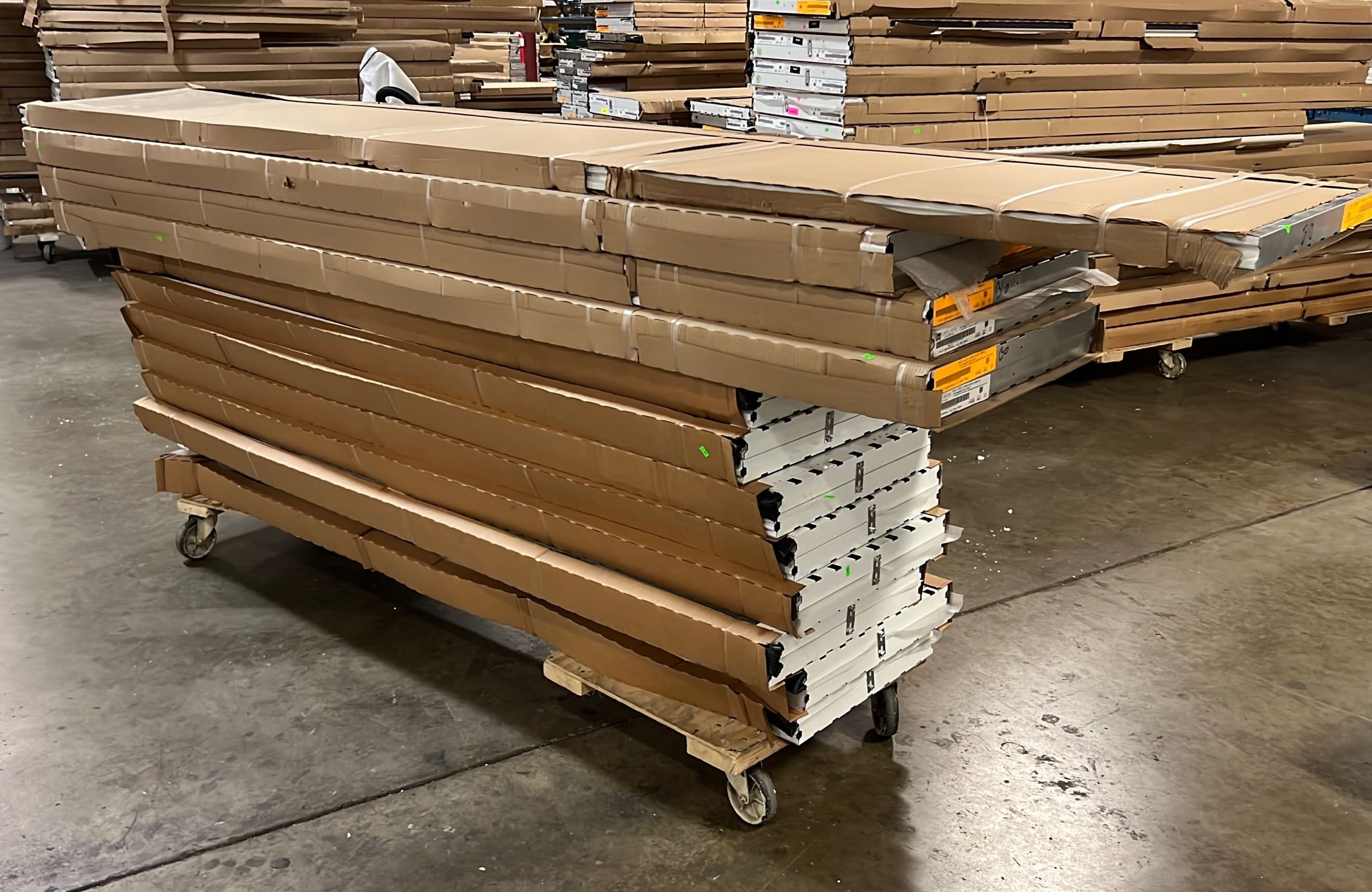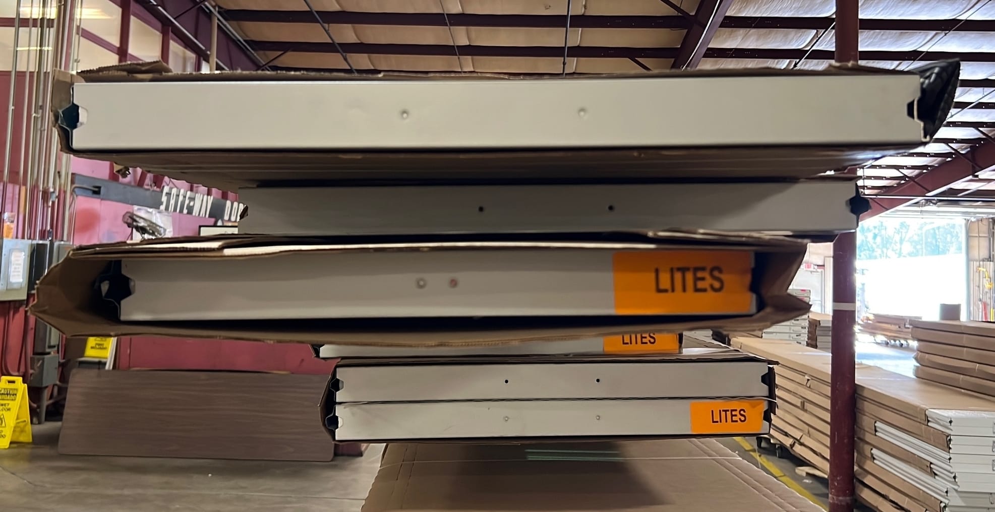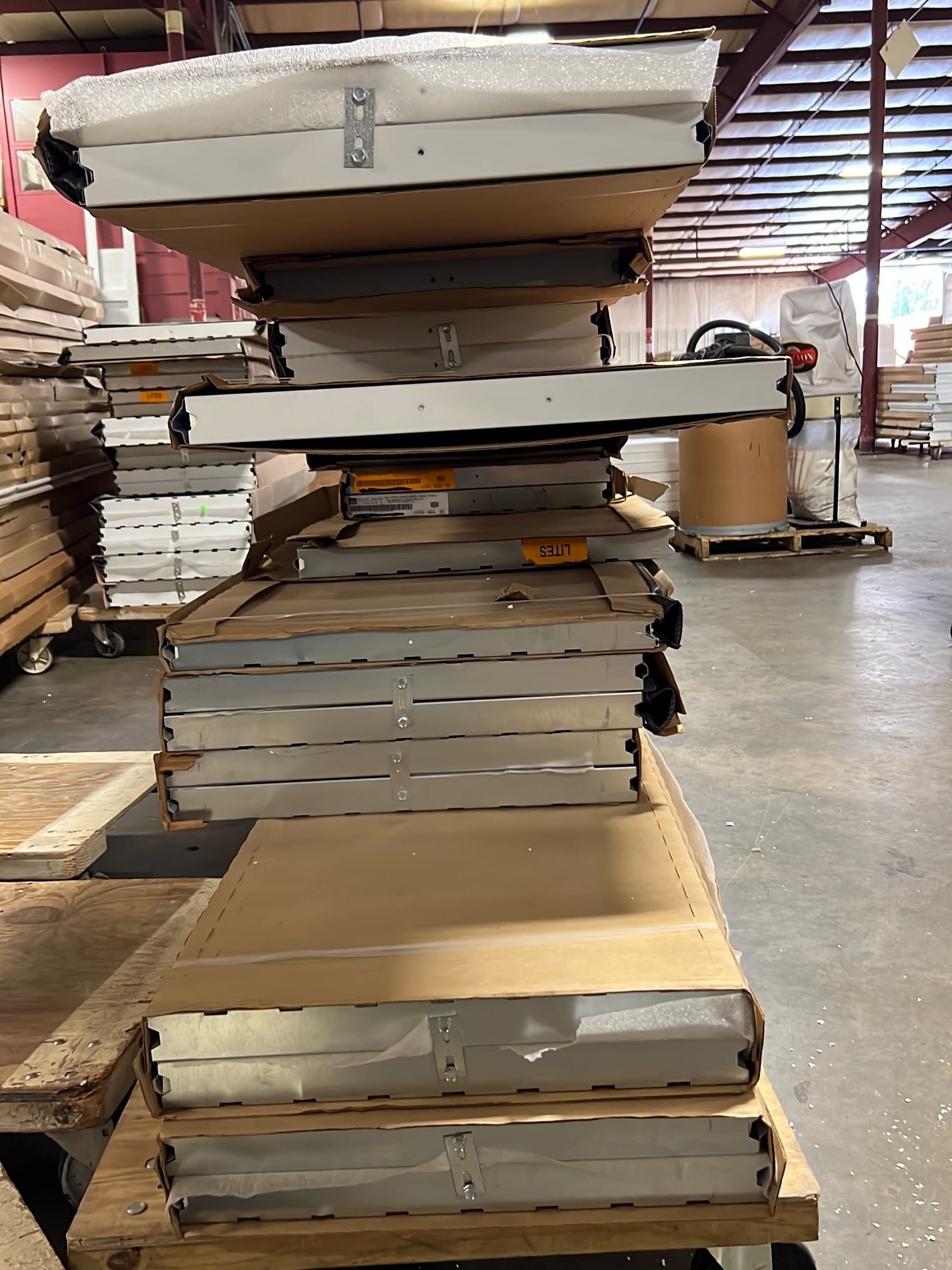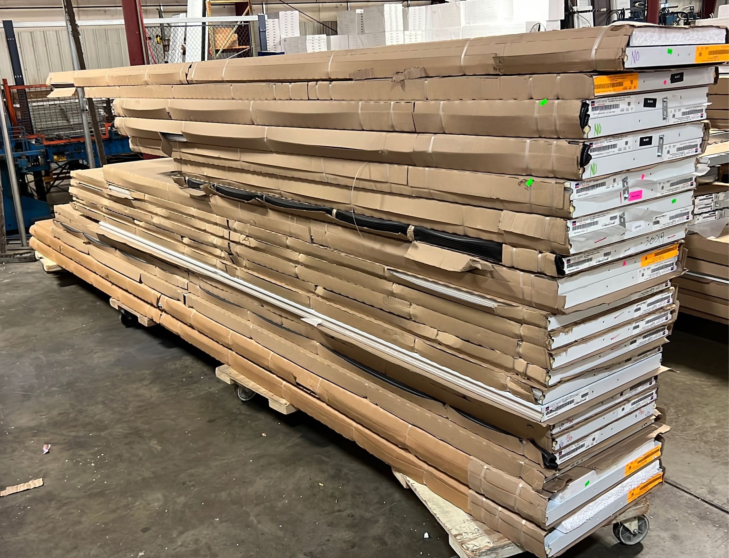 14 Garage Door Panels - (1) 10’x24” Oak, (1) 9’x24” Bronze, (1) 10’x18” White, (2) 6’x21” White, (2) 6’x24” White, (24) 8’x24” Black, (2) 4’x24” Black