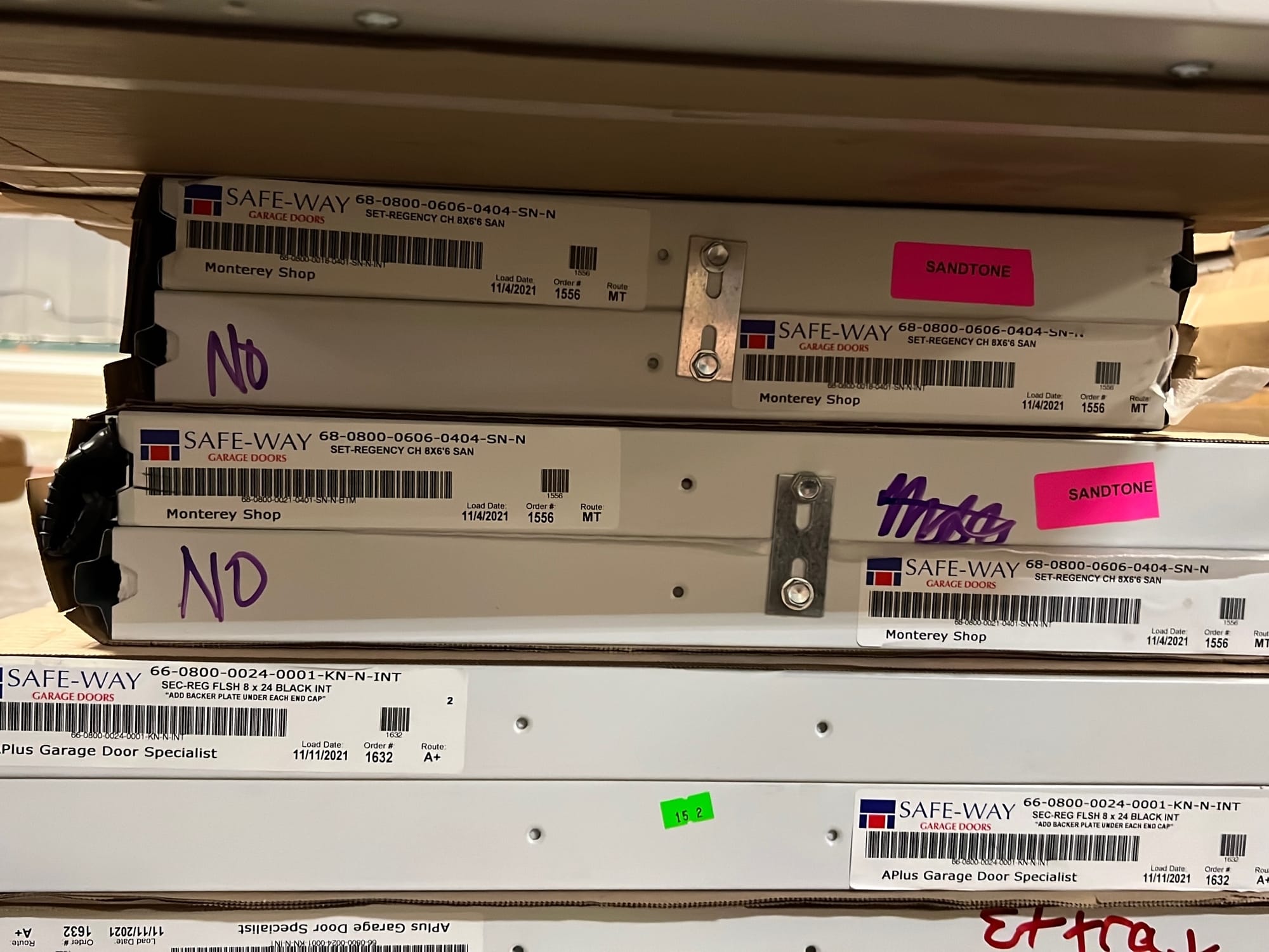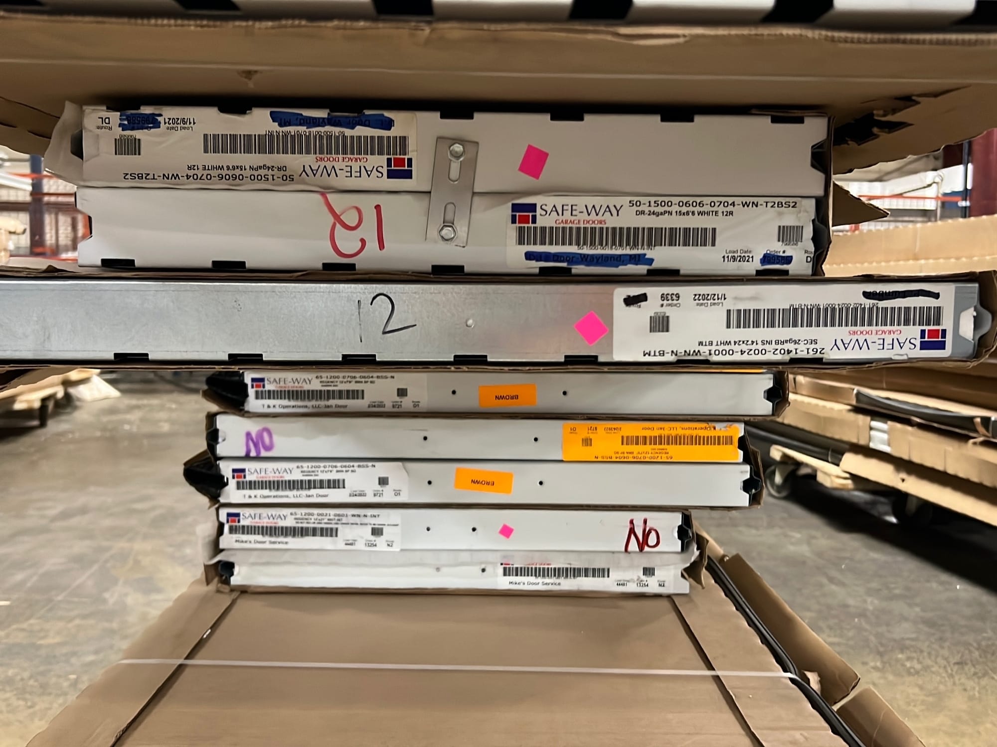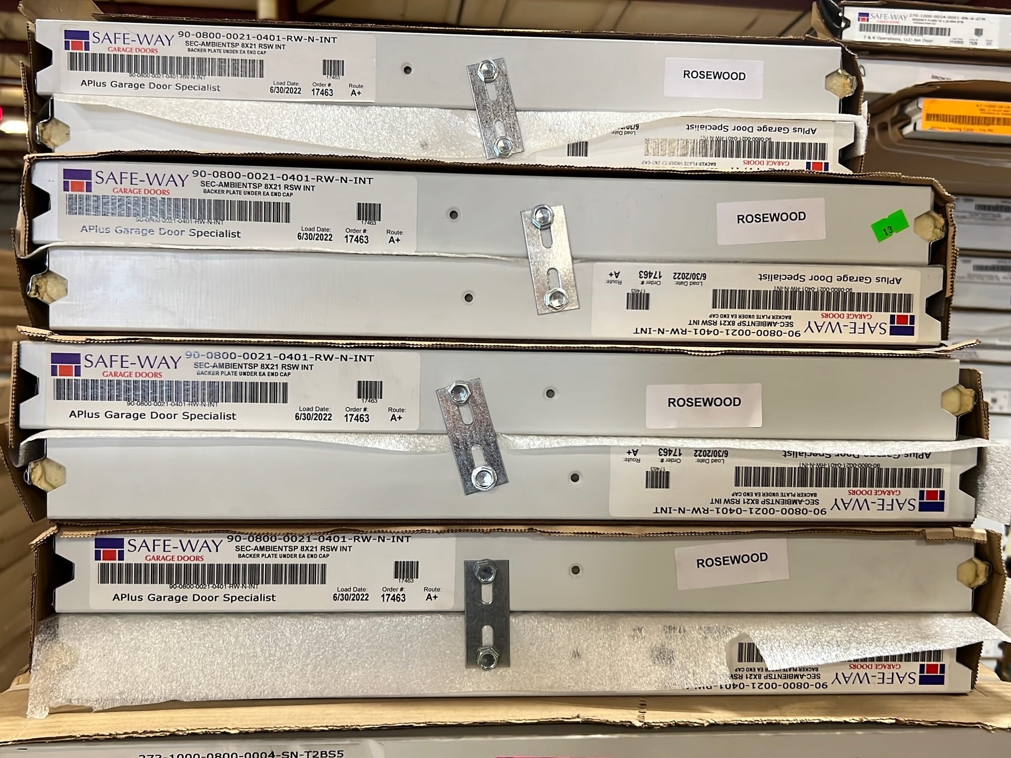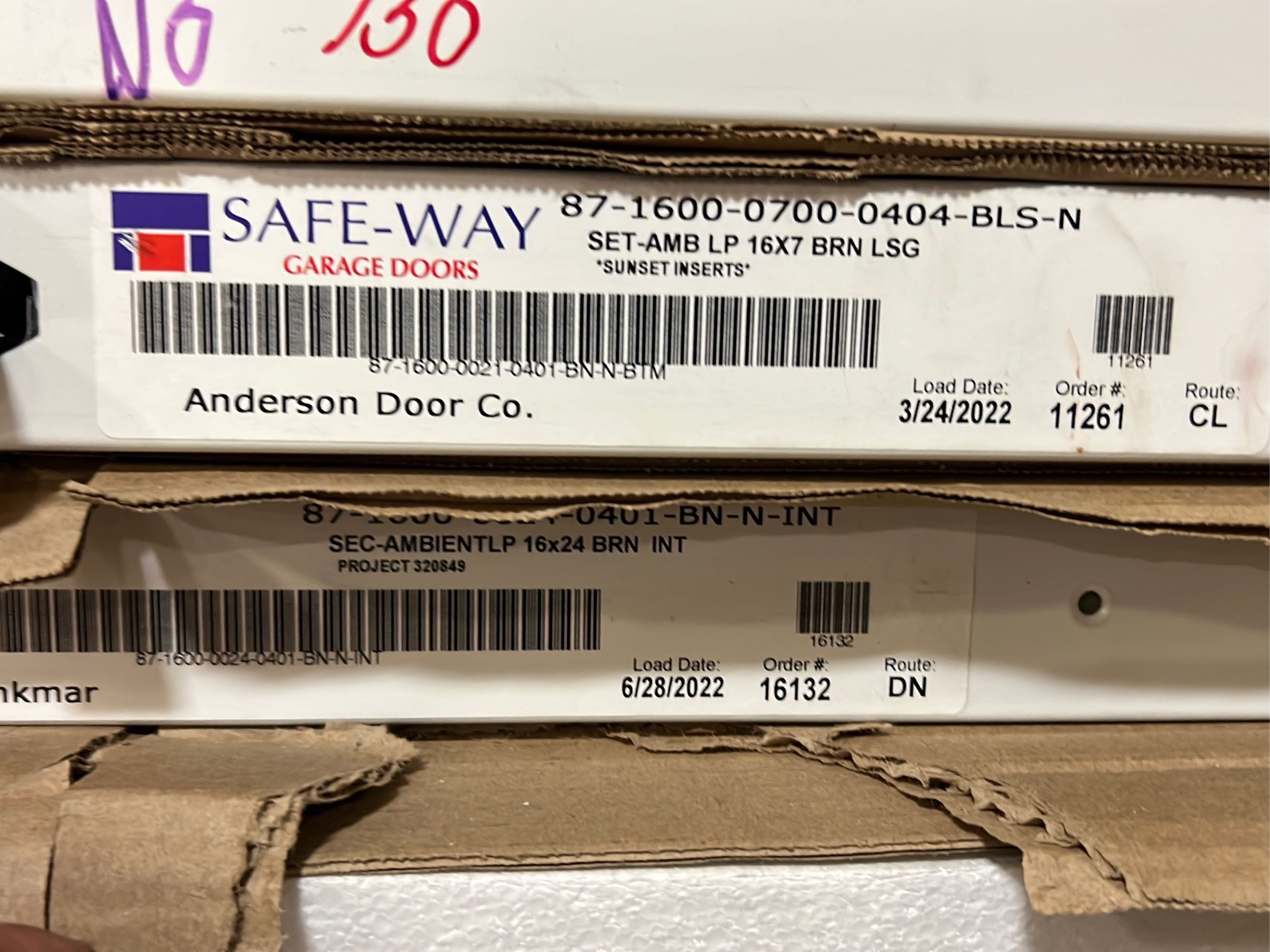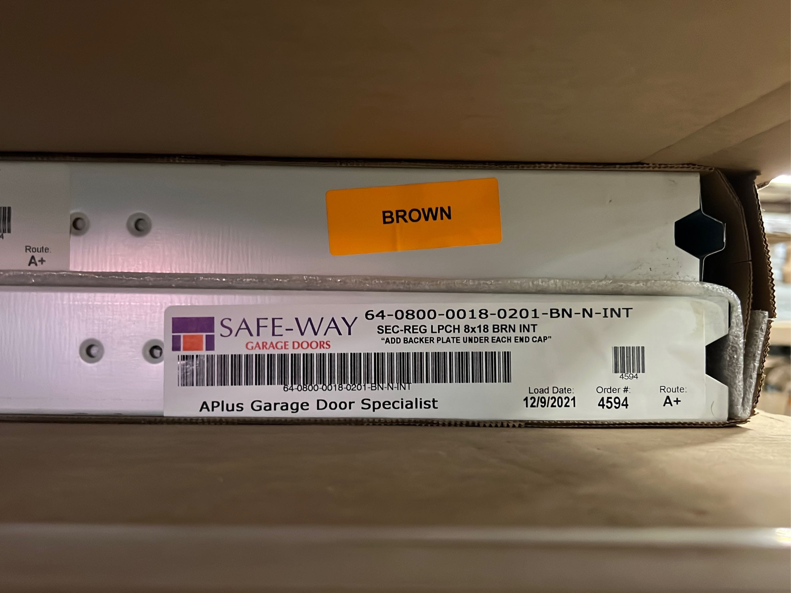 13 Garage Door Panels - (8) 8’x21” Rosewood, (2) 10’x24” Sandtone, (4) 8’2”x24” White, (4) 9’x24” White, (4) 12”x24” Black, (2) 10’x21” White, (4) 12’2”x24 Bronze