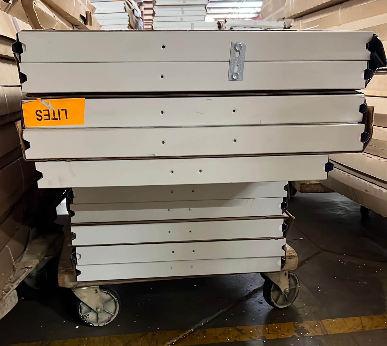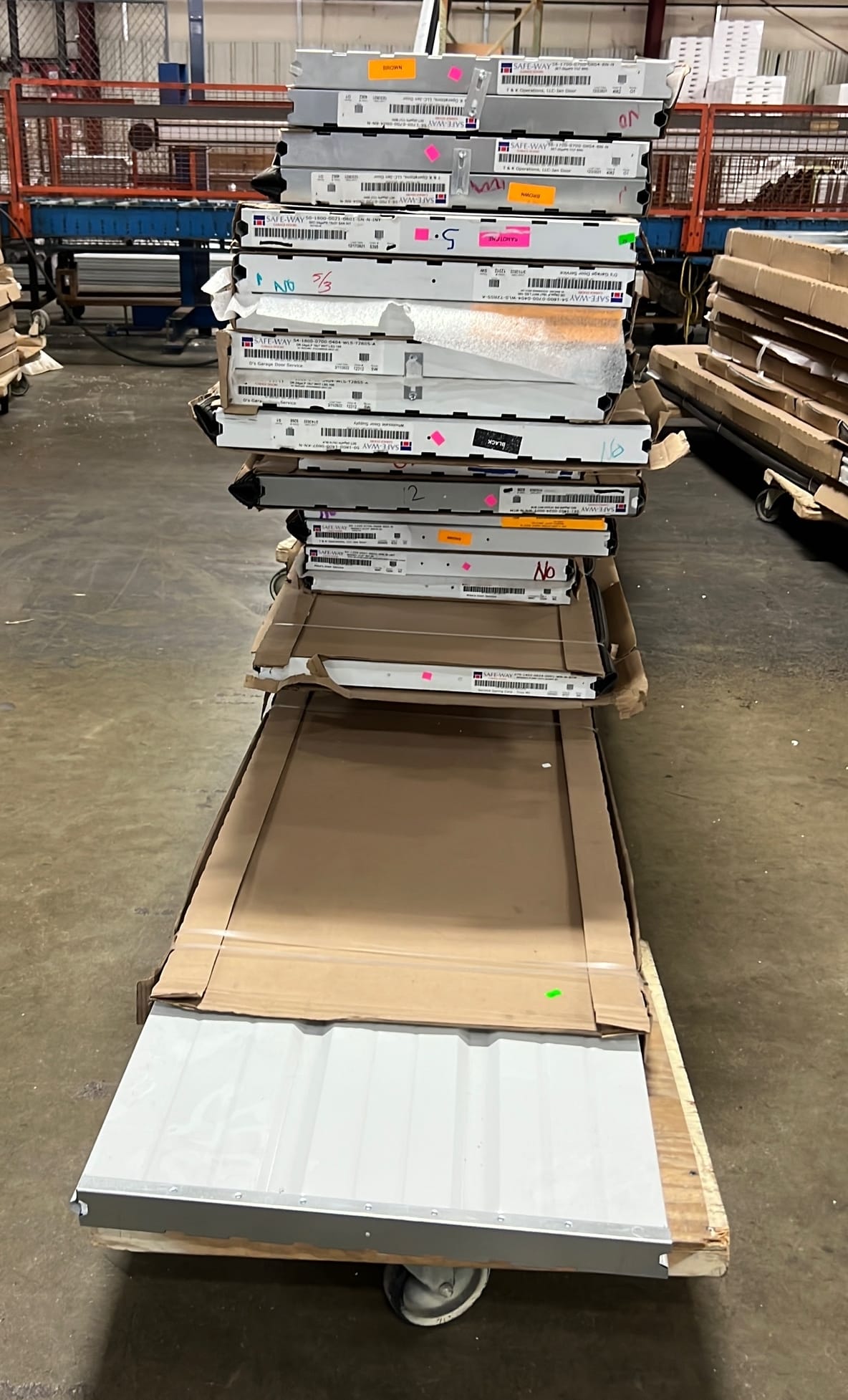 18 Garage Door Panels - (2) 4’x 24” Black, (1) 8’x21” White, (4) 8’x24” White, (2) 10’x21” White (2) 8’x24” Black, (6) 9’x21” Grey