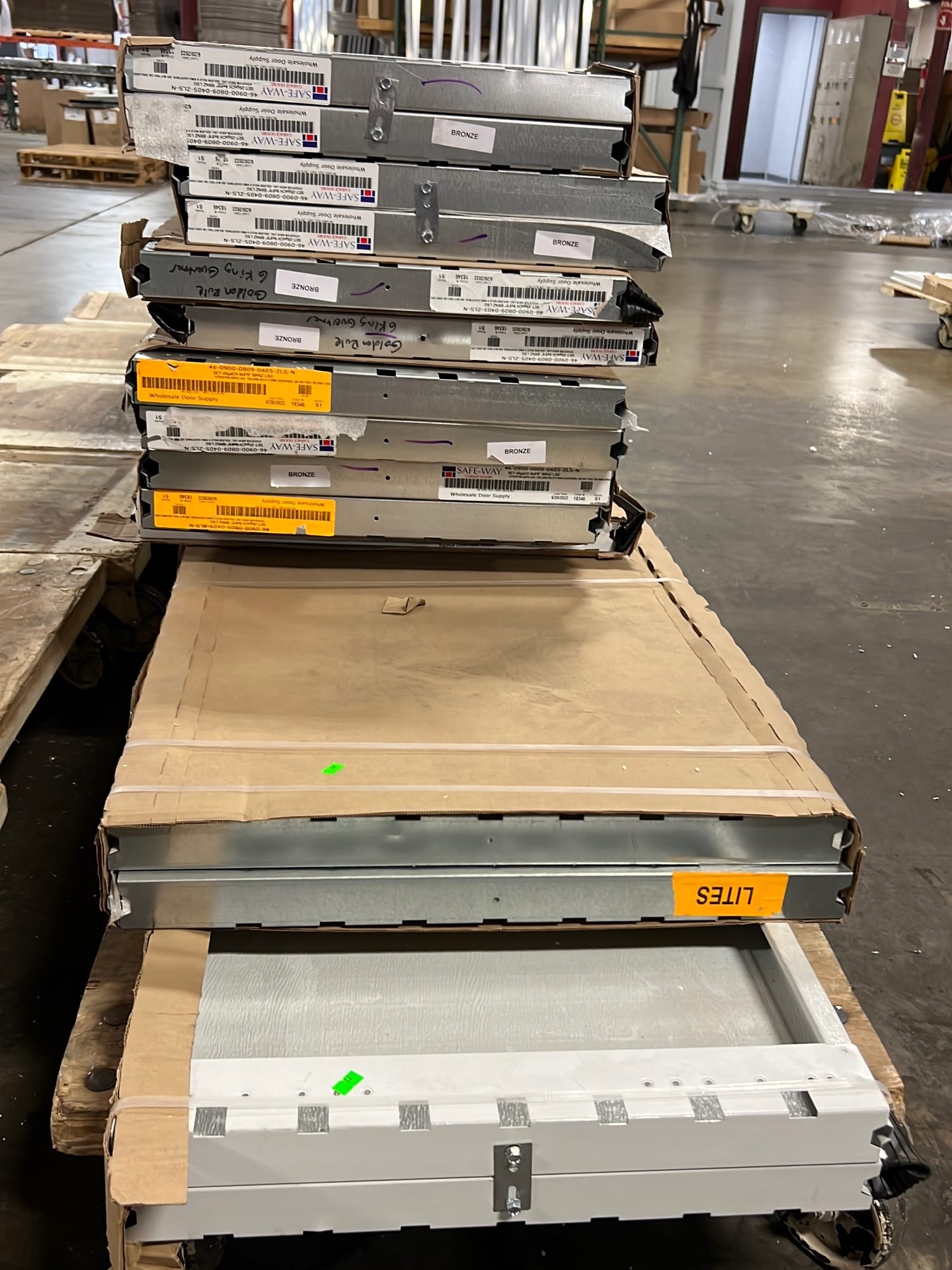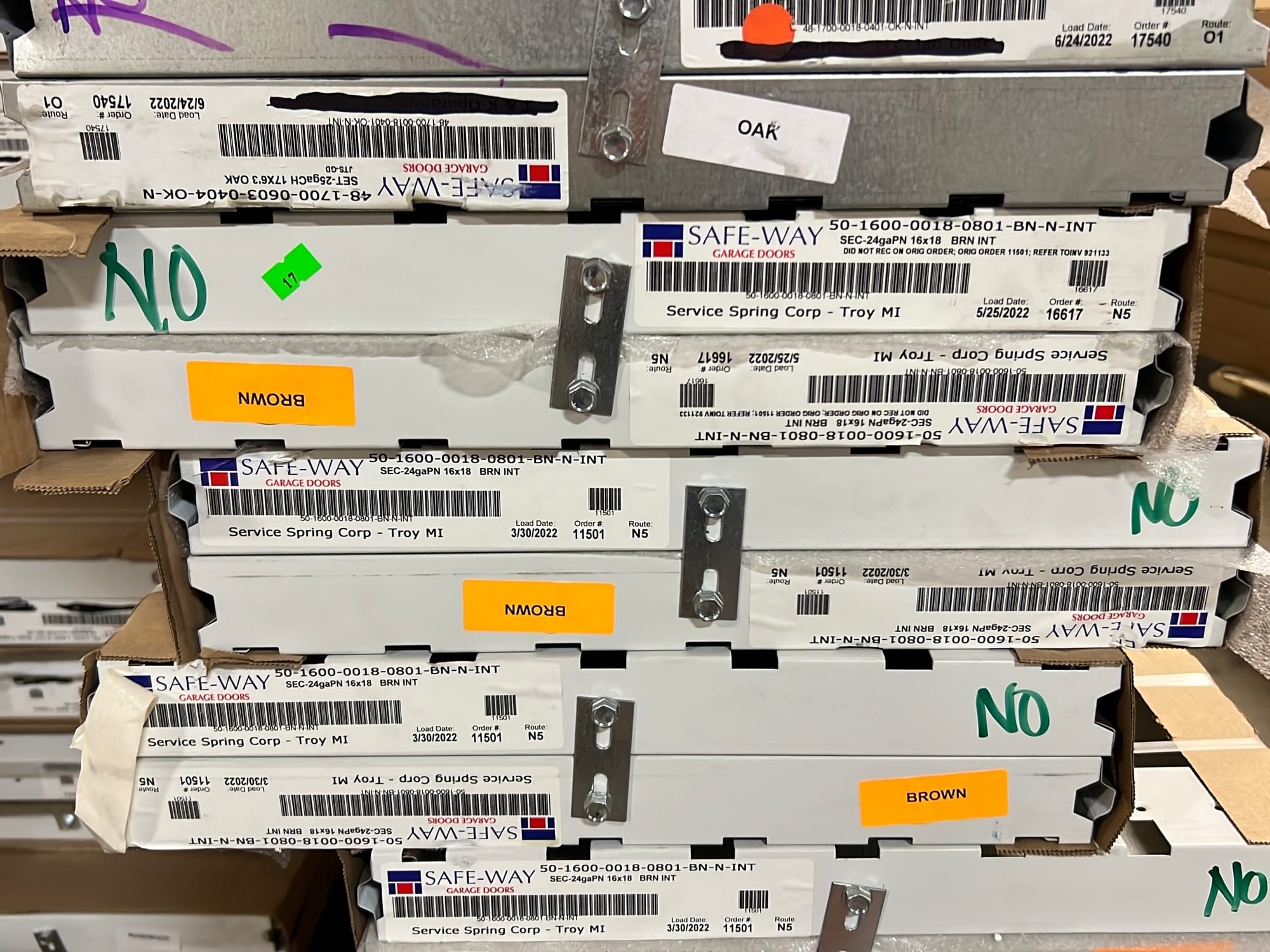 22 Garage Door Panels - (1) 16’x21” Brown, (1) 12’x21” Black, (4) 10’x24” Black, (2) 10’x24” Sandtone, (3) 8’2”x24” Bronze, (2) 12’x24” White, (5) 14’2”x24” Bronze, (1) 12’2”x24” Bronze (3) 16’x21” Brown, (1) 16’x24” Brown, (2) 18’2”x24” Black