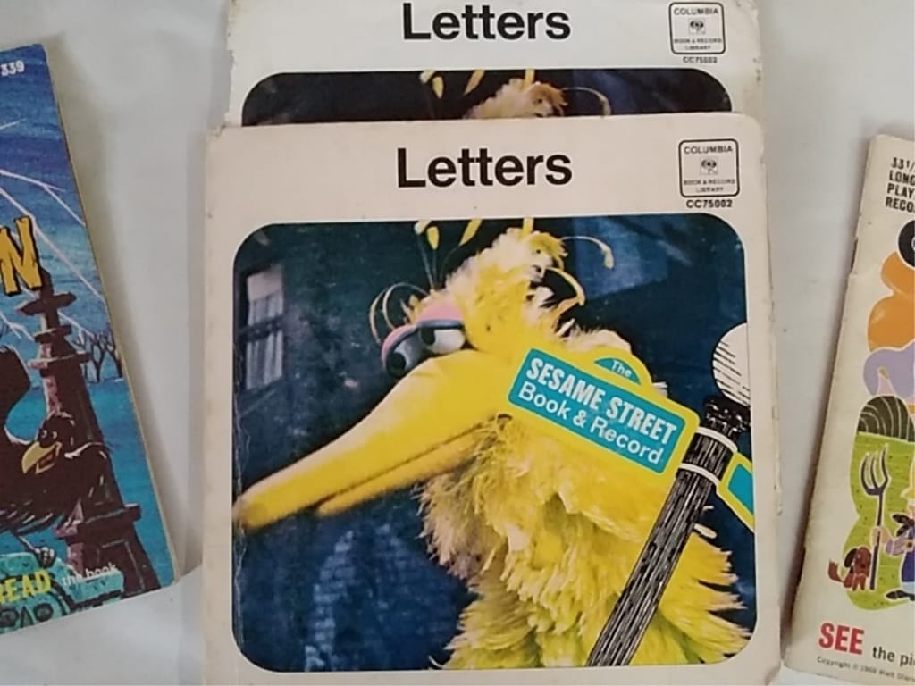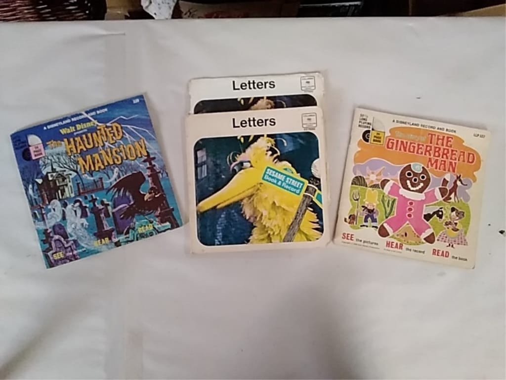 48 Assorted 33 and 1/3 book and record sets, Walt Disney The Haunted mansion, Sesame Street letters, Walt Disney The Gingerbread Man