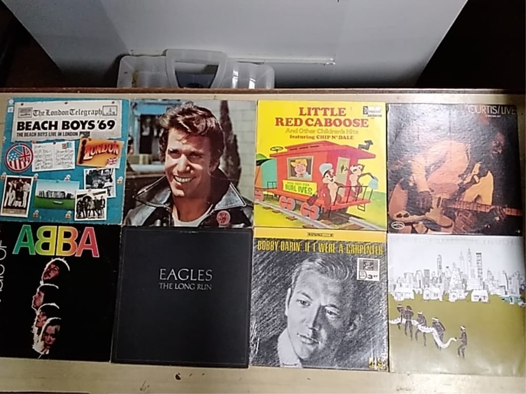 54 8 assorted vinyl albums, Beach Boys, Happy Days, Curtis live, abba, Eagles, Bobby Darin, Joni Mitchell, Etc