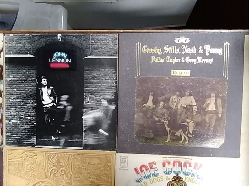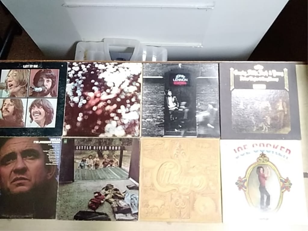 57 8 assorted vinyl albums, Beatles, John Lennon, Crosby Stills & Nash, Johnny cash, Little River band, chicago, Joe Cocker, Etc