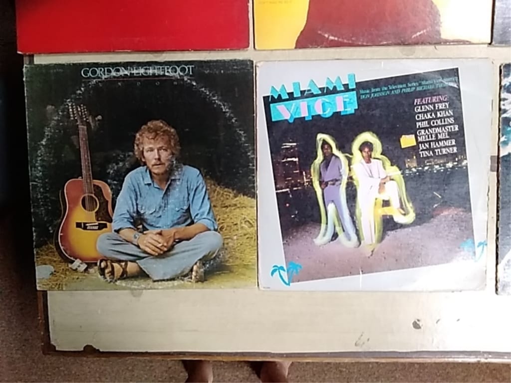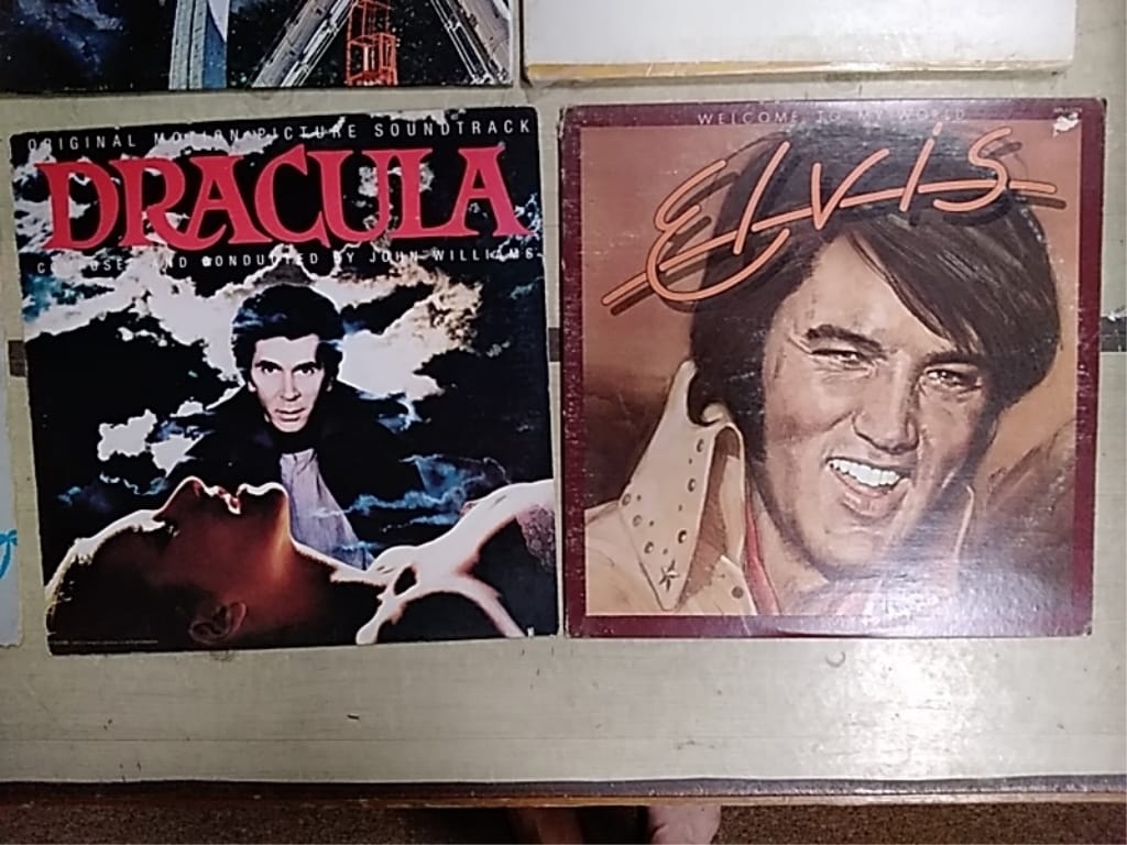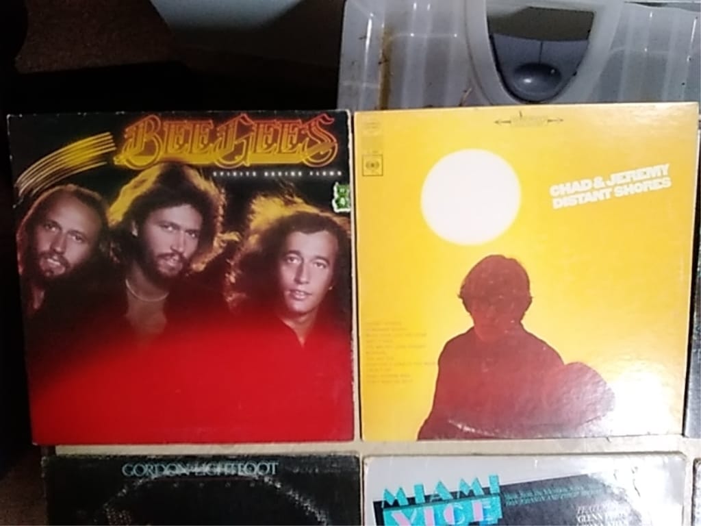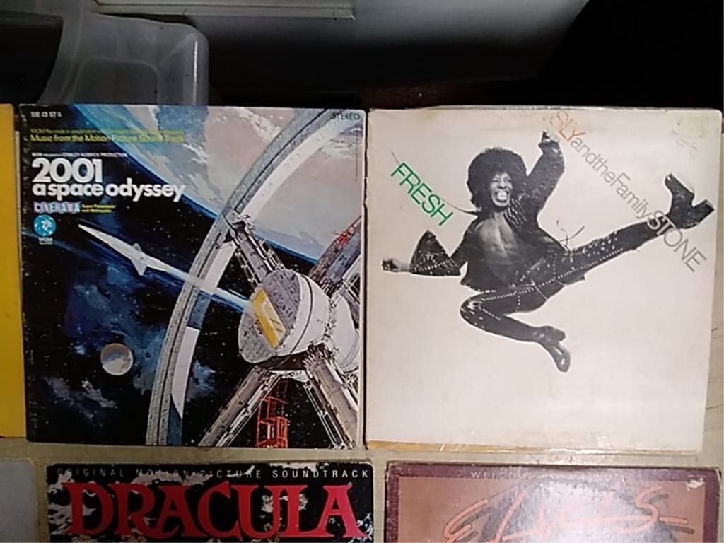 60 8 assorted vinyl albums, Bee Gees, Chad and jeremy, 2001 Space Odyssey movie, Sly and the Family Stone, Gordon lightfoot, Miami Vice soundtrack, Dracula soundtrack, elvis, Etc