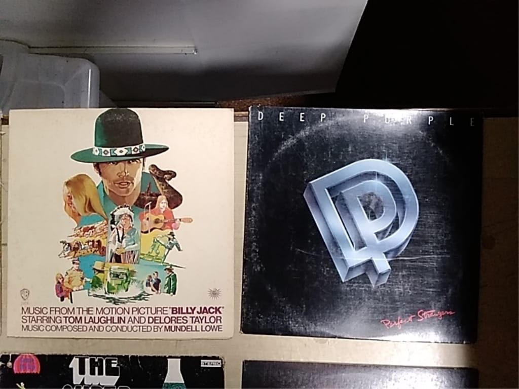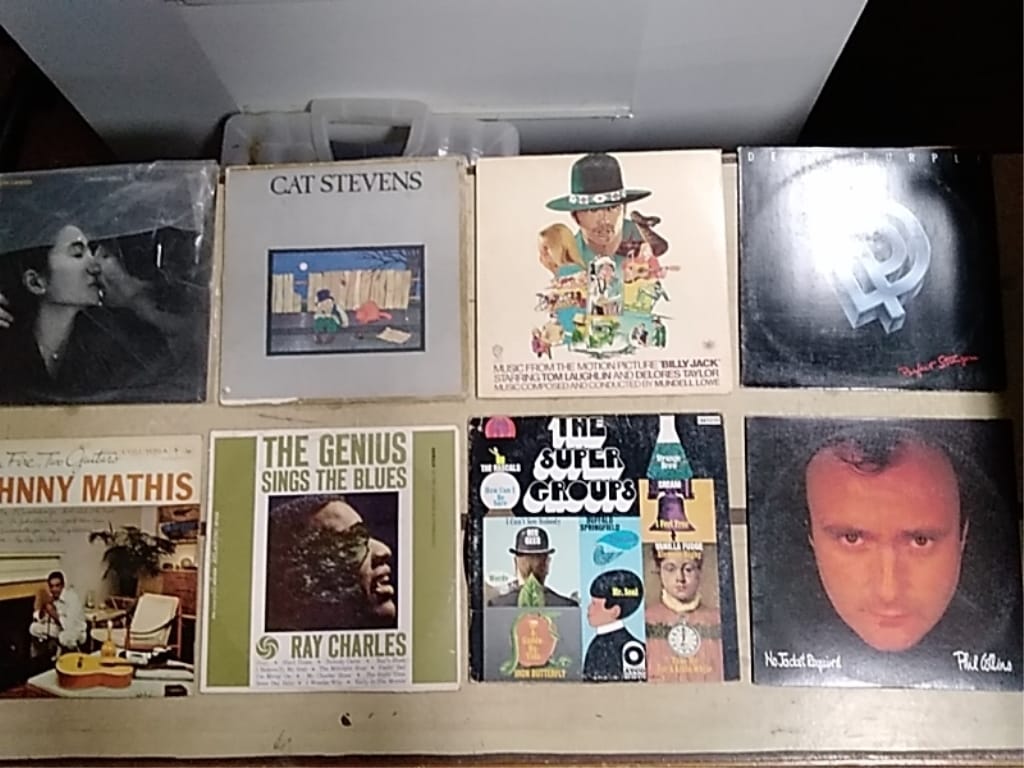 61 8 assorted vinyl albums, John Lennon Yoko ono, Cat Stevens, Billy Jack soundtrack, Deep Purple, Johnny mathis, Ray charles, Phil Collins, Etc