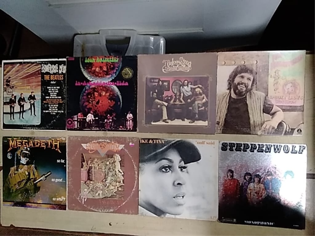 64 8 assorted vinyl albums, the beatles, Iron Butterfly, Doobie Brothers, Kris Kristofferson, megadeth, aerosmith, Ike and Tina, steppenwolf, Etc
