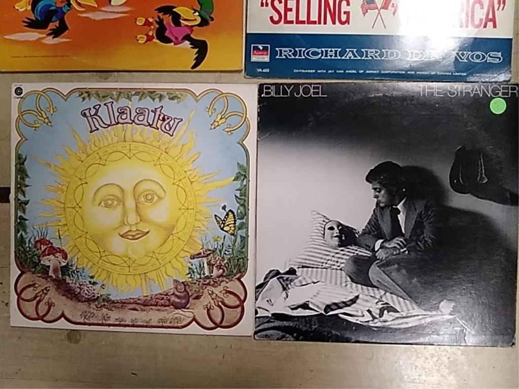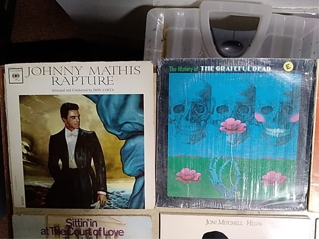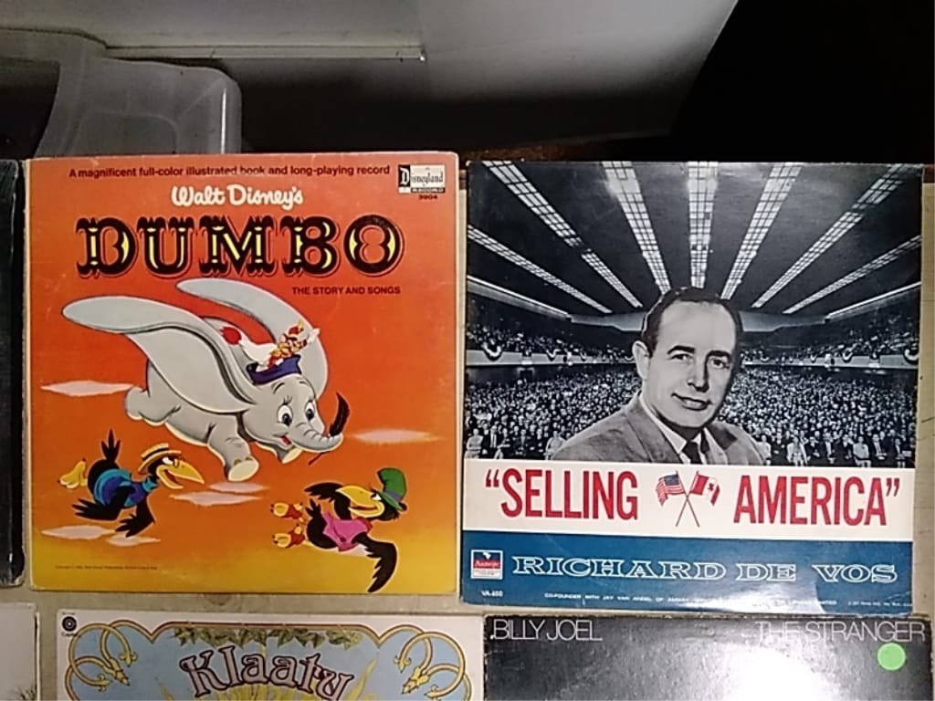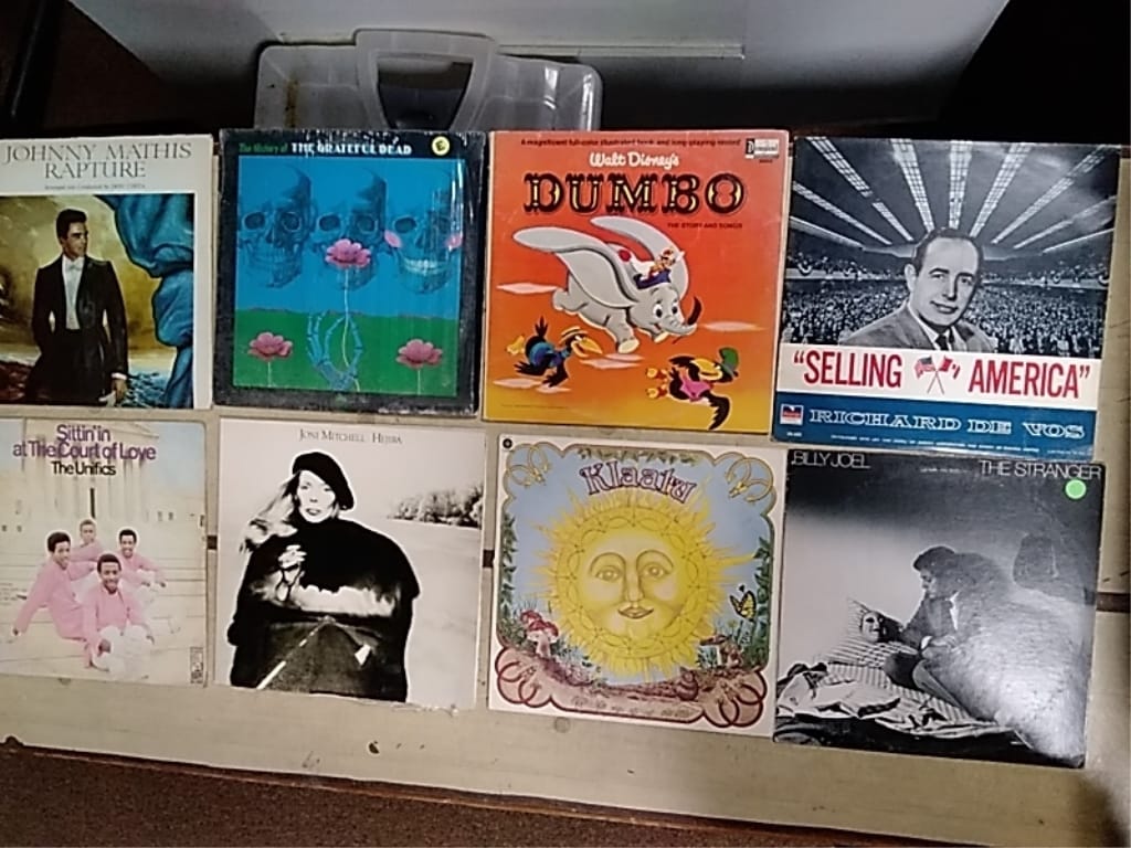 65 8 assorted vinyl albums, Johnny mathis, the grateful dead, Disney's dumbo, Richard DeVos, the unifics, Joni mitchell, Klaatu Billy Joel, Etc
