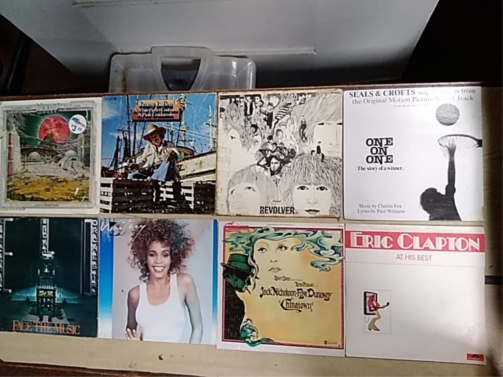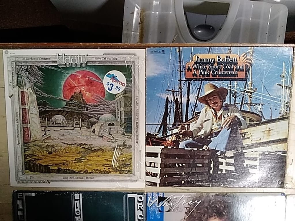 67 8 assorted vinyl albums, Klaatu, Jimmy Buffett, Seals and Crofts, elo, Whitney houston, Chinatown soundtrack, Eric Clapton, beatles, Etc
