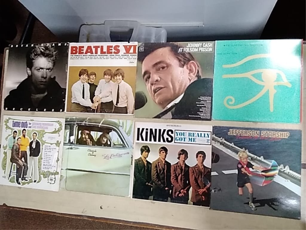 69 8 assorted vinyl albums, Bryan adams, beatles, Johnny Cash, the Alan Parsons project, Smokey Robinson and the miracles, Cheech and Chong, the kinks, Jefferson starship, Etc