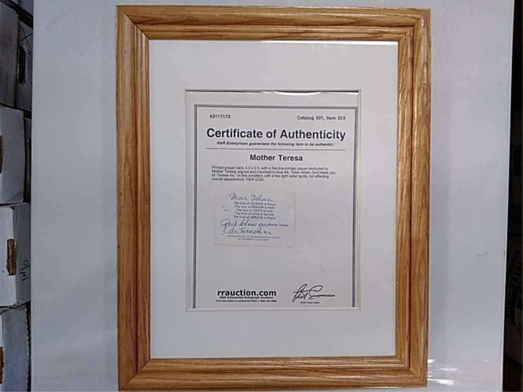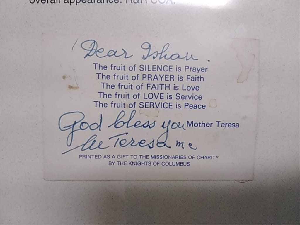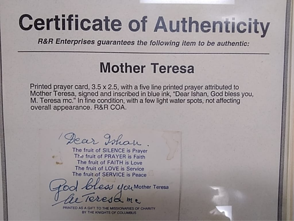75 Printed prayer card with a five line printed prayer attributed to Mother Teresa signed and inscribed in blue ink, approximately three and a half by two and a half