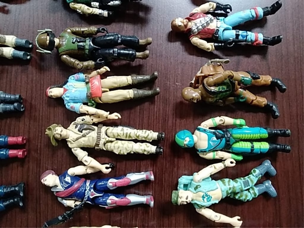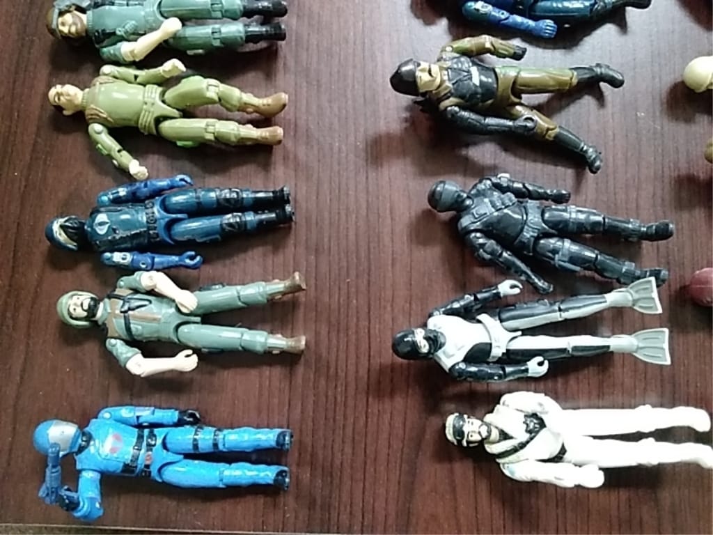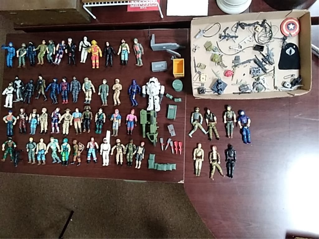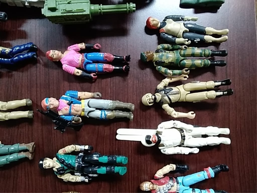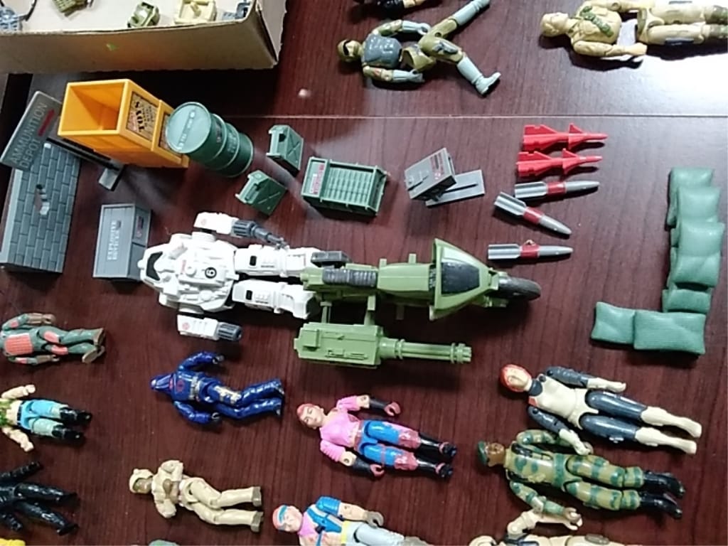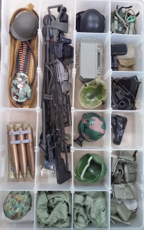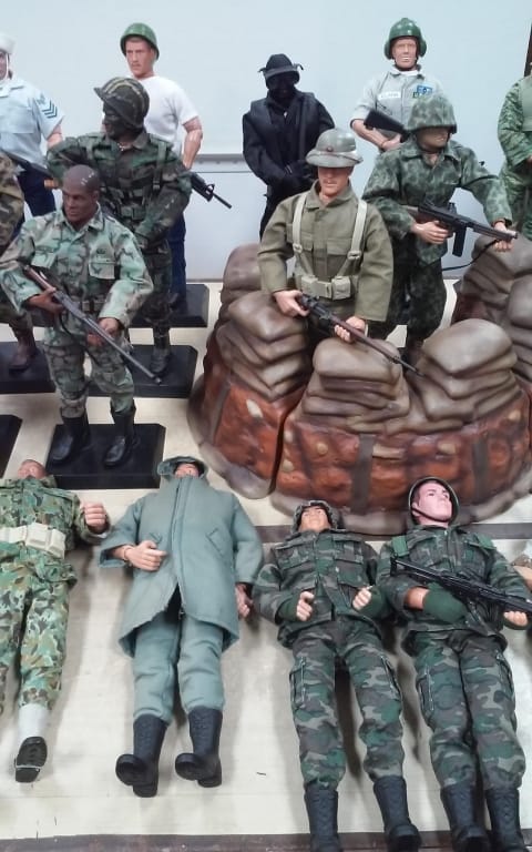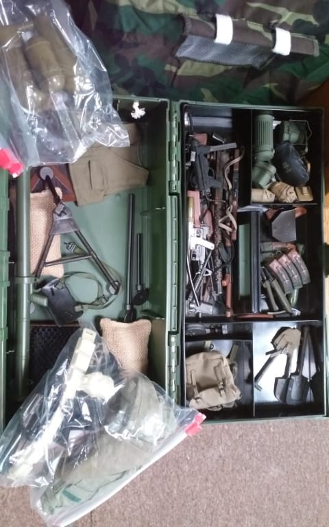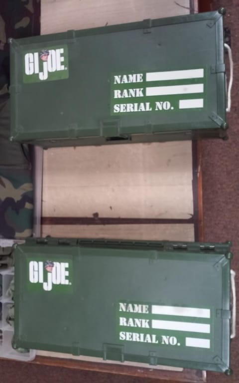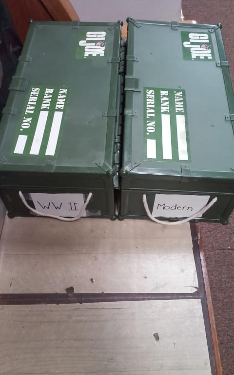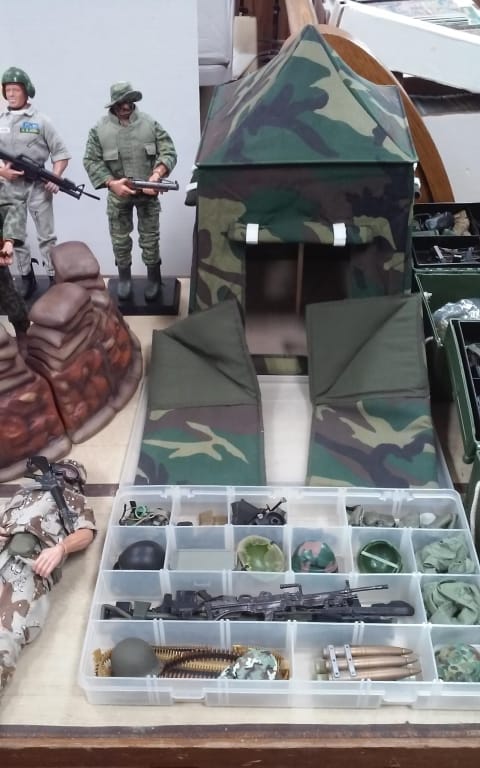 2006 Assorted GI Joe collection with 28-12" tall figures, sandbag entrenchment, tent, sleeping bags, two GI Joe footlockers and one organizer full of different accessories, clothes, weapons, helmets, clothing, etc.