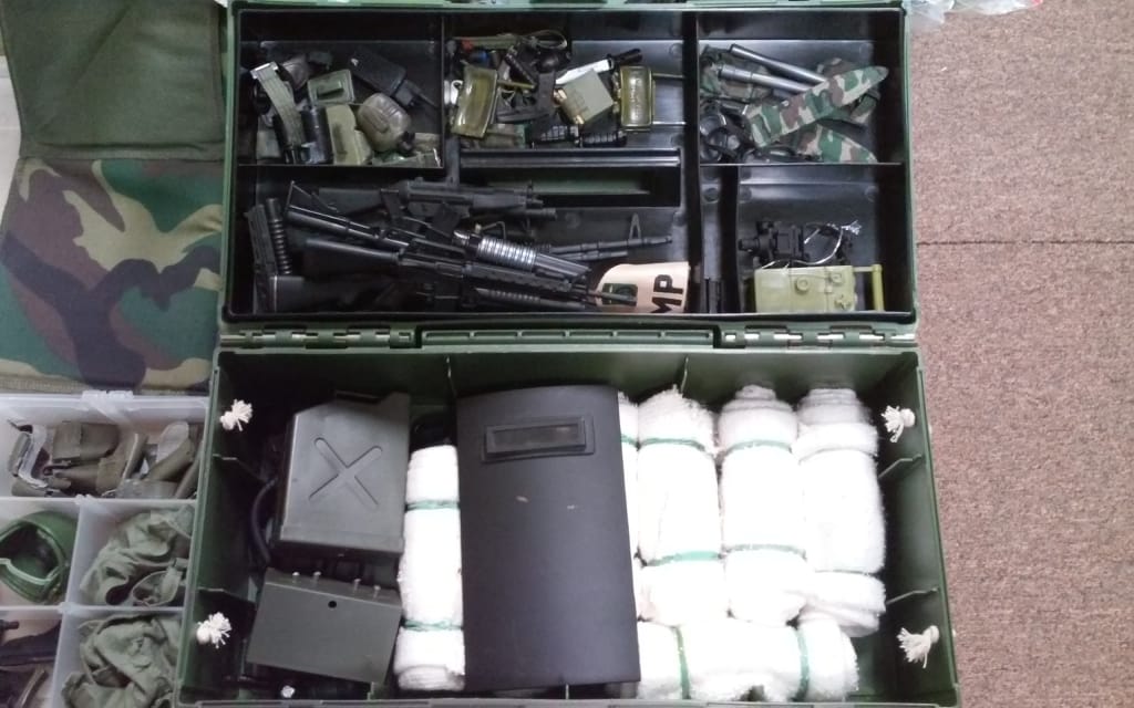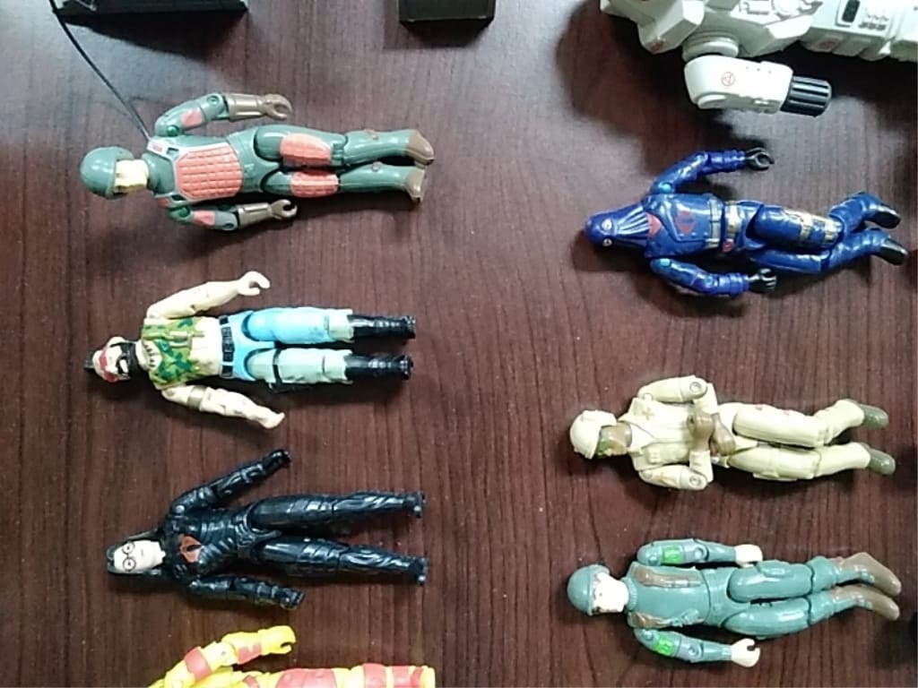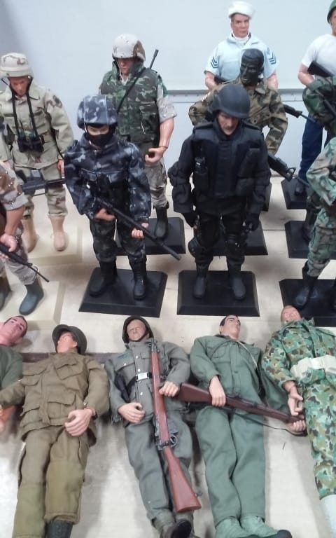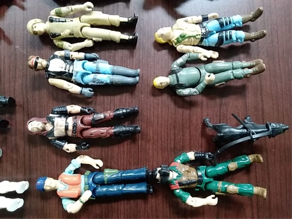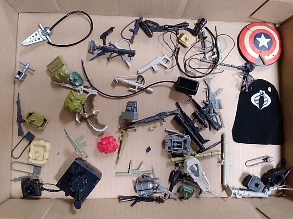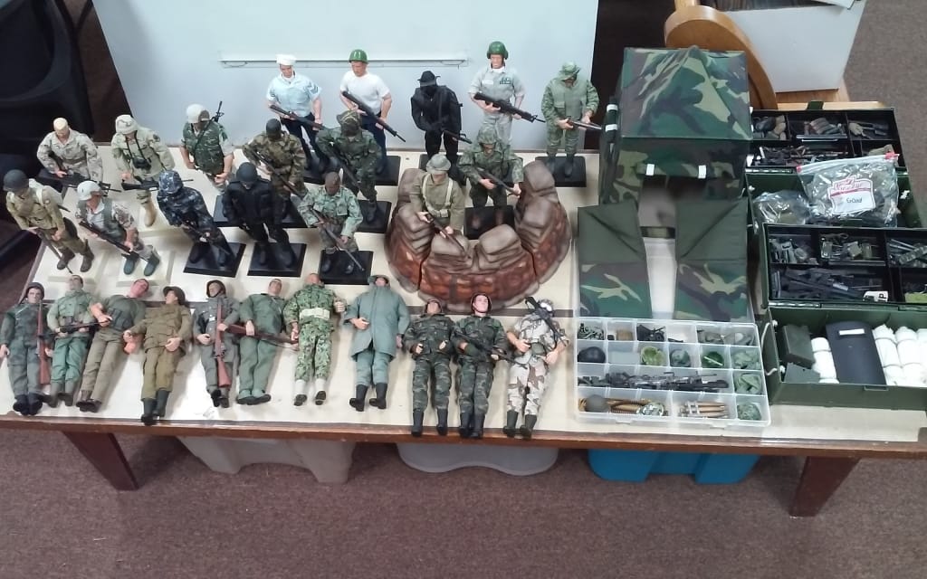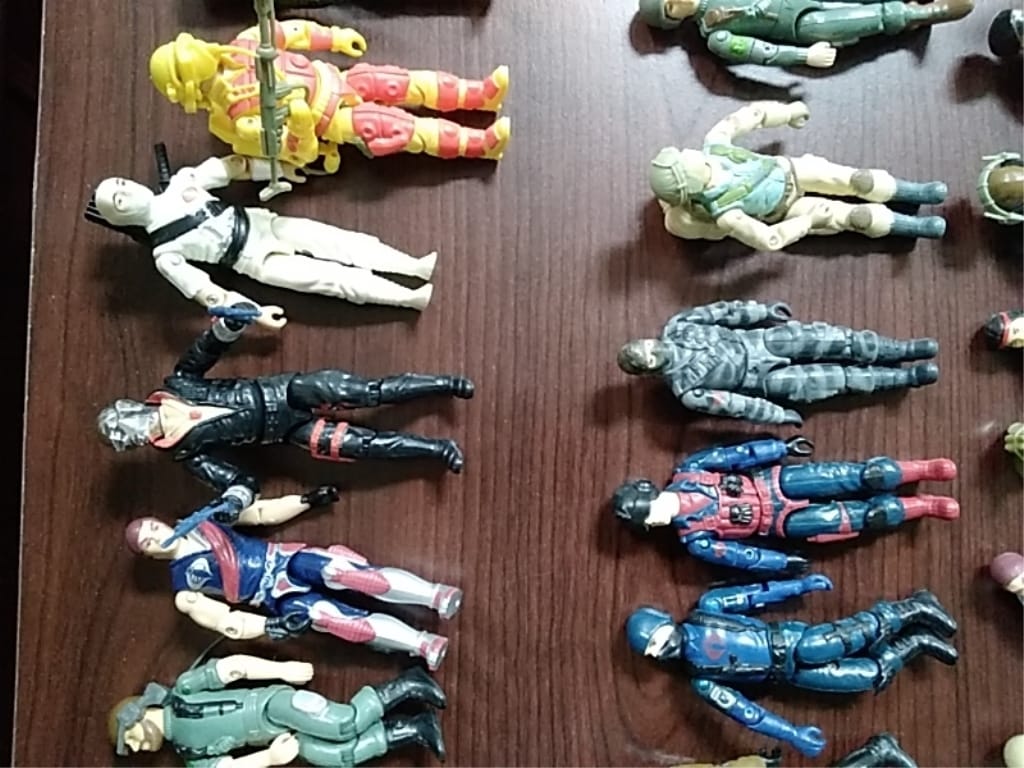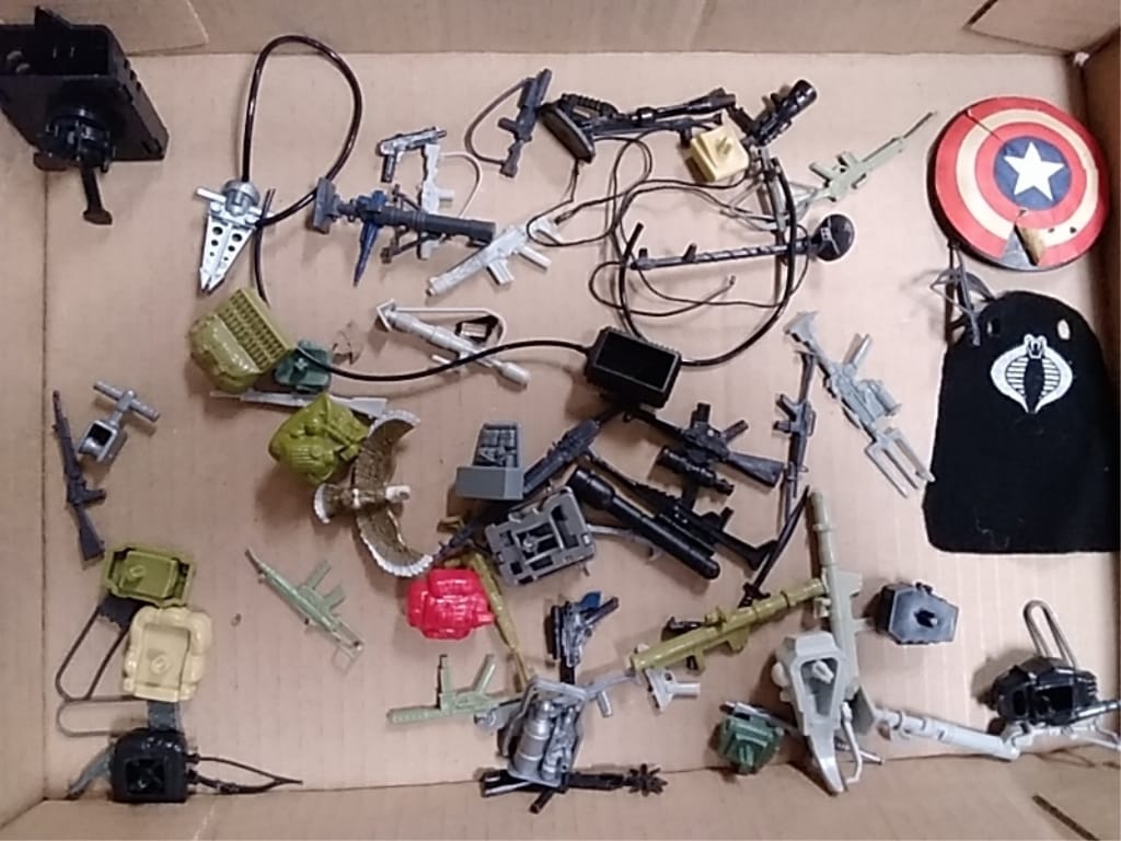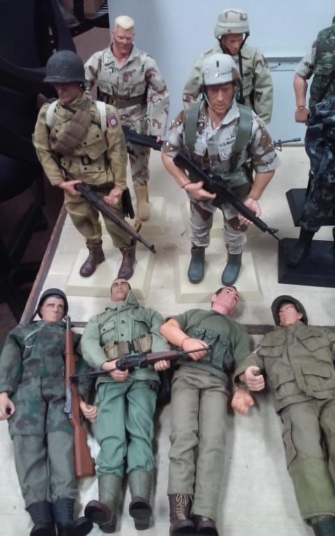 2006 Assorted GI Joe collection with 28-12" tall figures, sandbag entrenchment, tent, sleeping bags, two GI Joe footlockers and one organizer full of different accessories, clothes, weapons, helmets, clothing, etc.