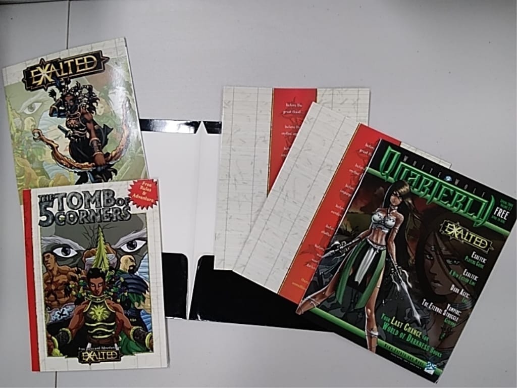 2067 Exalted: players guide, new fiction line, rules and adventure, free introductory kit, role-playing game