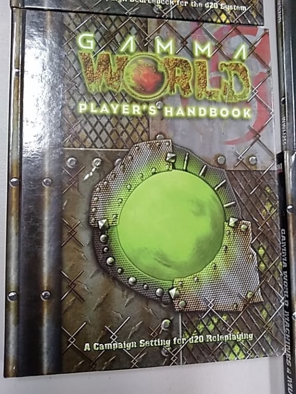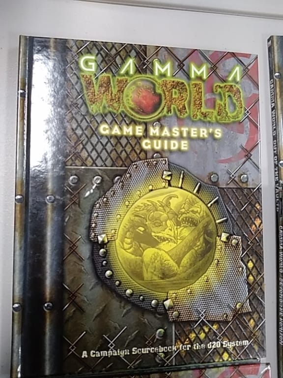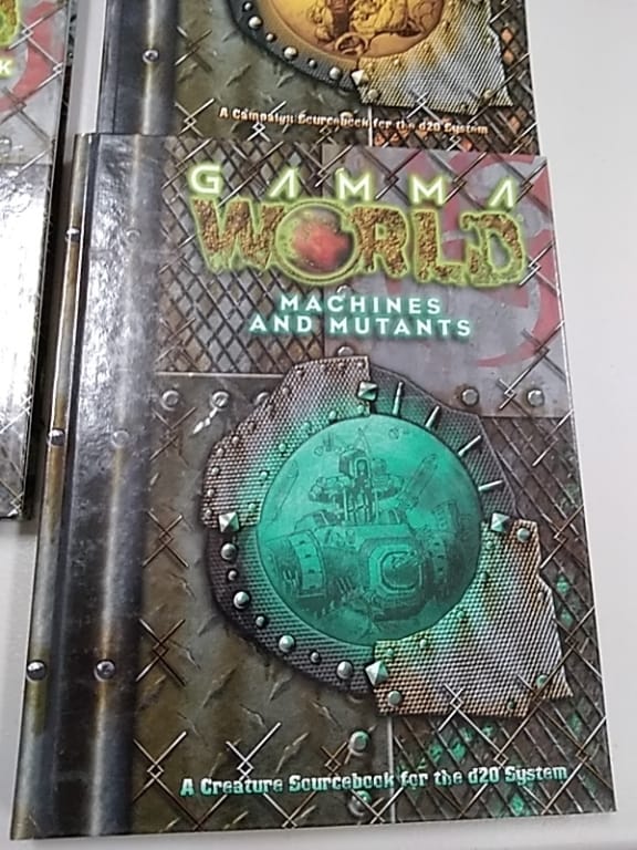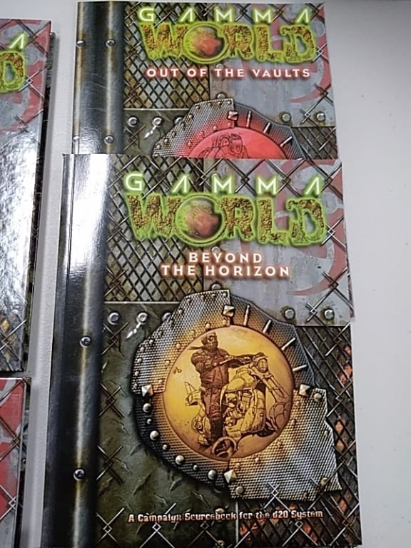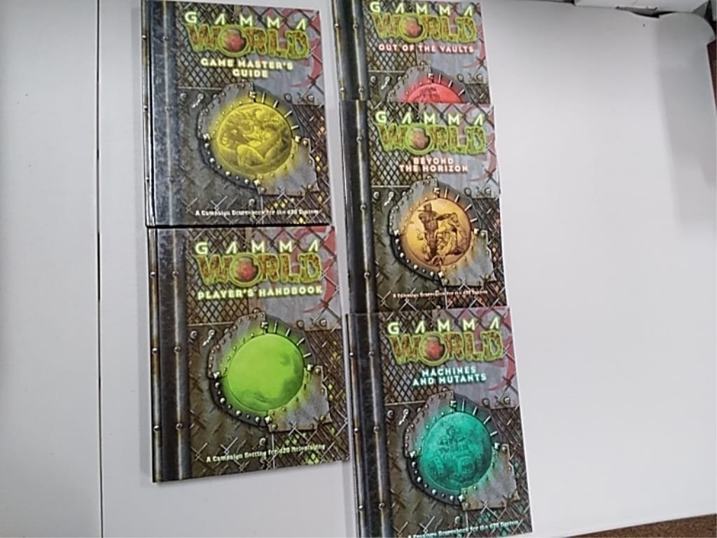 2068 Gamma World game Master's guide hardcover, players handbook hardcover, out of the vaults paperback, beyond the horizon paperback, machines and mutants hardcover, sourcebook for the D20 system, role-playing game,