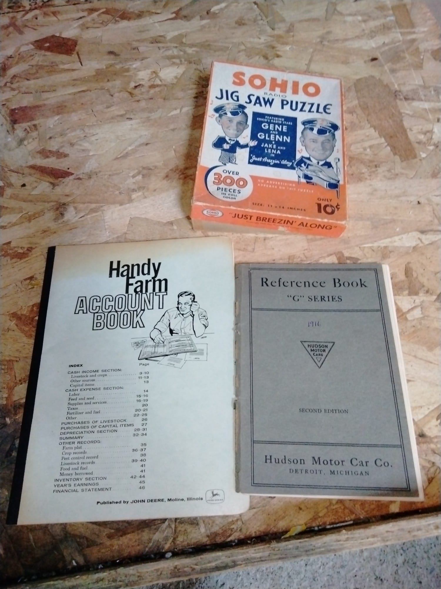 41 Sohio puzzle, John Deere account book, Hudson motor book